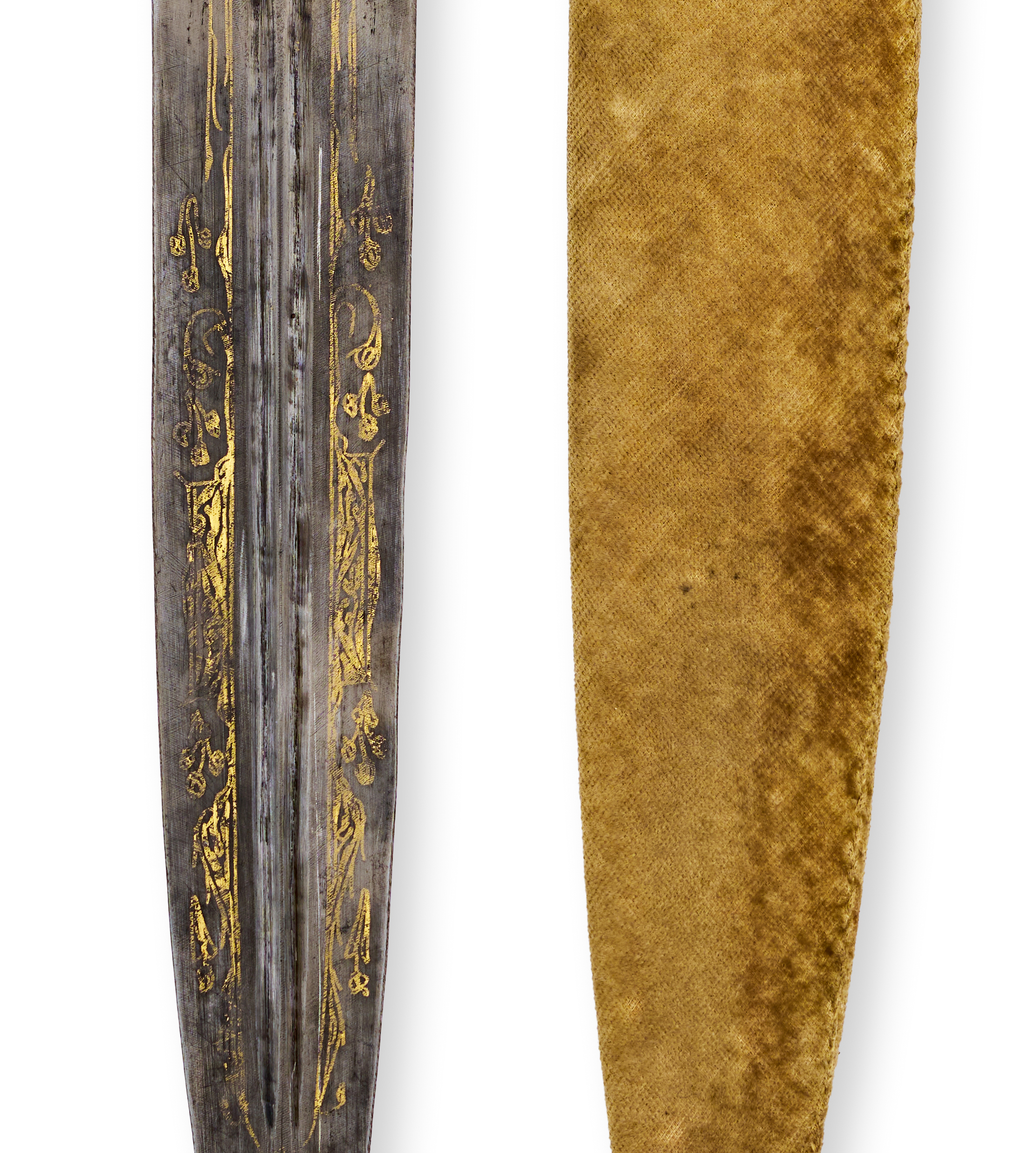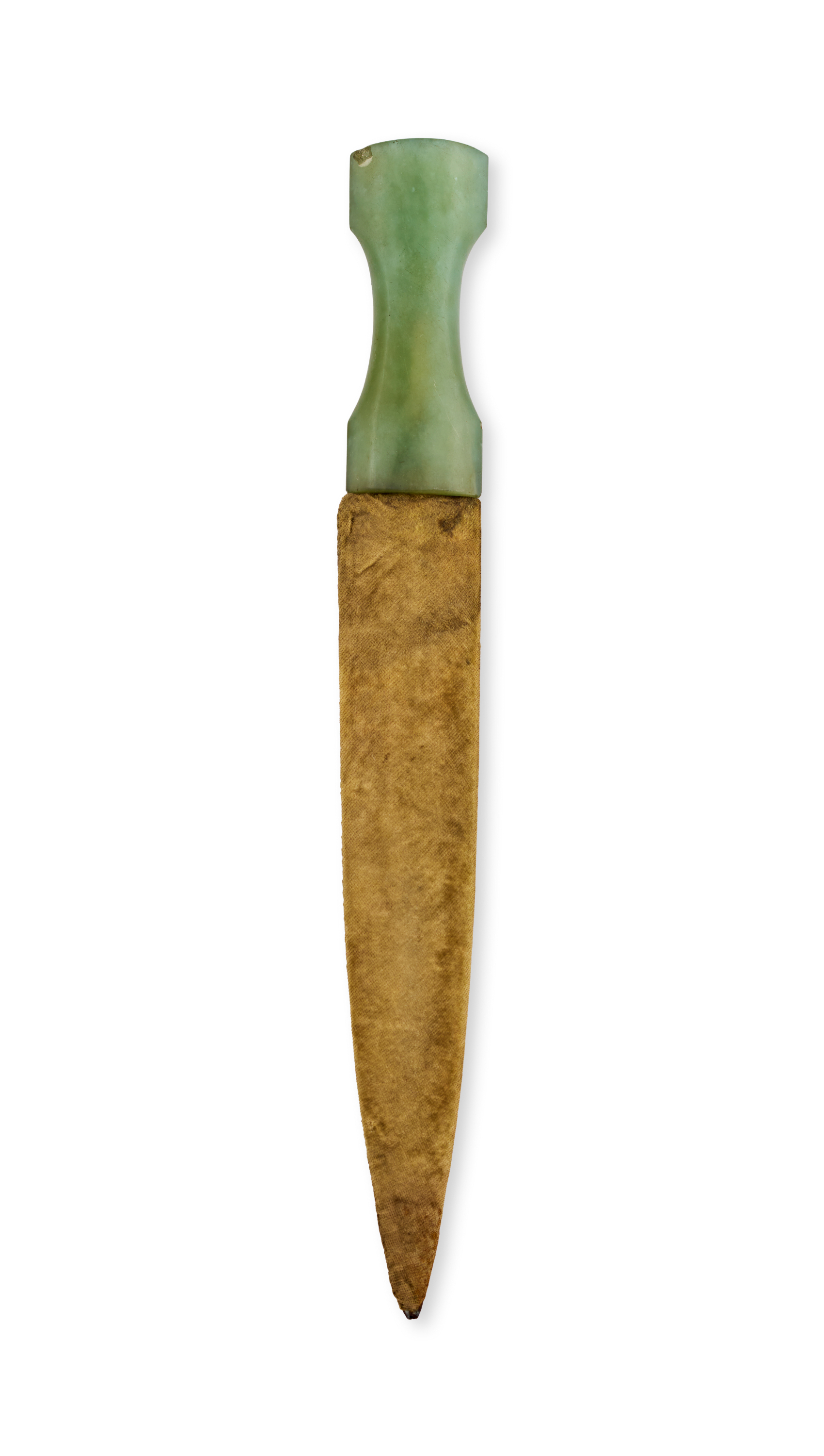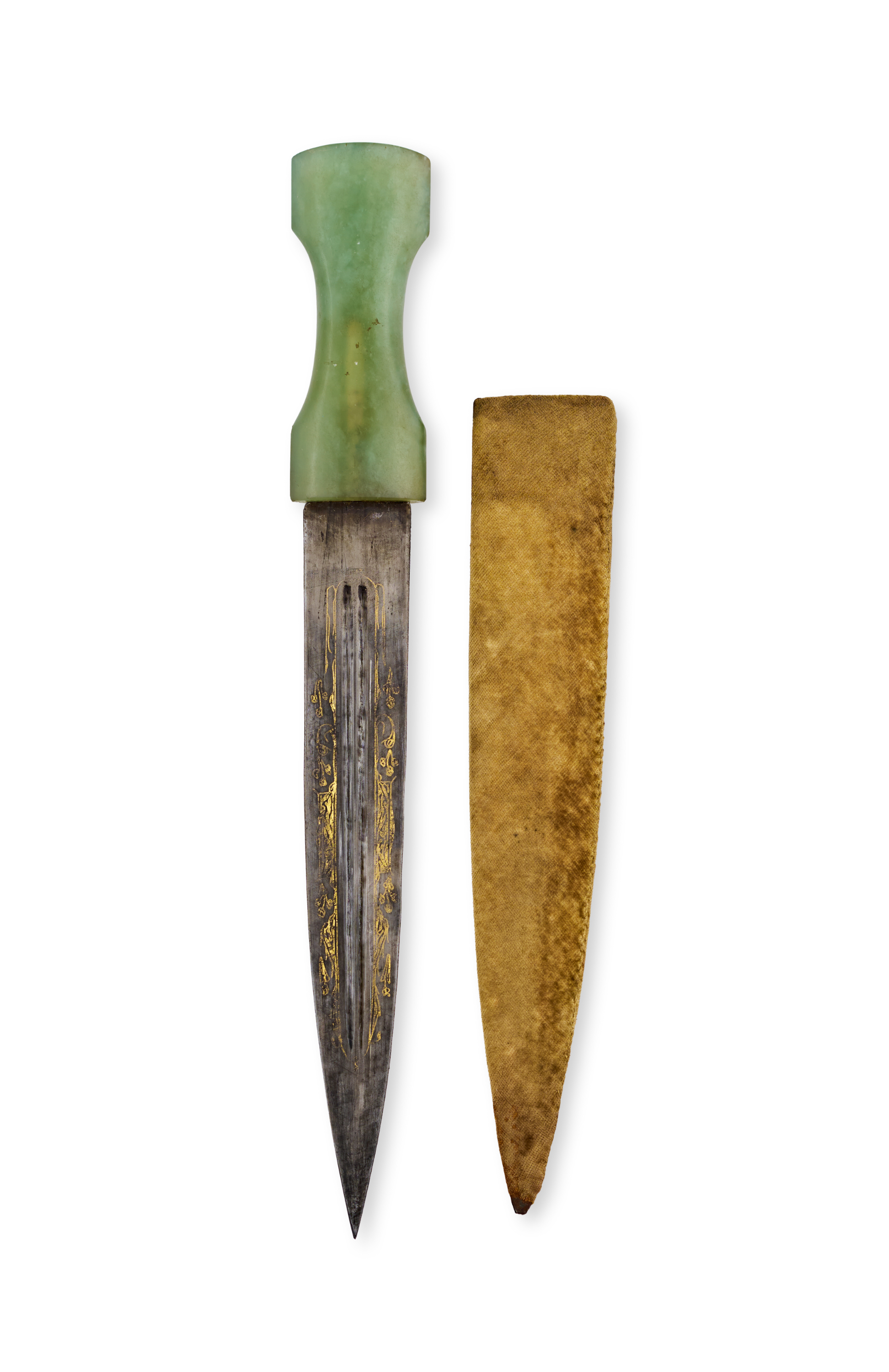 The double-edged tapering blade with central ridge and decorated in gold inlay with scrolling vegetal motifs, the hilt made of polished green hardstone, carved with waisted grip. In wooden scabbard.