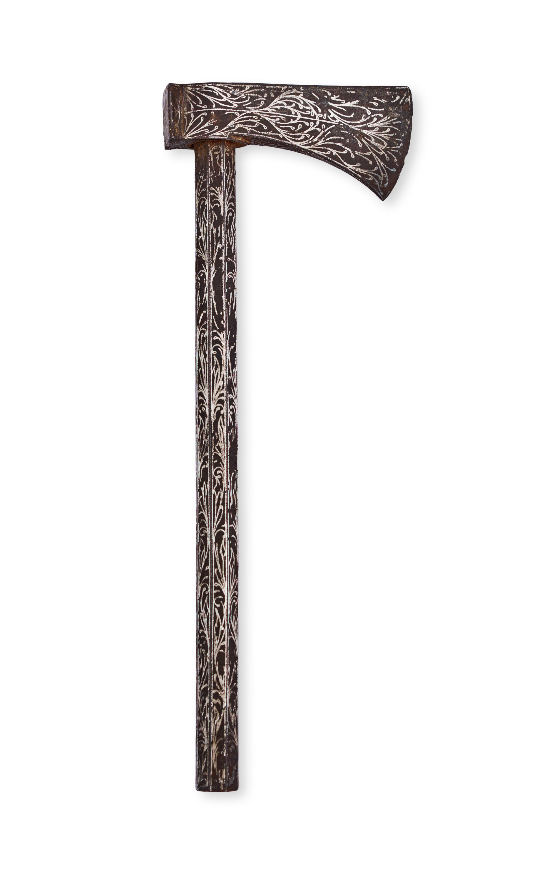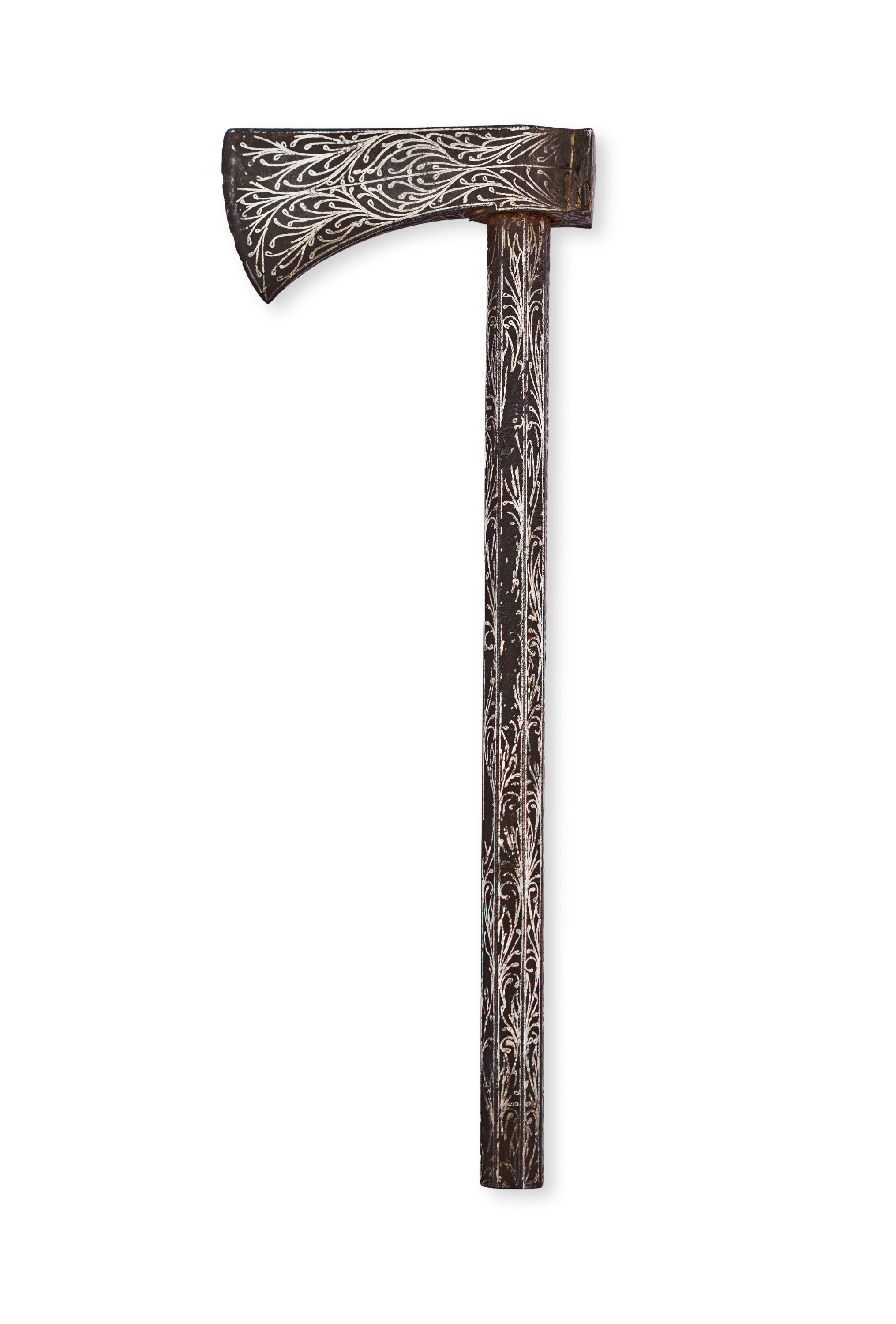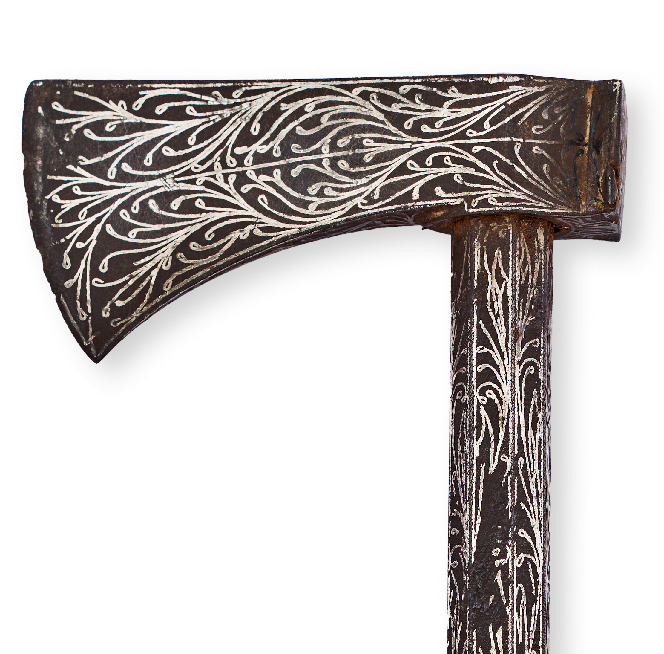 Curved steel blade, finely decorated with intricate silver-inlaid vegetal scrollwork on both sides of the blade and the entire length of the shaft. The motifs featuring interwoven tendrils and foliage.