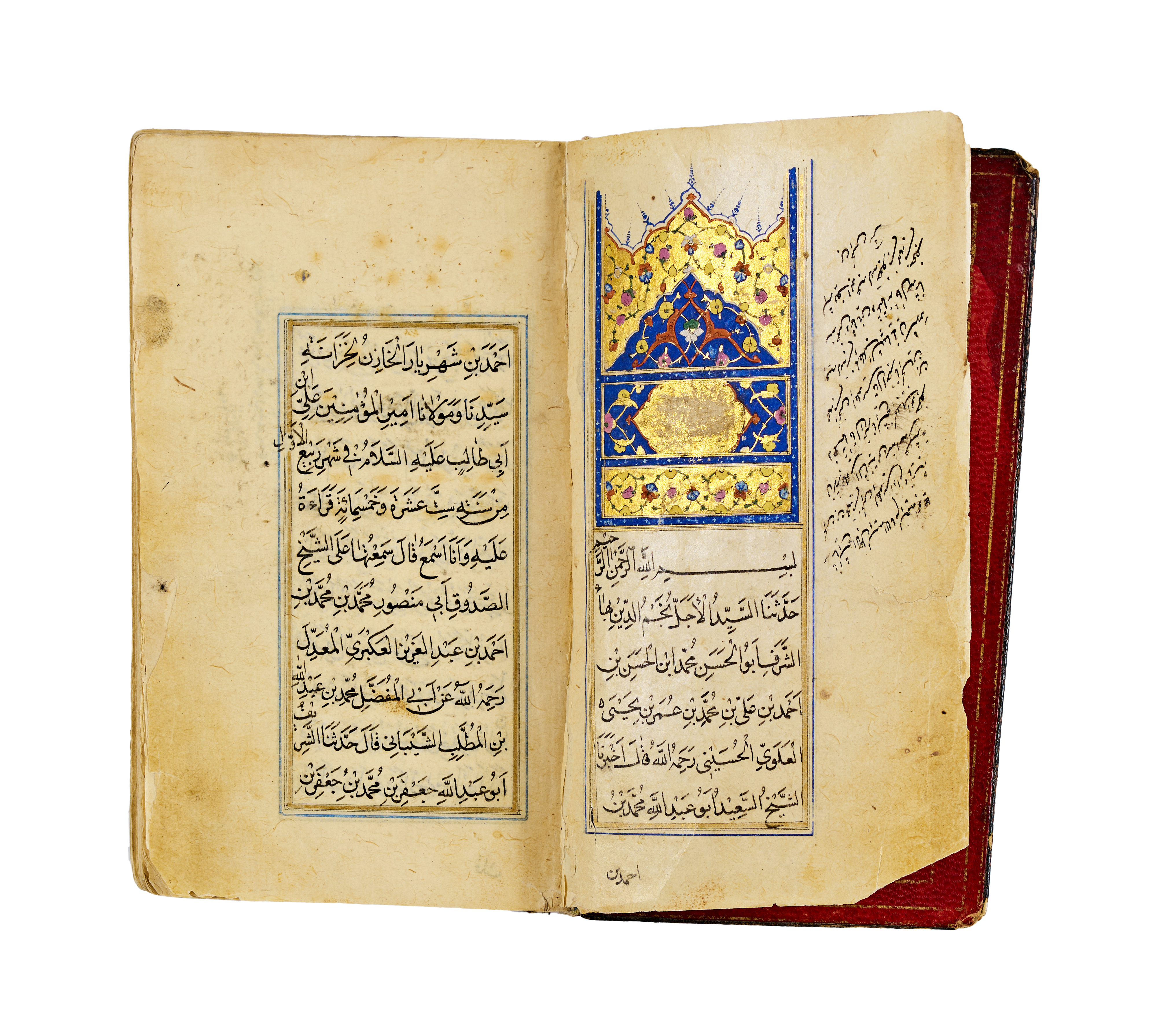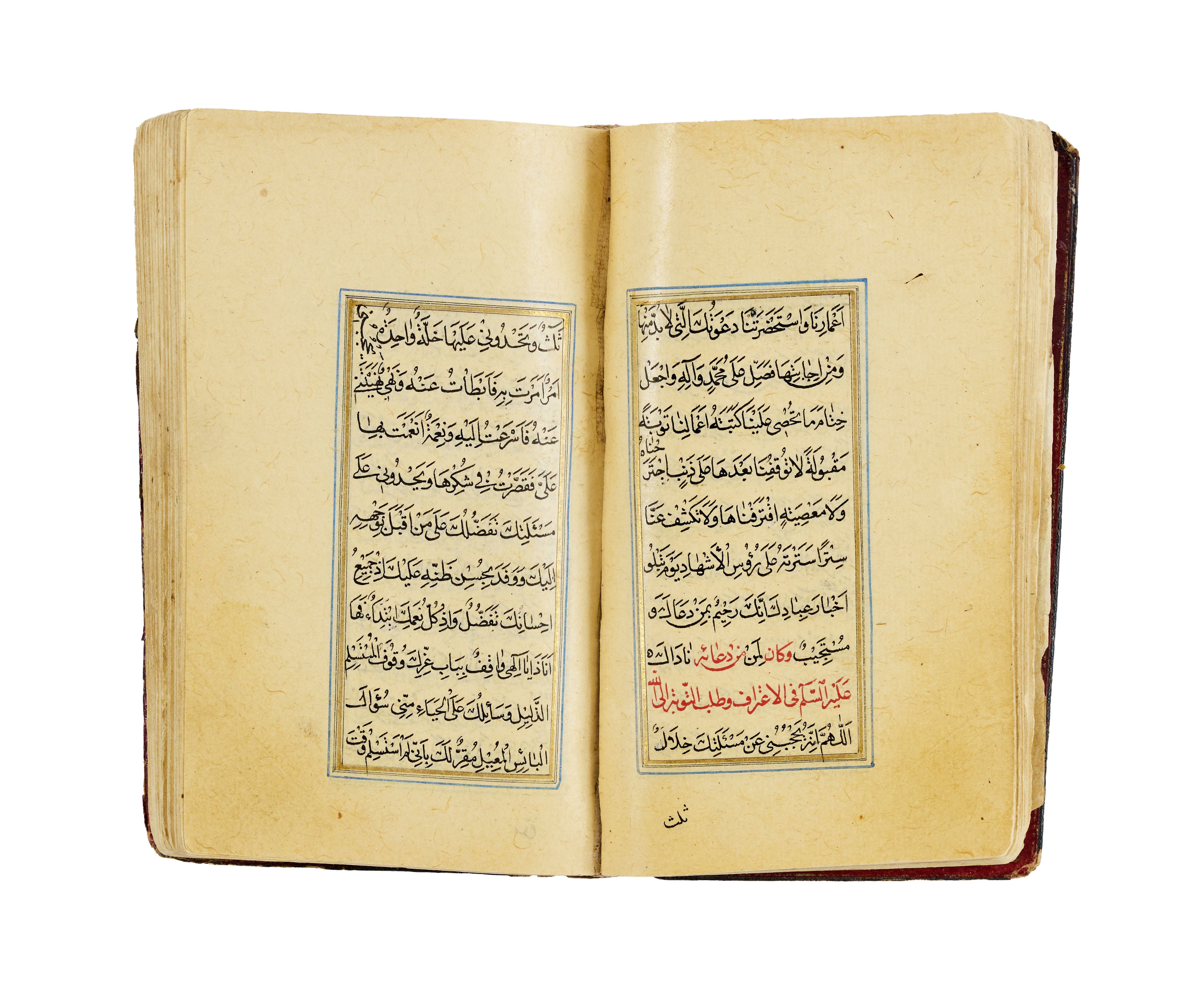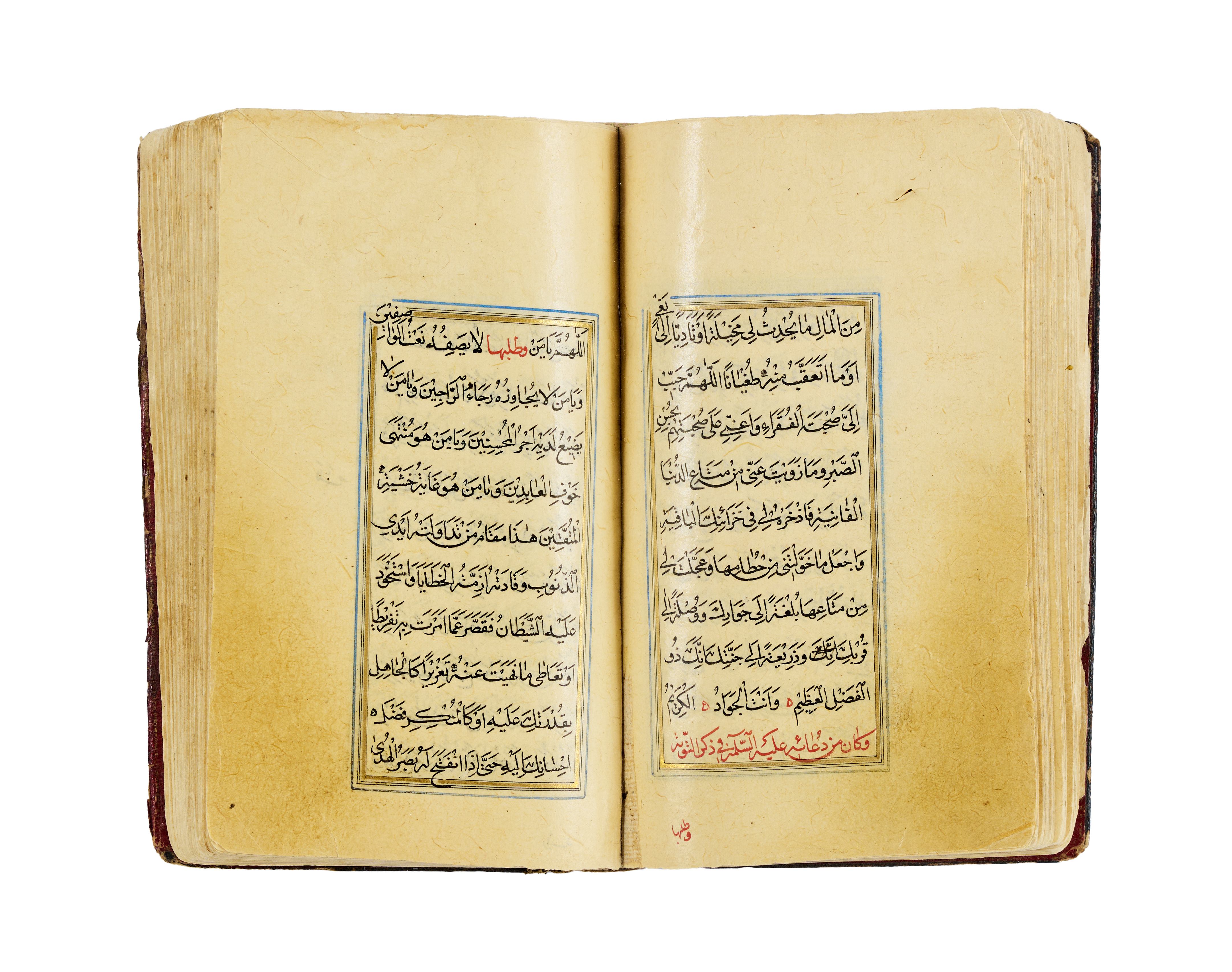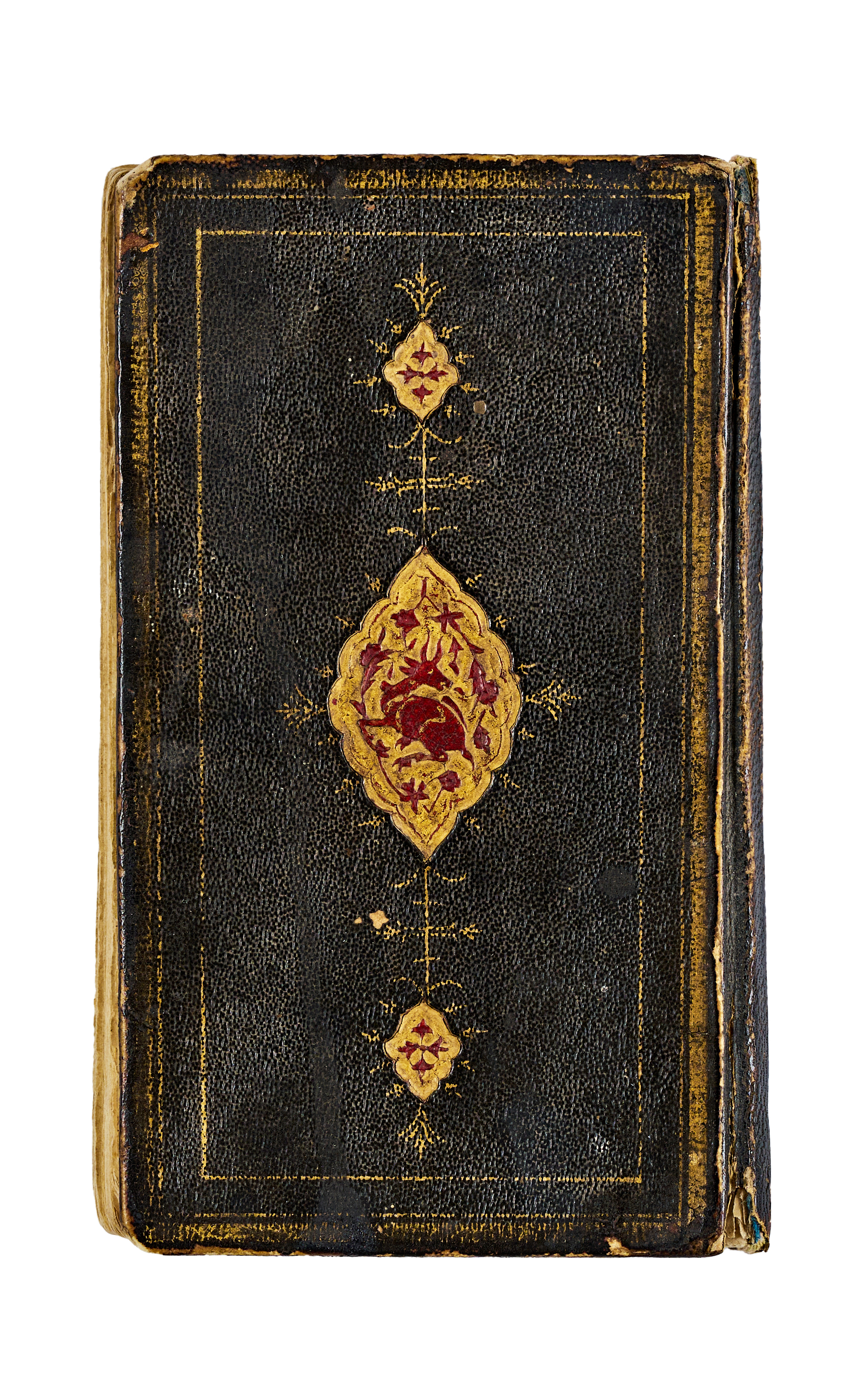 A finely illuminated Safavid manuscript containing a collection of Hadith and devotional prayers arranged according to the days of the week, produced in Persia around the year 1700. The text is penned in clear and elegant naskh script in black ink, with rubrication and occasional marginalia. The manuscript opens with a richly decorated headpiece in gold, cobalt blue, and floral motifs. The layout is organised in double columns, framed with blue and gold rules throughout, preserving a symmetrical and balanced aesthetic. The leather binding, featuring a black cover with central and corner medallions gilt and painted in red and gold.