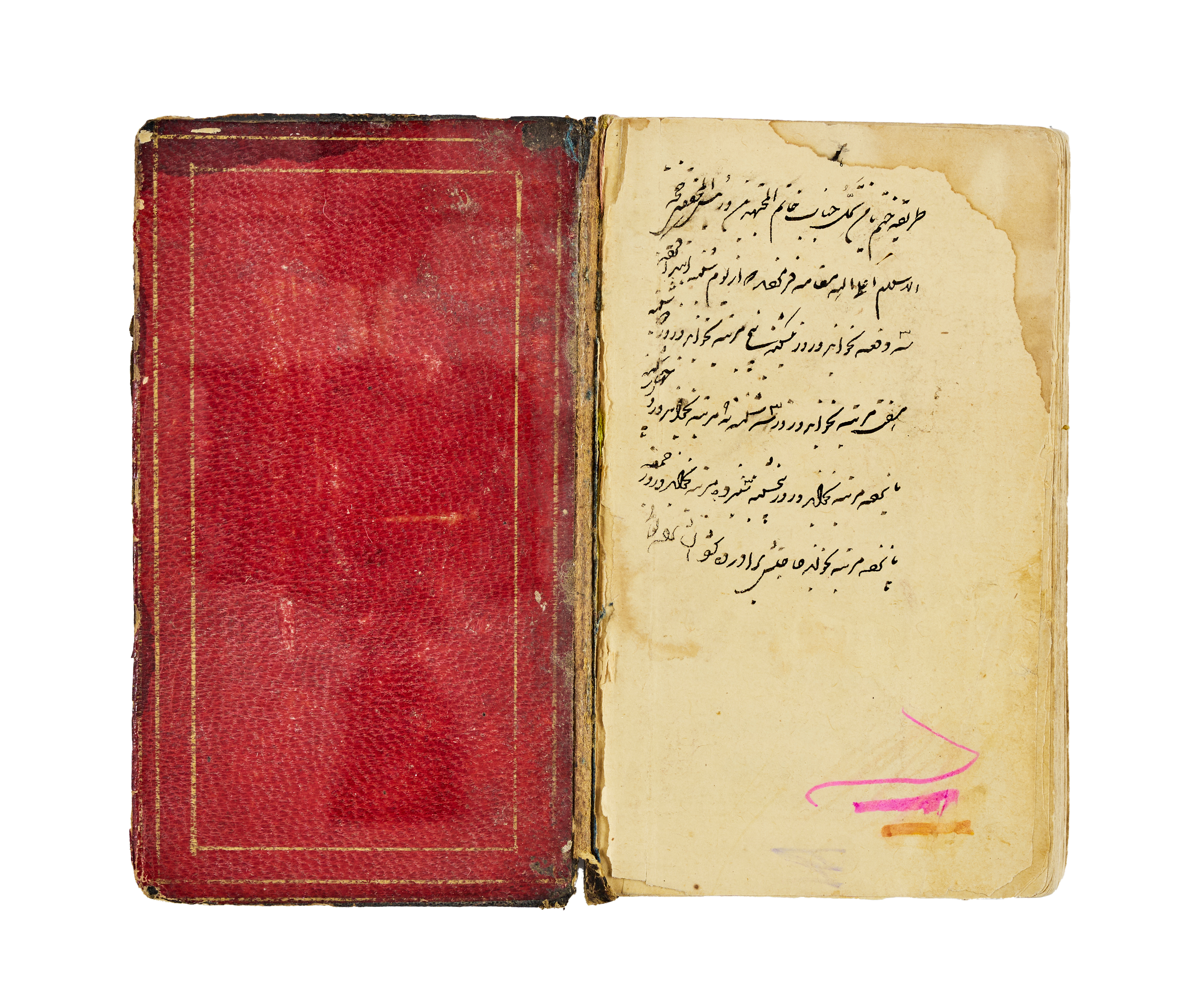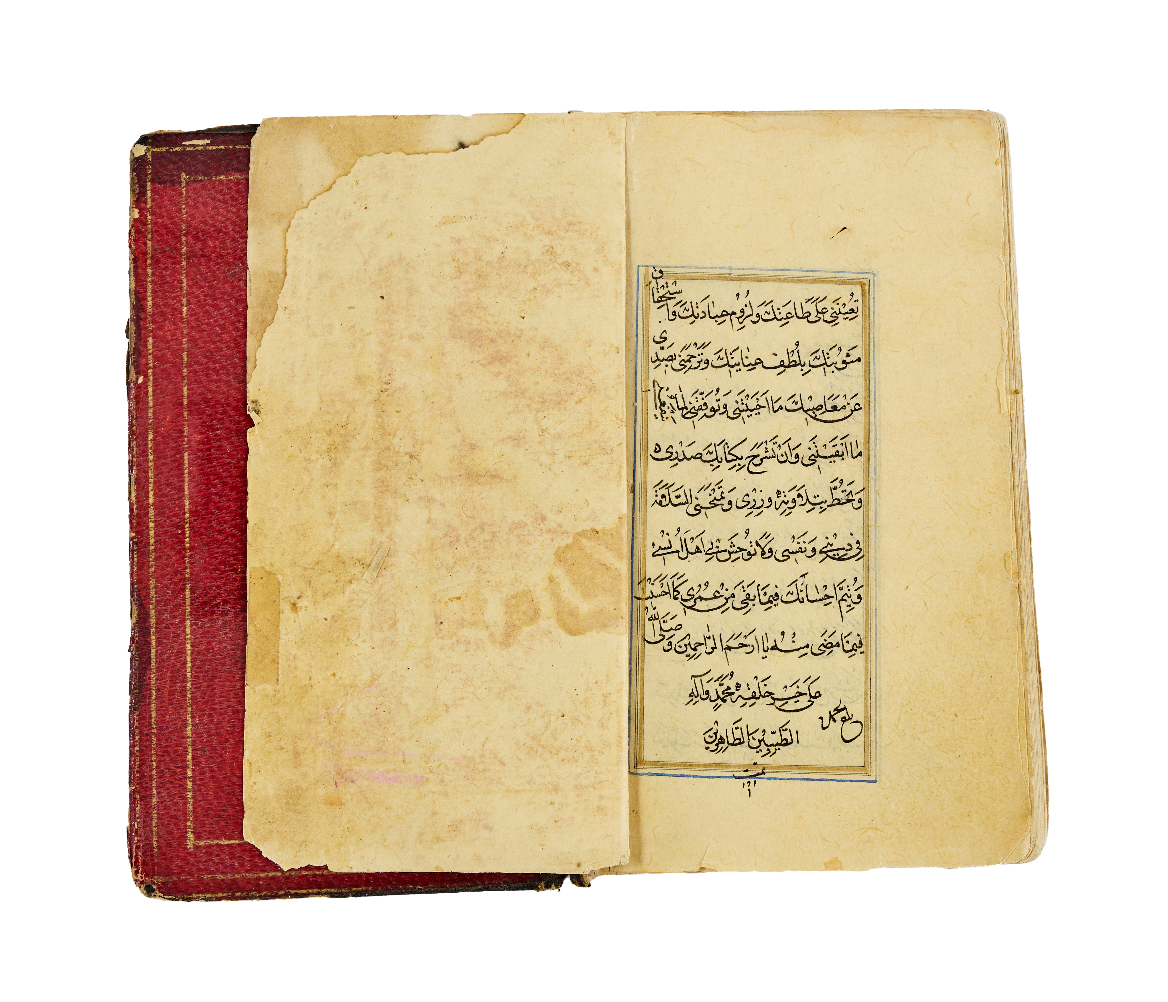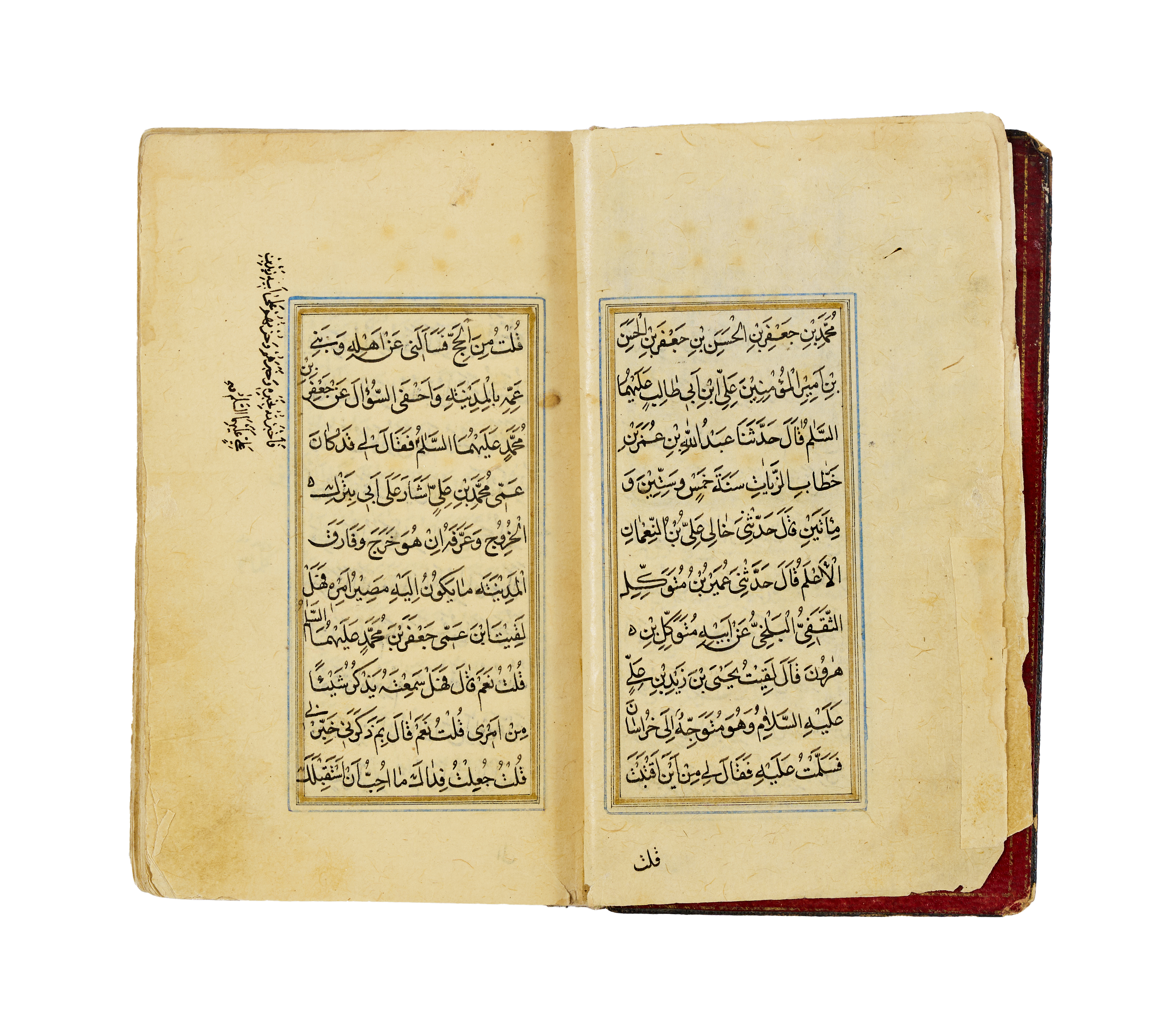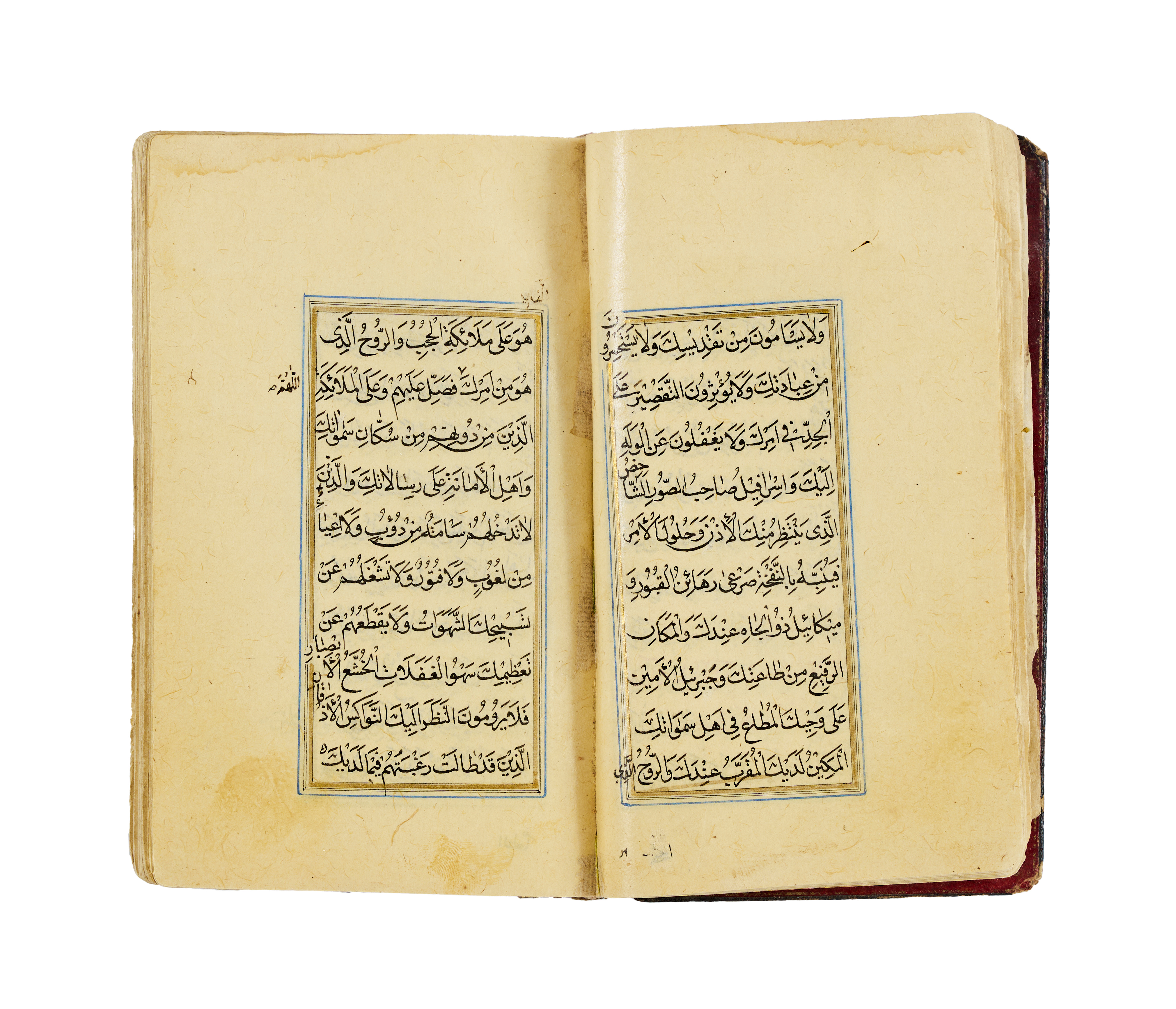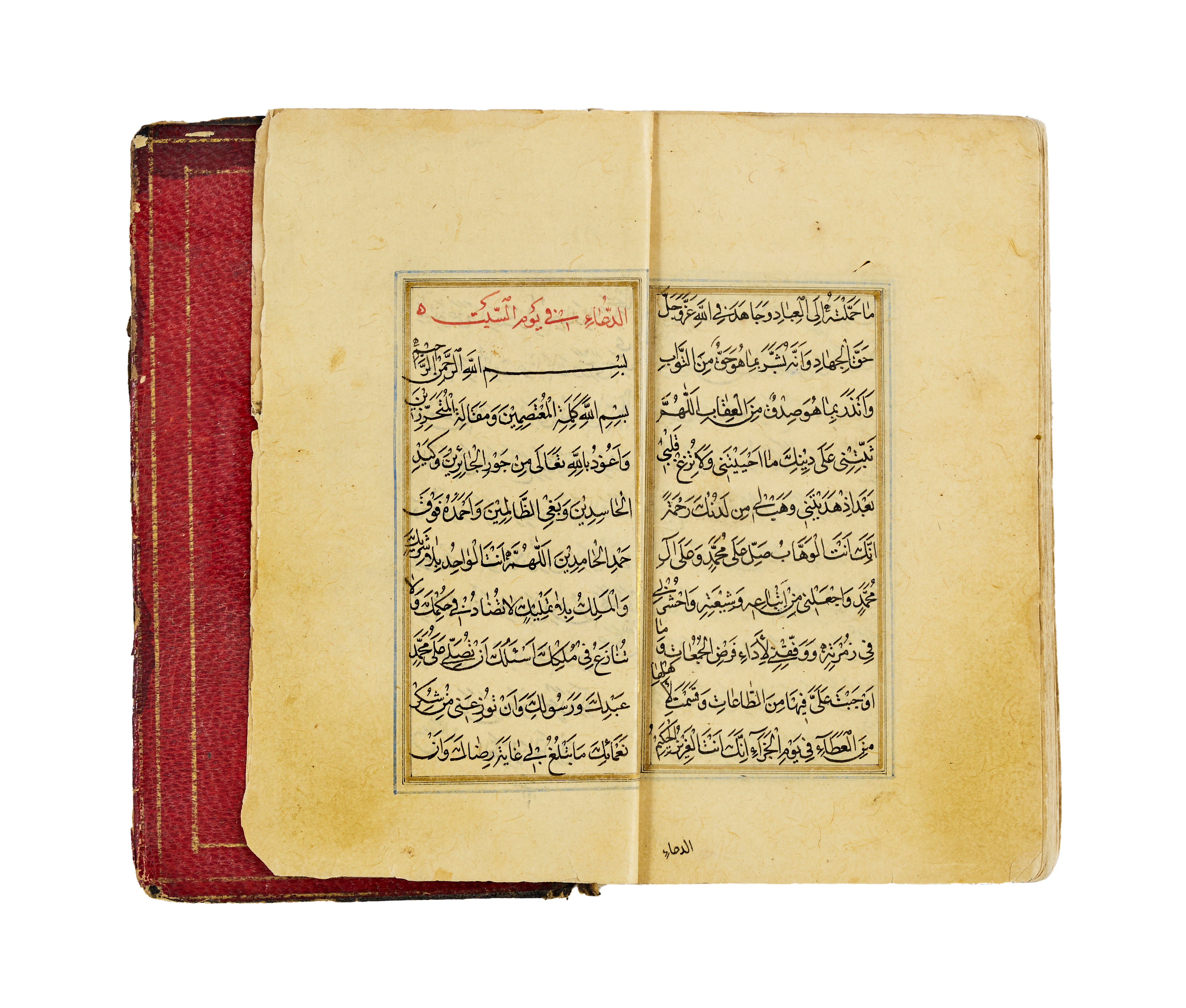 A finely illuminated Safavid manuscript containing a collection of Hadith and devotional prayers arranged according to the days of the week, produced in Persia around the year 1700. The text is penned in clear and elegant naskh script in black ink, with rubrication and occasional marginalia. The manuscript opens with a richly decorated headpiece in gold, cobalt blue, and floral motifs. The layout is organised in double columns, framed with blue and gold rules throughout, preserving a symmetrical and balanced aesthetic. The leather binding, featuring a black cover with central and corner medallions gilt and painted in red and gold.