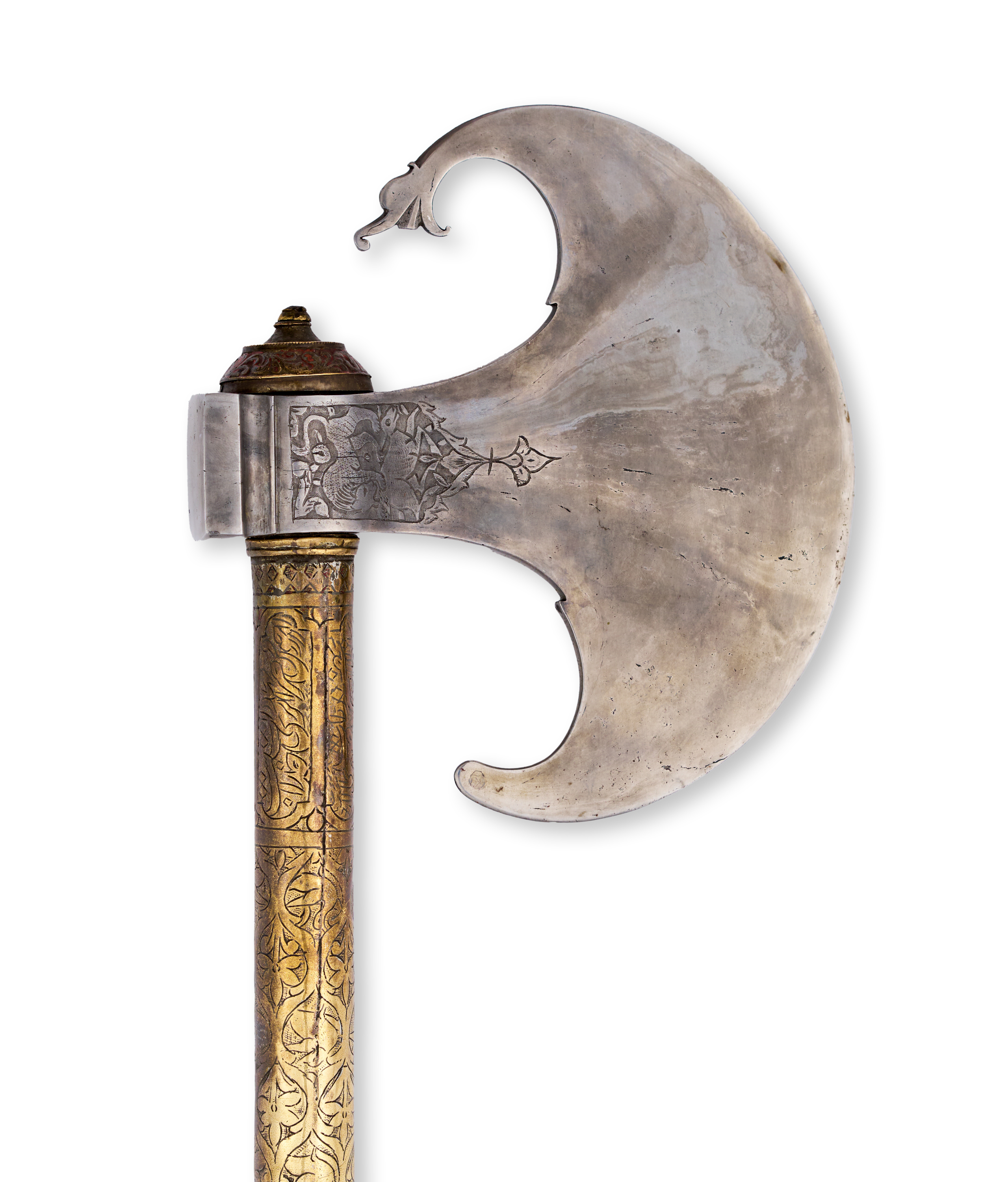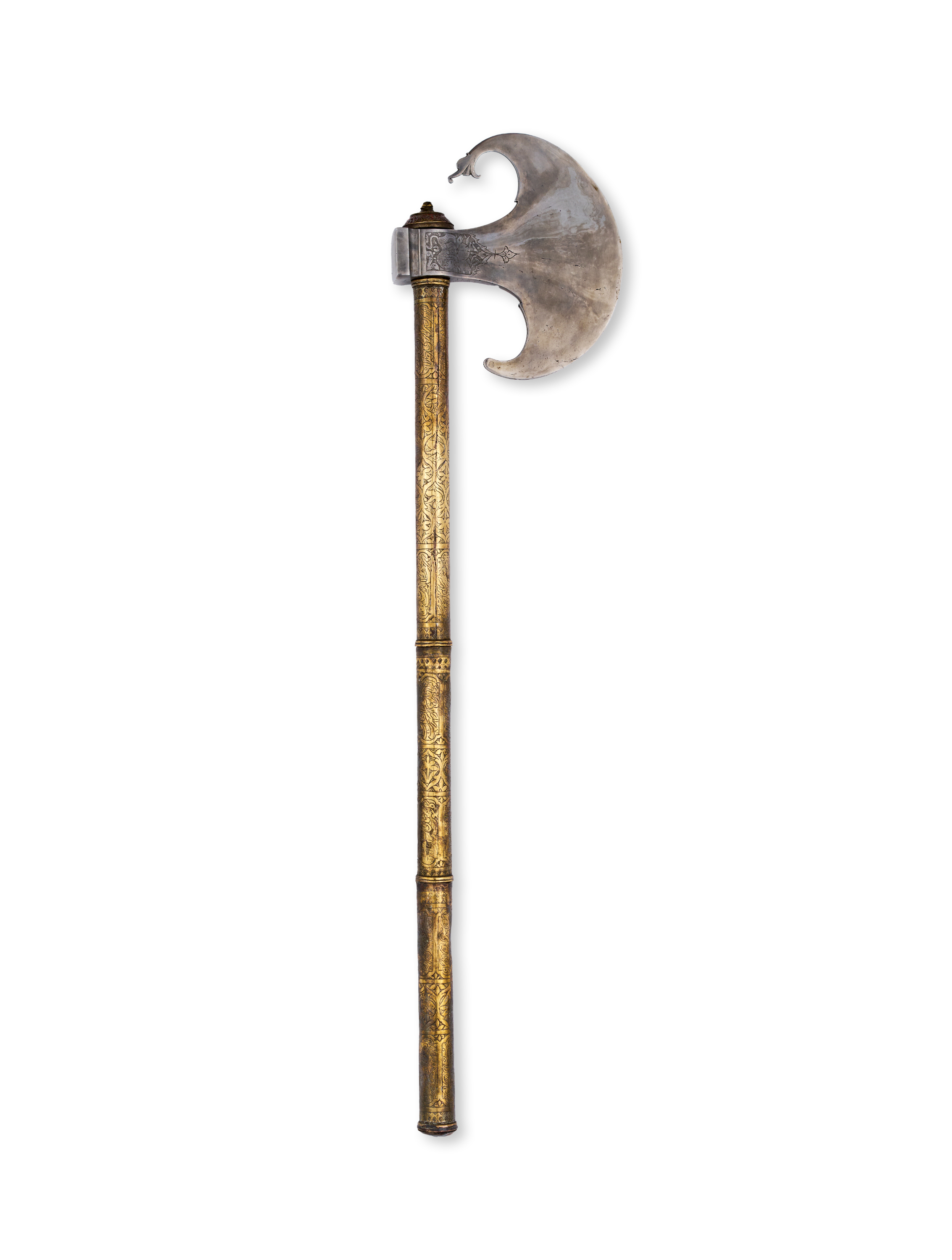 Featuring a large crescent-shaped steel blade with an upward-pointing spur and fine etched decoration. The axe head is mounted on a long cylindrical shaft, which is entirely covered in intricate gold work, showcasing floral and arabesque motifs along with panels of calligraphic inscriptions.