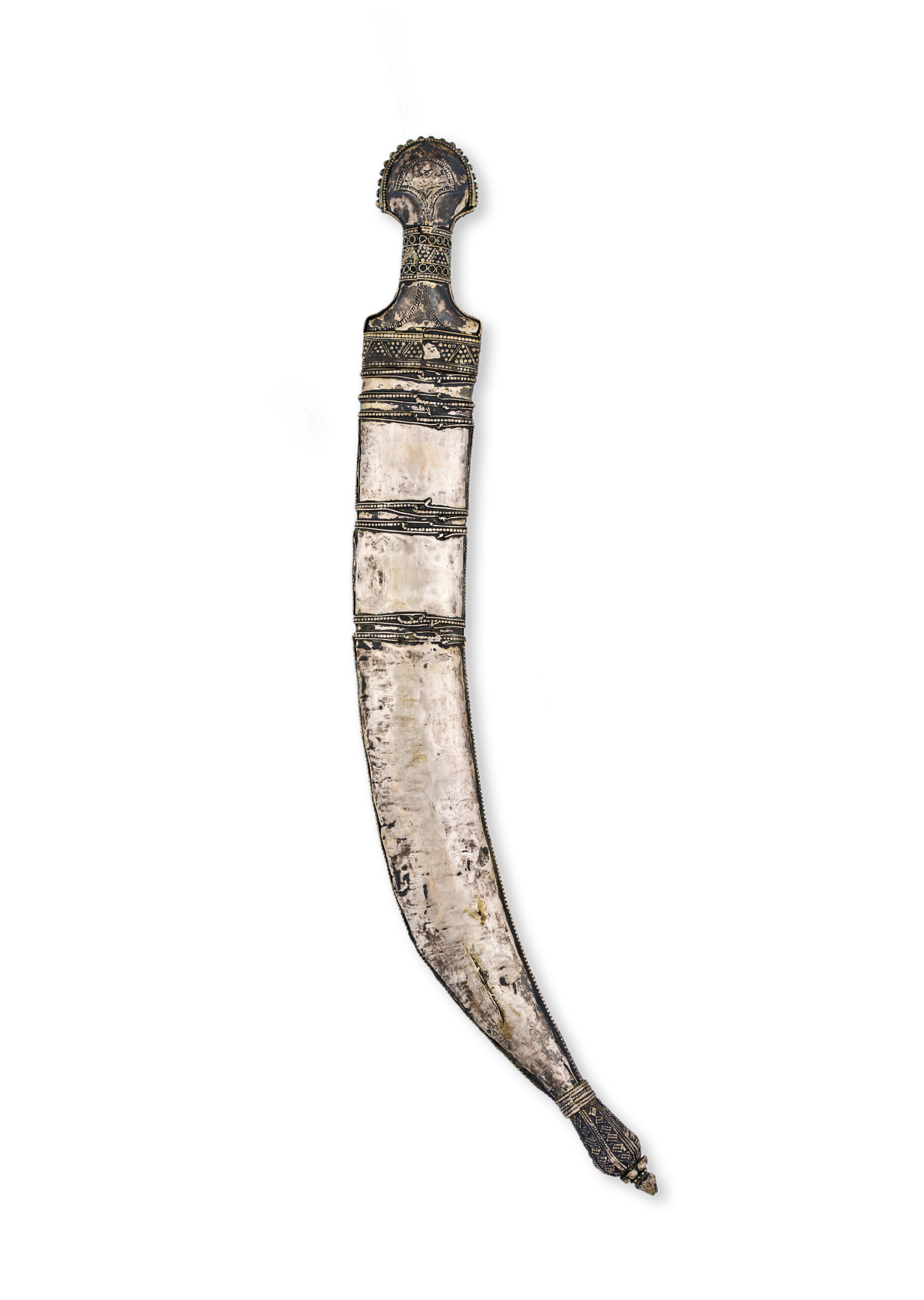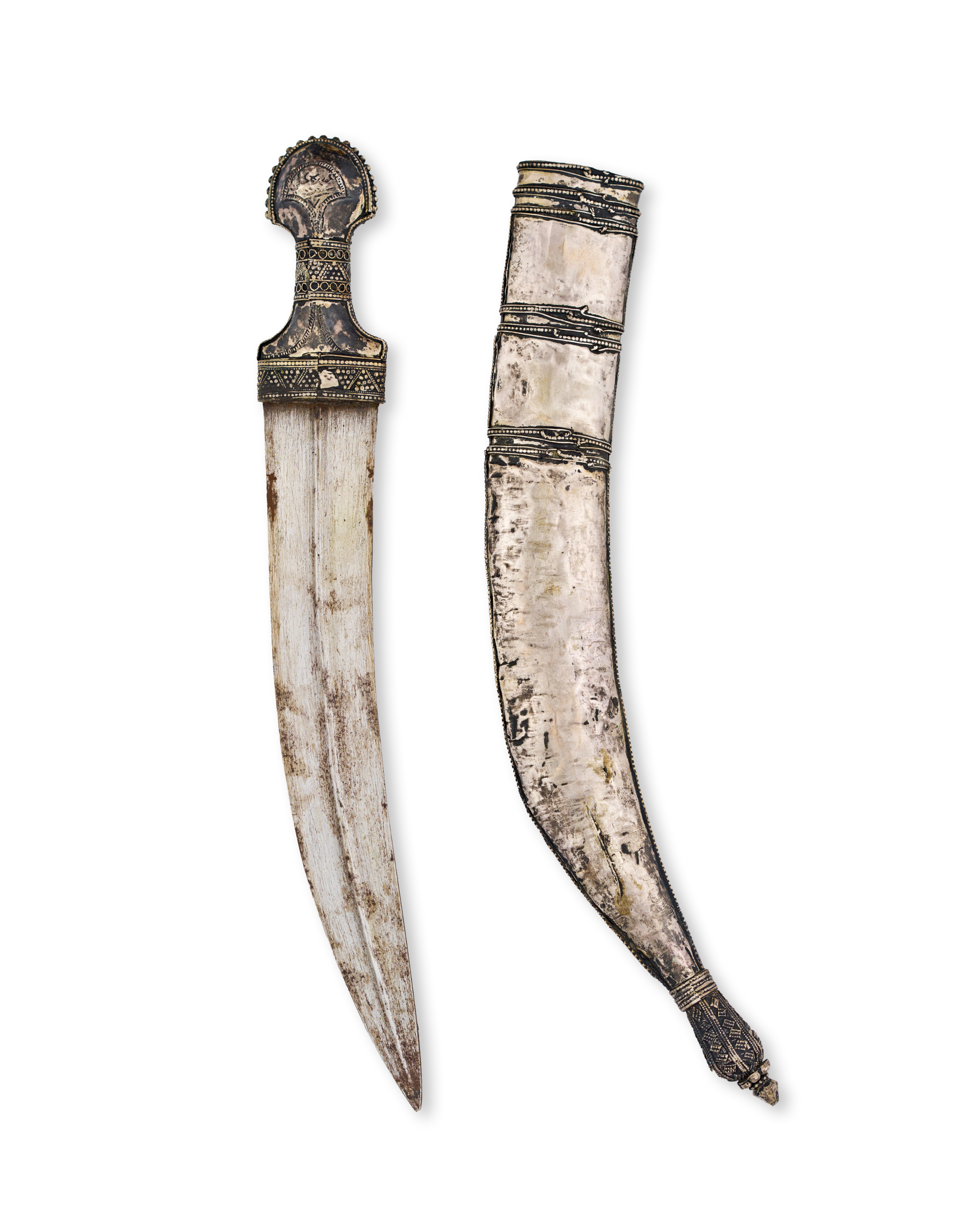 Richly mounted in white metal, the curved double-edged blade is housed in an equally curved sheath, both of which are decorated with intricate silverwork in a geometric and foliate patterns. The hilt features a rounded pommel with raised metal domes and granulated detailing, the sheath is elaborately adorned with finely chased and filigree motifs arranged in horizontal panels.