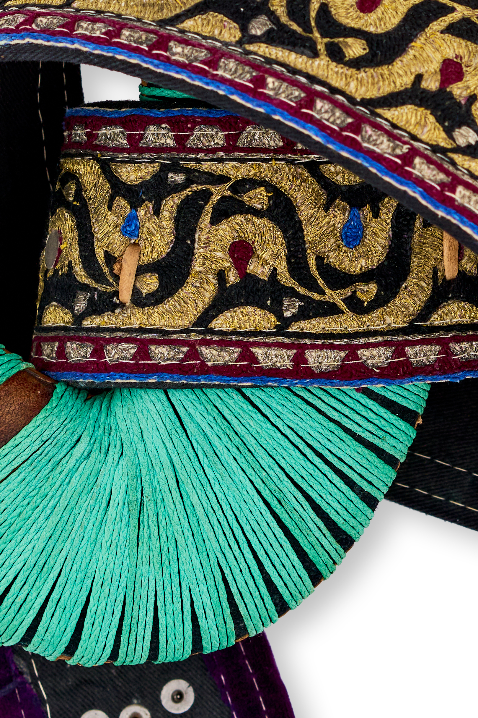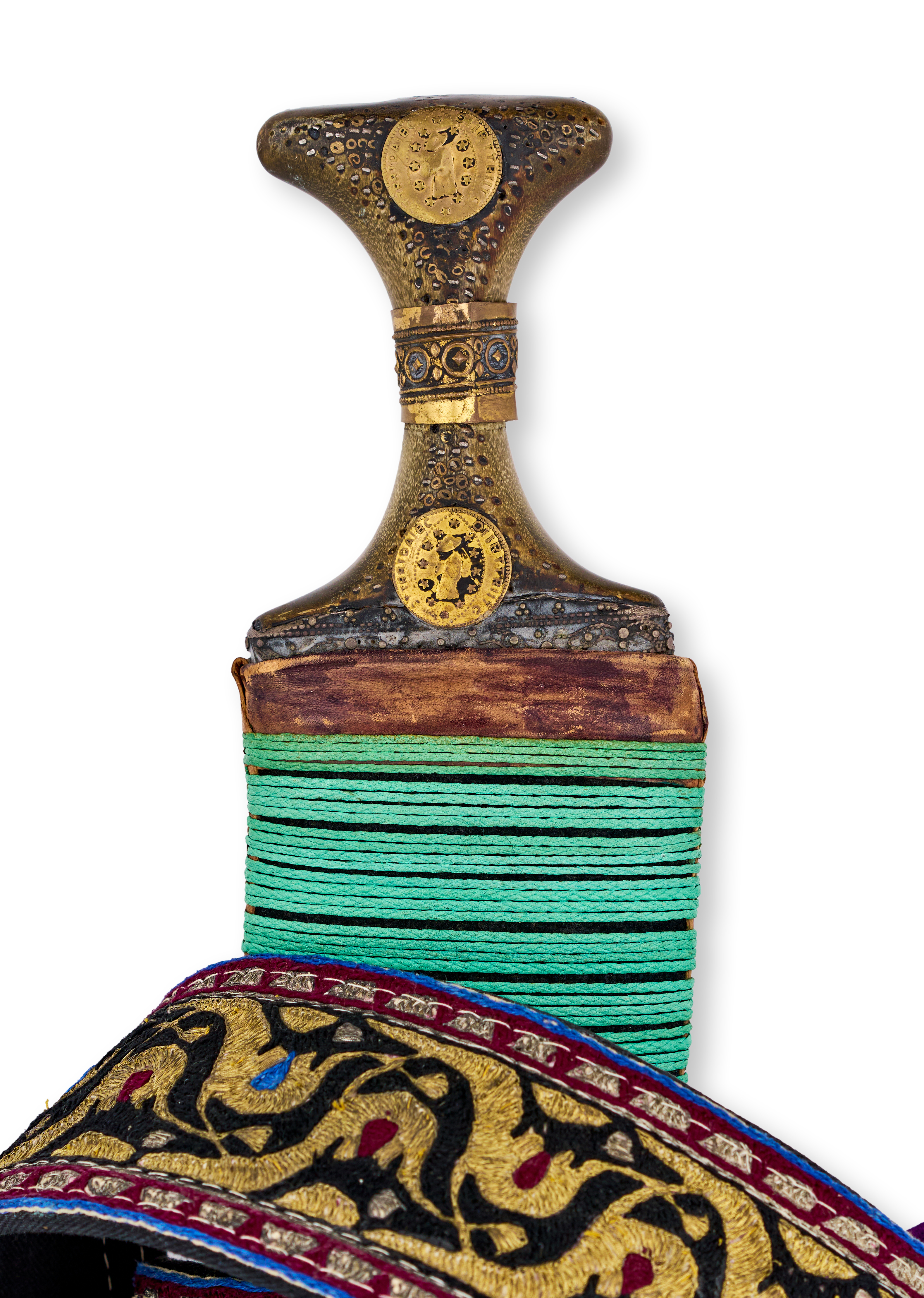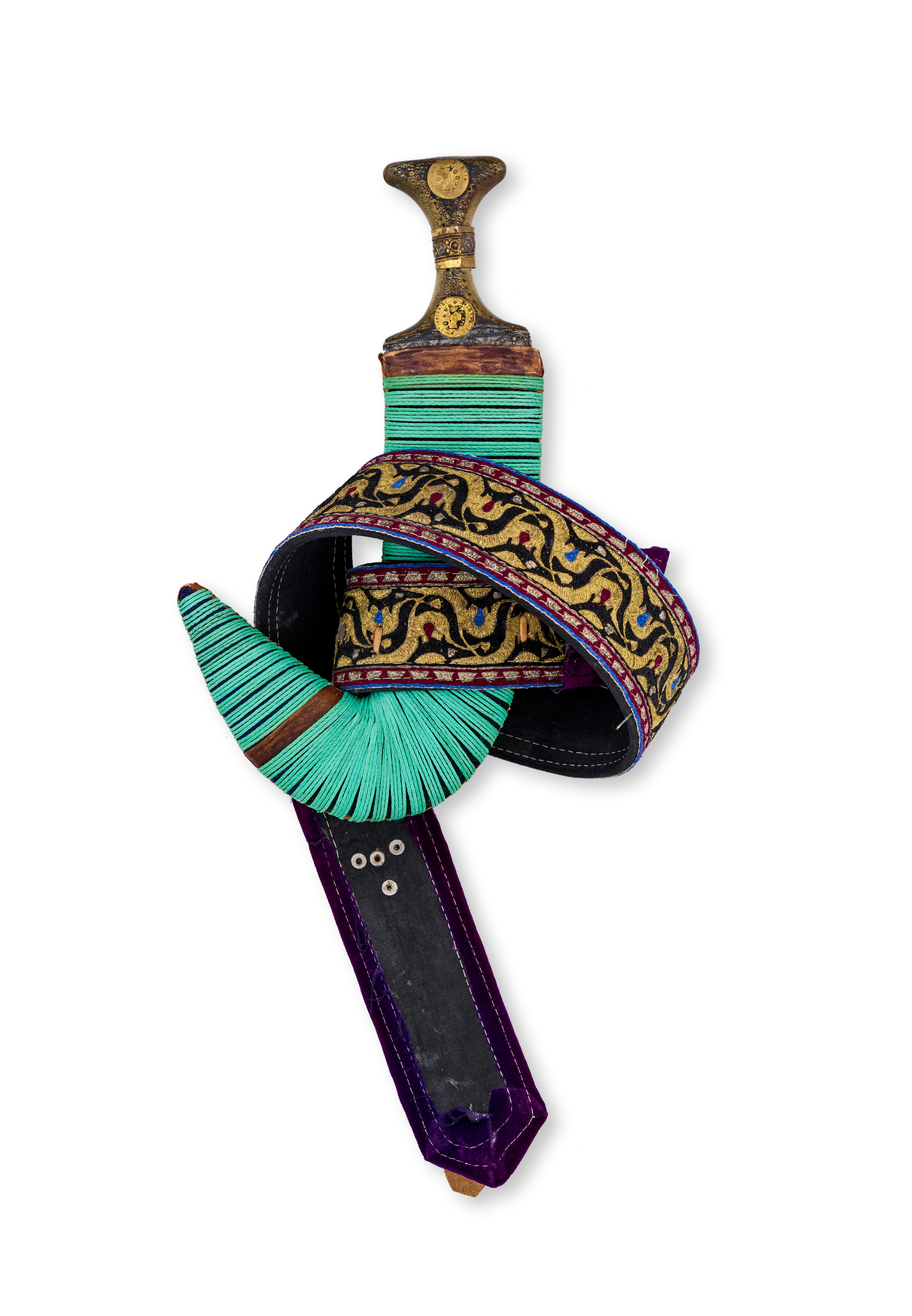 The dagger features a pronounced, curved steel blade with a central ridge and a hilt adorned with decorative circular medallions and intricate metalwork. The scabbard is tightly wrapped in vibrant turquoise cord, with a velvet-covered lower section and a richly embroidered textile band featuring colourful foliate and geometric motifs in gold, red, and blue.