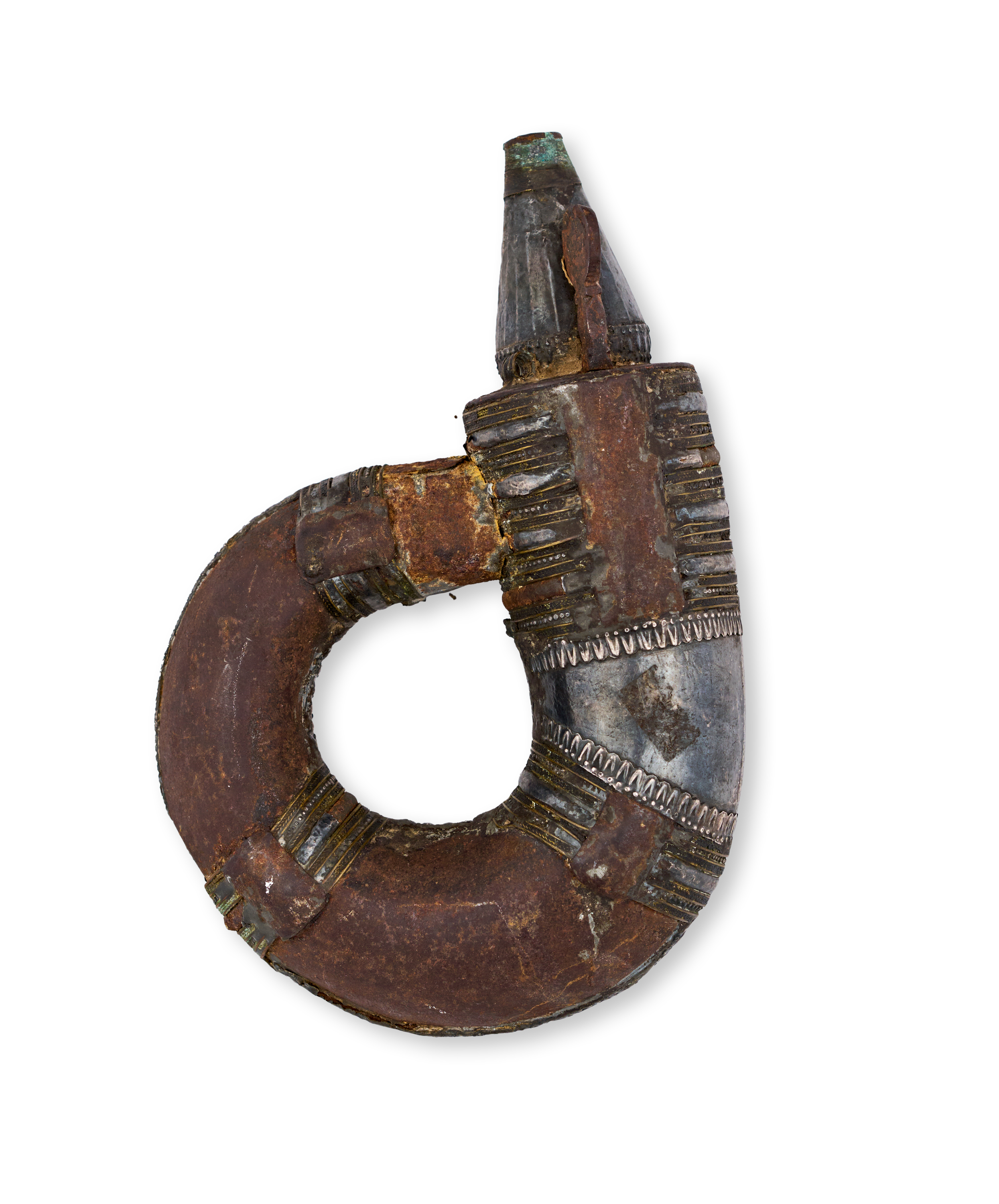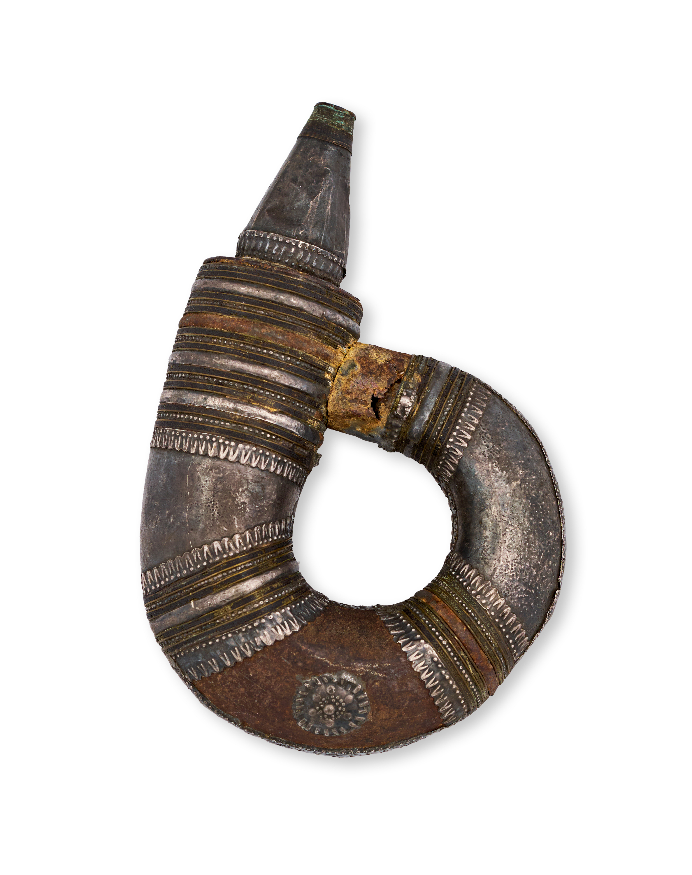 The flask body is wrapped in leather and adorned with bands of decorative silver sheet and wirework, including patterned borders and embossed medallions.