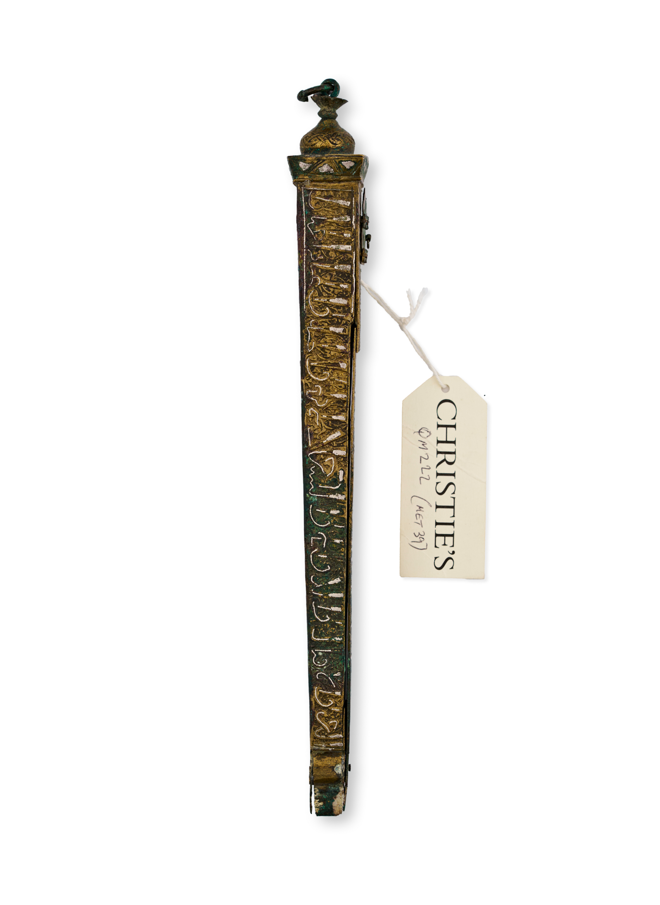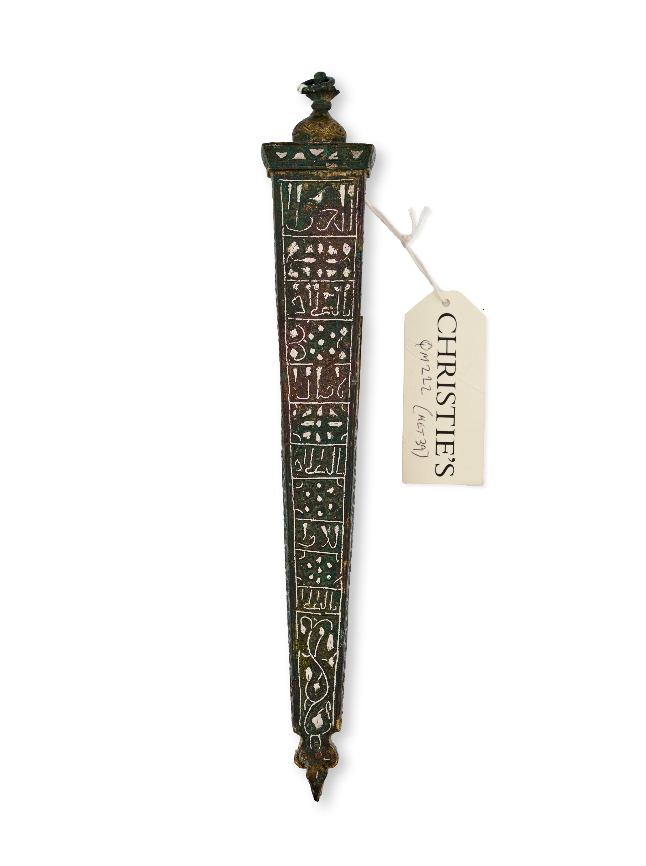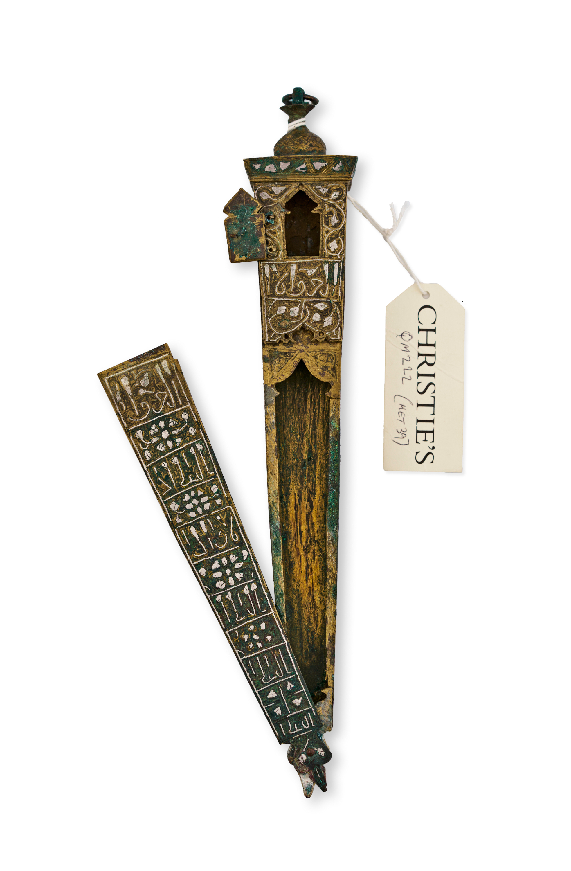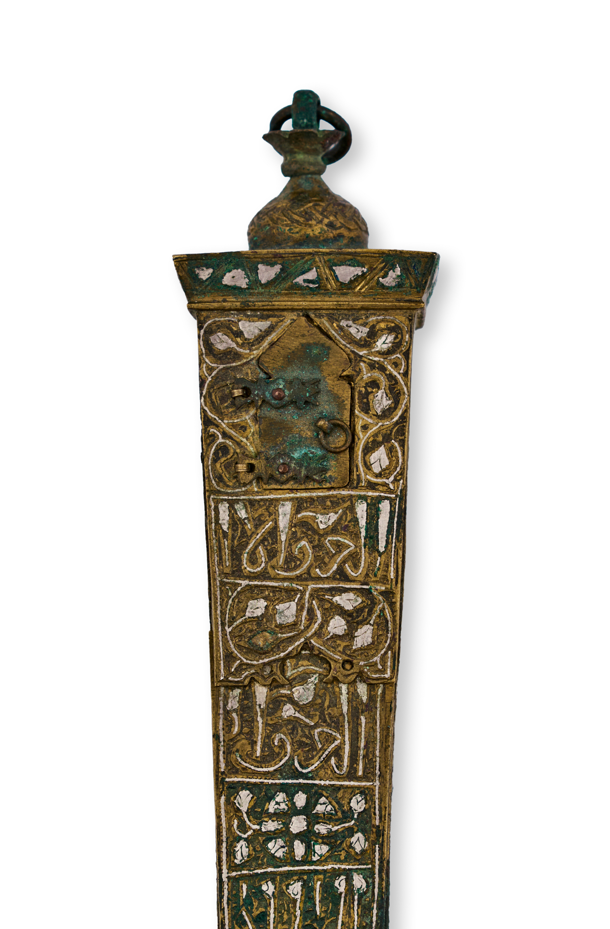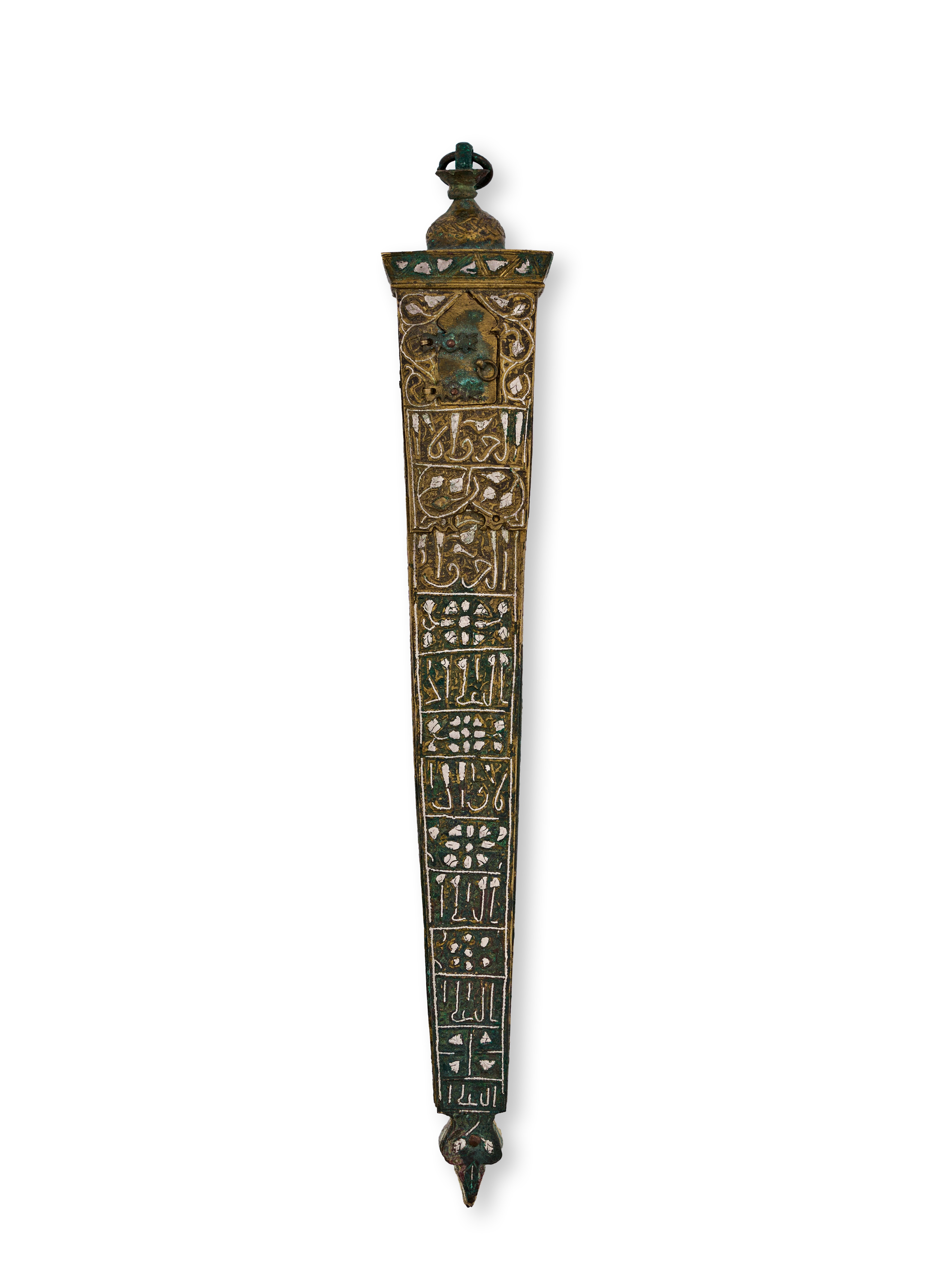The elongated, tapering form is decorated on all sides with intricate calligraphy panels, floral motifs, and geometric ornamentation. The lid is surmounted by a domed finial and features a hinged door shaped like an arched window.