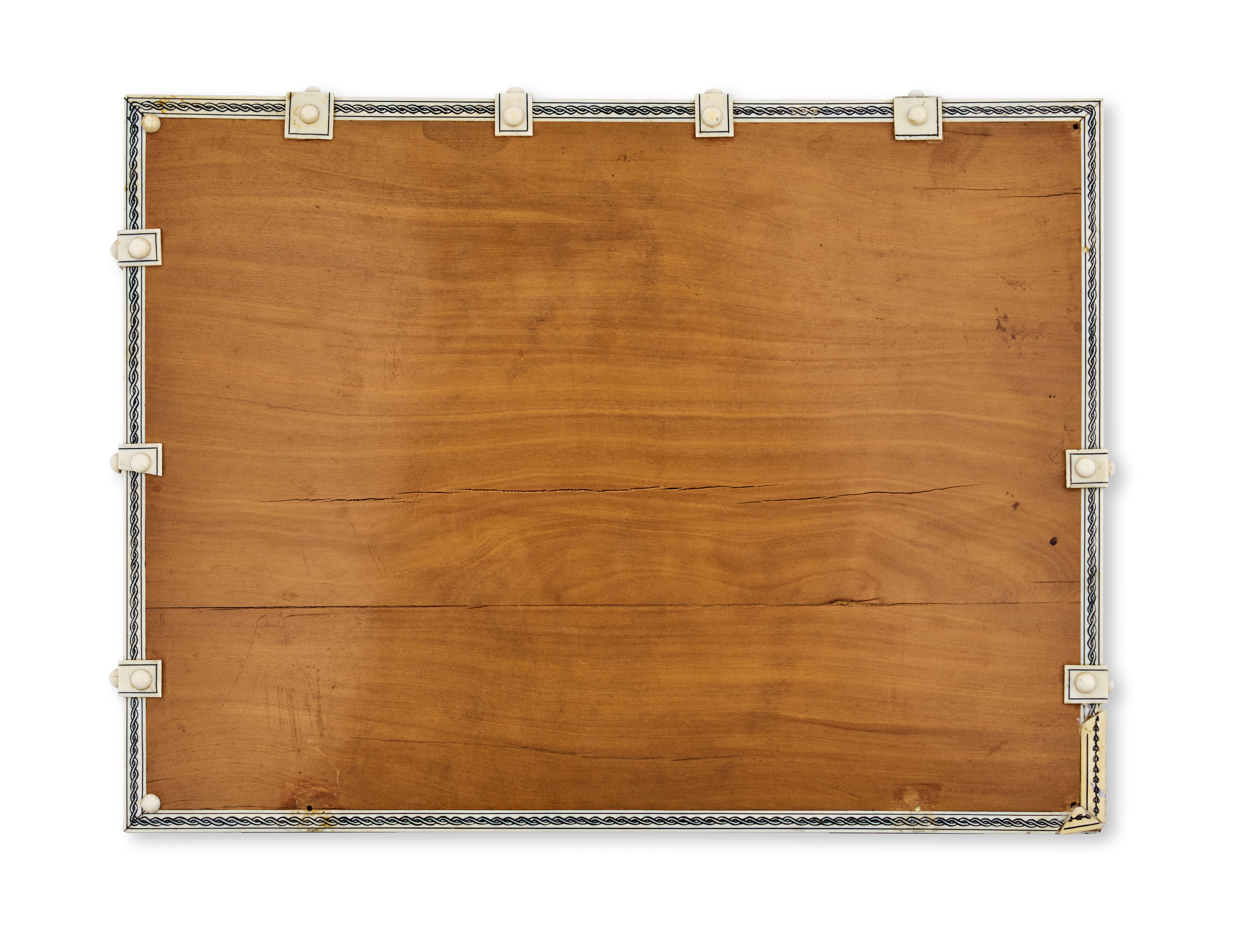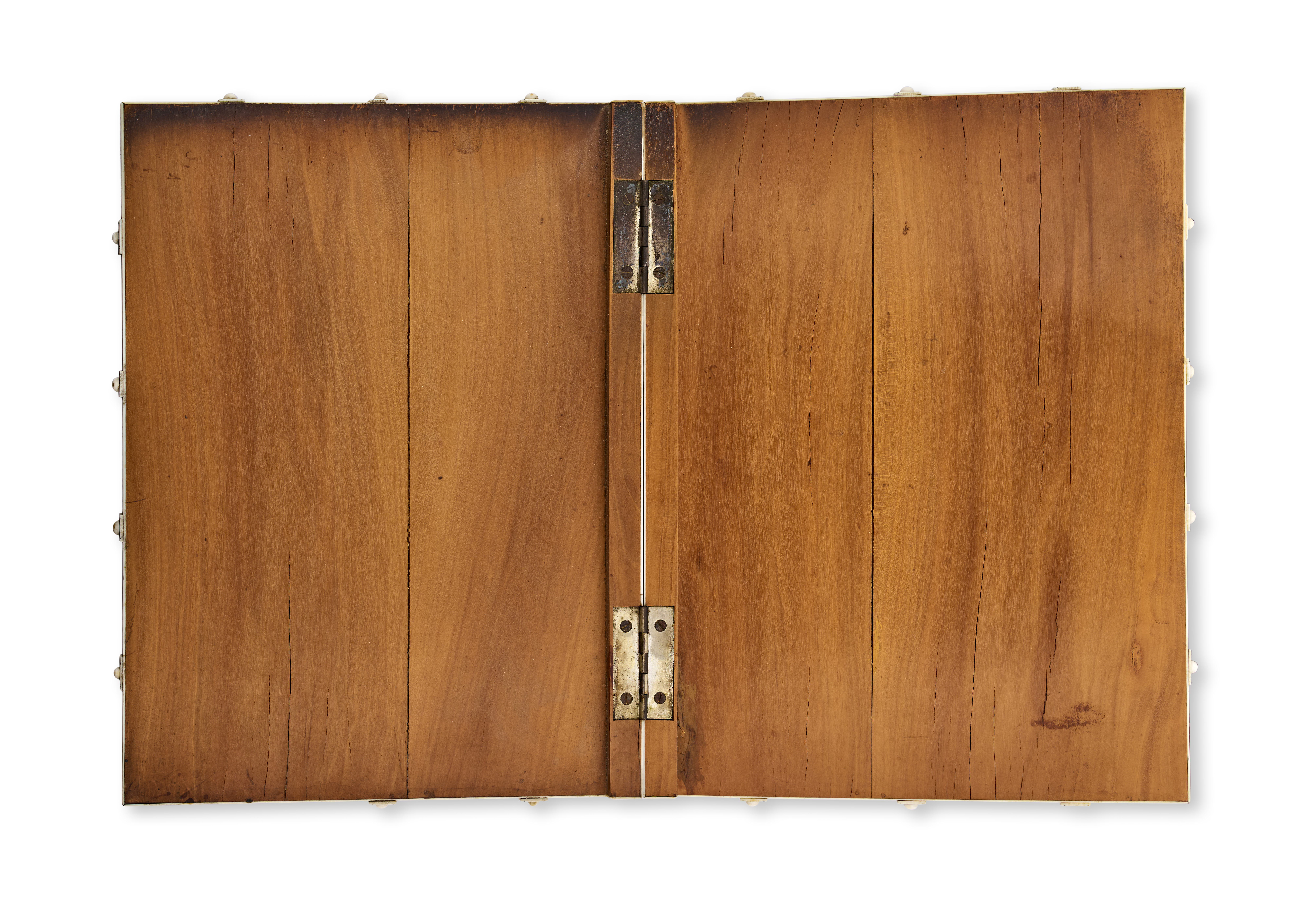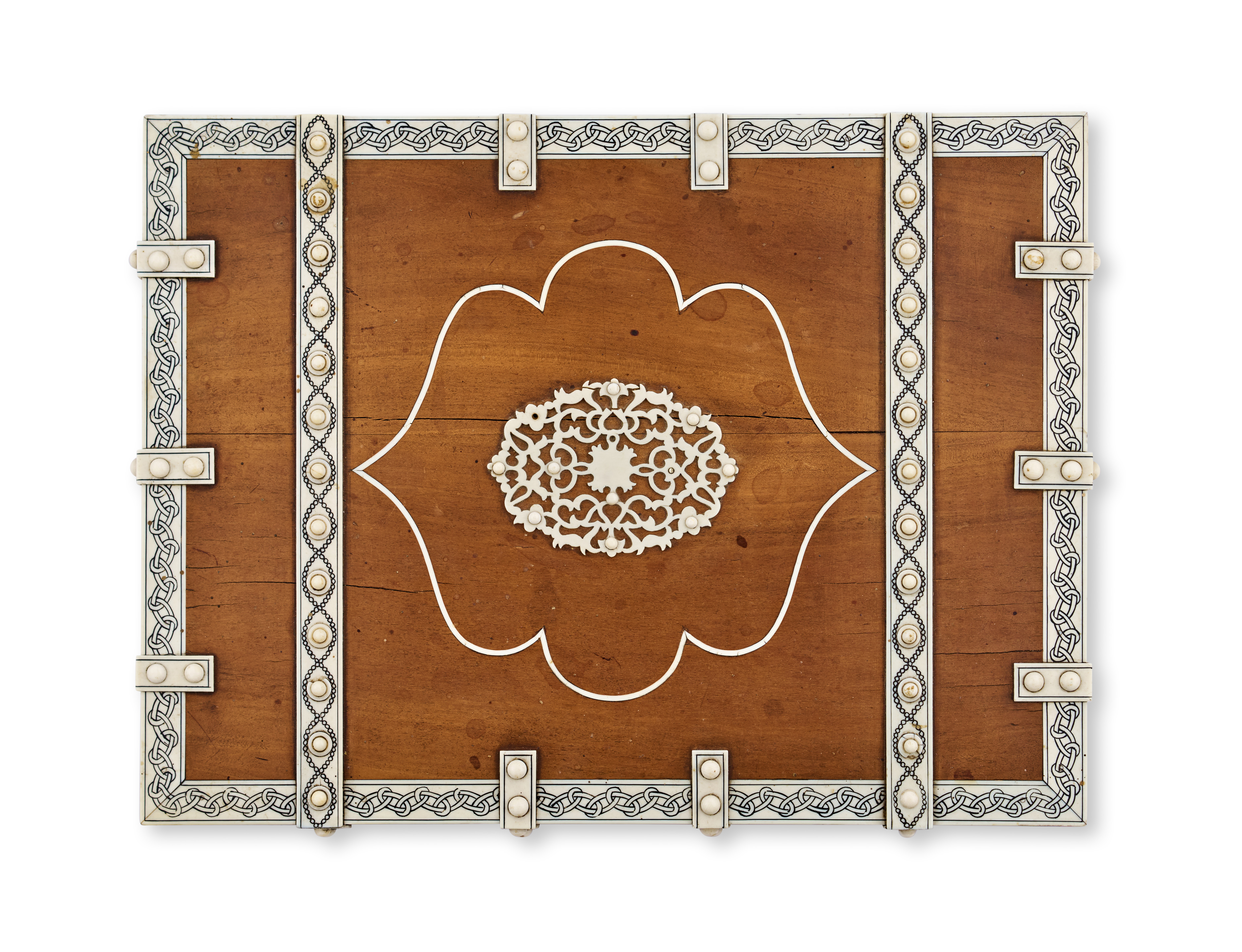 The surface is decorated with inlaid ivory designs, including a central floral medallion and a scalloped border pattern. The cover features a warm brown sandalwood base, with white inlay arranged in intricate geometric and interlacing motifs, and metal hinges along the spine edge.