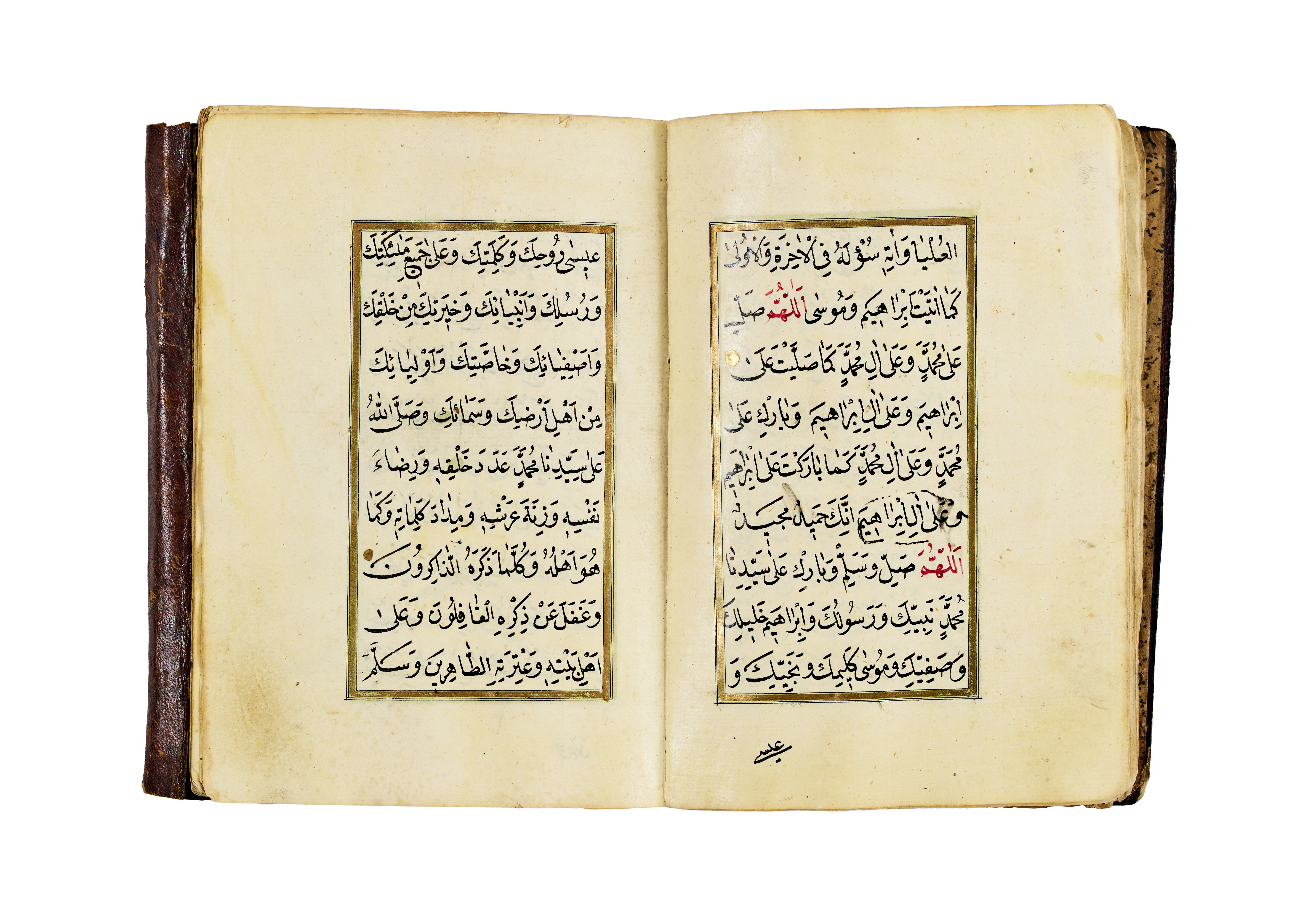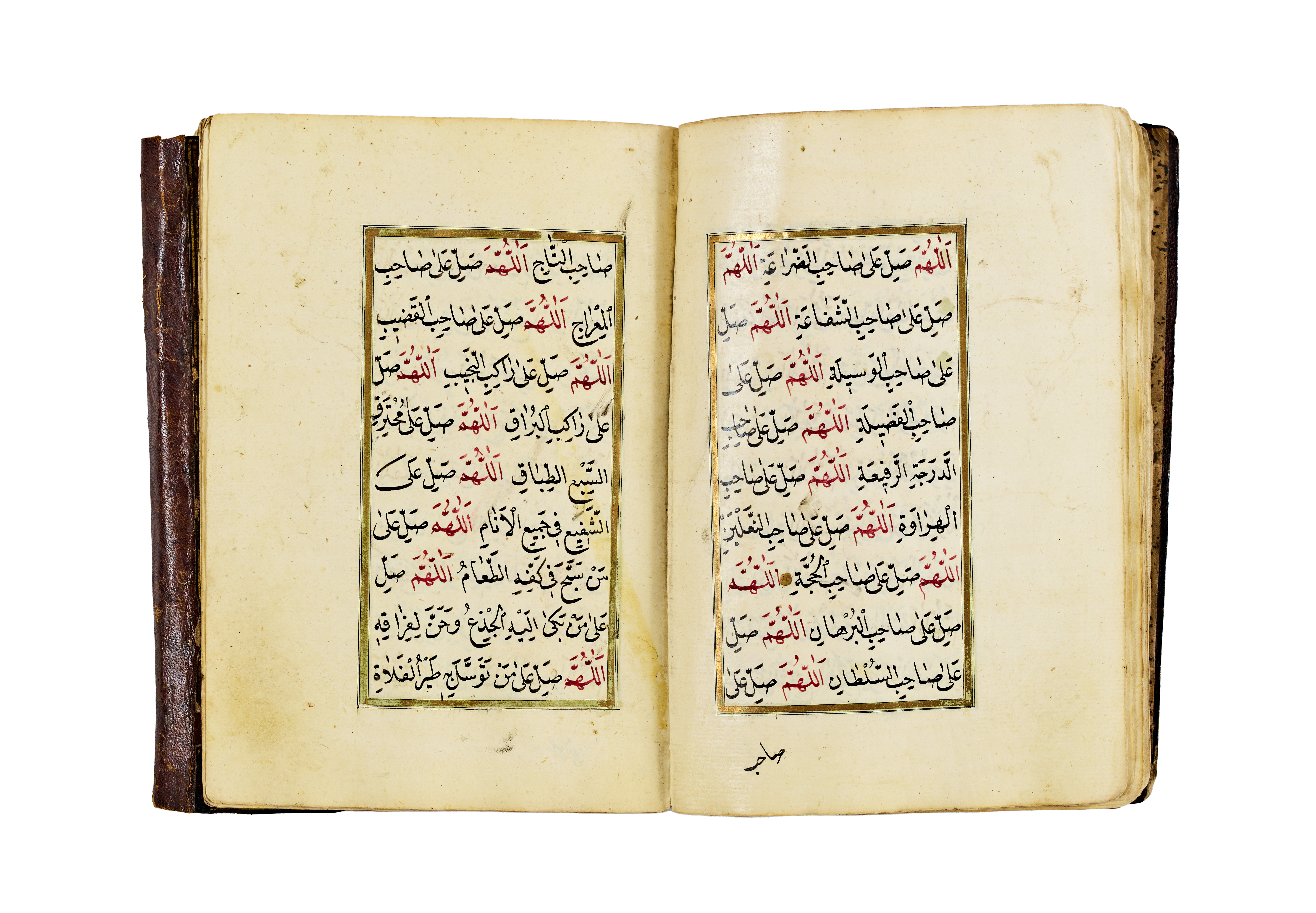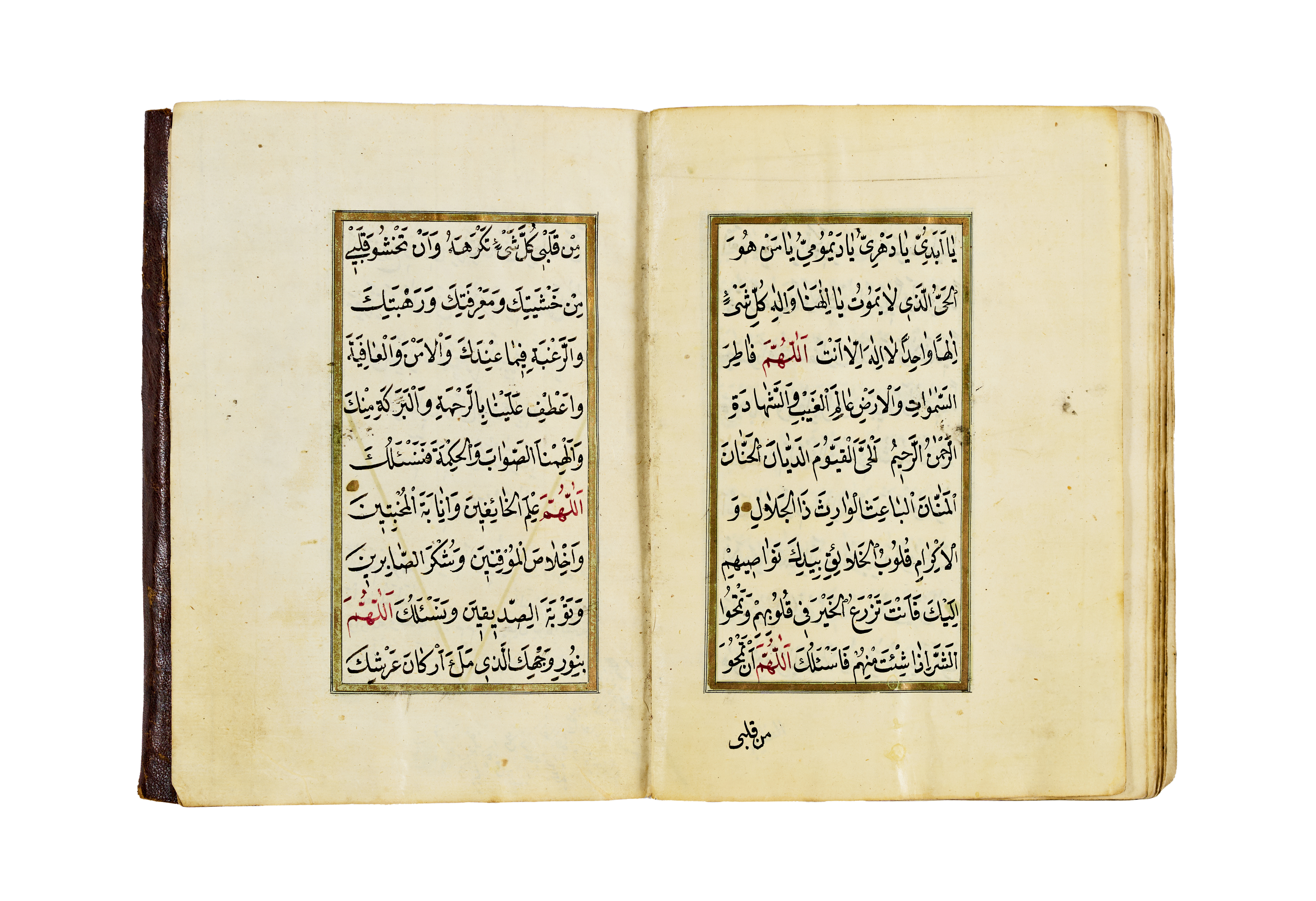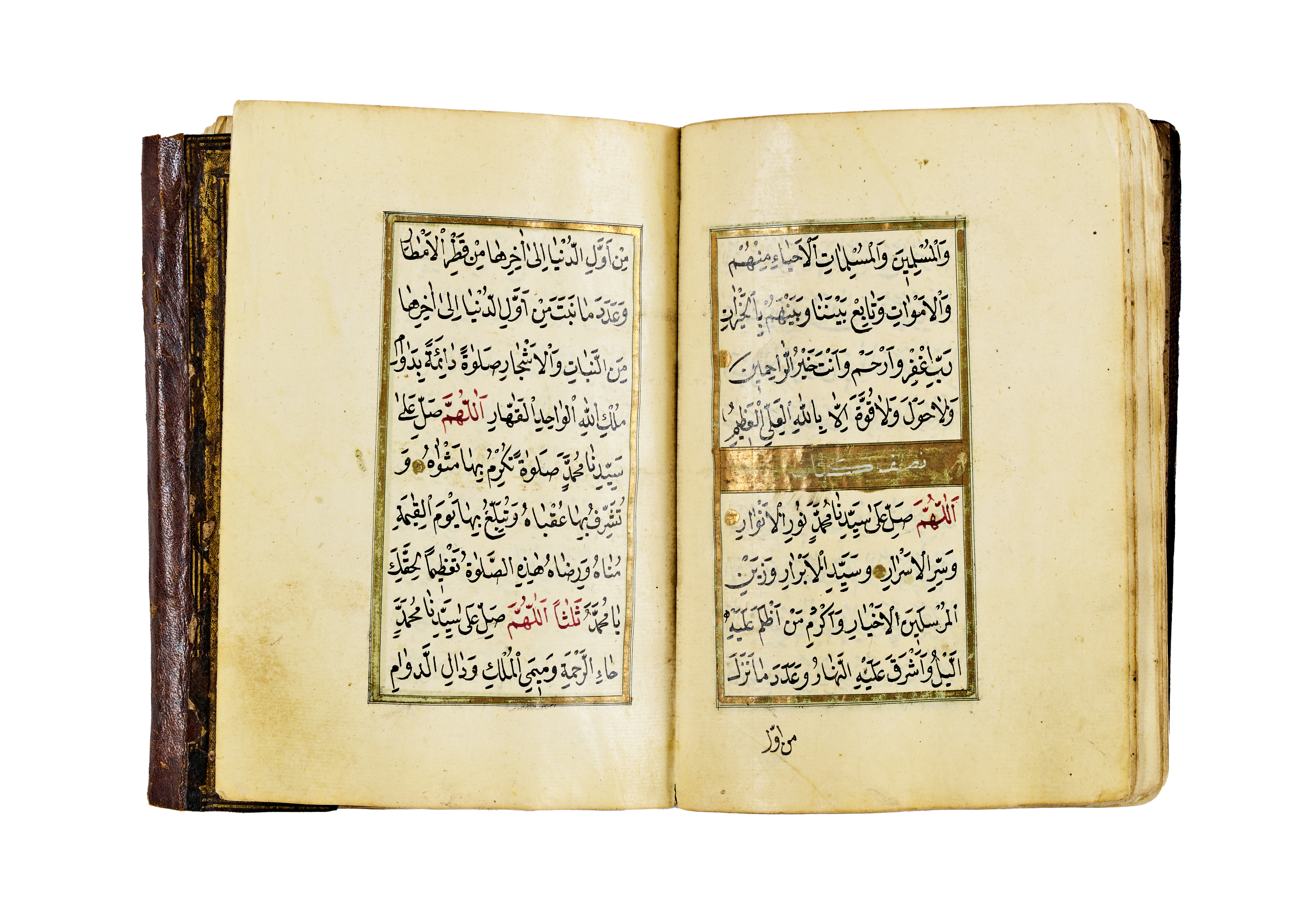 The manuscript features a series of supplications and blessings written in clear Ottoman naskh script, with alternating red and black inks used for visual clarity and liturgical emphasis. It opens with an intricate headpiece in gold and floral motifs, a hallmark of Ottoman manuscript art, framed by delicate red and green ruling. The pages are laid out in a two-column format, aligned within gold and colour borders.
