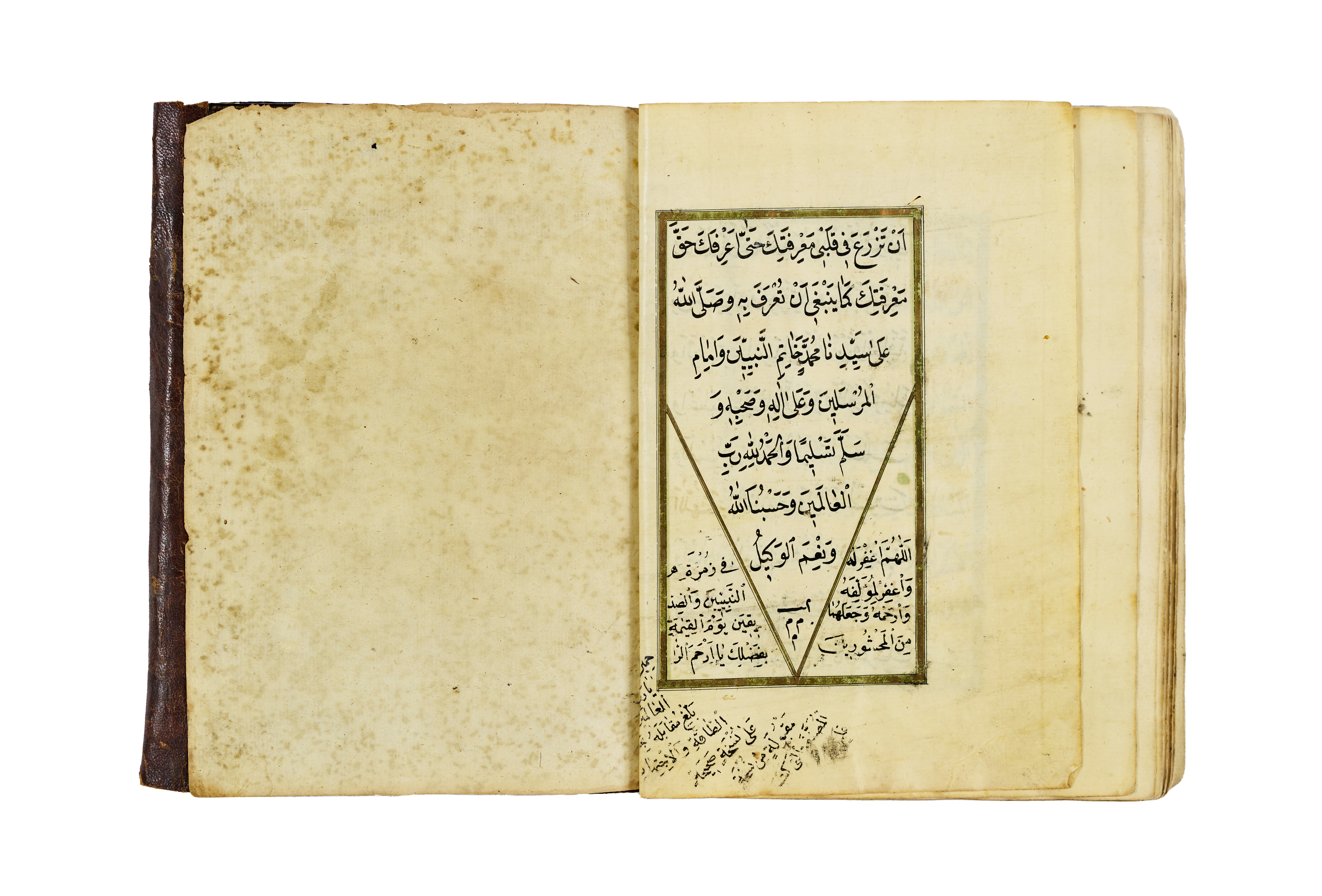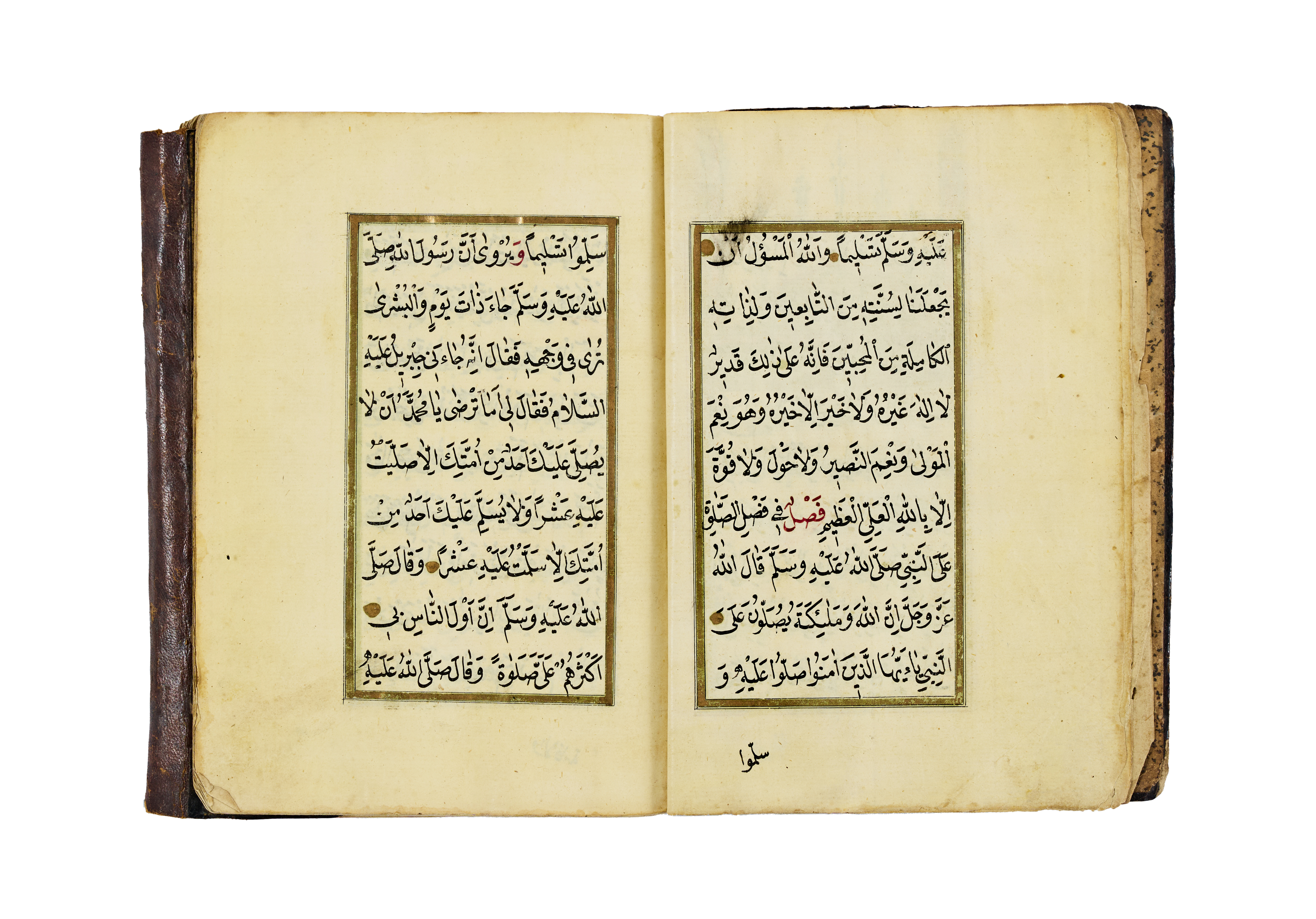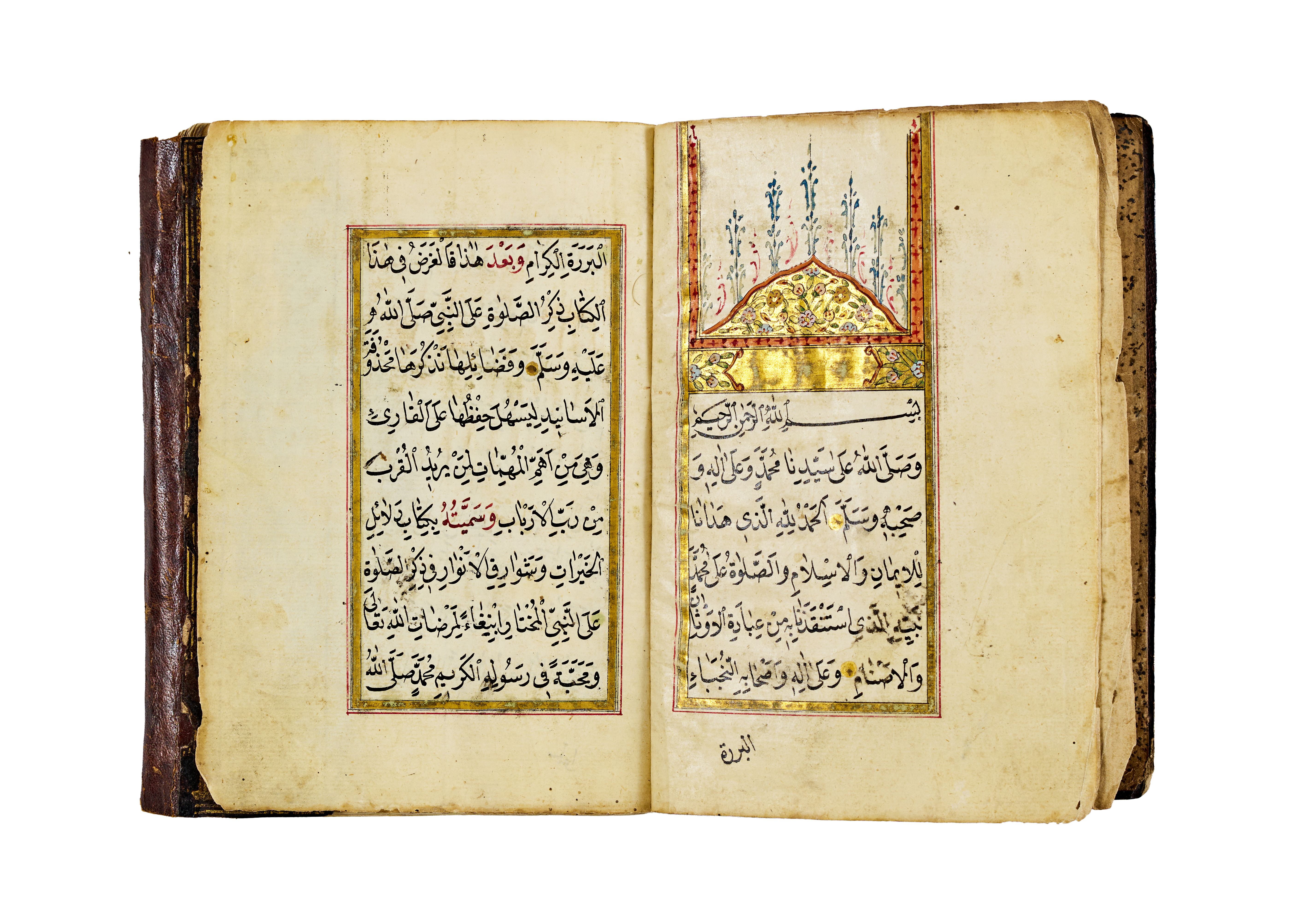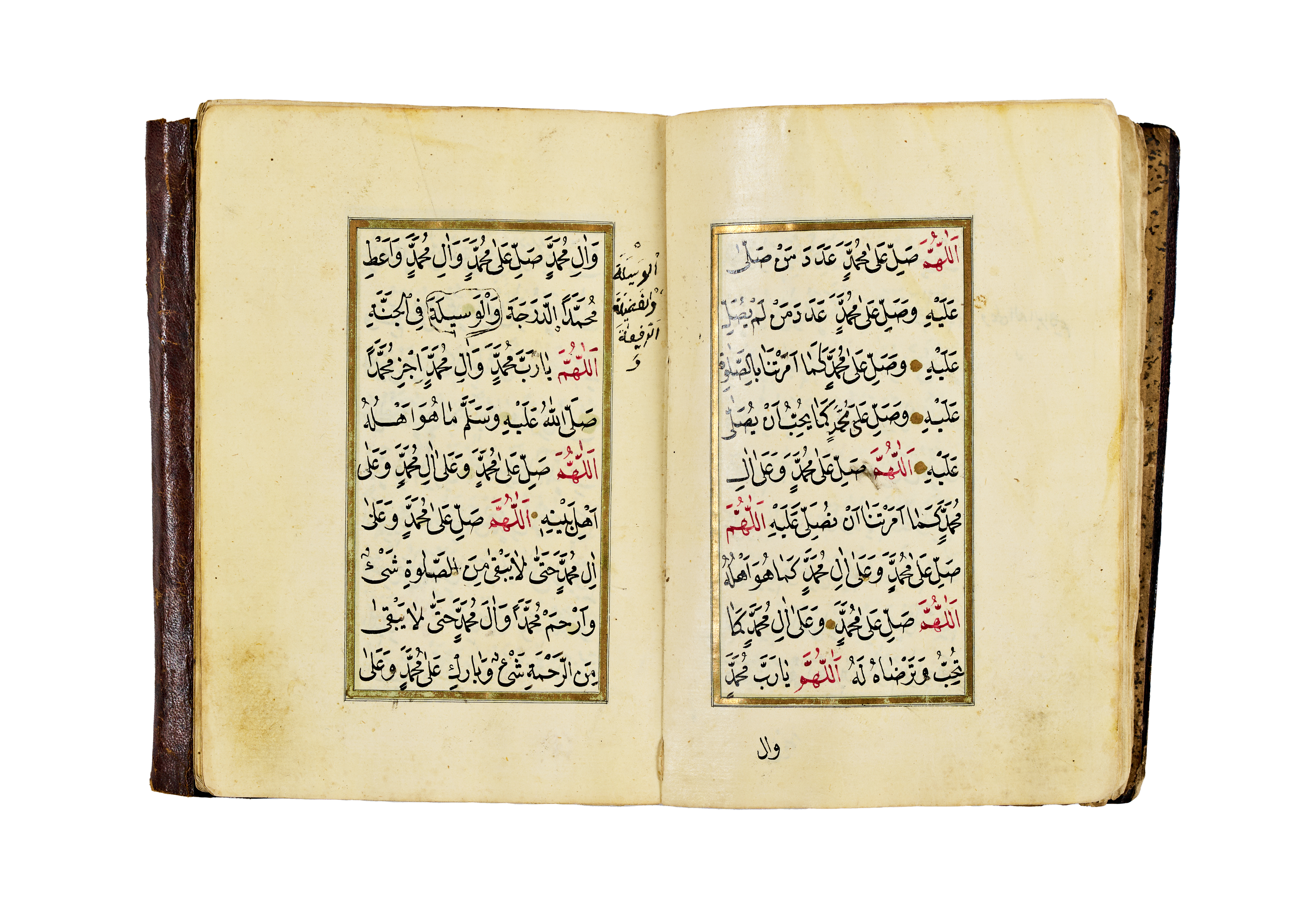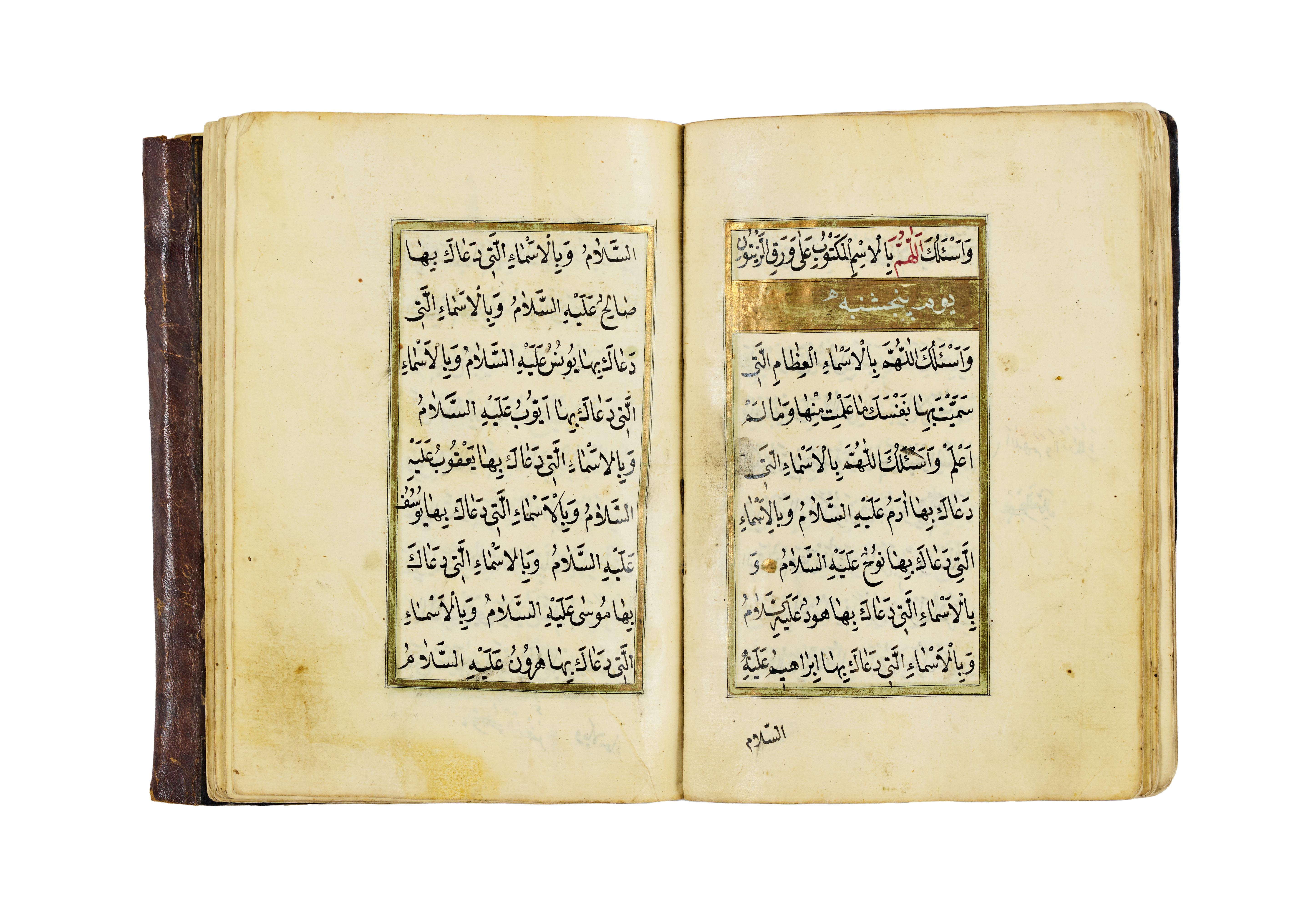 The manuscript features a series of supplications and blessings written in clear Ottoman naskh script, with alternating red and black inks used for visual clarity and liturgical emphasis. It opens with an intricate headpiece in gold and floral motifs, a hallmark of Ottoman manuscript art, framed by delicate red and green ruling. The pages are laid out in a two-column format, aligned within gold and colour borders.