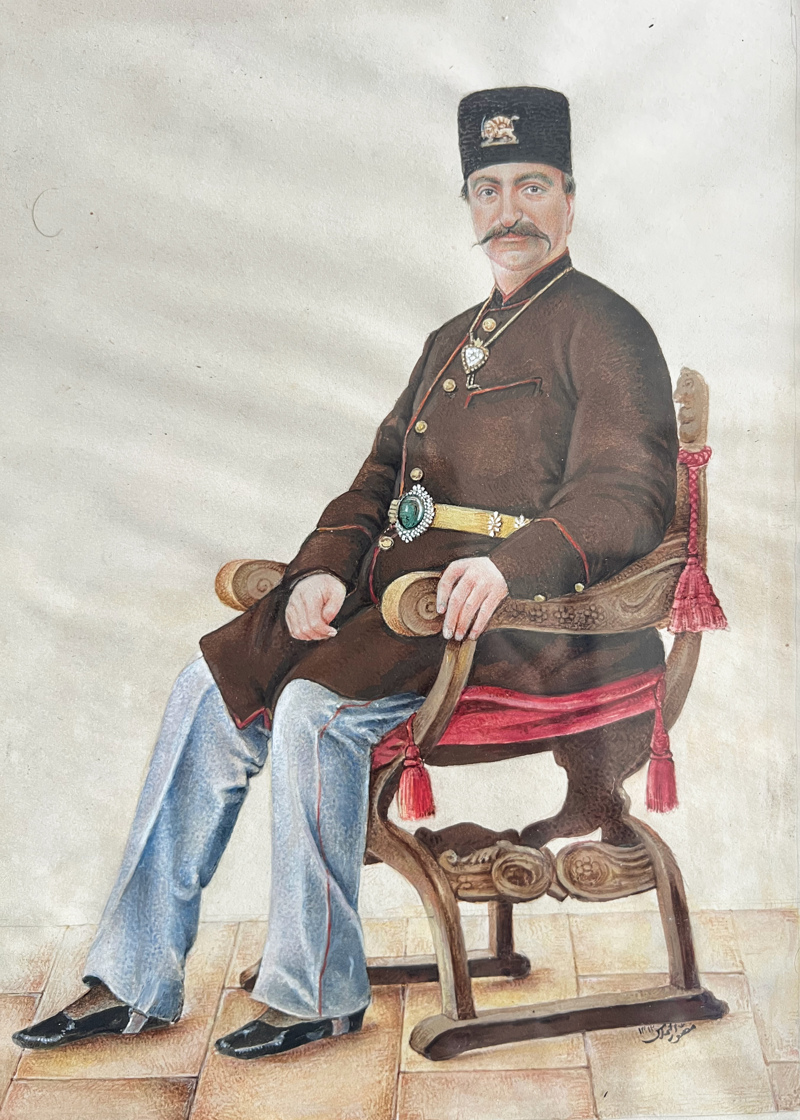 This elegant gouache painting on paper features a seated portrait of Naser al-Din Shah Qajar (r. 1848–1896), the longest-reigning monarch of the Qajar dynasty. The Shah is depicted in full regalia, dressed in a dark ceremonial coat with red piping and adorned with jewelled decorations, including a prominent aigrette and enamelled belt clasp. Seated on an ornately carved wooden chair with plush red tassels. The work is signed by Musavvir al-Mulk and dated.