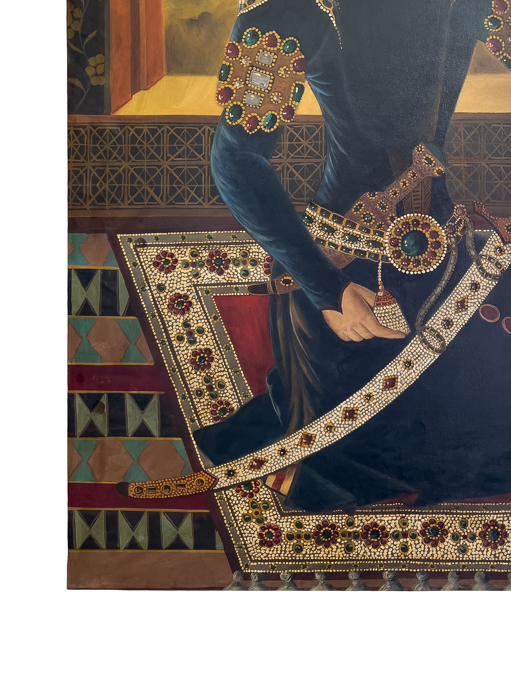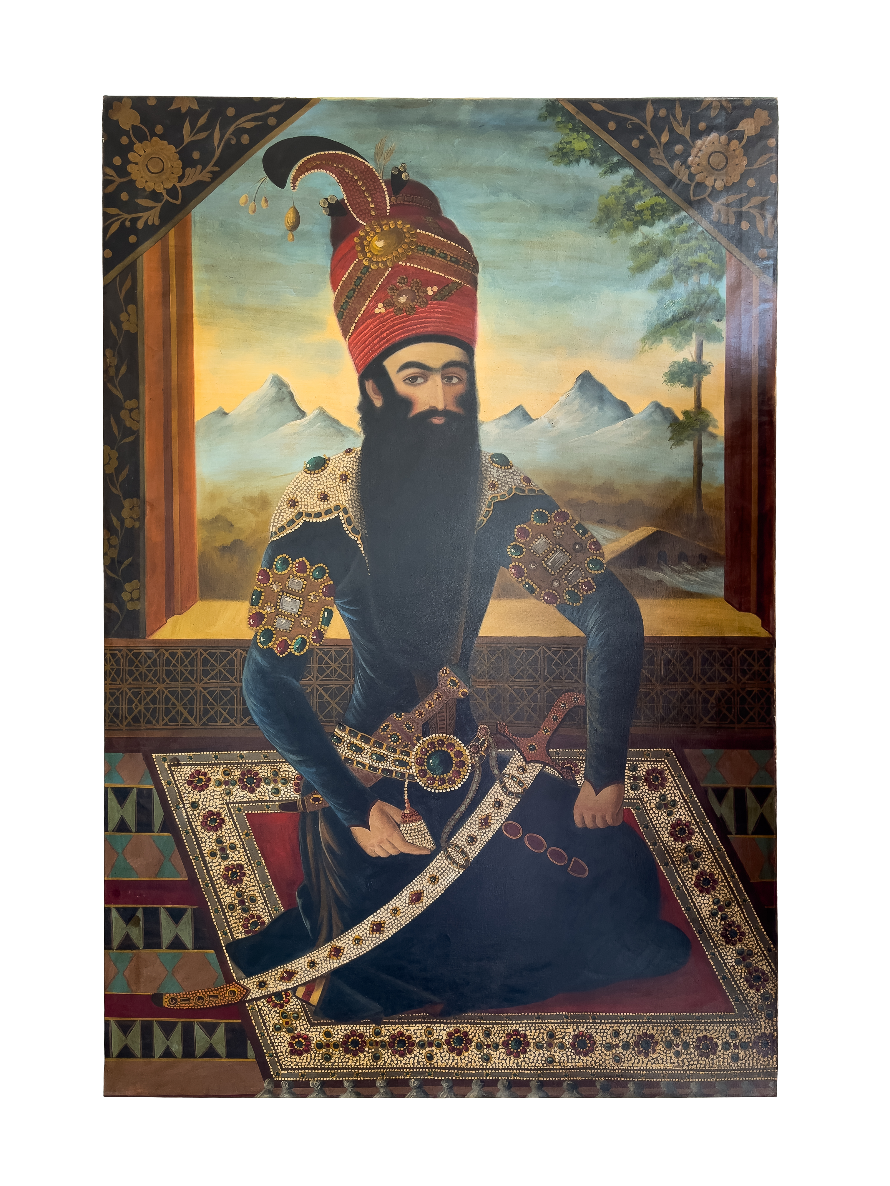 This impressive oil on canvas portrays Fath Ali Shah Qajar (r. 1797–1834), the second Shah of the Qajar dynasty in Persia. The Shah is depicted seated regally on a richly patterned carpet, adorned in an opulent jewelled costume with an elaborately decorated sword and enamelled epaulettes. Set against a mountainous landscape framed by an interior window.