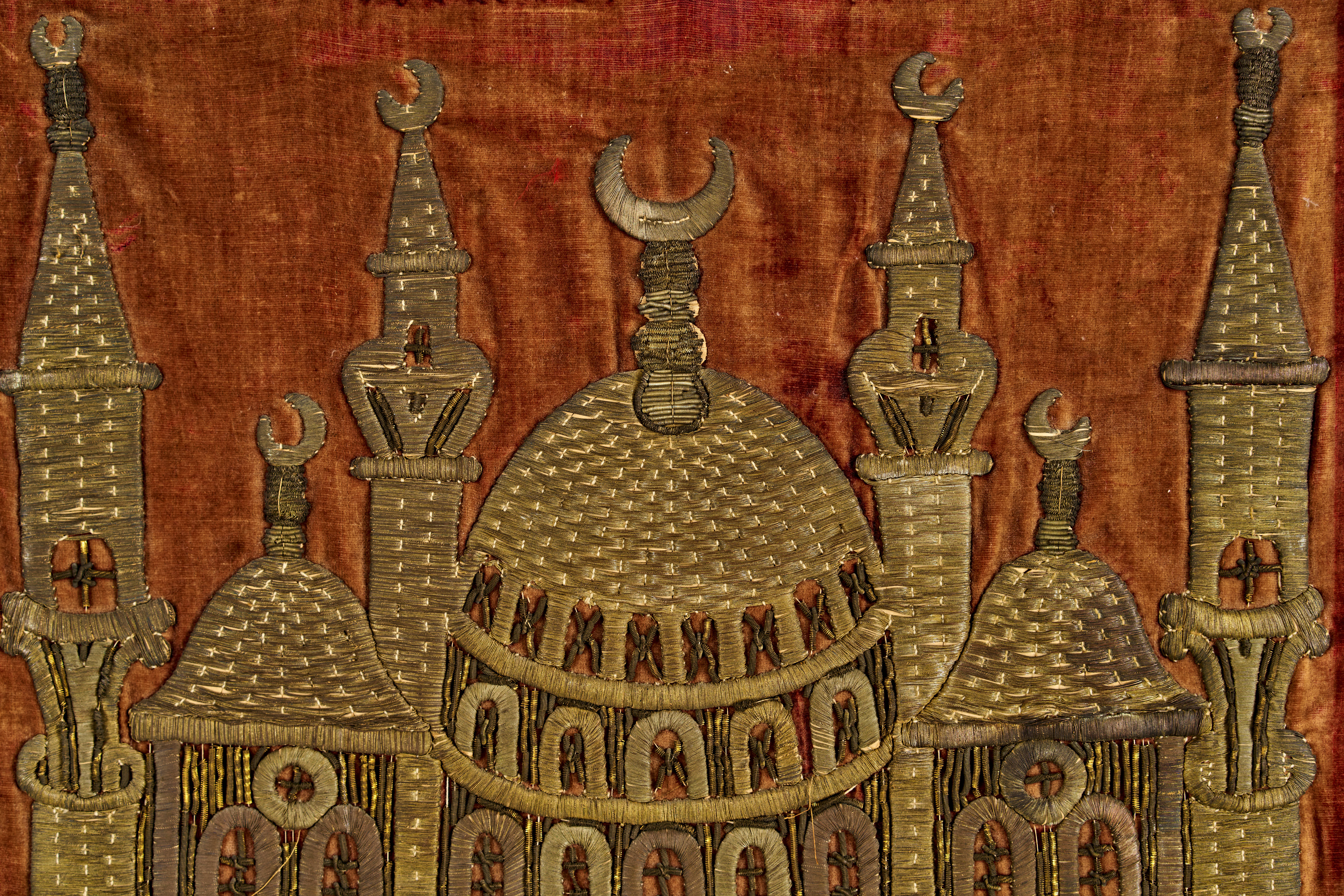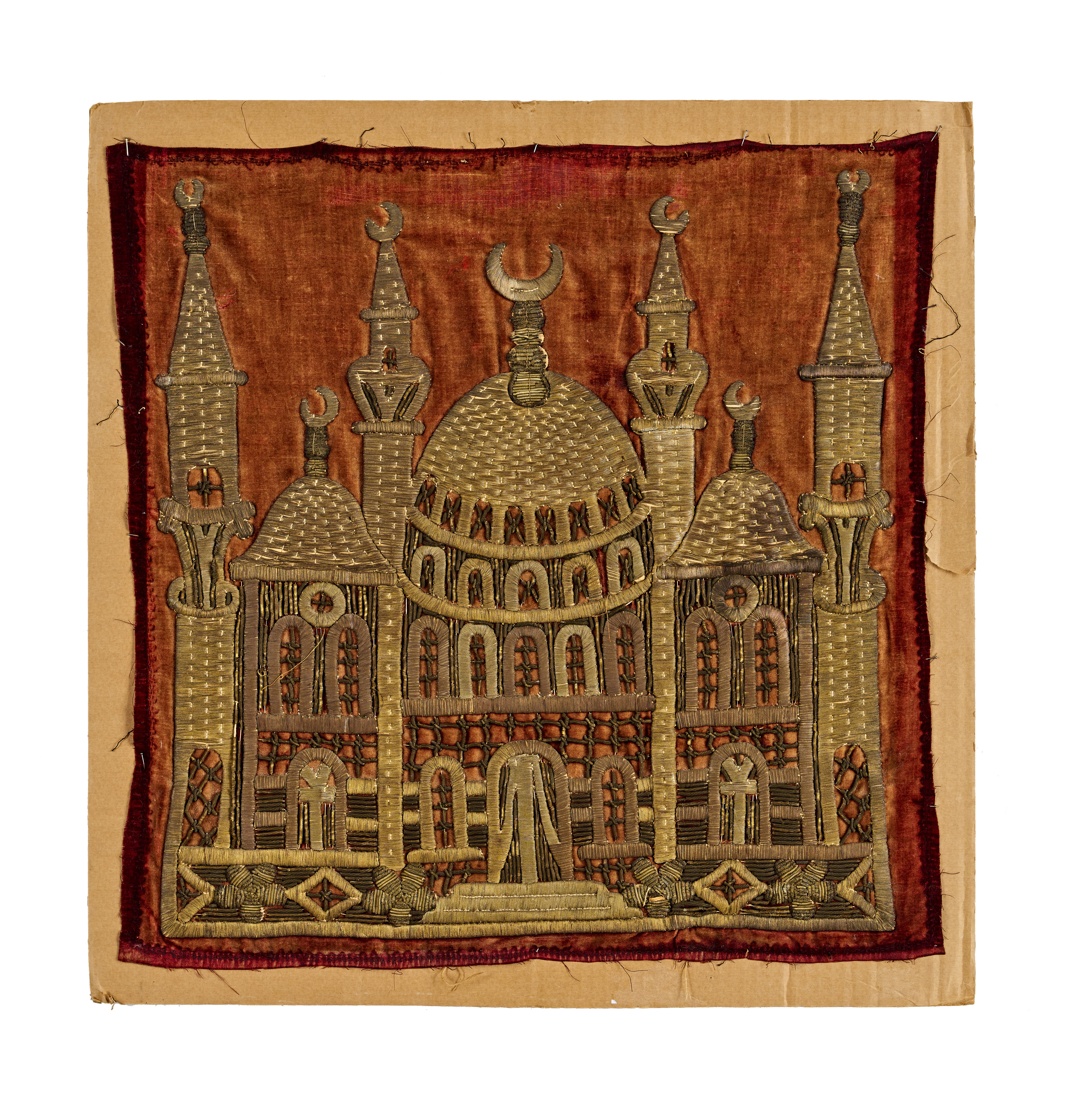 Cushion cover made of velvet and richly embroidered with metallic thread, featuring an elaborate depiction of a mosque—possibly inspired by the Hagia Sophia with multiple domes and minarets.
