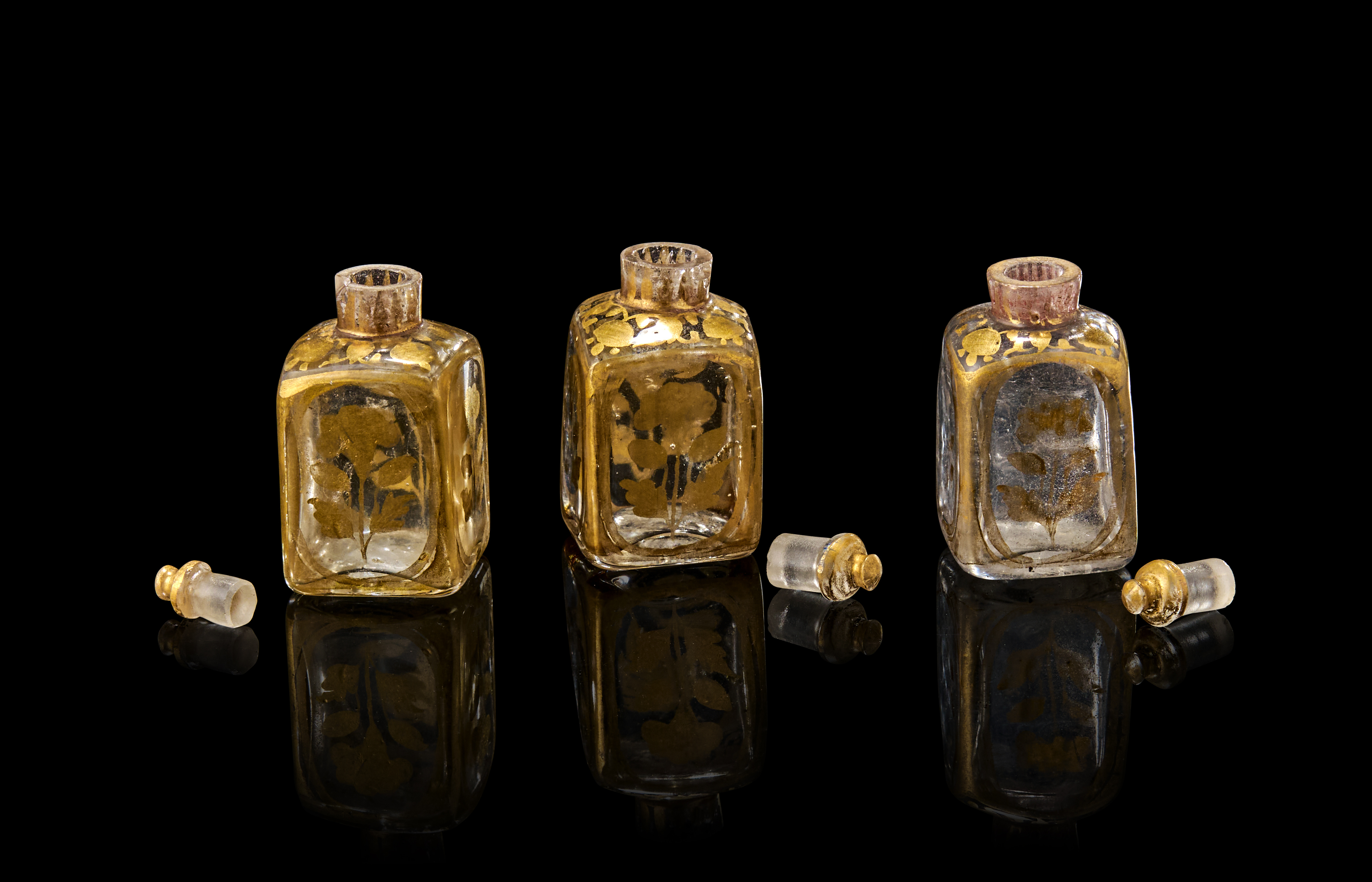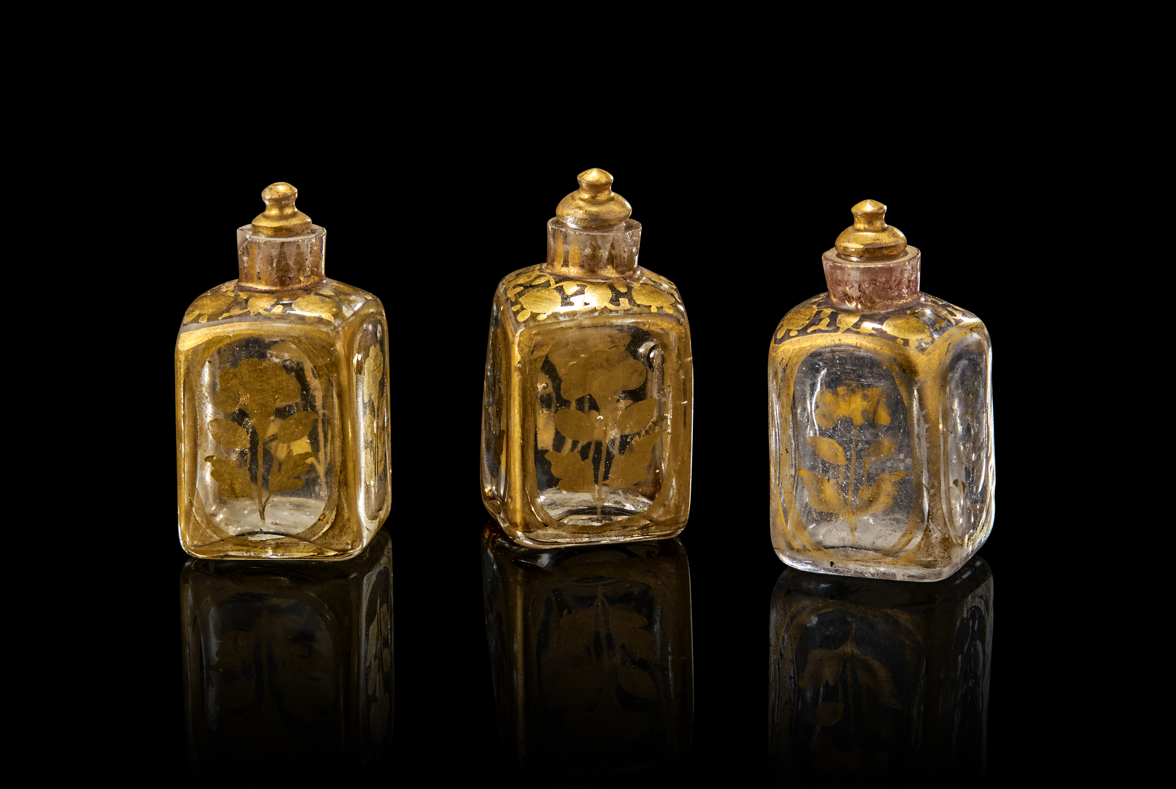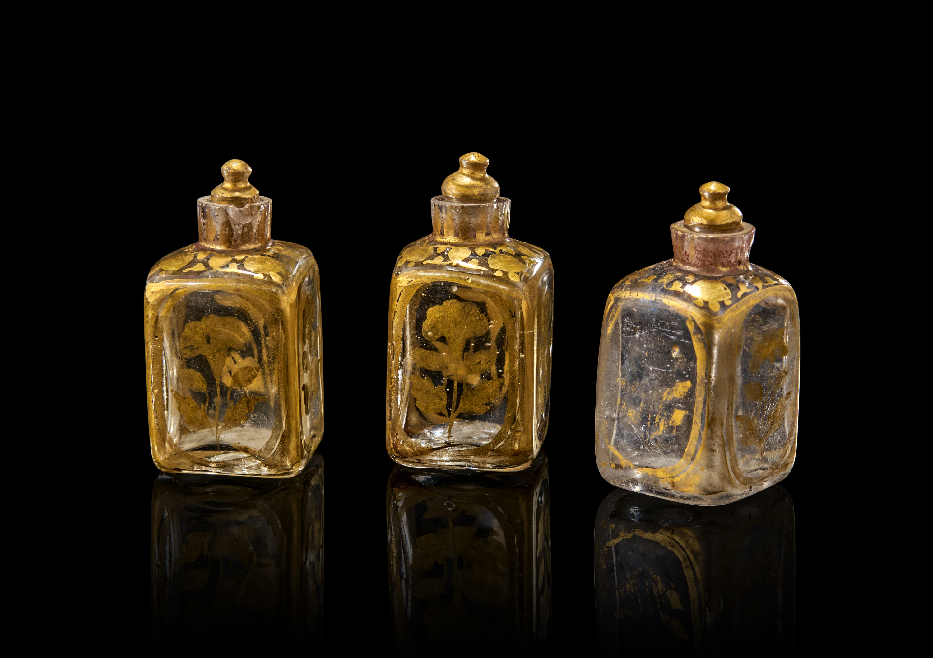 Each of rectangular form with domed shoulder tapering to a short cylindrical neck, decorated in gilt with floral motifs contained within borders to the body, the shoulder with vegetal motifs, each with diagonal seam under the square base and glass stopper with gilt dome and knop finial.