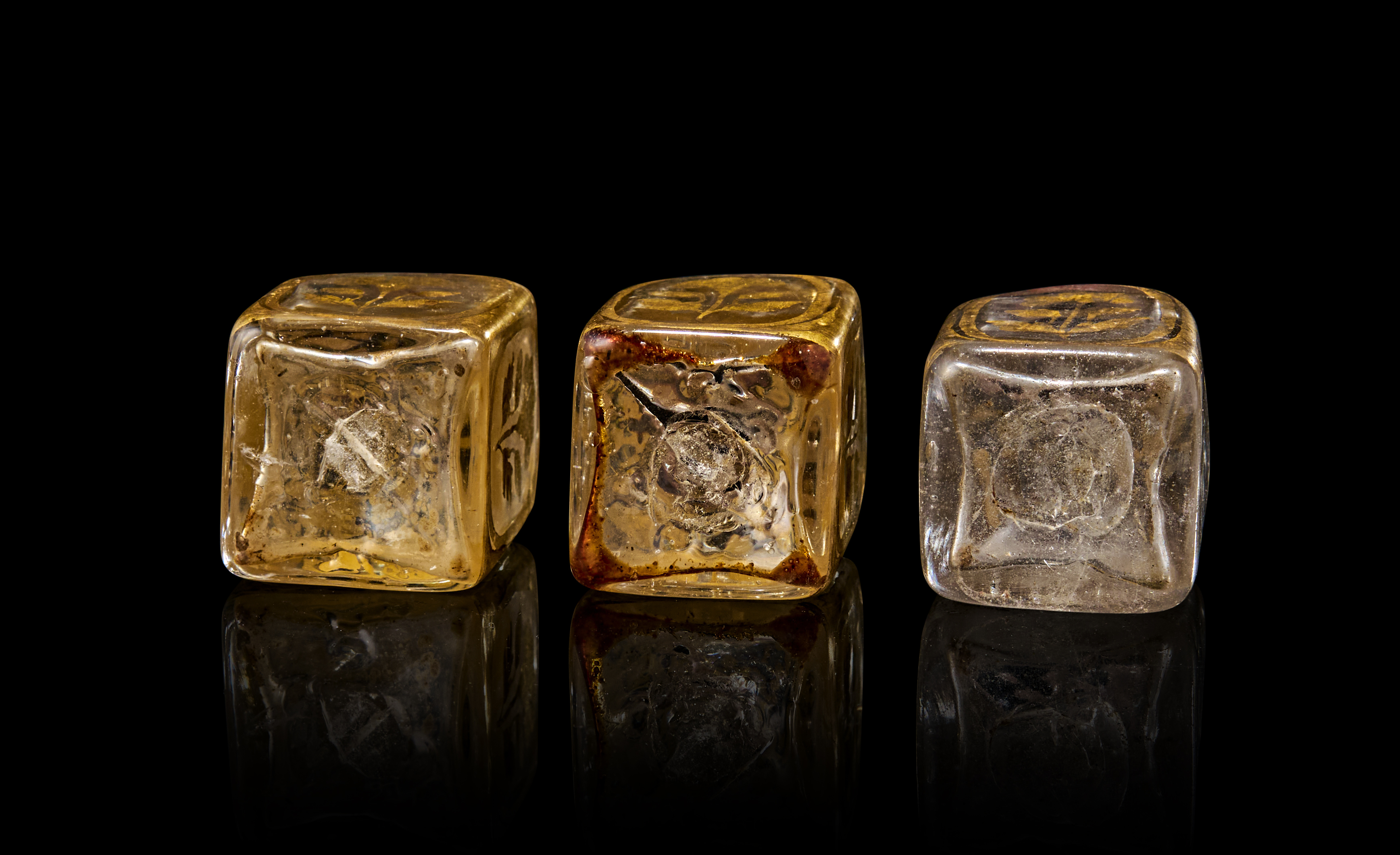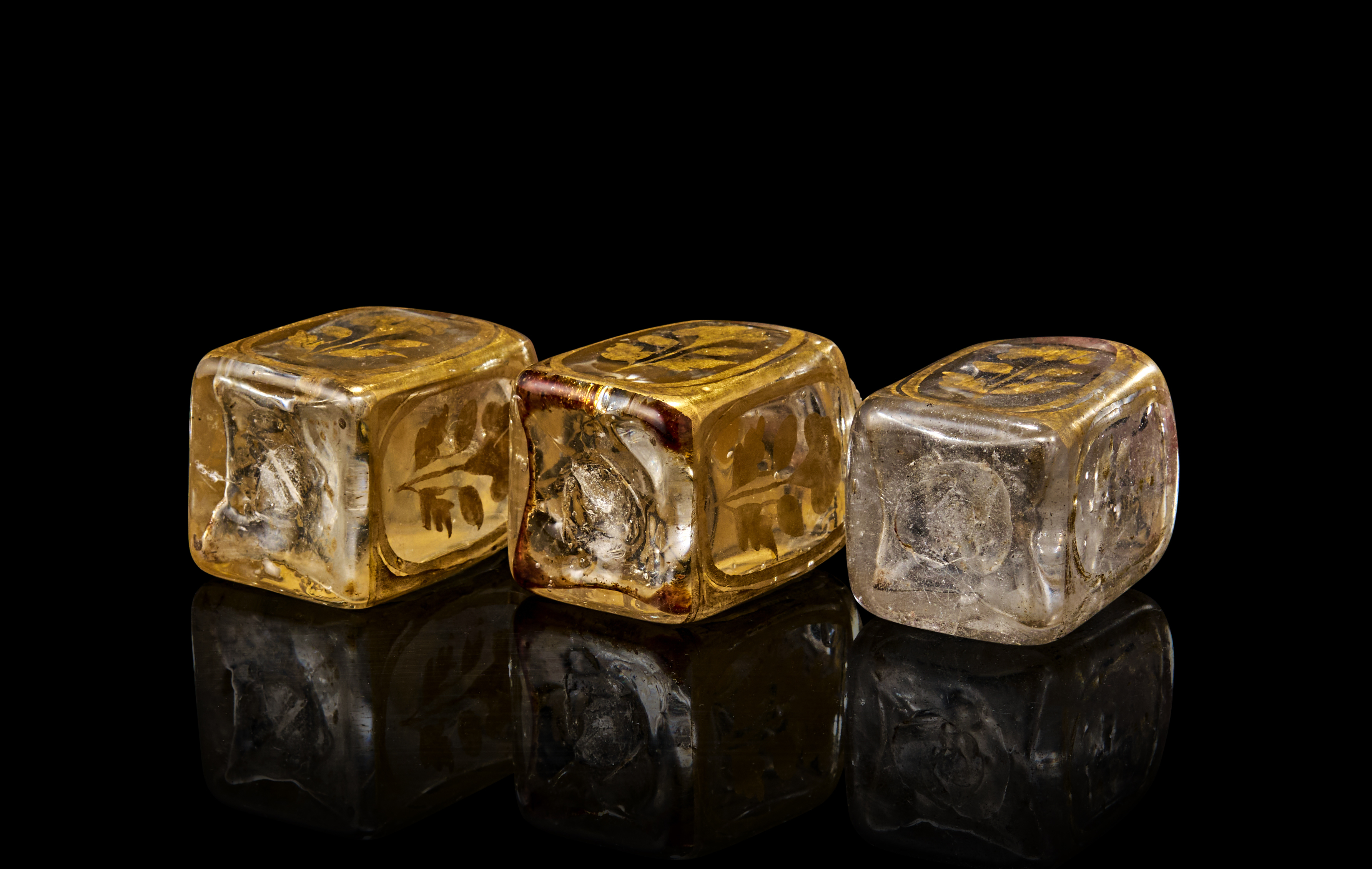 Case bottles were distinguished by the fact that they were blown in a two-part mold, i.e. as two triangular halves that were fused together diagonally, the corners painted over to cover up the joint. The only visible seam in an archetypical case bottle would be a diagonal line under the base, a feature present in the current lot (Stefano Carboni, Glass from Islamic Lands: The Al-Sabah Collection, Kuwait National Museum, London: Thames & Hudson, 2001, p.389).