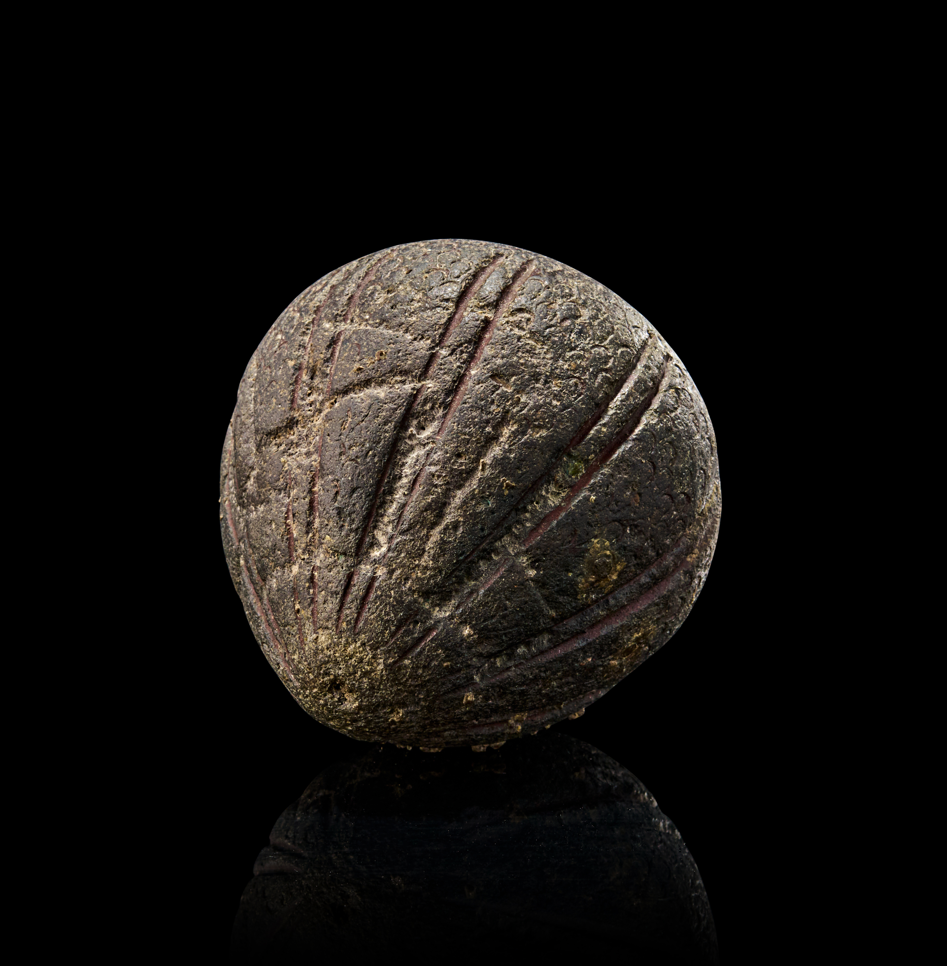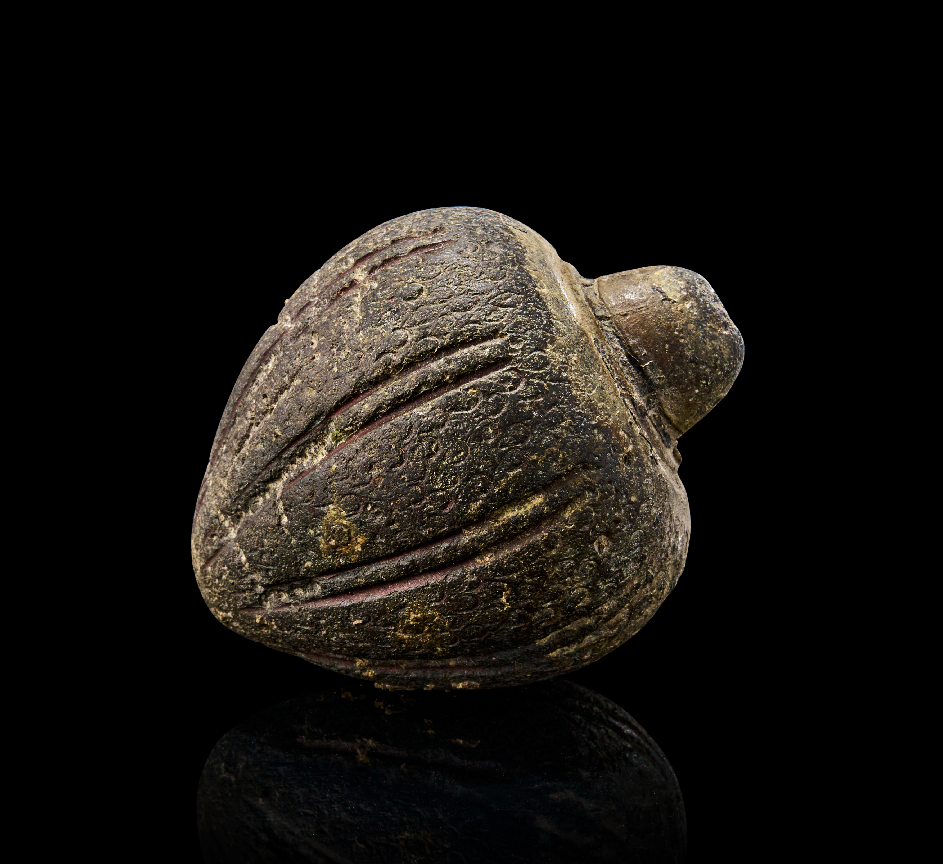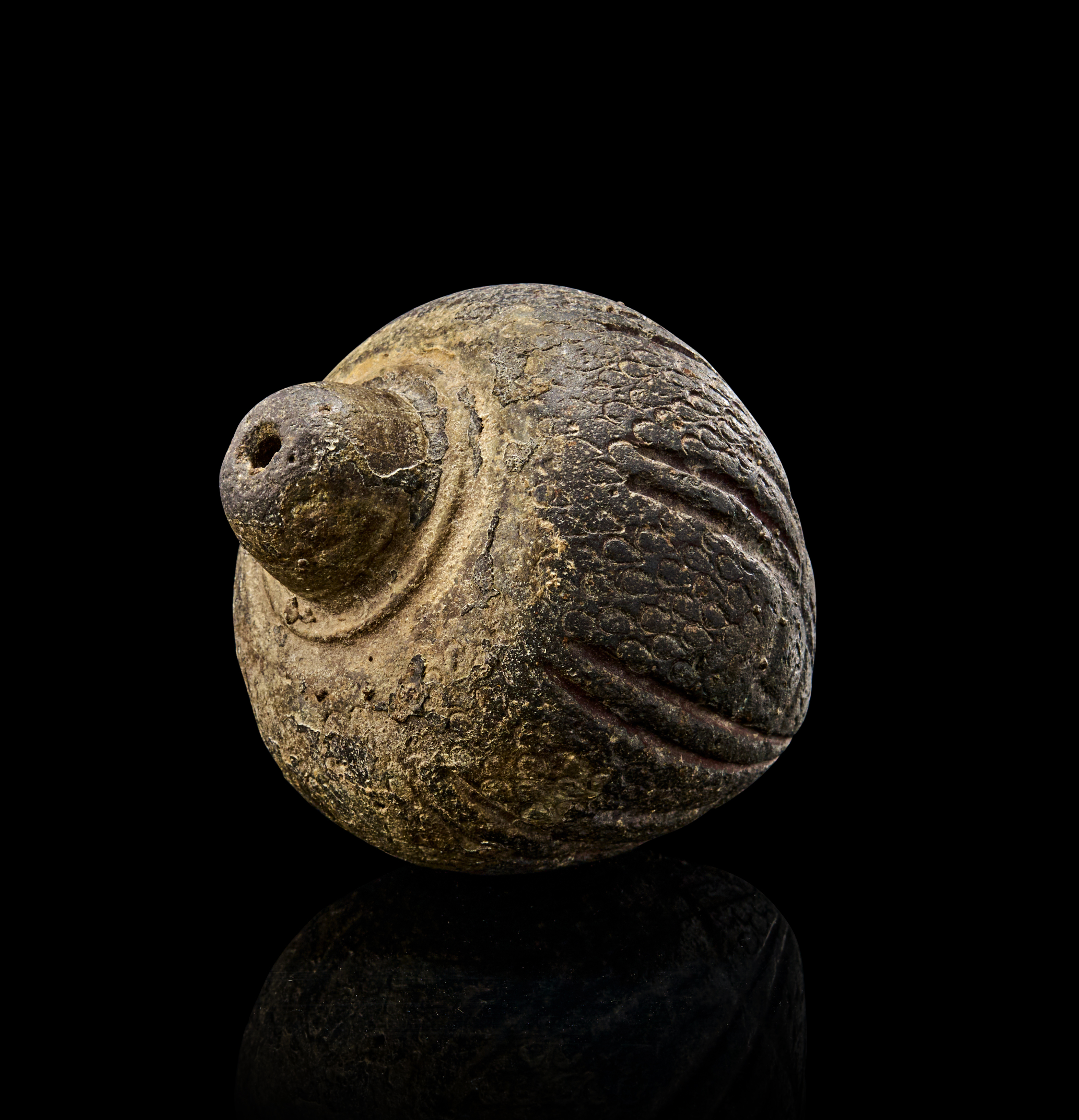This ovoid vessel is formed with a pointed base and a short neck featuring a narrow opening. The body is richly decorated with carved vertical ribs and textured surface motifs. These vessels were believed to be used in warfare to contain combustible substances.