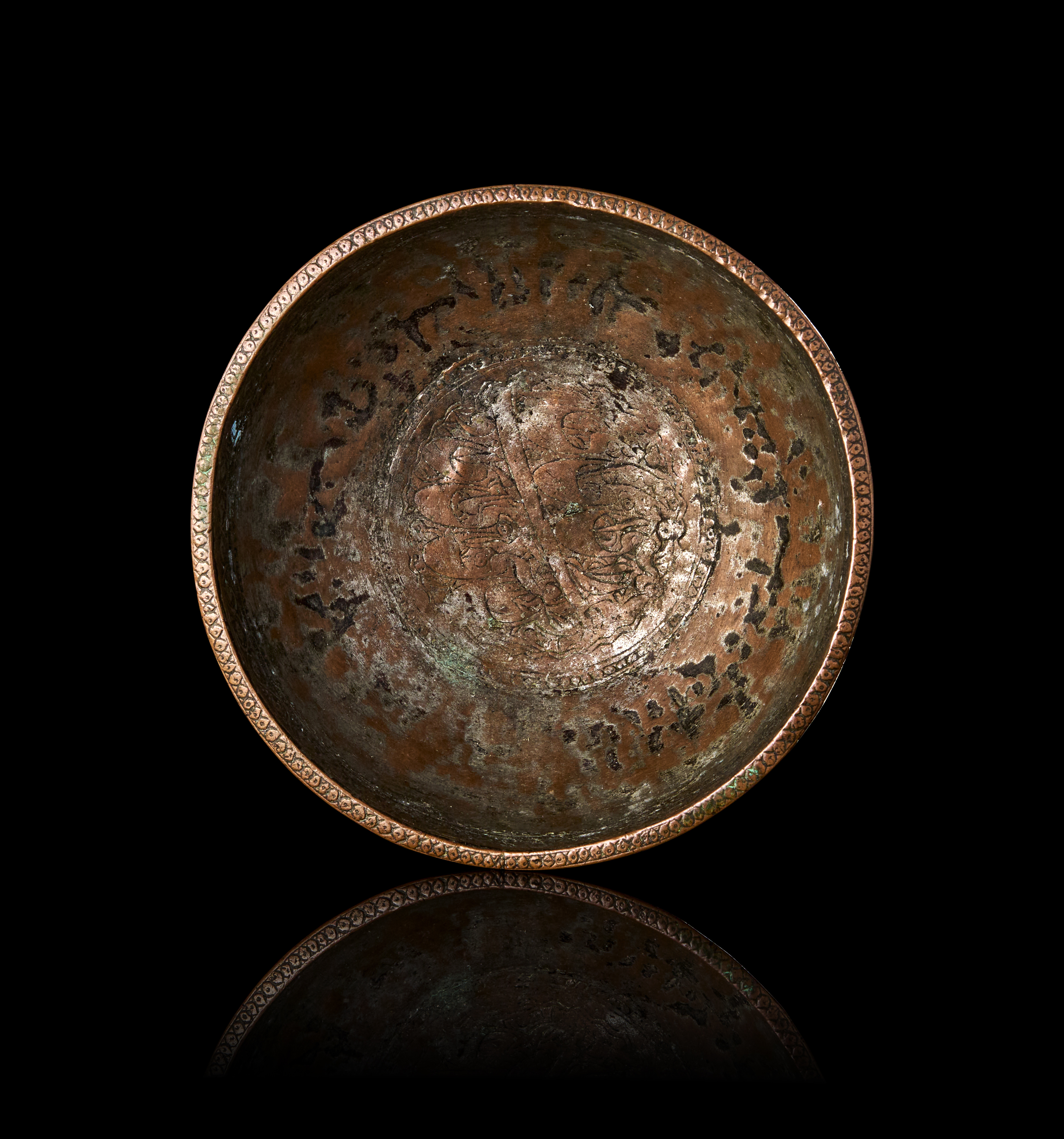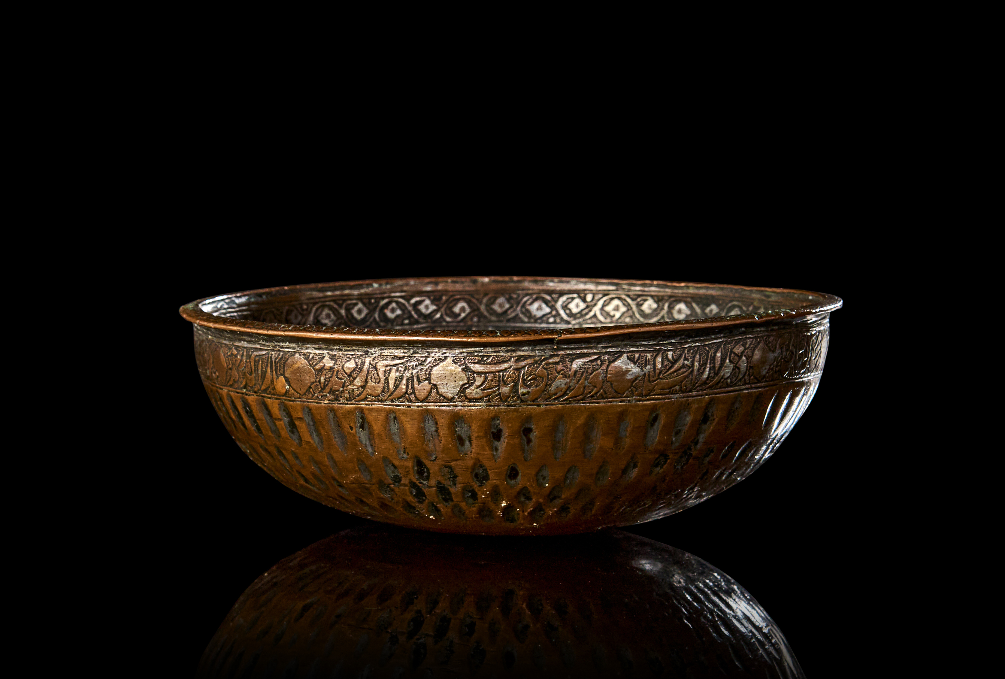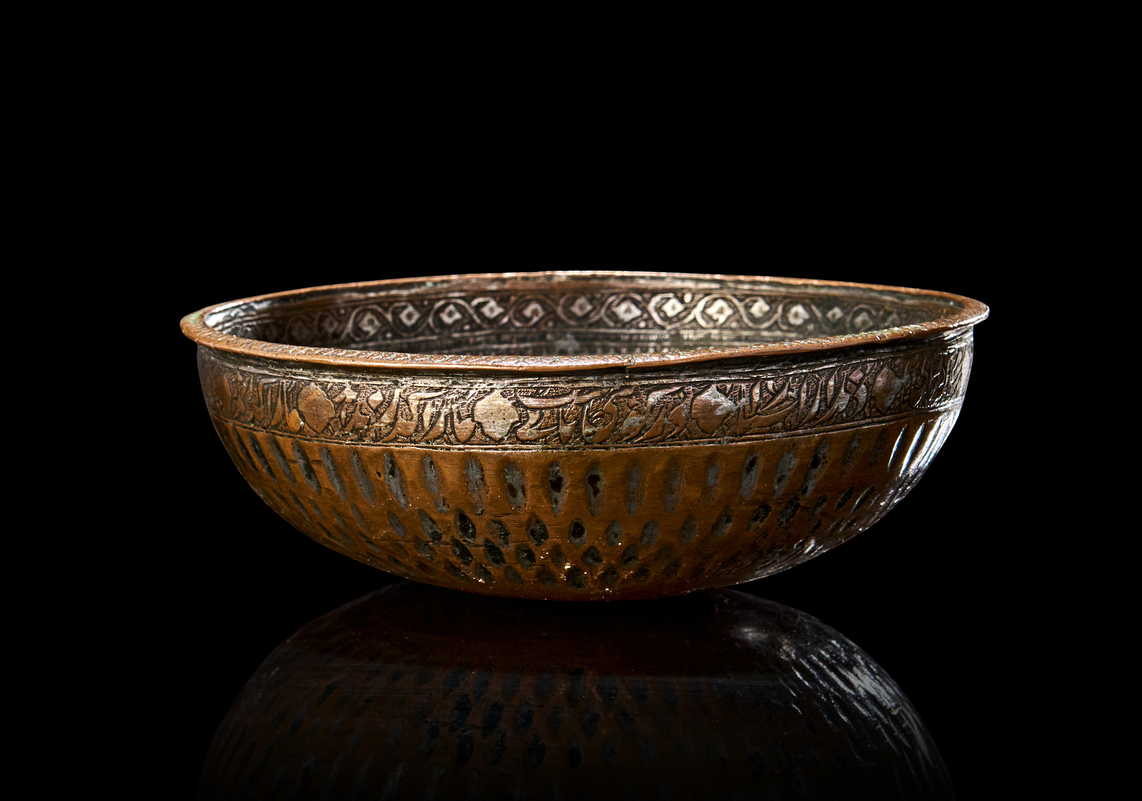 The exterior is adorned with vertical chased motifs resembling leaf or drop forms, and a band of intricate Arabic calligraphy, engraved in cursive script, encircles the upper section. Just below the rim on the interior, a repeating geometric border of interlaced lozenges and diamonds.