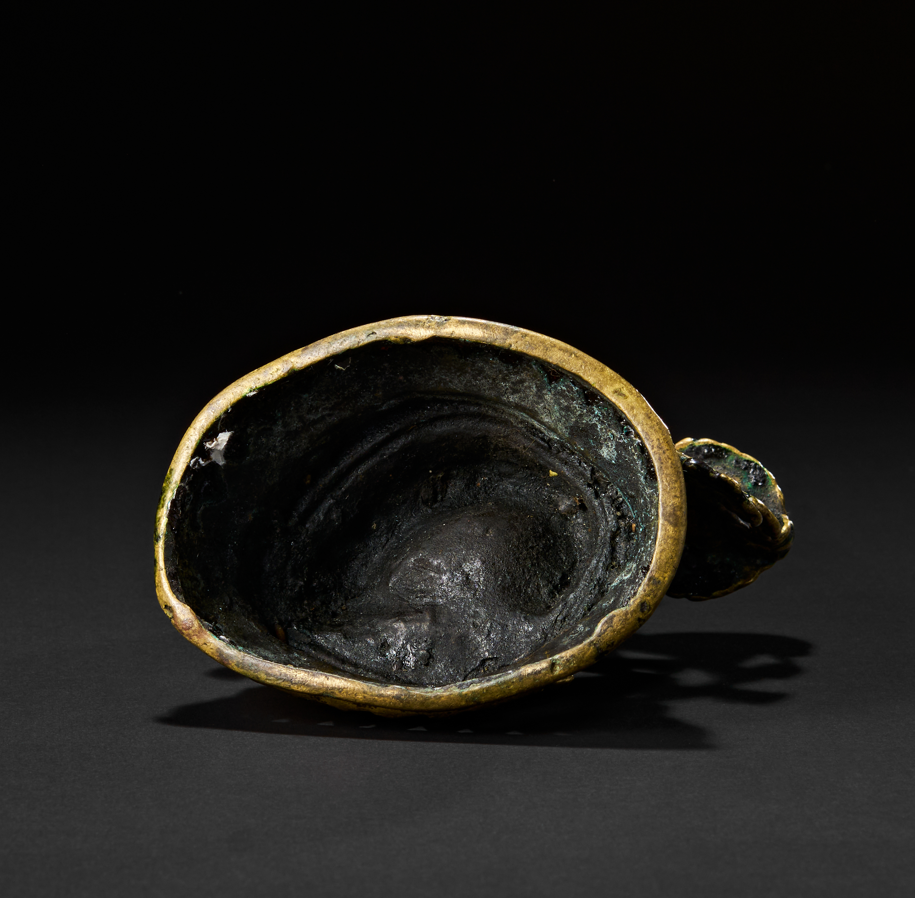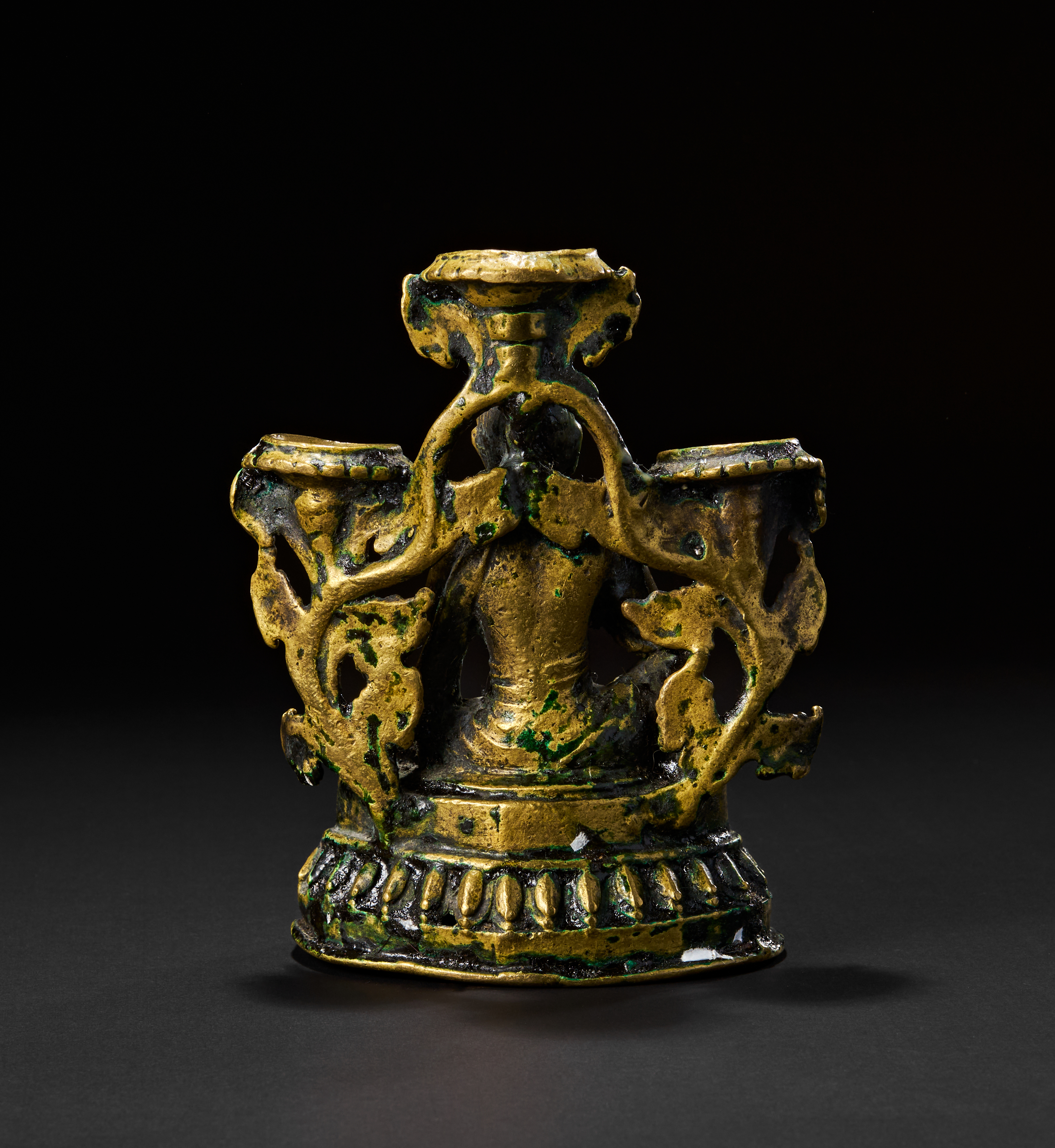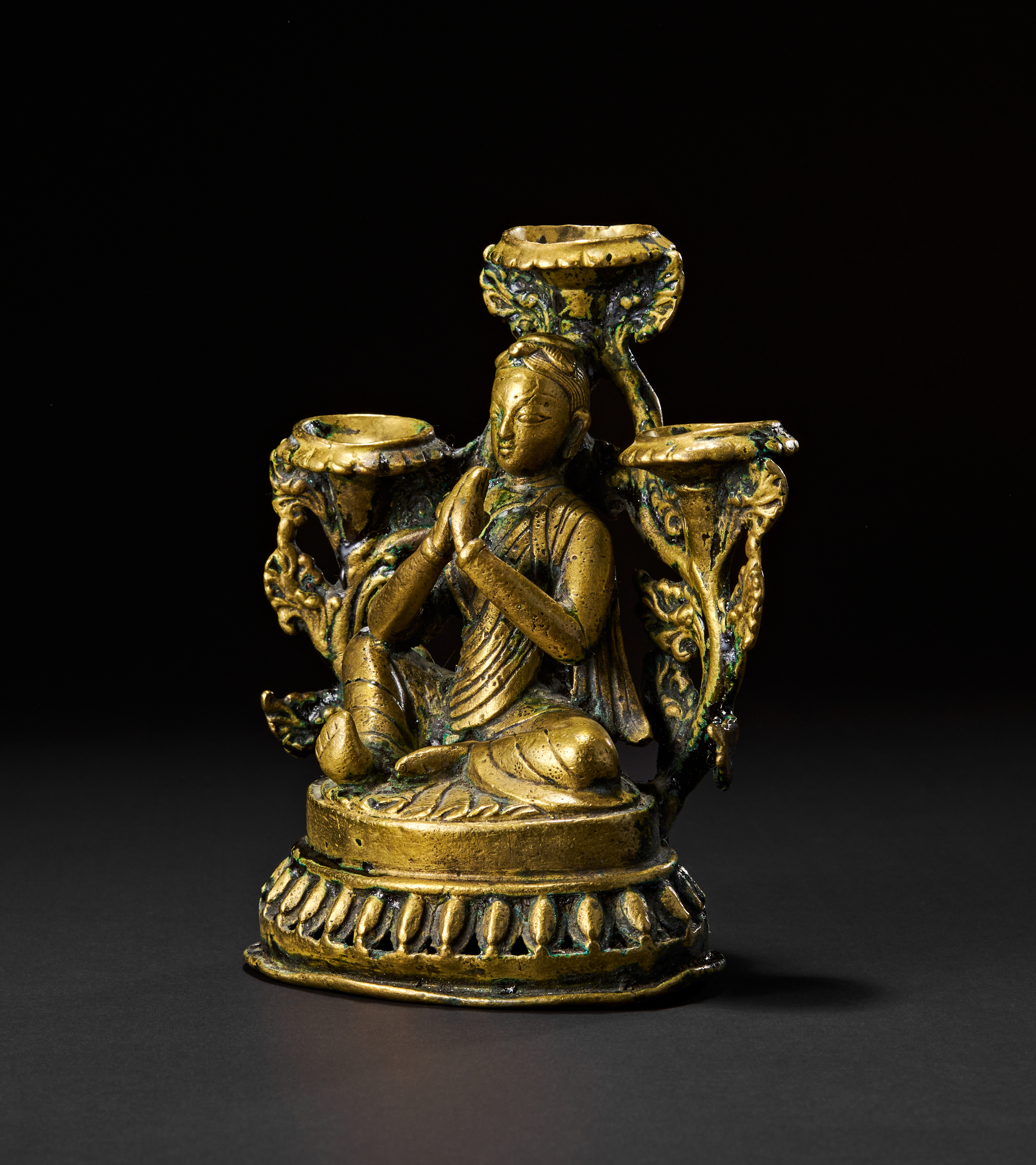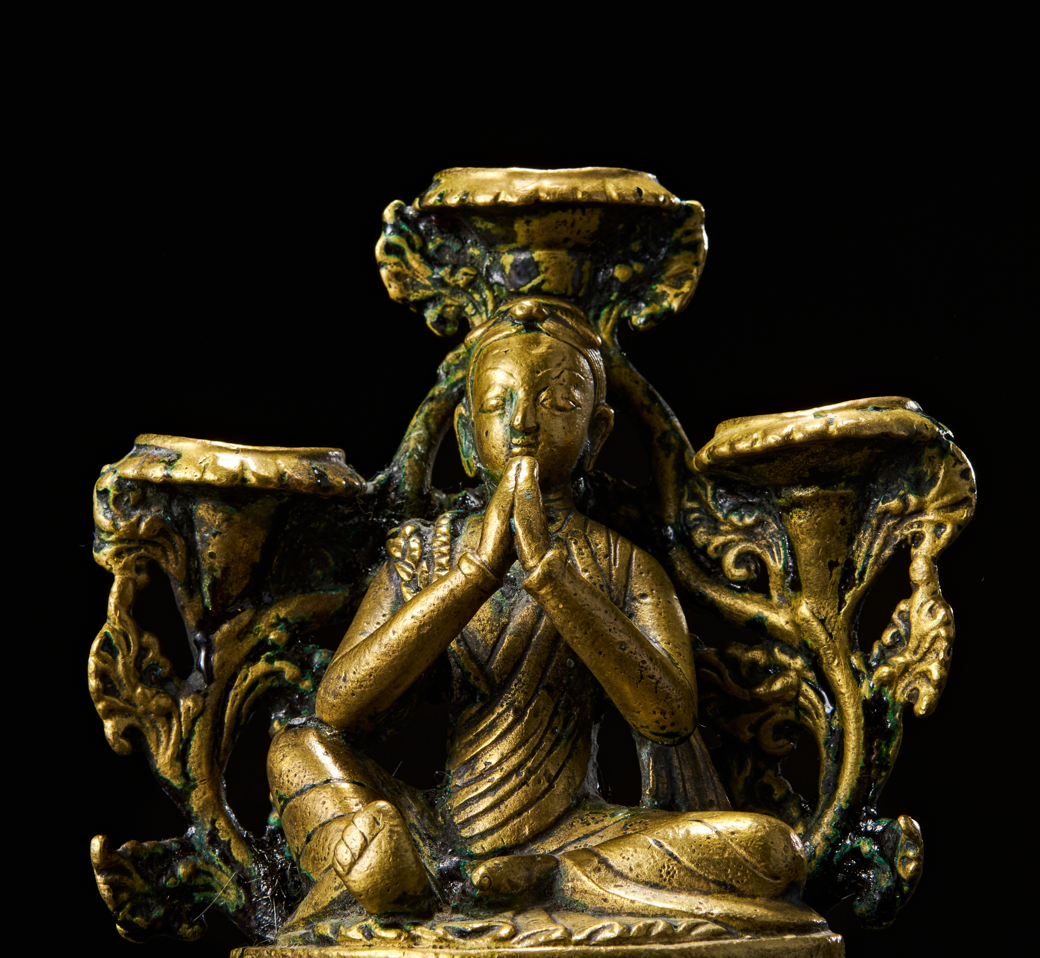 The lamp features a serene, seated figure in a meditative posture with hands in the anjali mudra (gesture of prayer), surrounding the figure are three upward-reaching floral sconces, intended to hold oil or small flames, the base is lotus-form.
