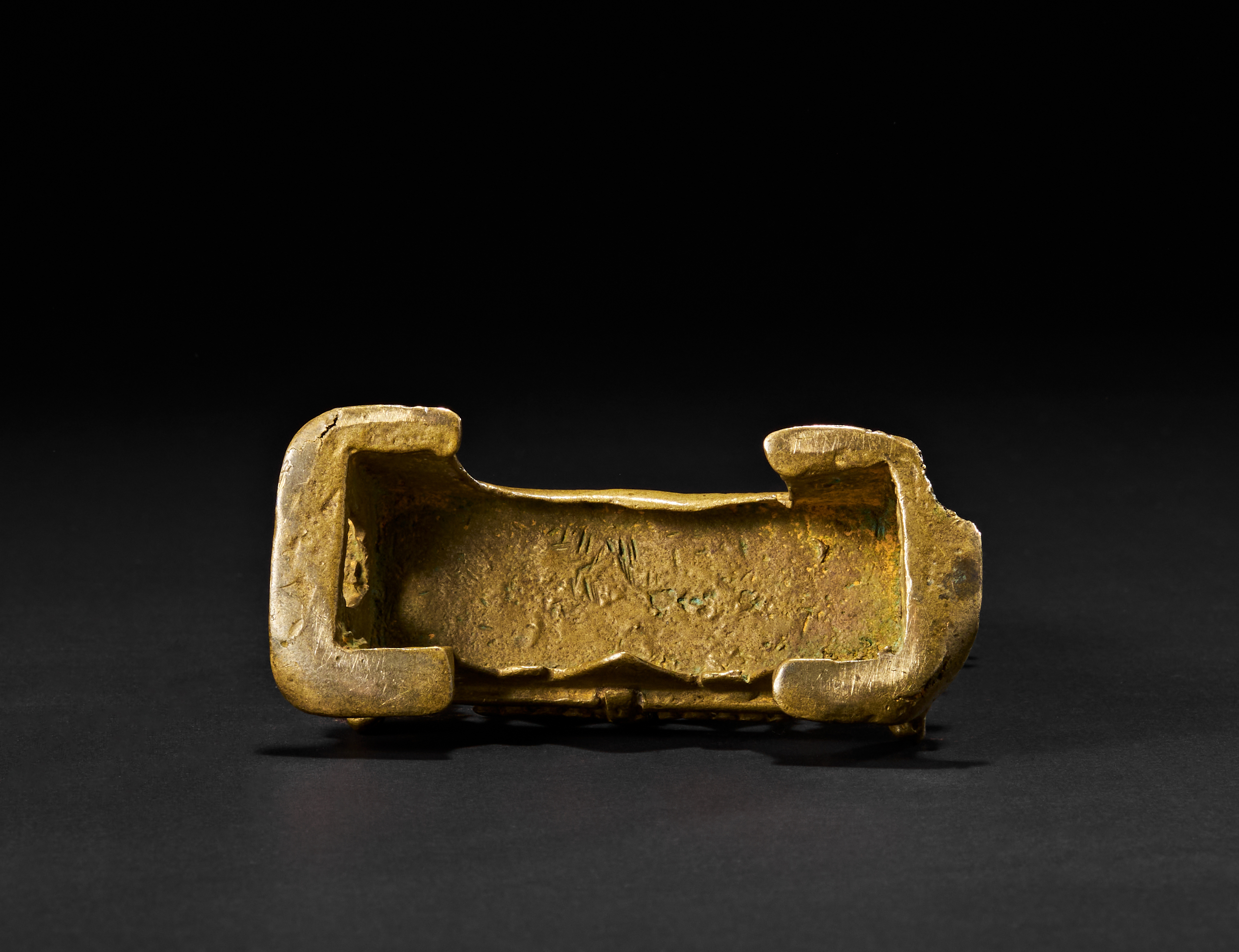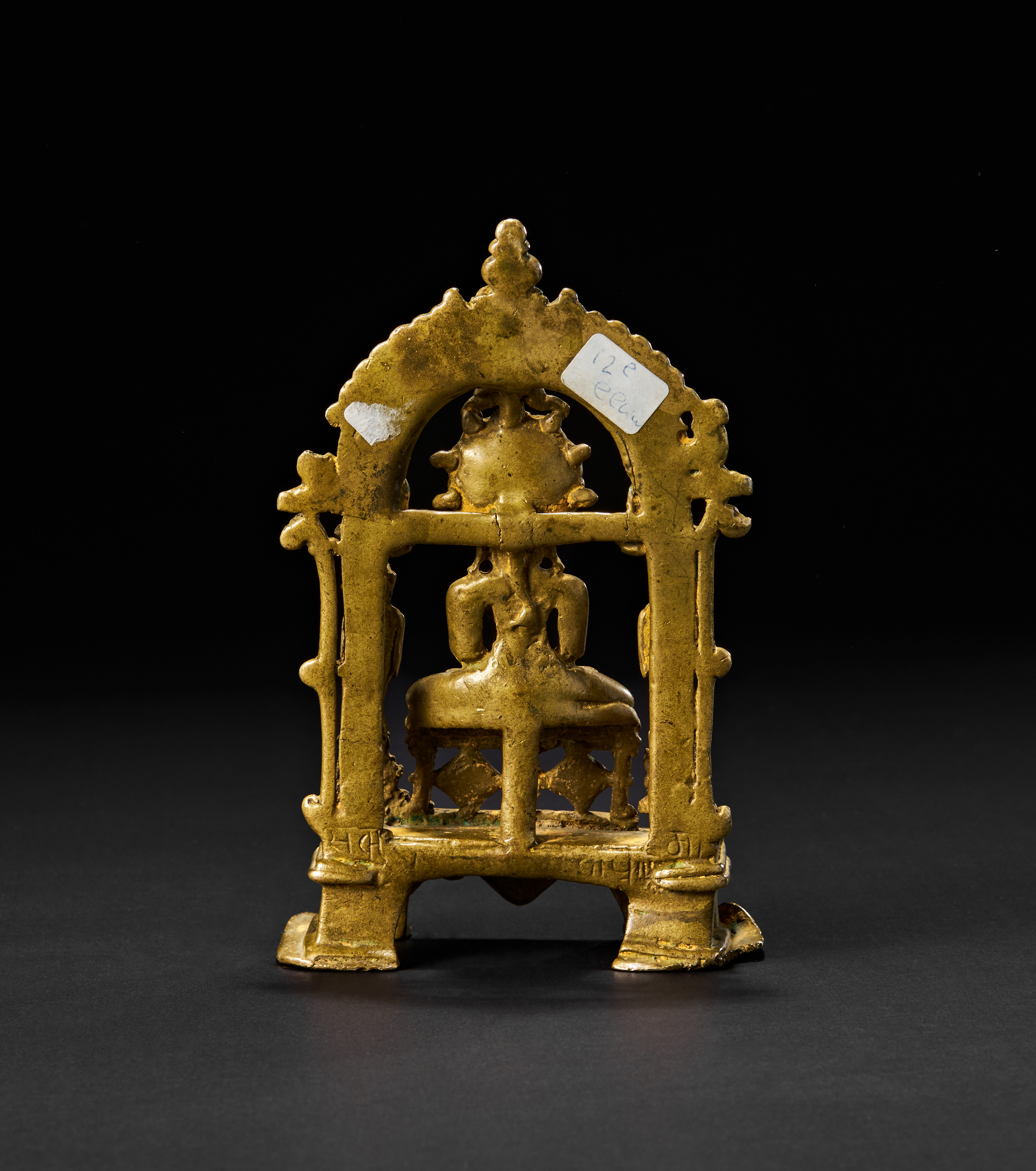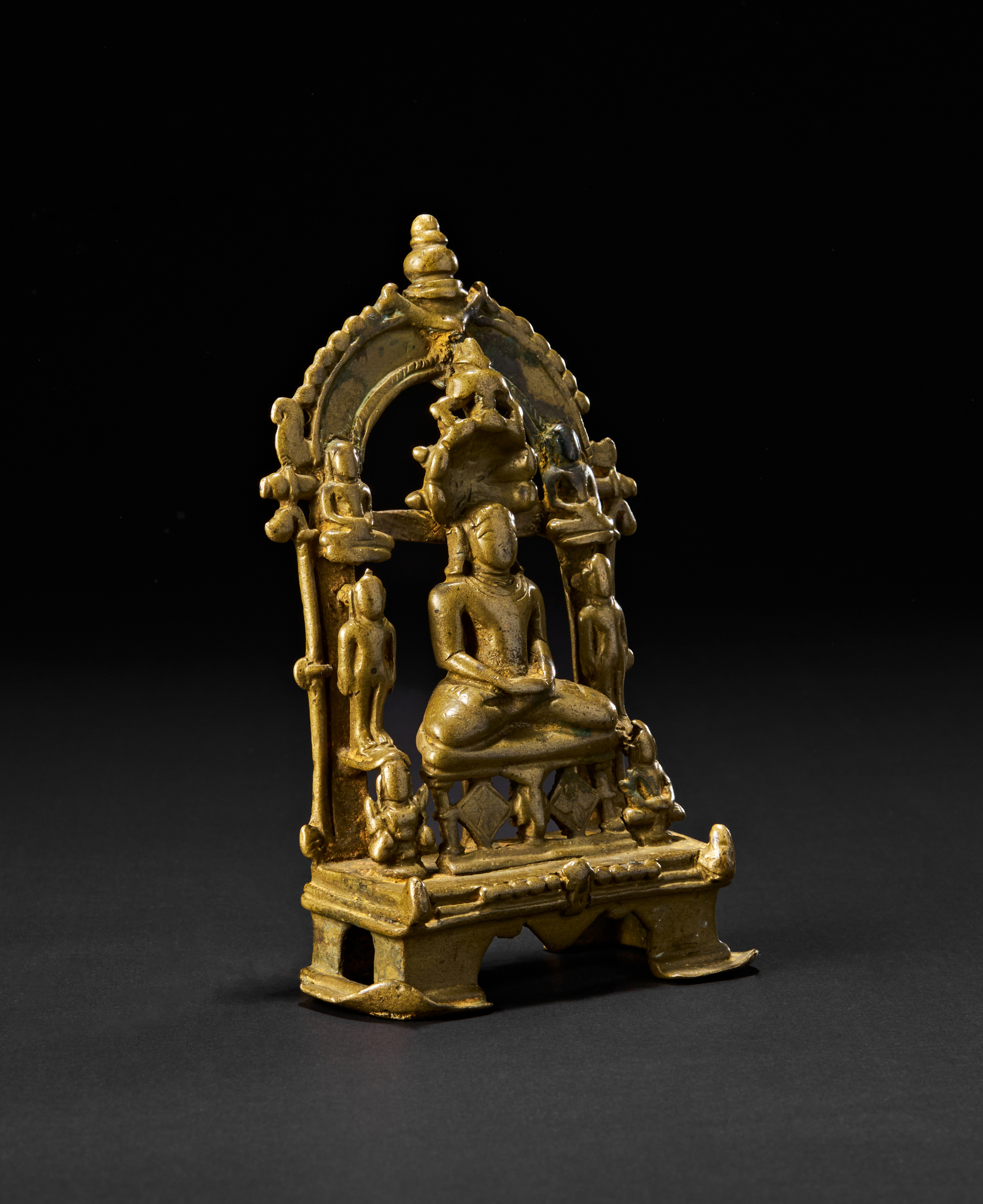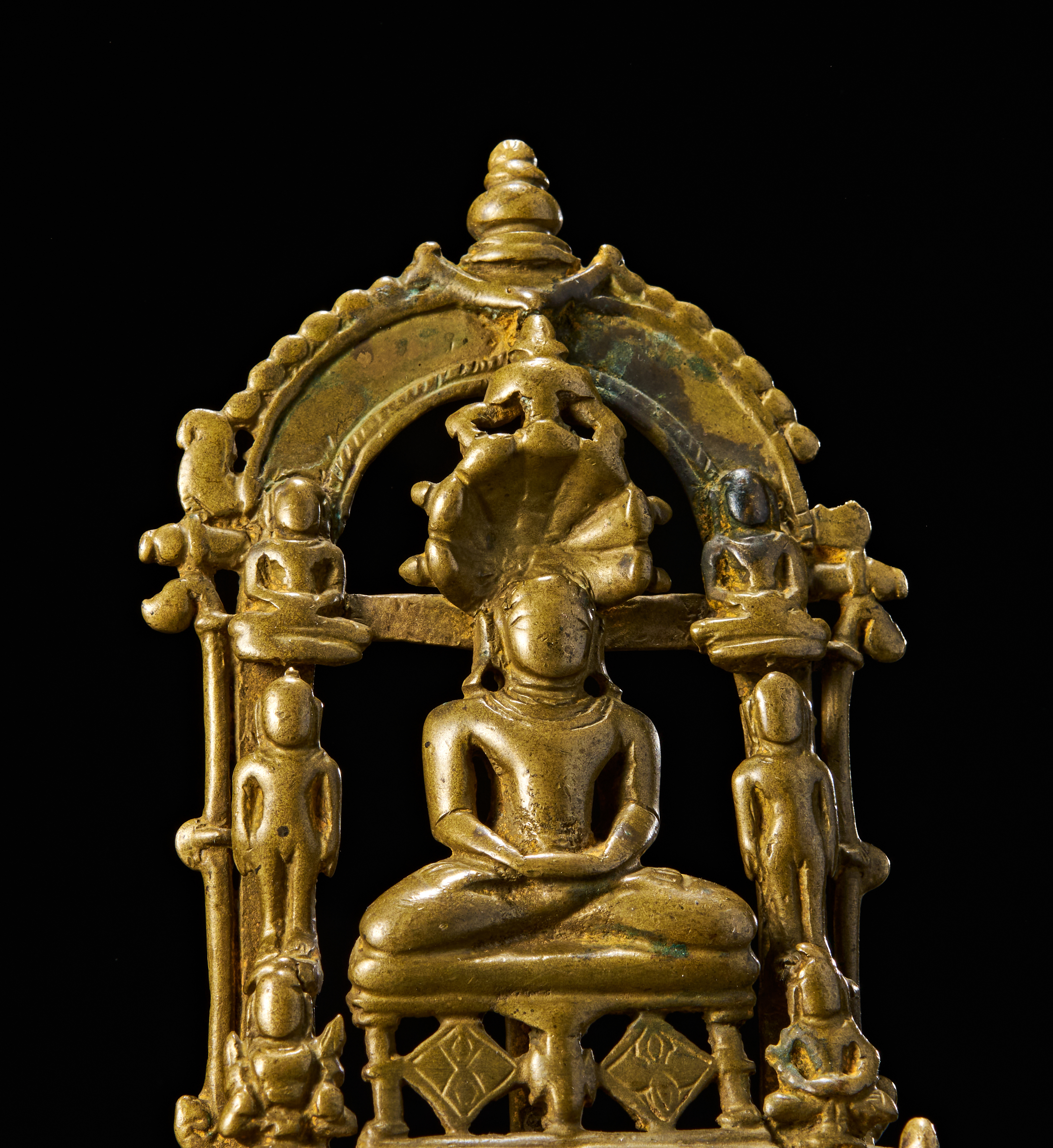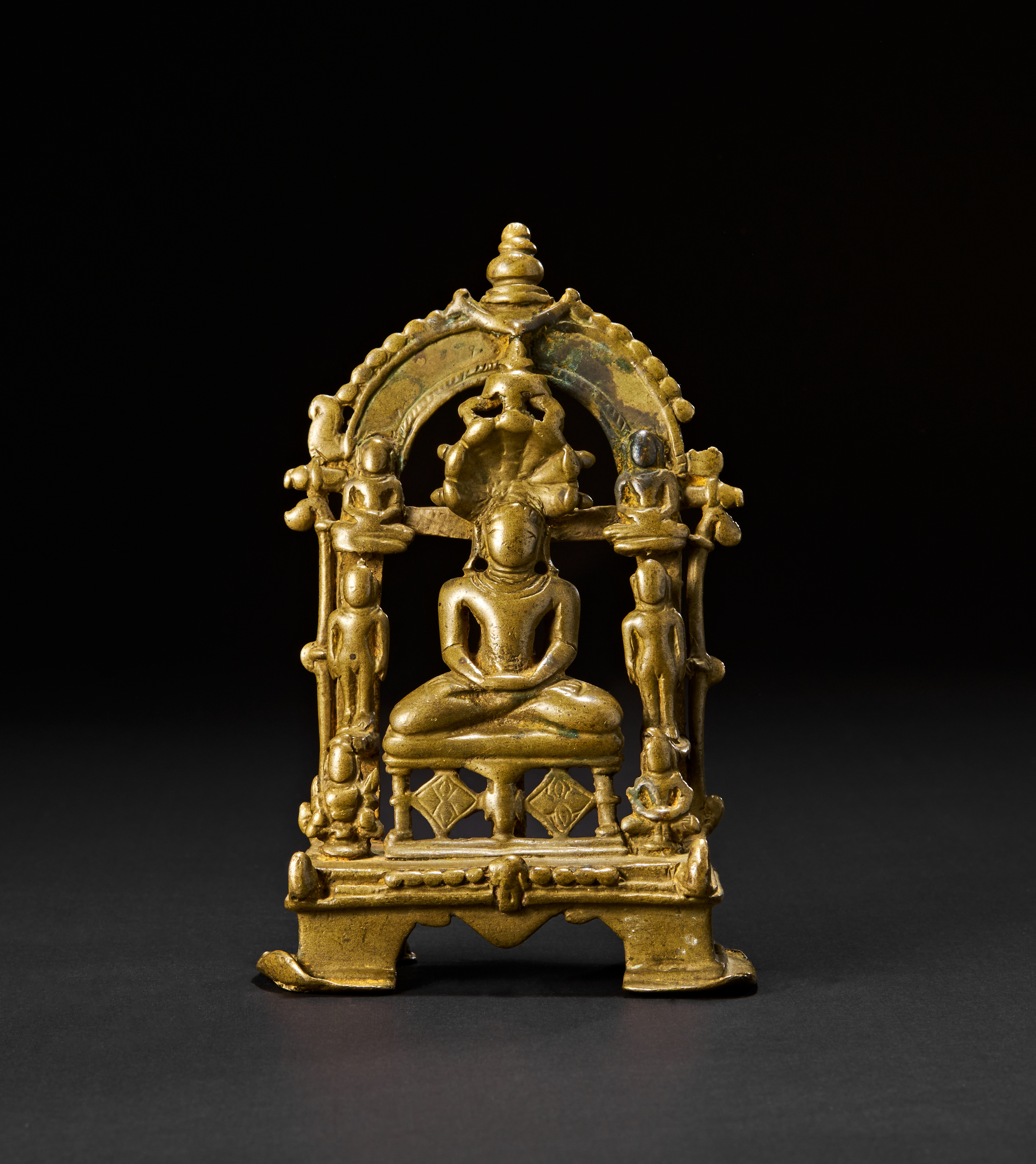Depicting a seated Tirthankara in meditation (dhyanamudra) on a tiered throne, sheltered beneath a multi-hooded serpent (Sheshanaga). Flanked by standing attendants and smaller seated figures above, the shrine is framed by a richly ornamented arched prabhavali. The reverse shows smooth detailing, while the base reveals the solid casting.
