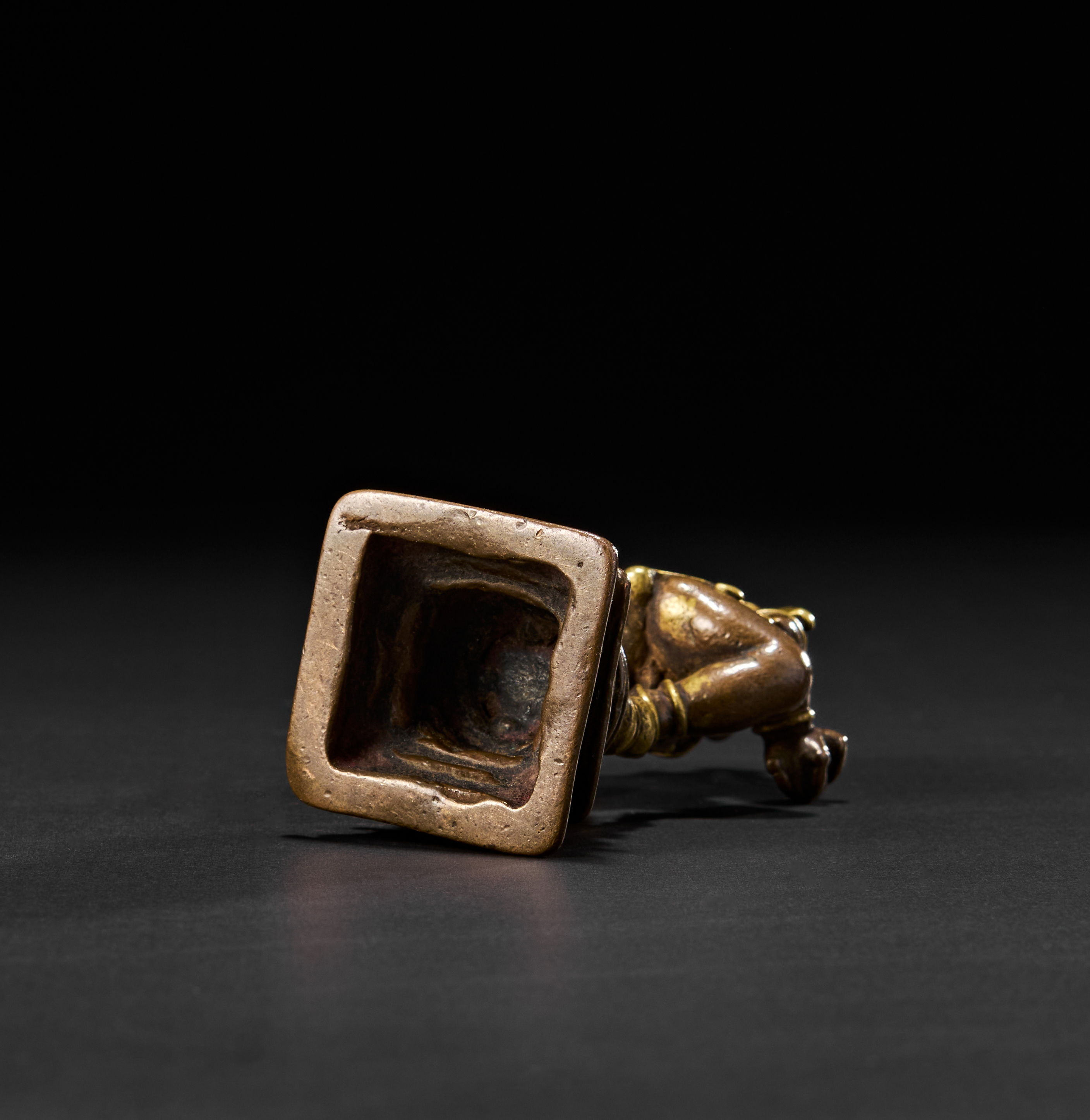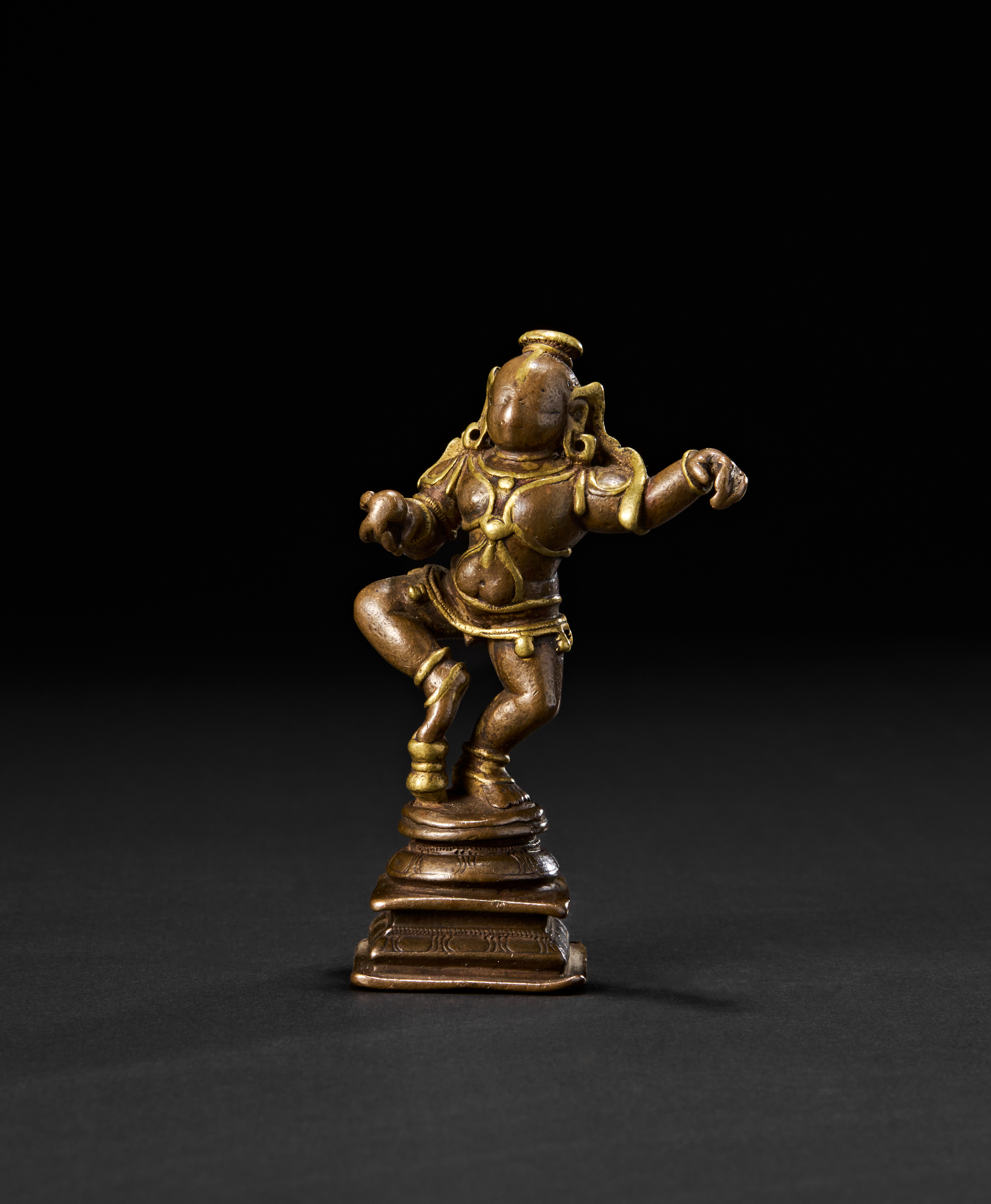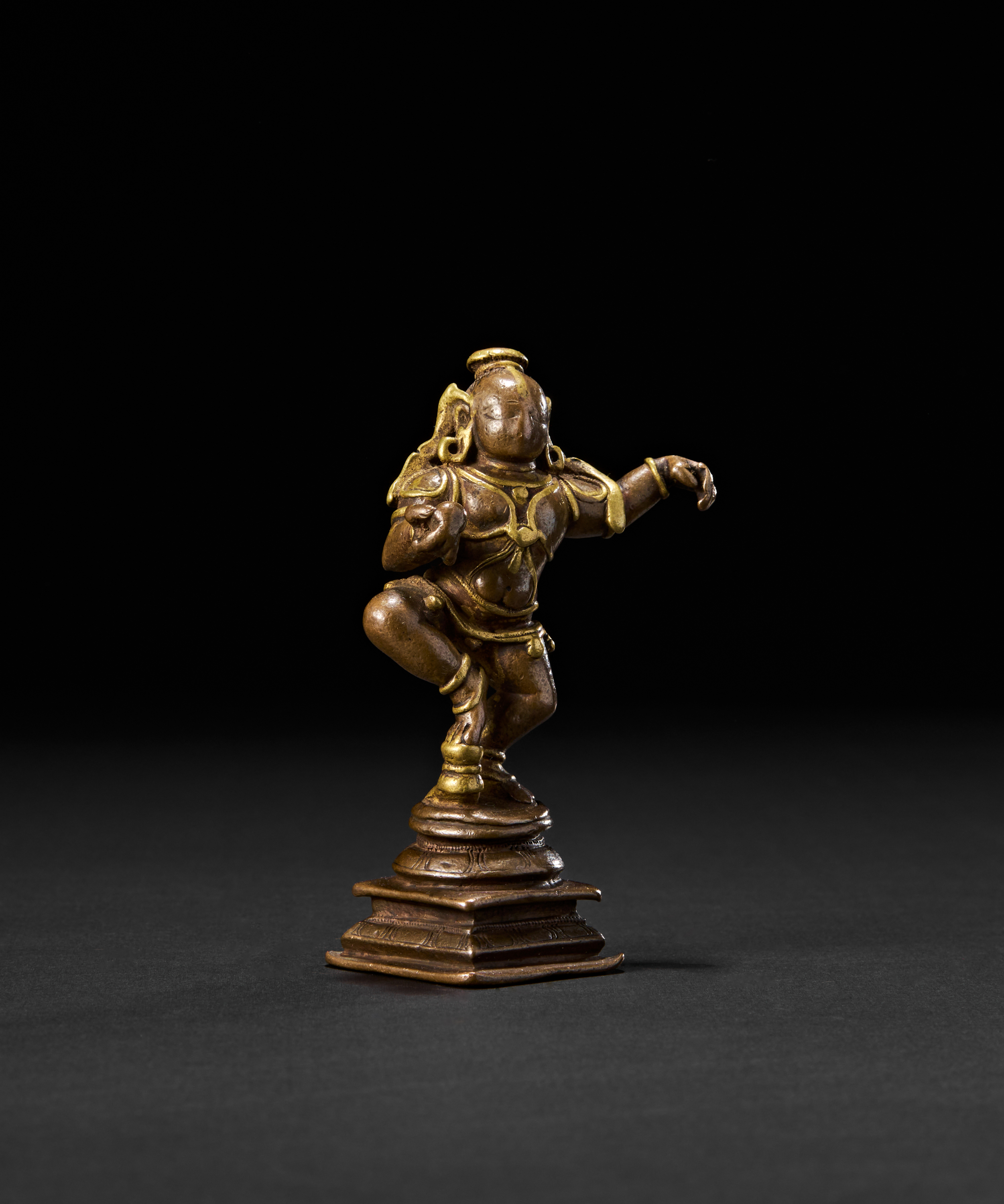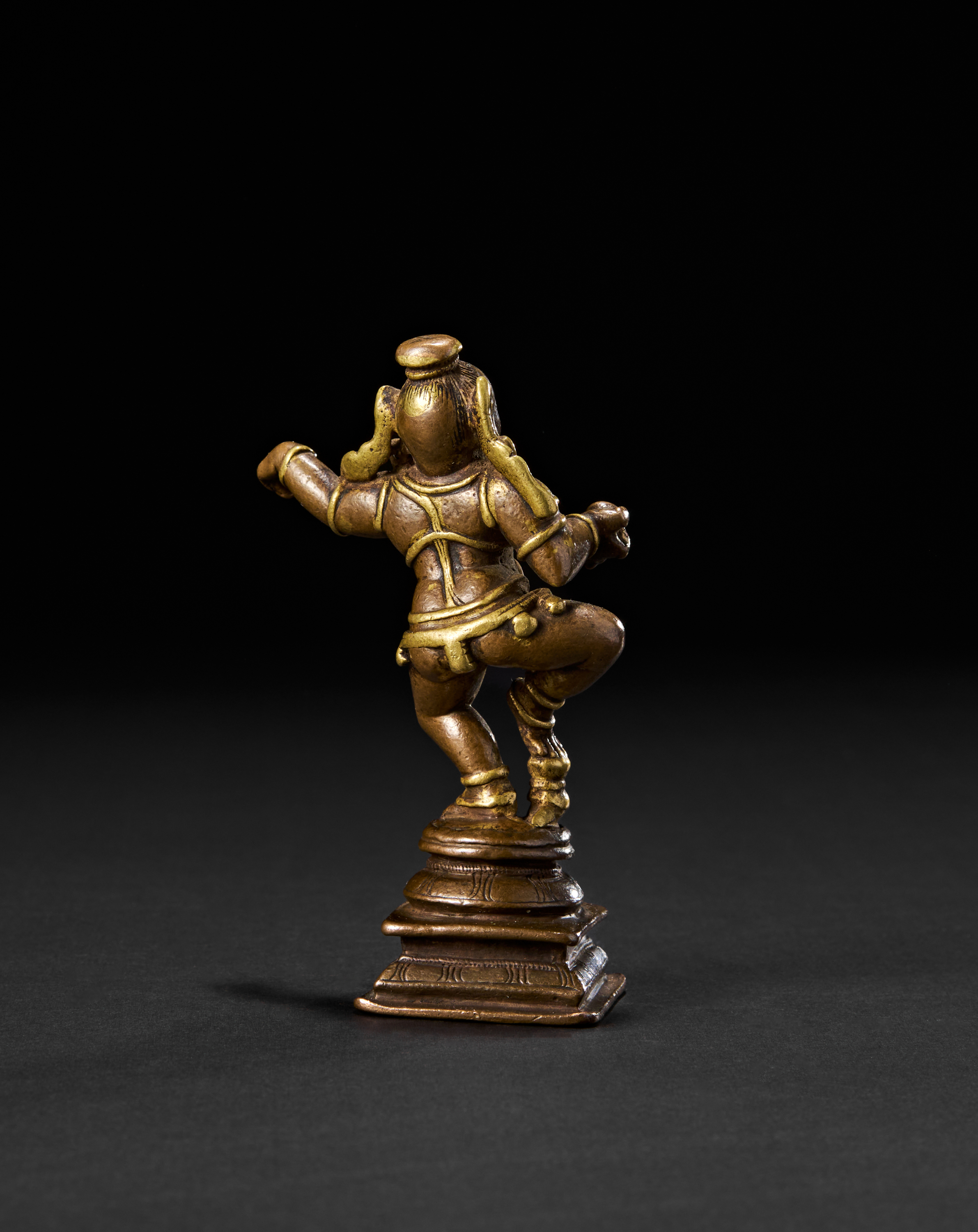 The youthful form of Krishna is captured mid-step, with one leg raised and arms gracefully extended in rhythmic motion, embodying divine playfulness and grace. He wears a traditional tiered crown and stands on a stepped square base. The back of the figure reveals his flowing hair and sacred belt.