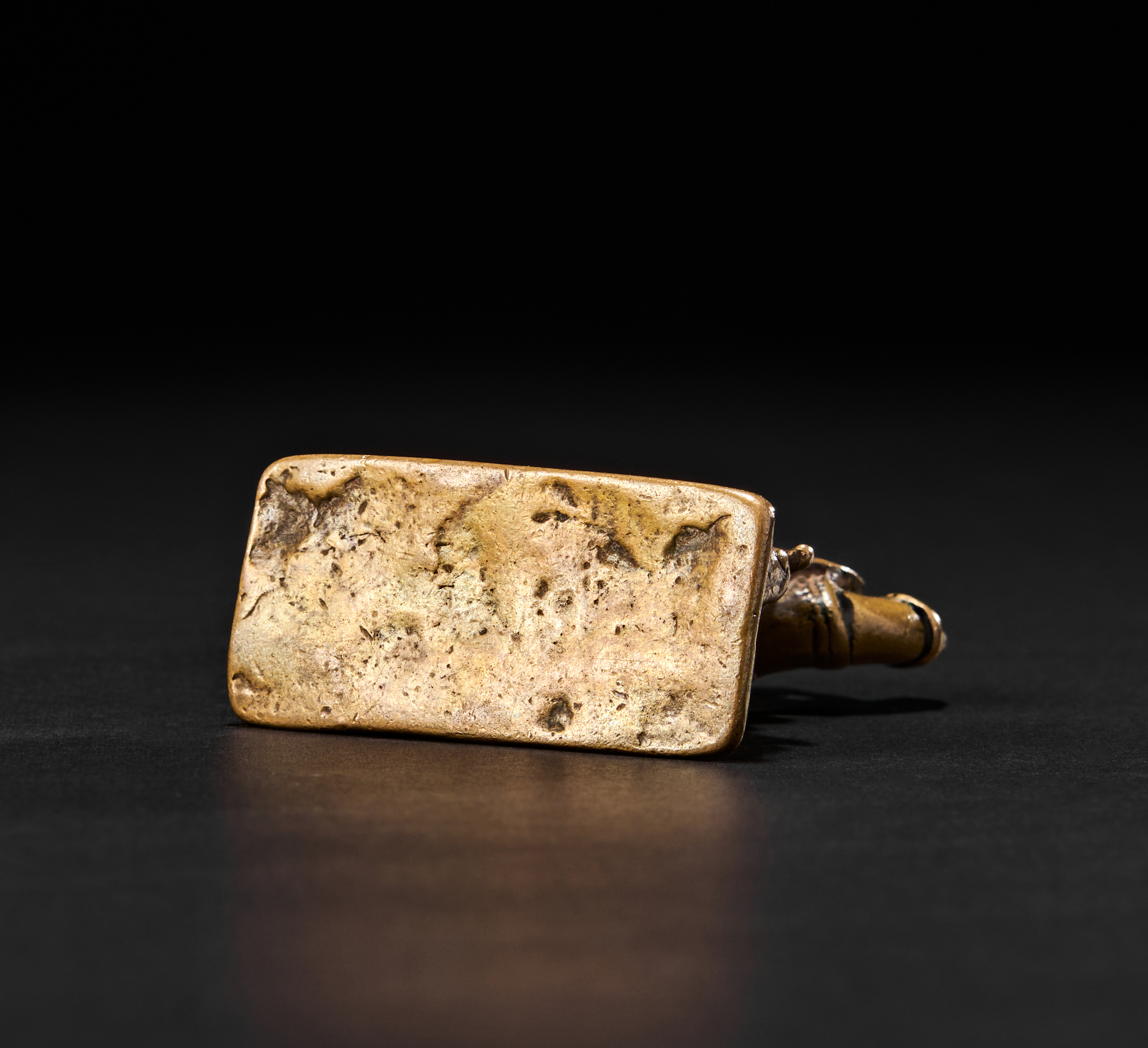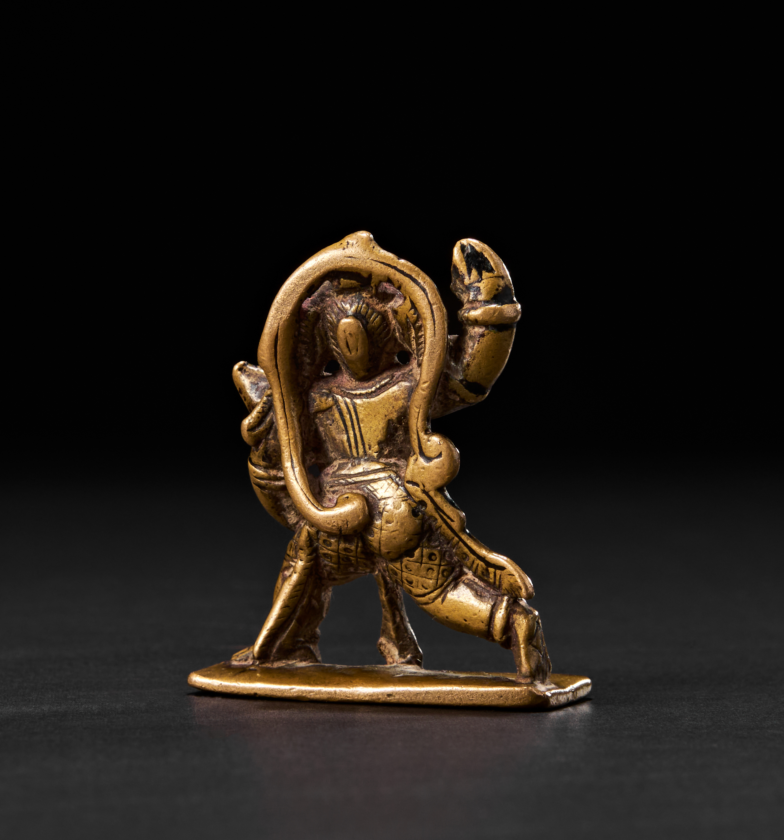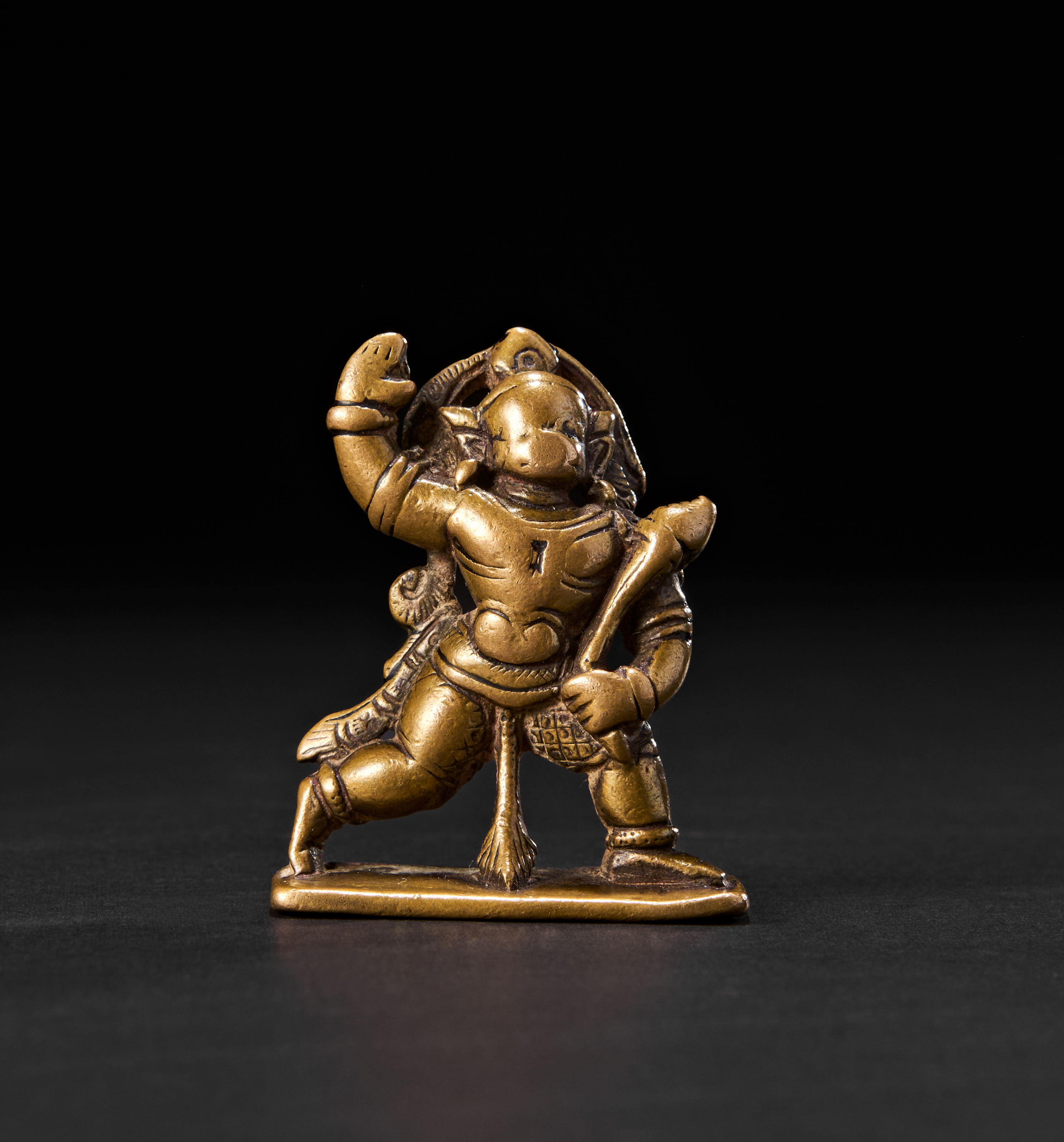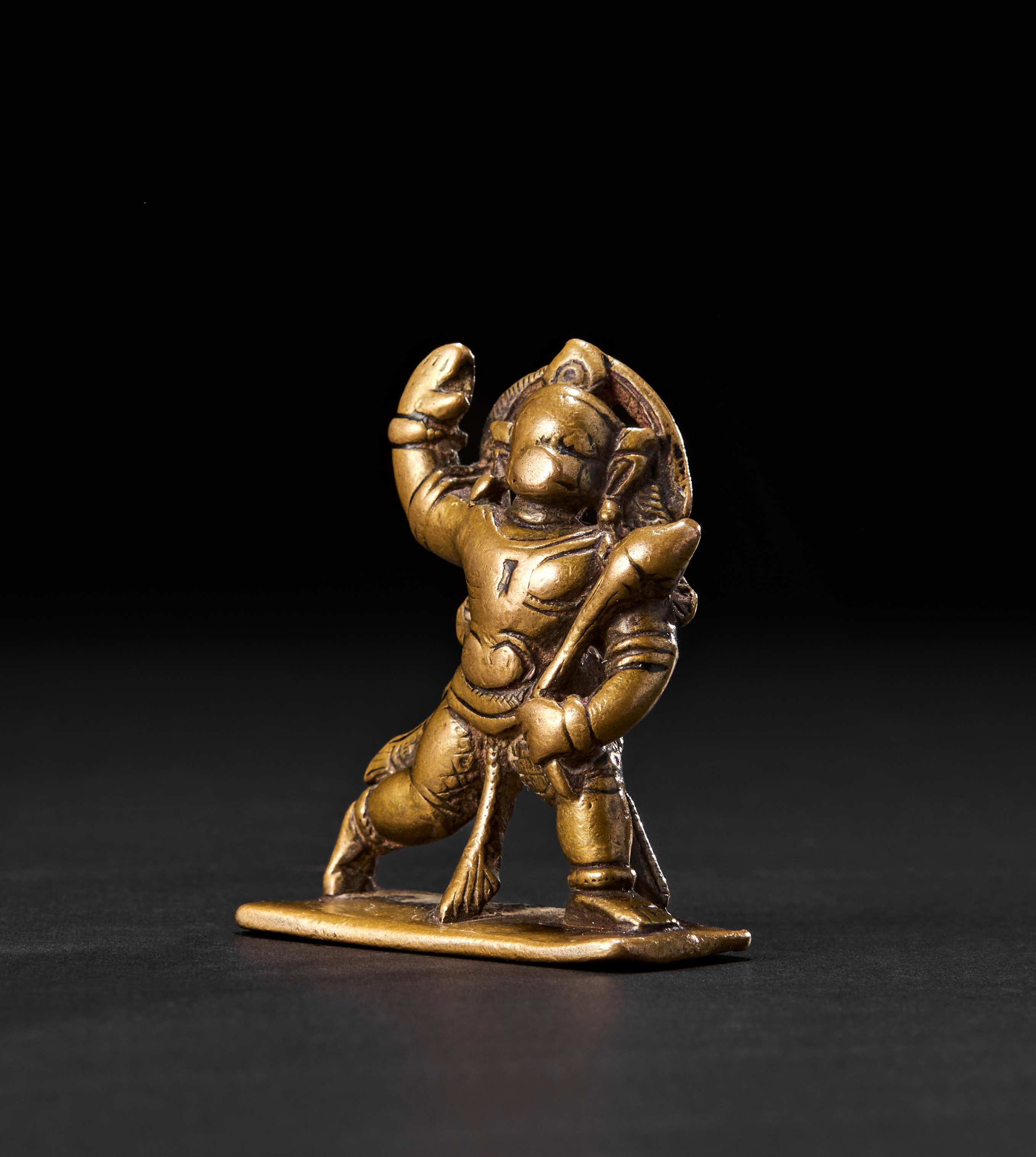 With one arm raised in salute (abhaya mudra) and the other resting firmly on his mace (gada). His expressive face, large ears, and strong body are finely modelled, while his long curling tail arches behind him in high relief, forming an elegant loop. The figure stands firmly on an oblong base and wears a richly detailed dhoti and ornaments.