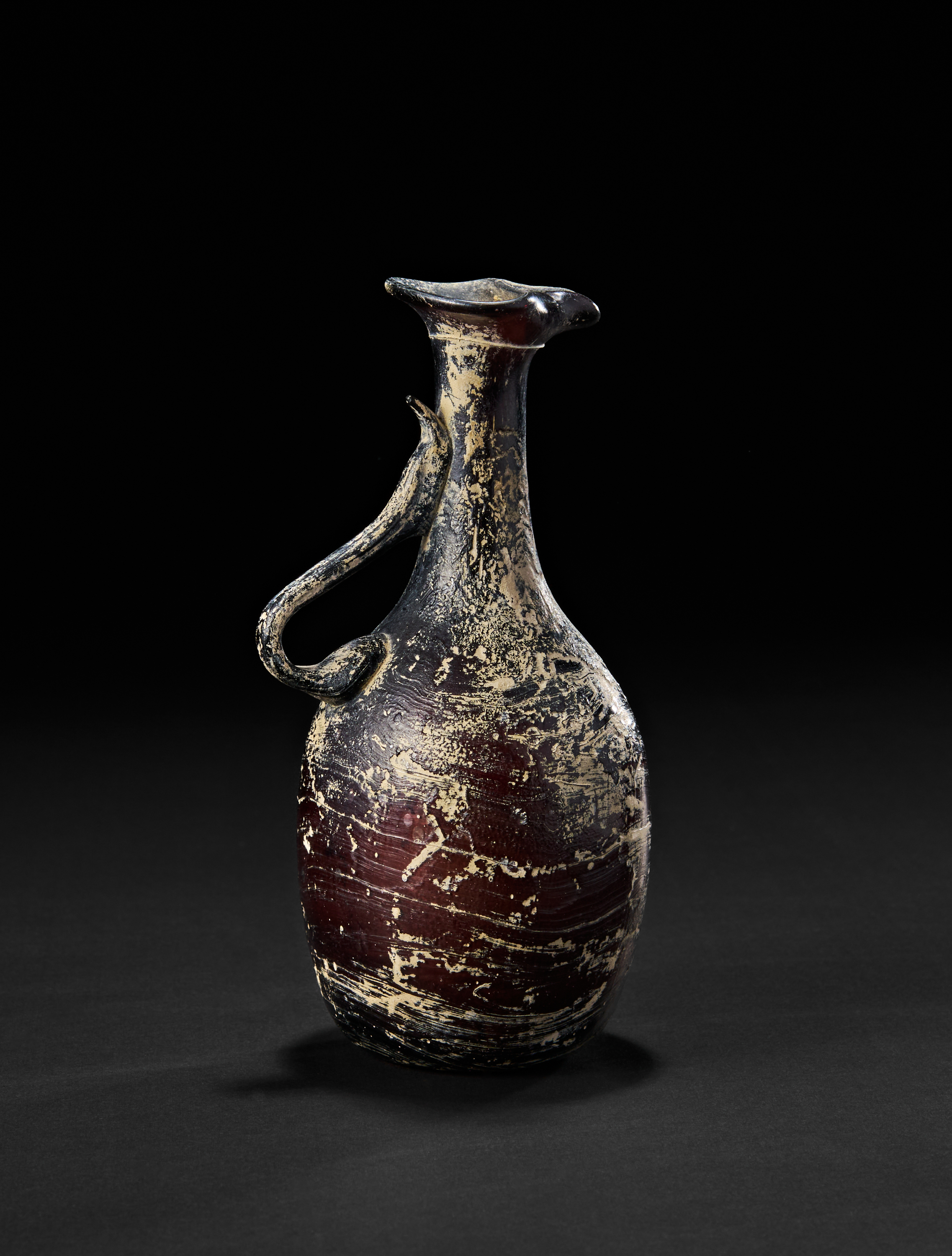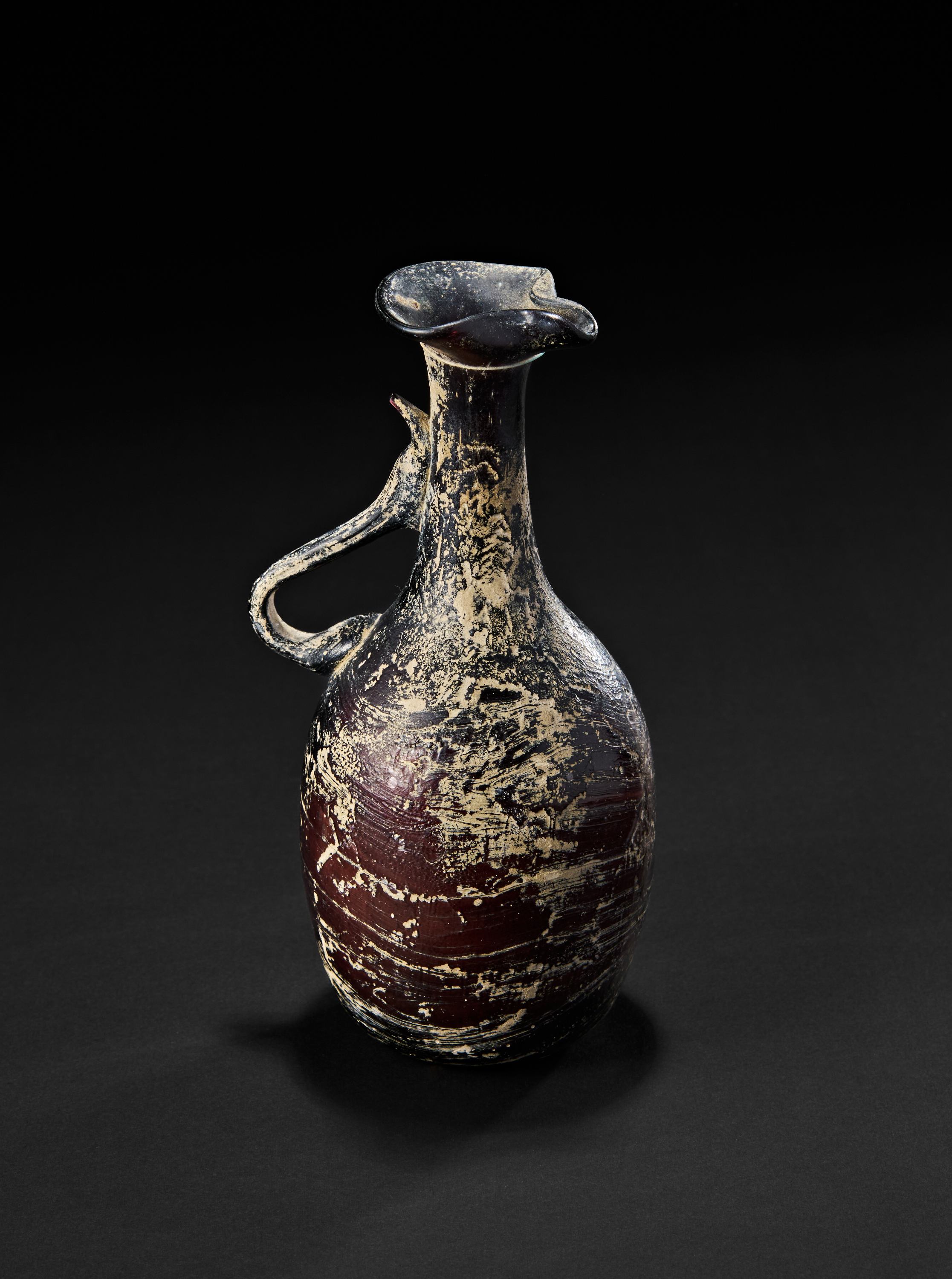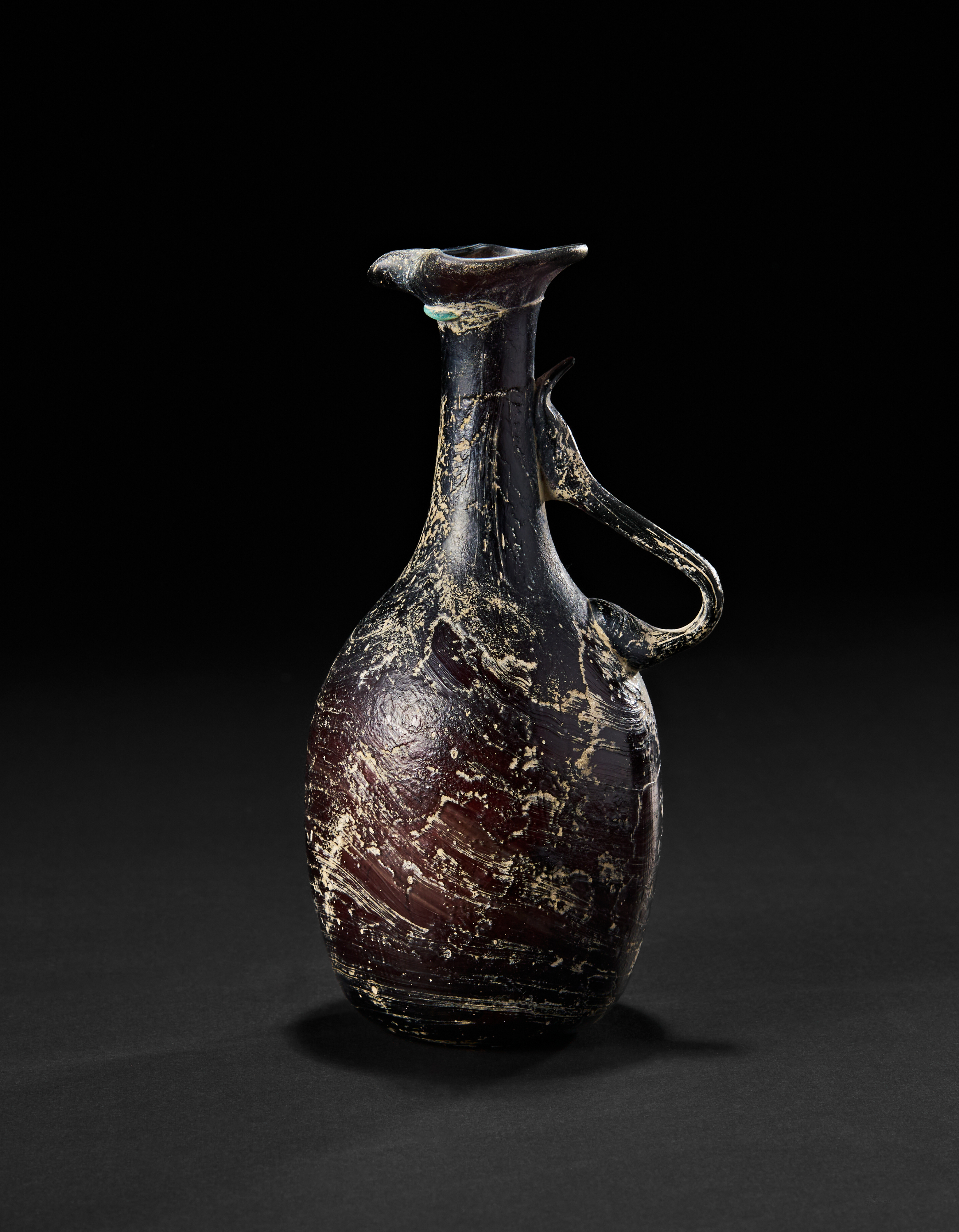 A brown glass jug dates to the Umayyad period, possibly from the 7th–8th century, with a deep aubergine hue, the jug features a graceful elongated neck that flares into a pinched spout, and a single elegantly arched handle applied from rim to shoulder. The surface is richly weathered with natural iridescence and encrustation.