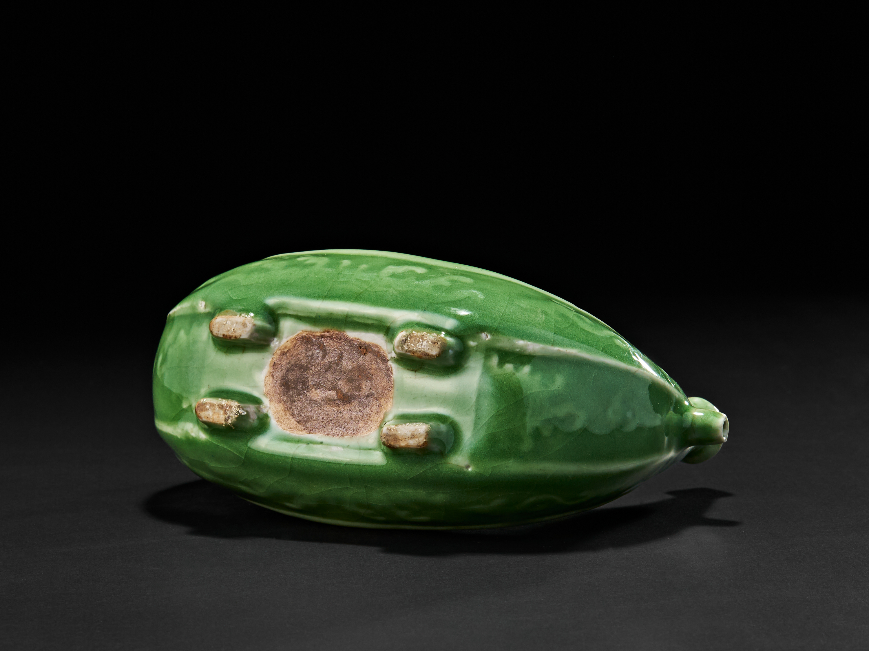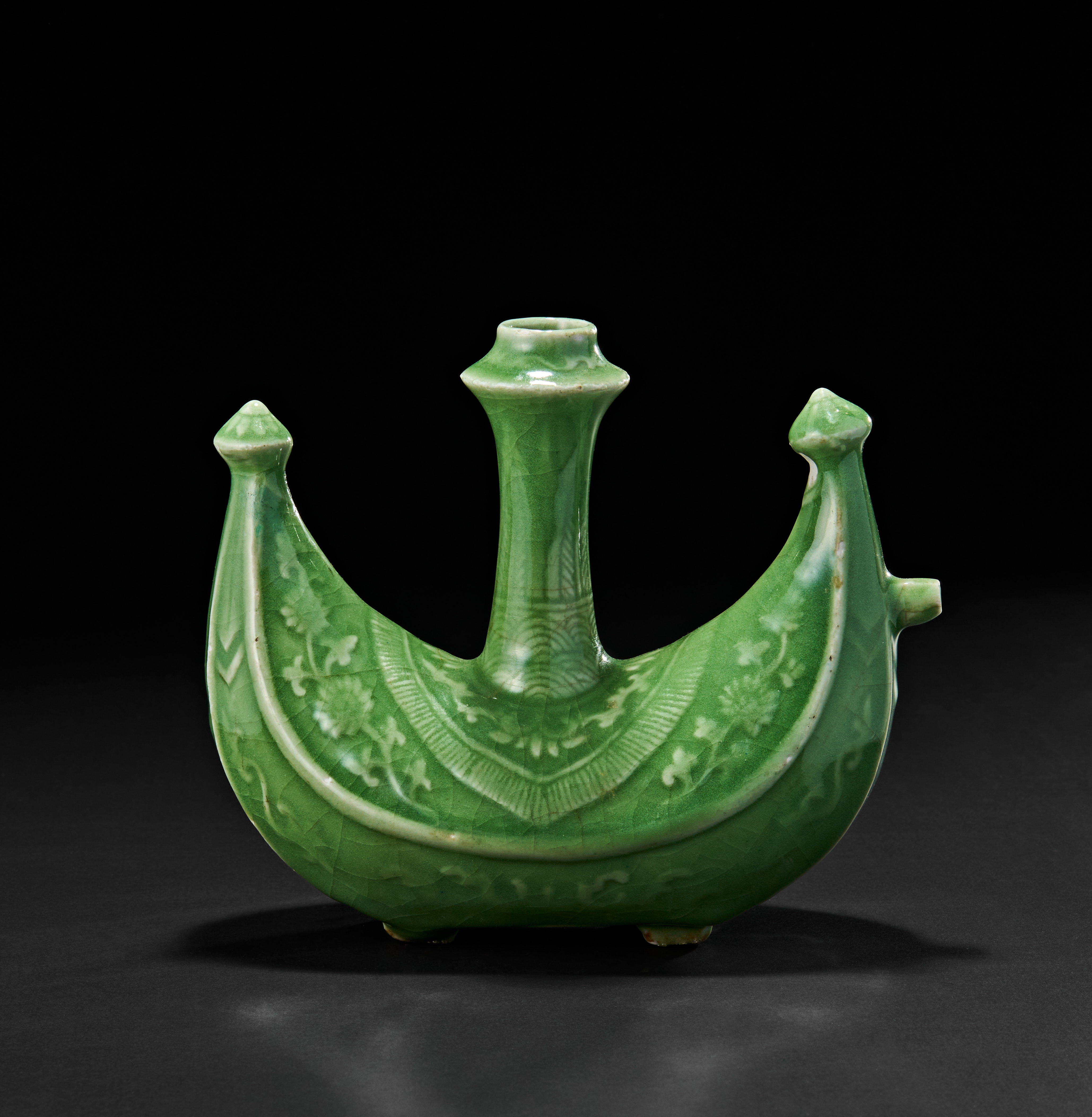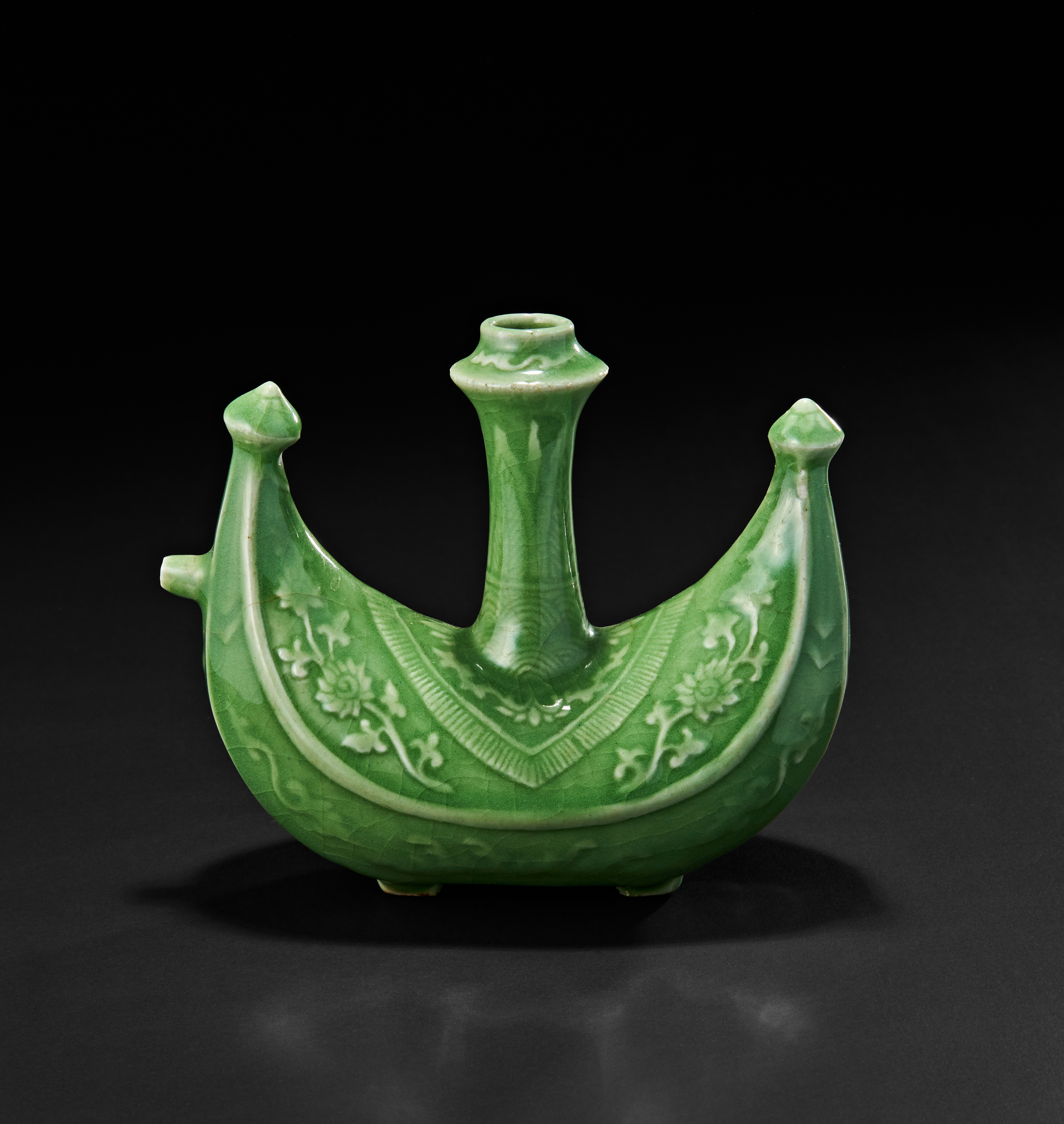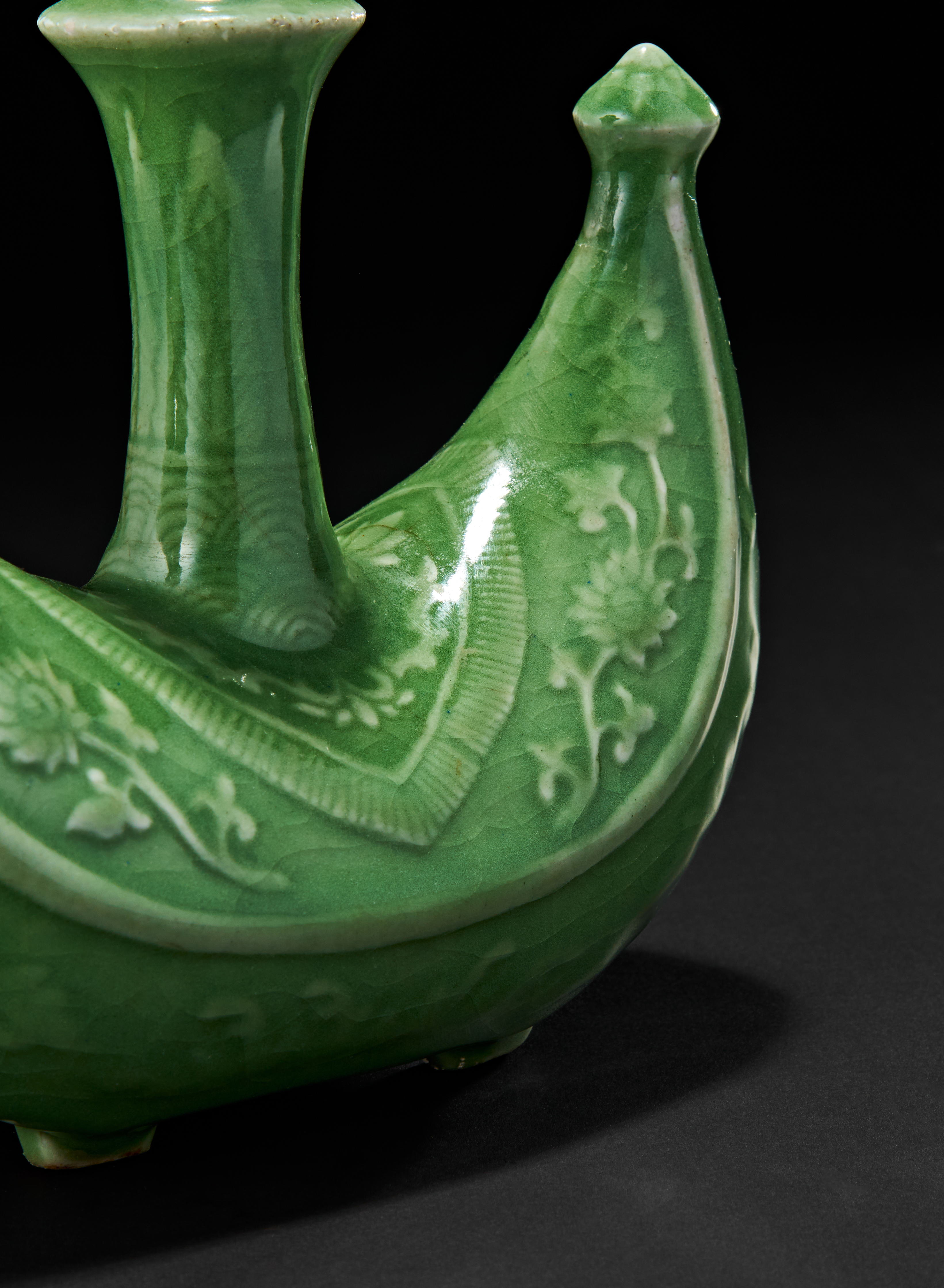 The vessel features a vibrant green glaze with delicately incised floral and scroll motifs. The central vertical neck rises elegantly from the boat’s centre, flanked by two peaked ends resembling a ship’s prow and stern, with a finely modelled spout on one end. The bottom reveals four short feet and an unglazed circular base.