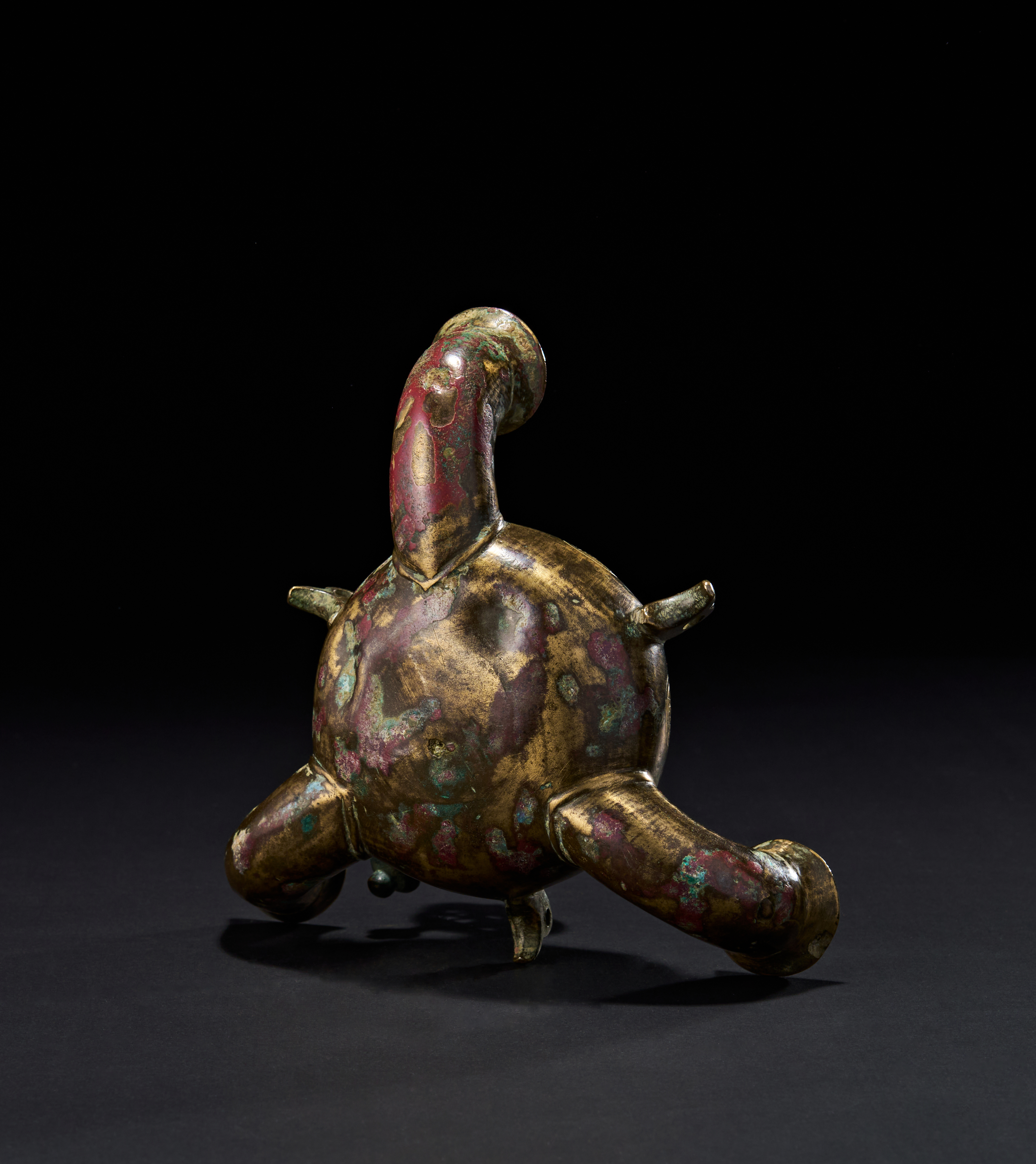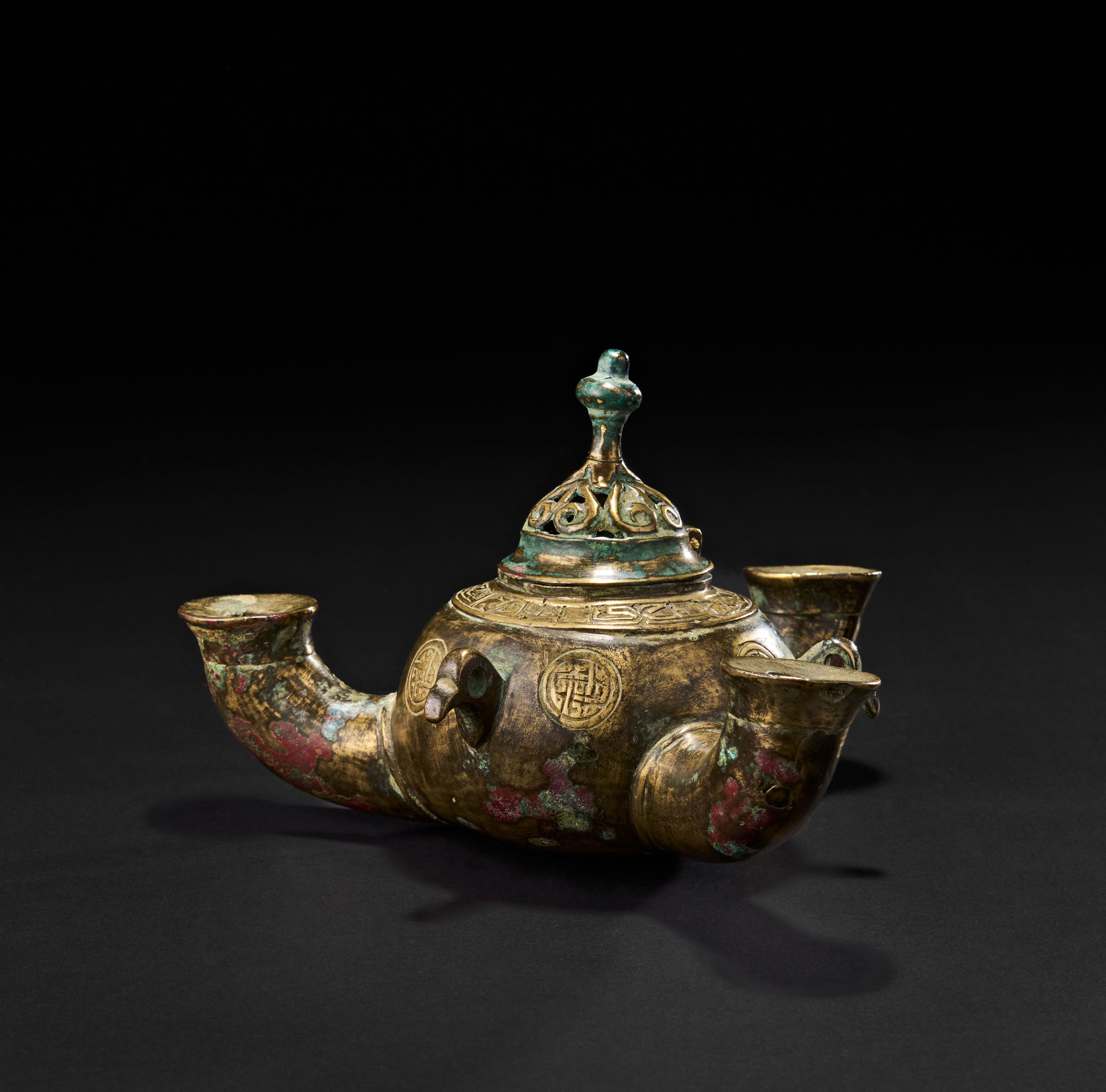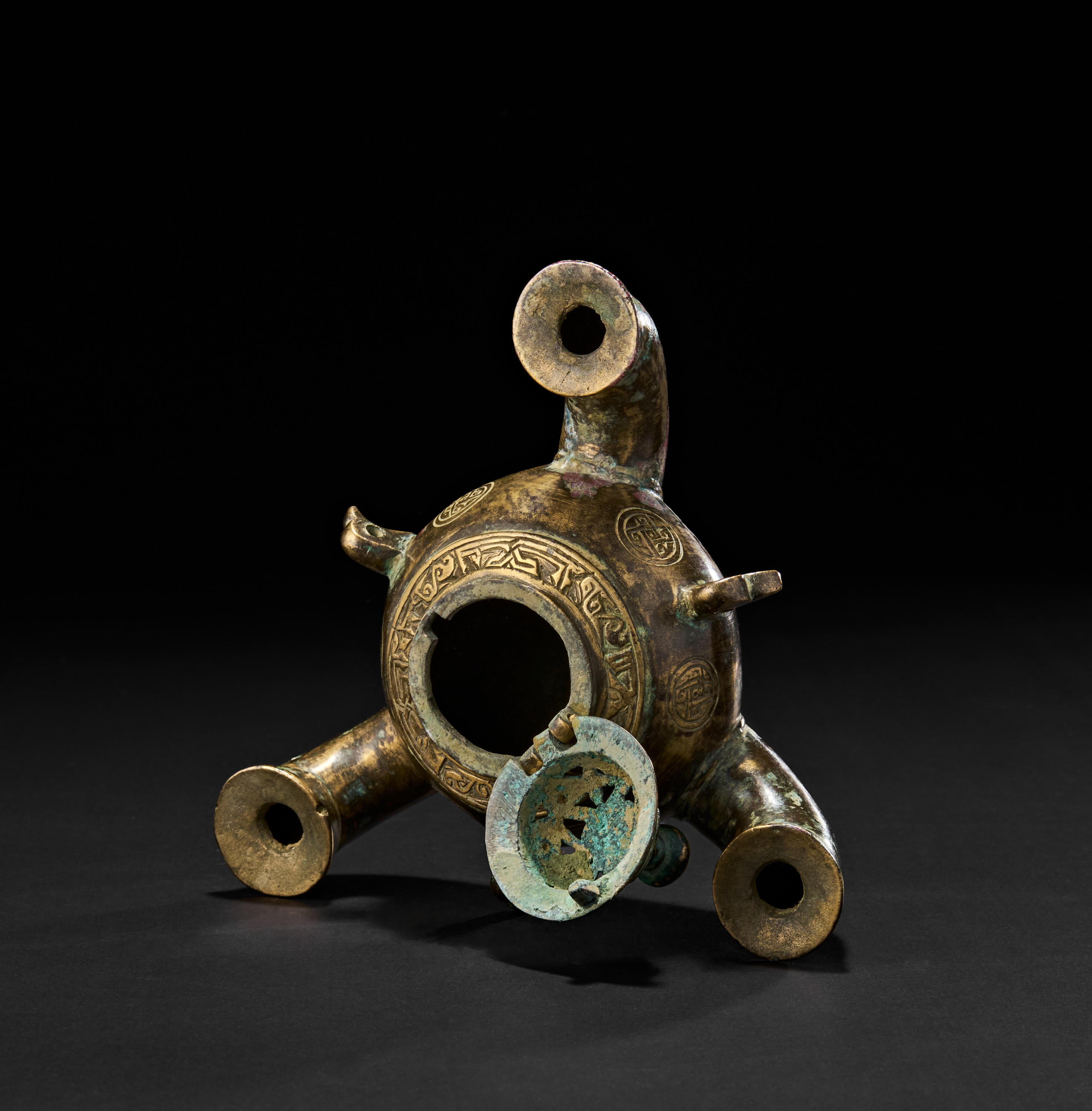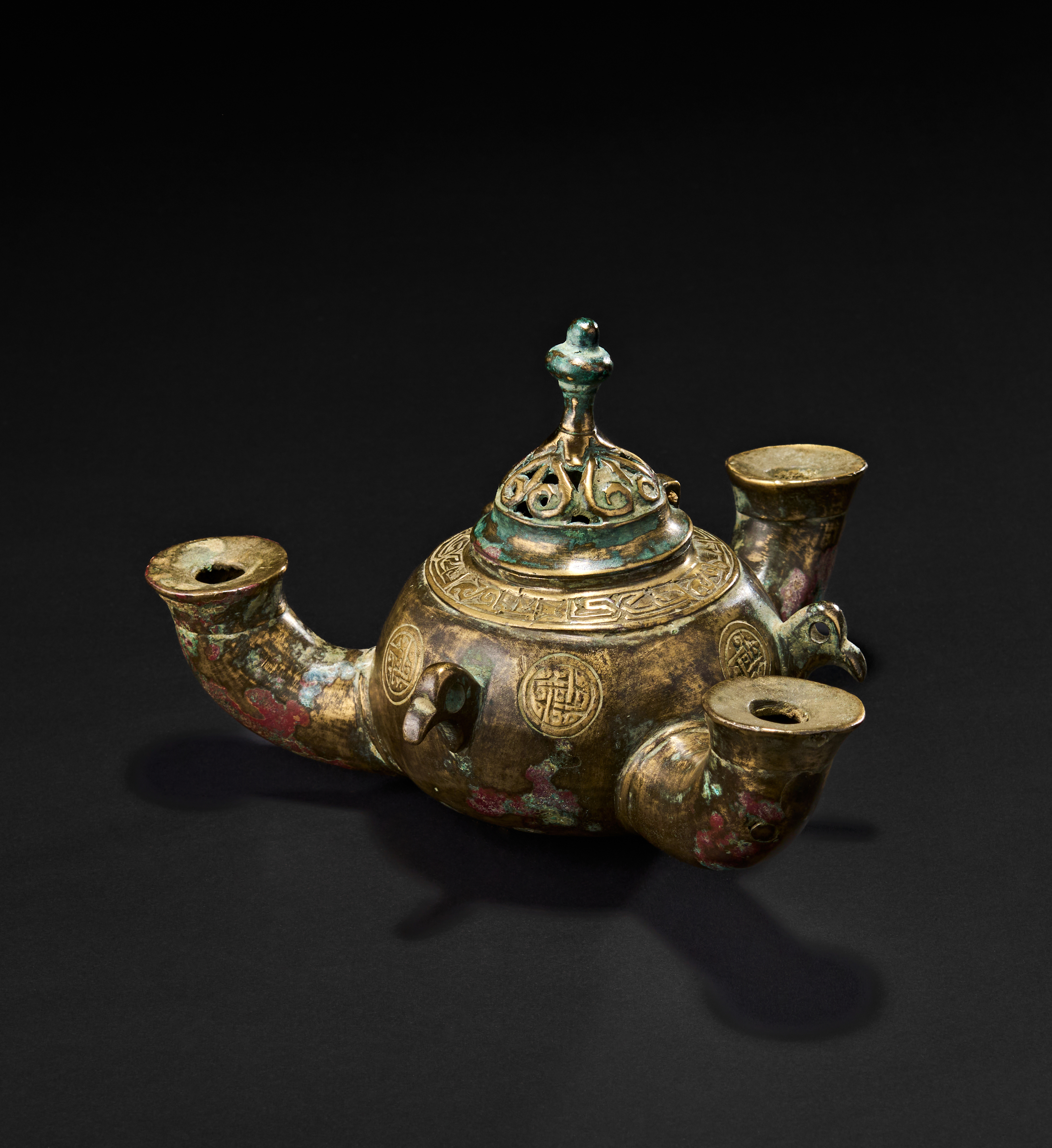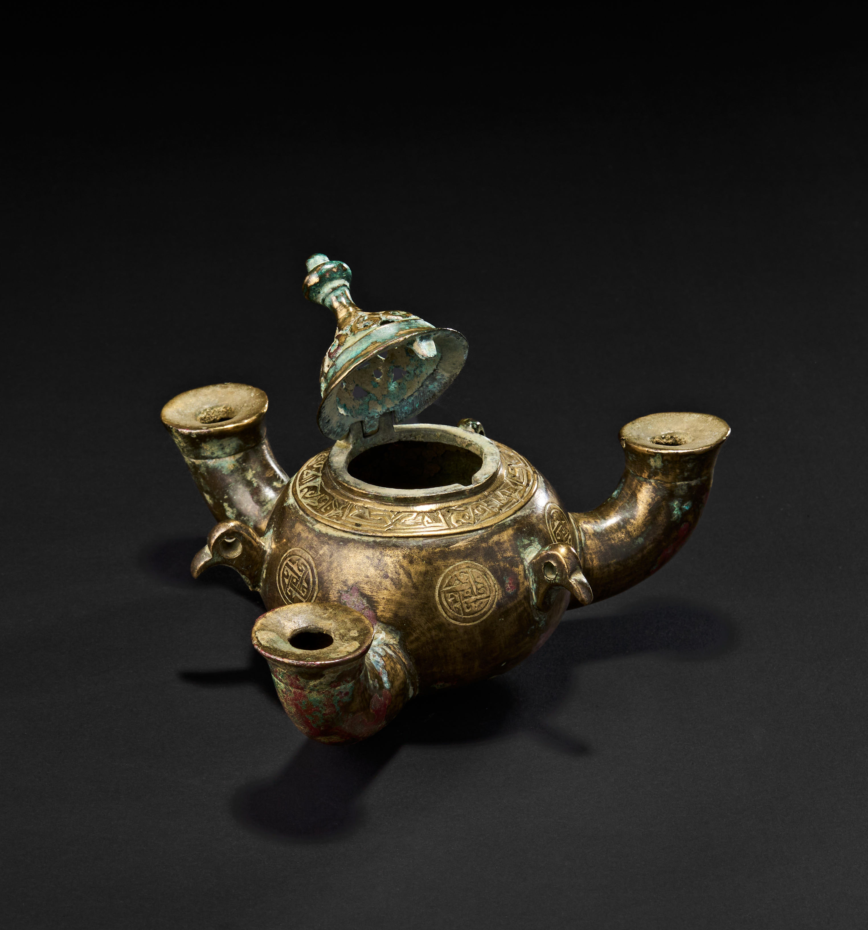 The lamp is finely cast with roundels enclosing geometric and possibly calligraphic motifs, and decorative bands along the shoulder. Rich patination in green and red. The spouts are shaped like bird heads. The lid is hinged, revealing a spacious interior chamber for oil.