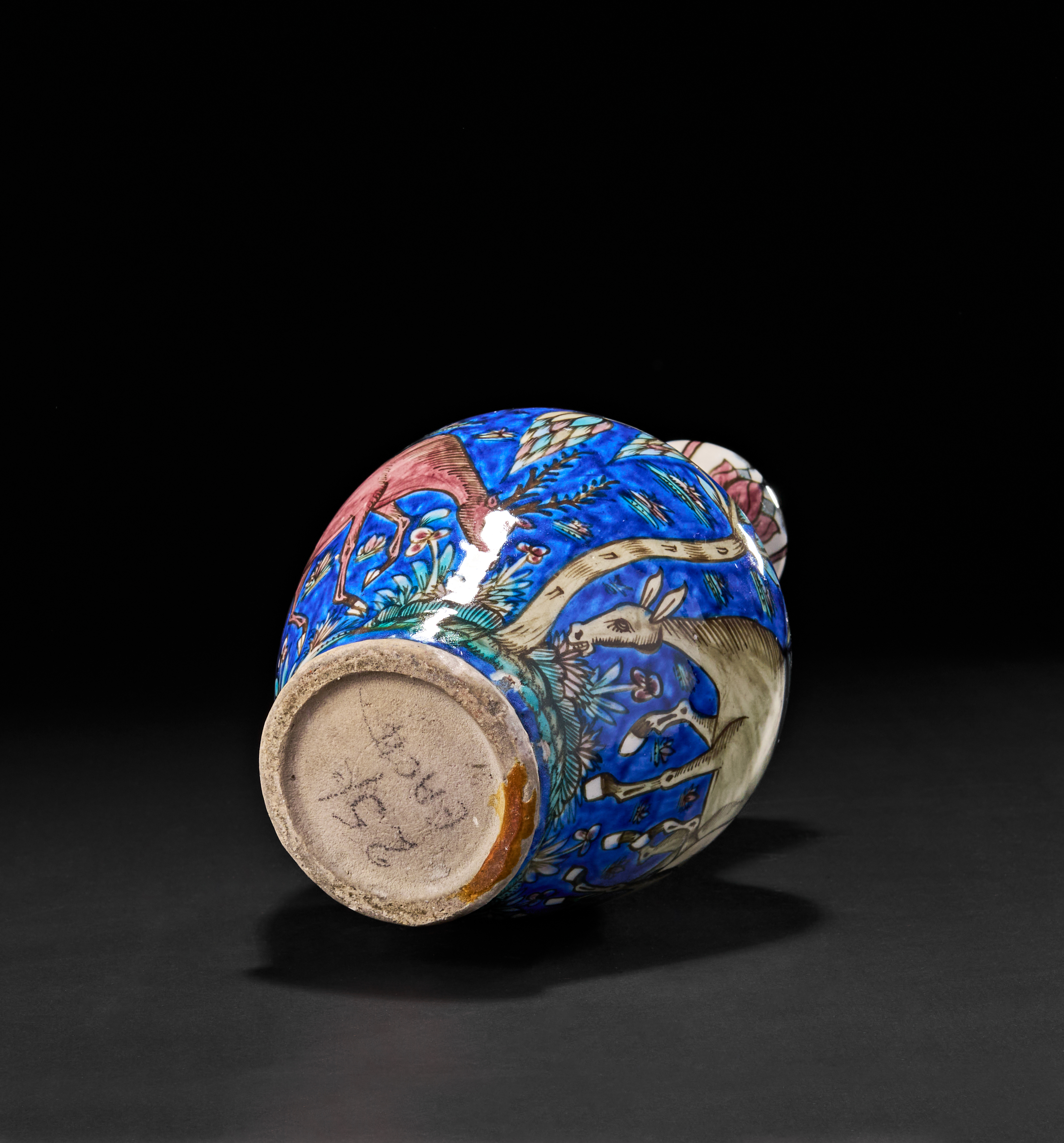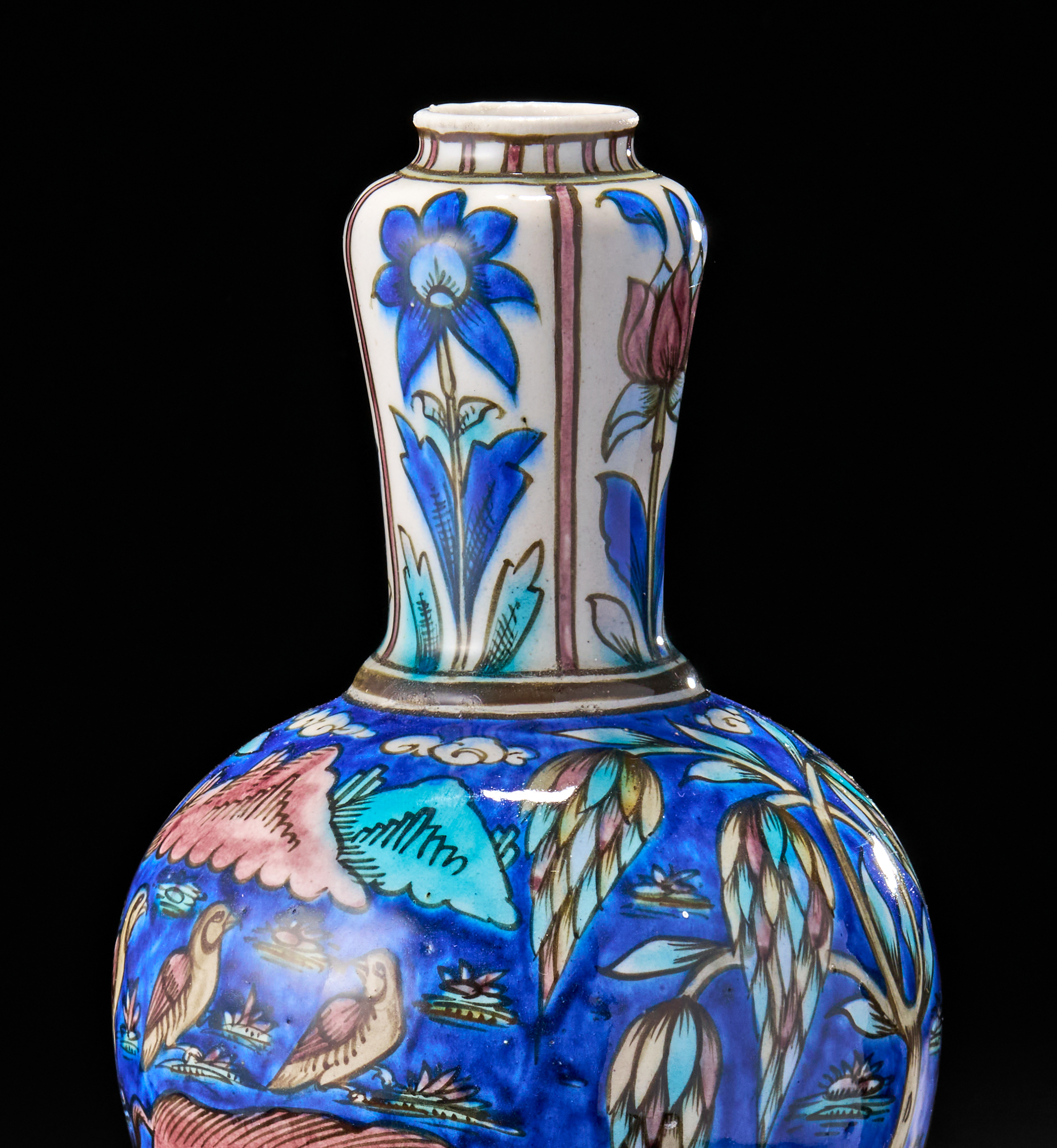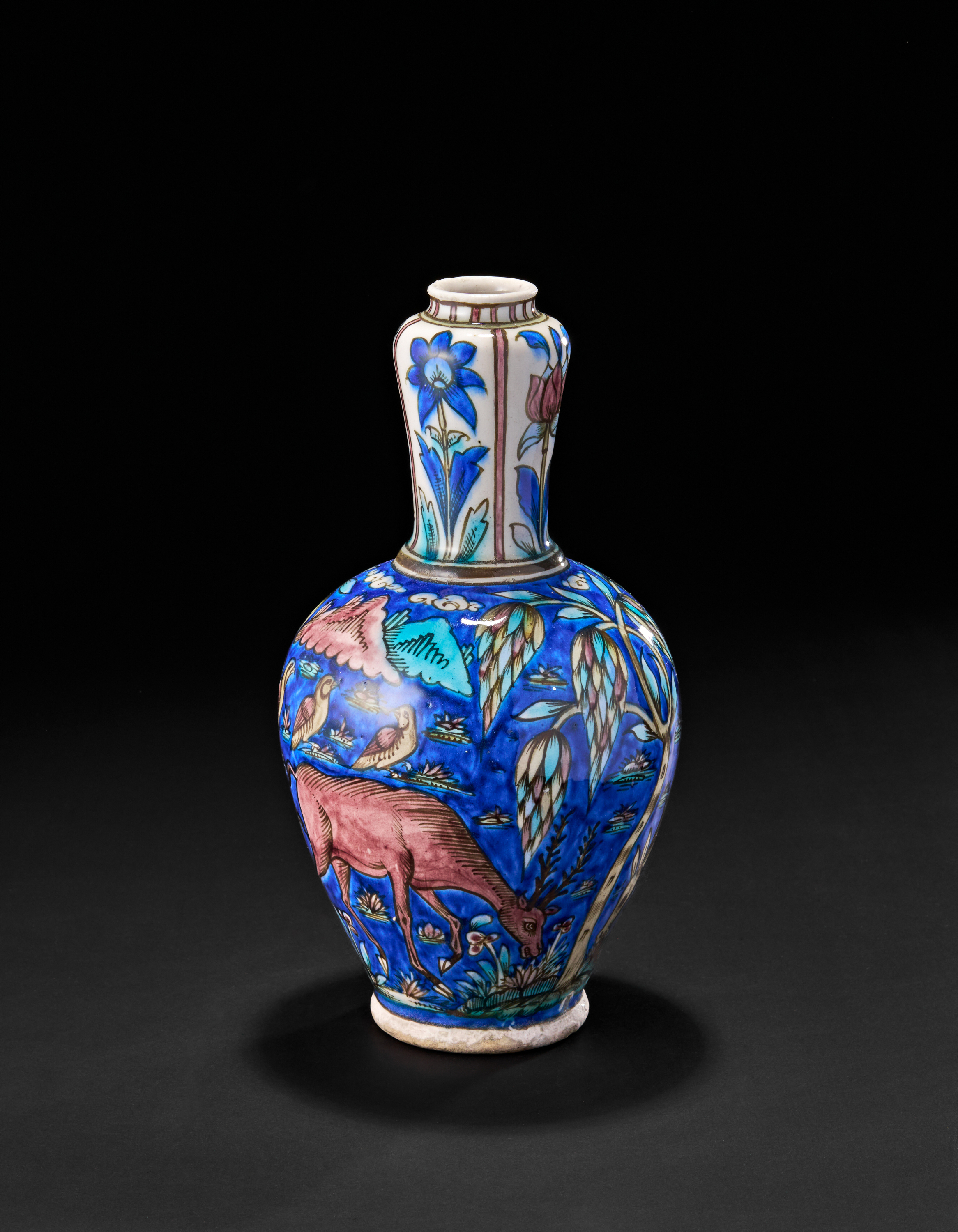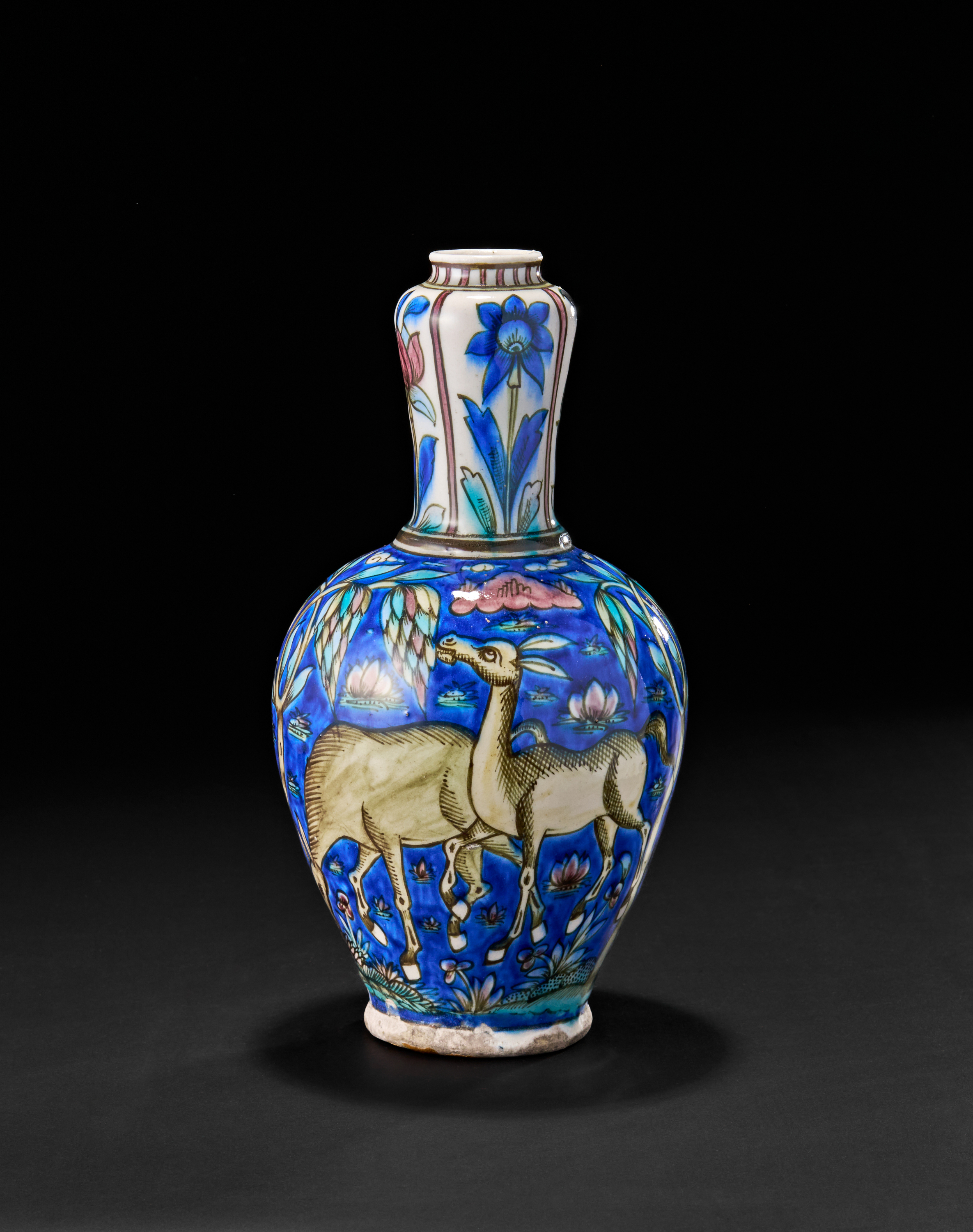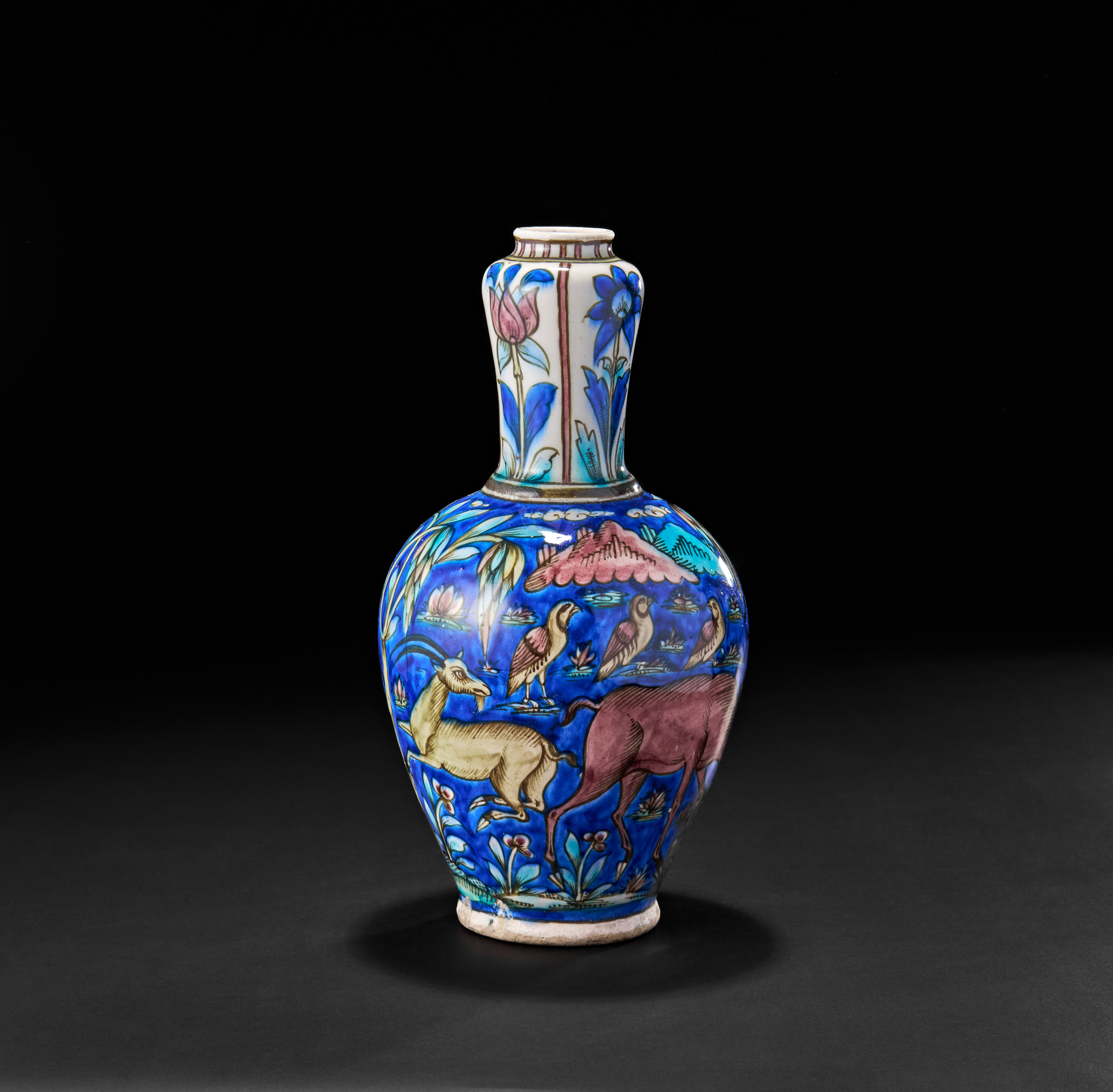 Richly adorned with vibrant polychrome scenes of wildlife and flora. The bulbous body features a pastoral composition of elegantly depicted deer and gazelles among lush trees and lotus blossoms, under a cobalt blue ground. Birds perch serenely above, while the tall neck is painted with vertical panels of tulips and irises in soft blues, pinks, and greens.