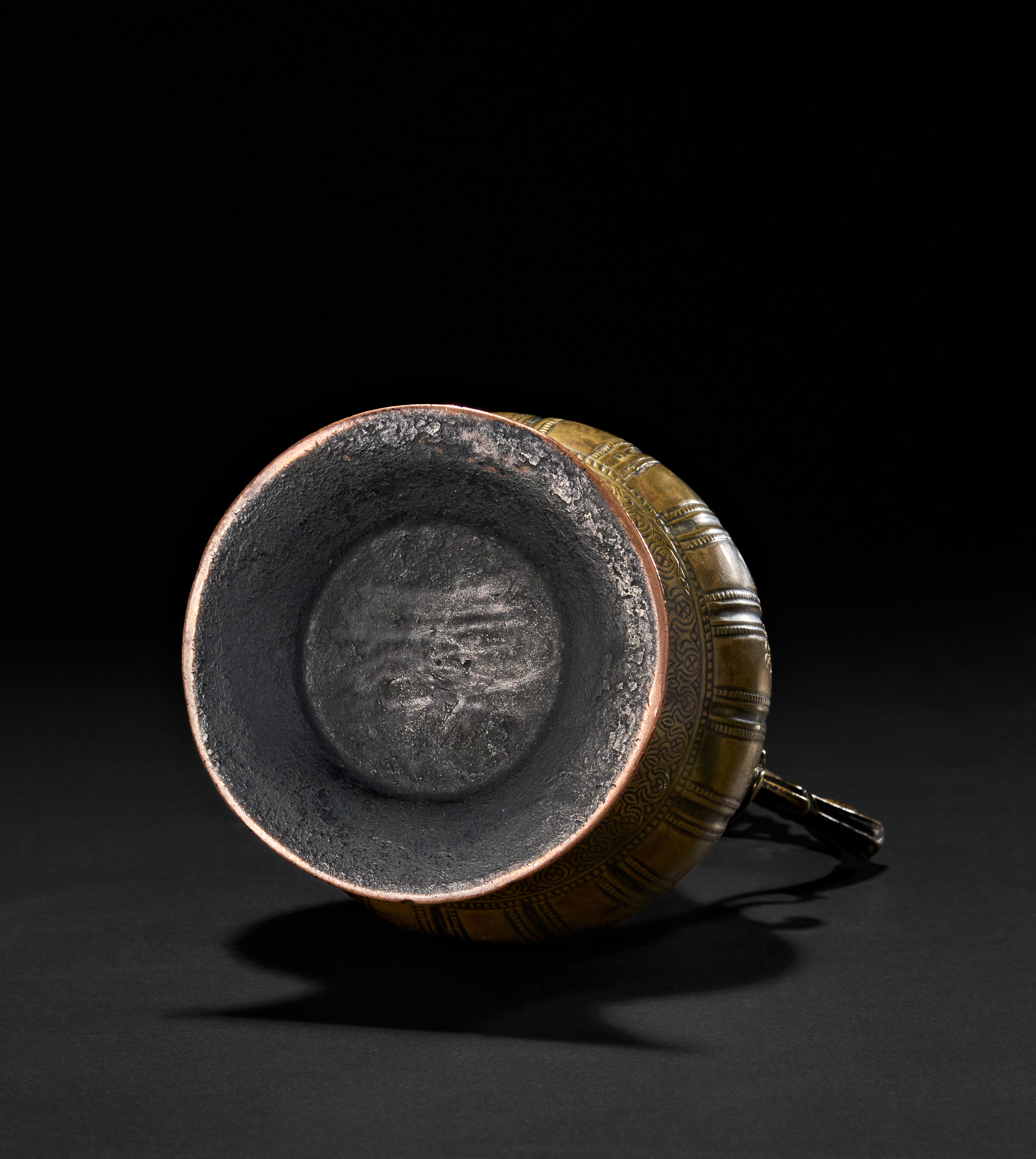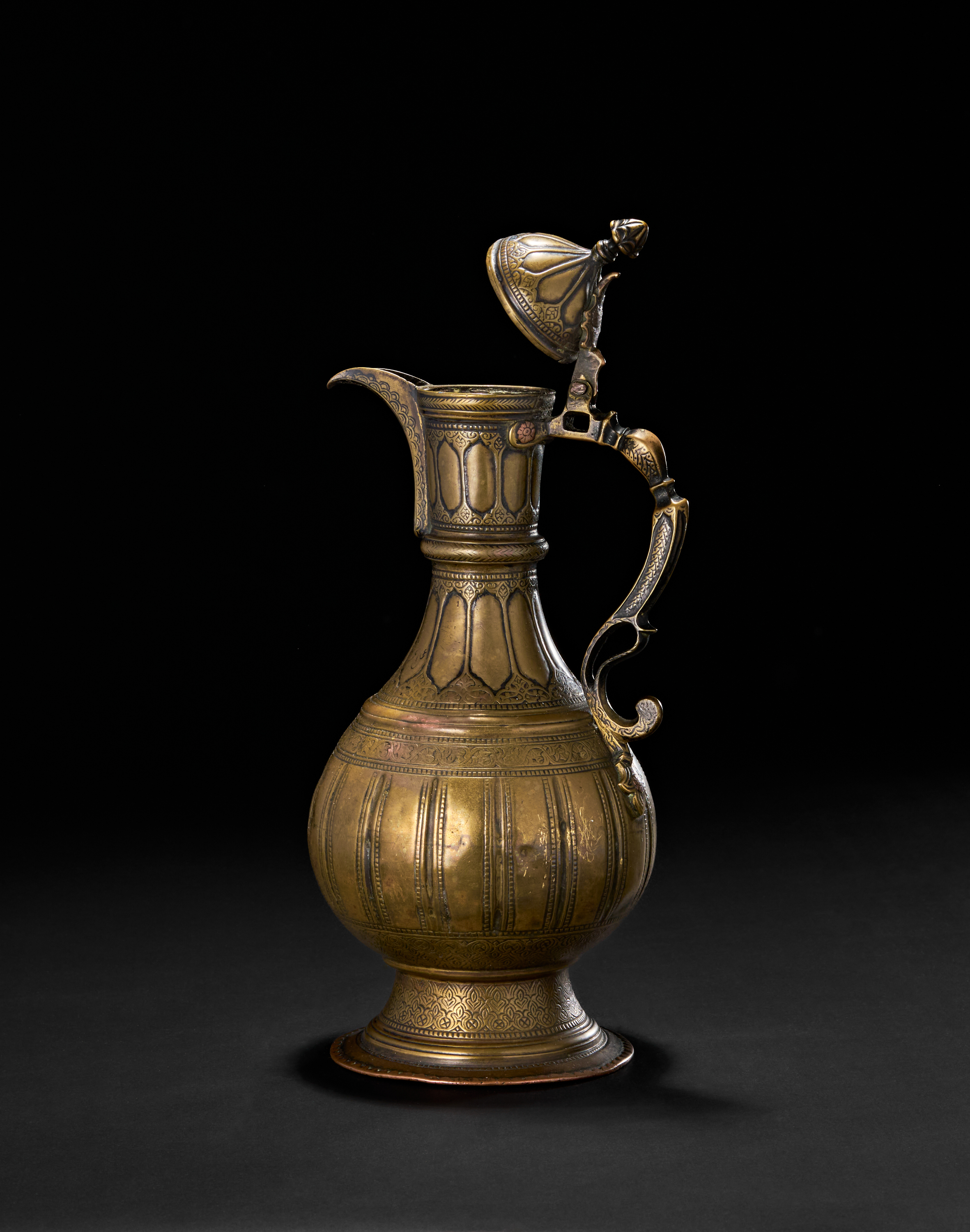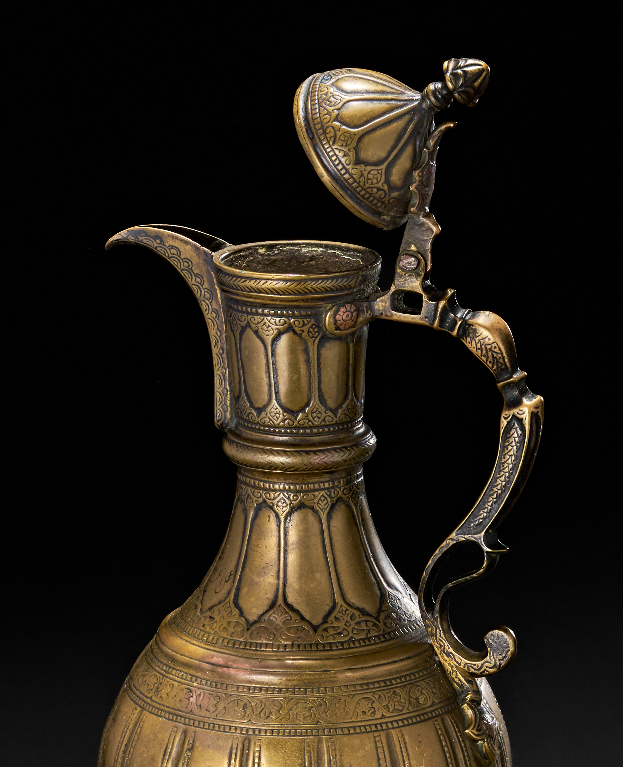 The vessel features a bulbous body with vertical fluting, intricate geometric and floral engravings throughout the neck, body, and foot, and a high spout with a gracefully arched handle. The lid is domed with ornate designs and is hinged to the handle. Signed Master Ahmed.