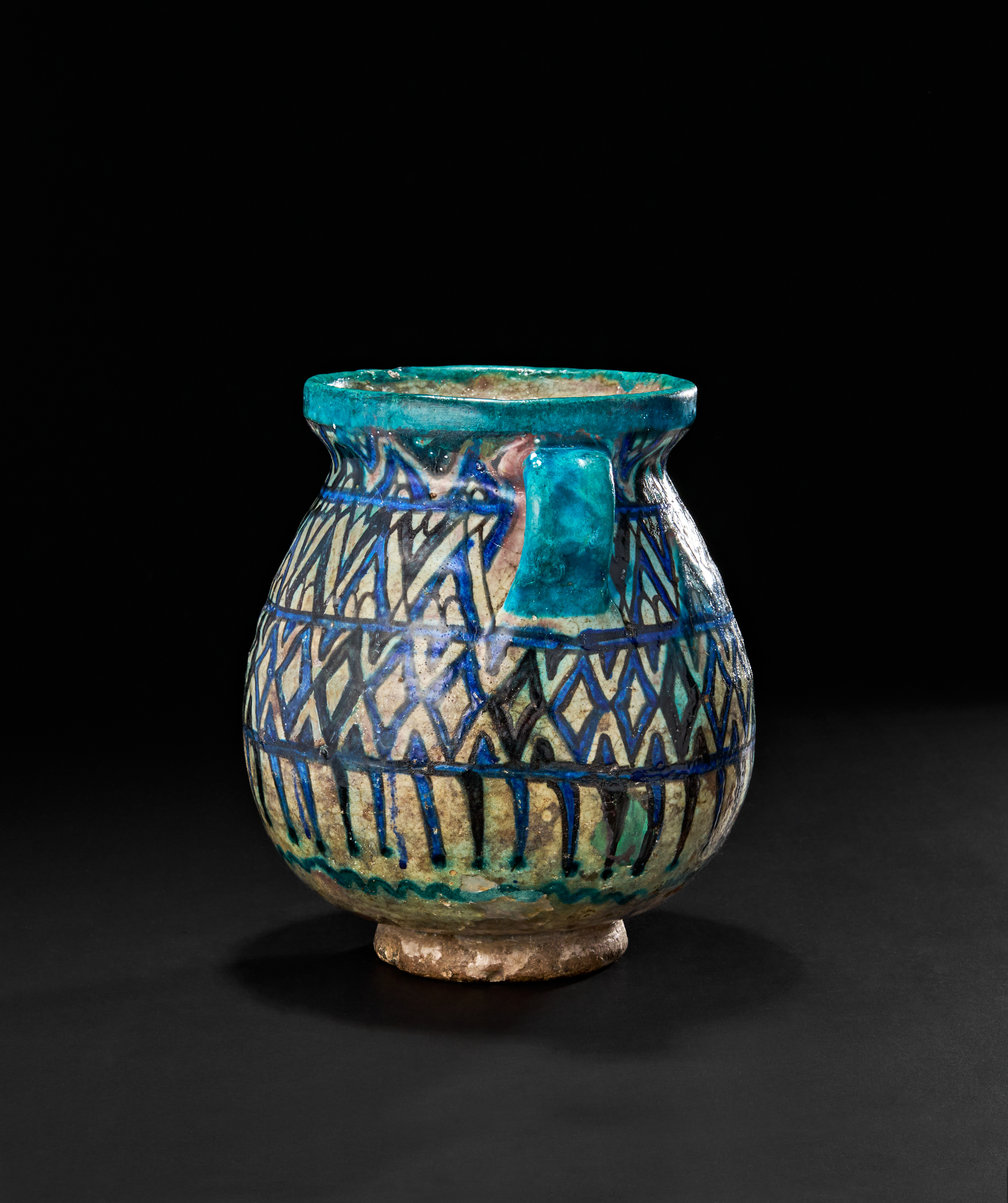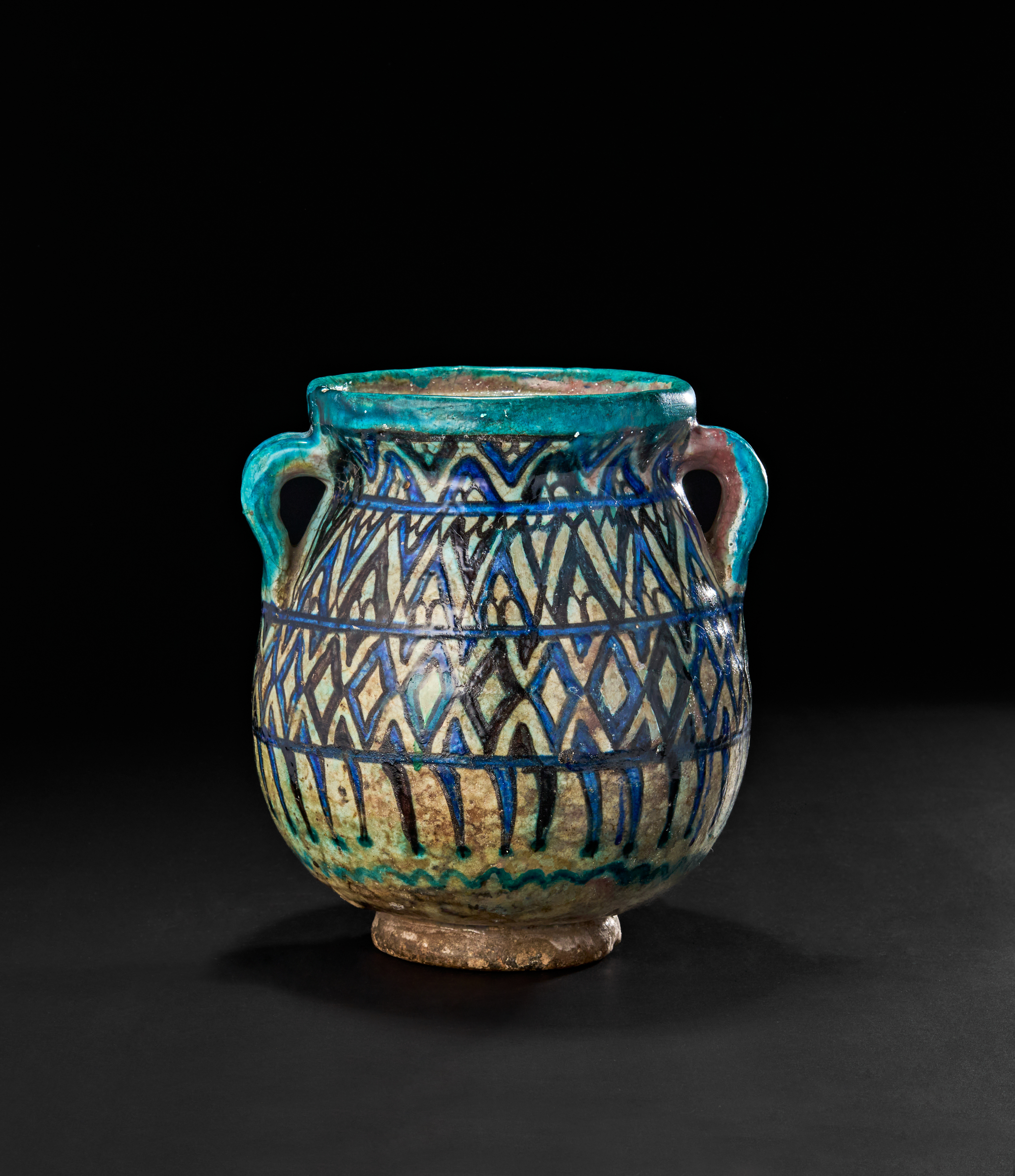 Adorned with a dynamic geometric lattice pattern in cobalt blue, turquoise, and black over a creamy base.