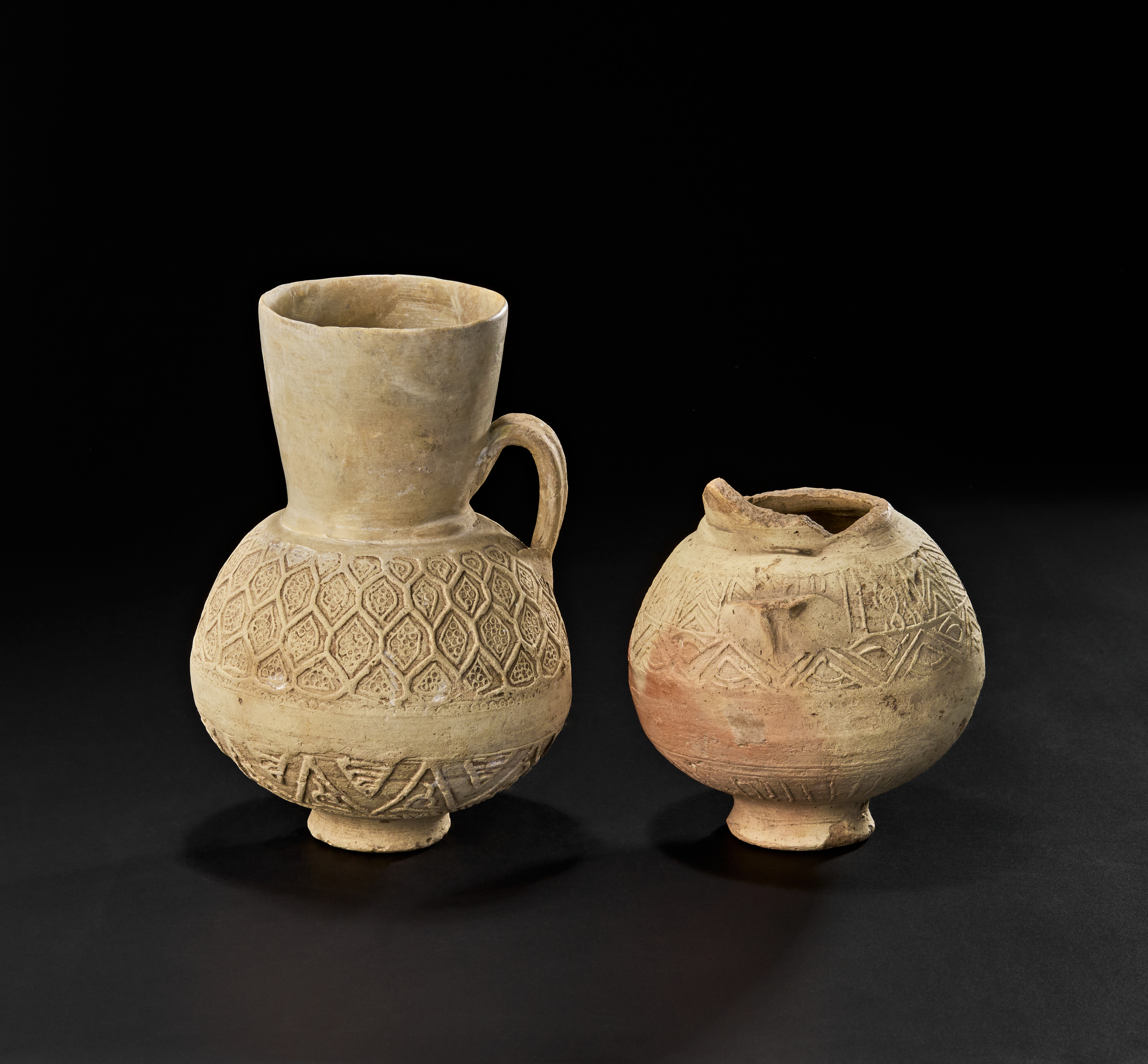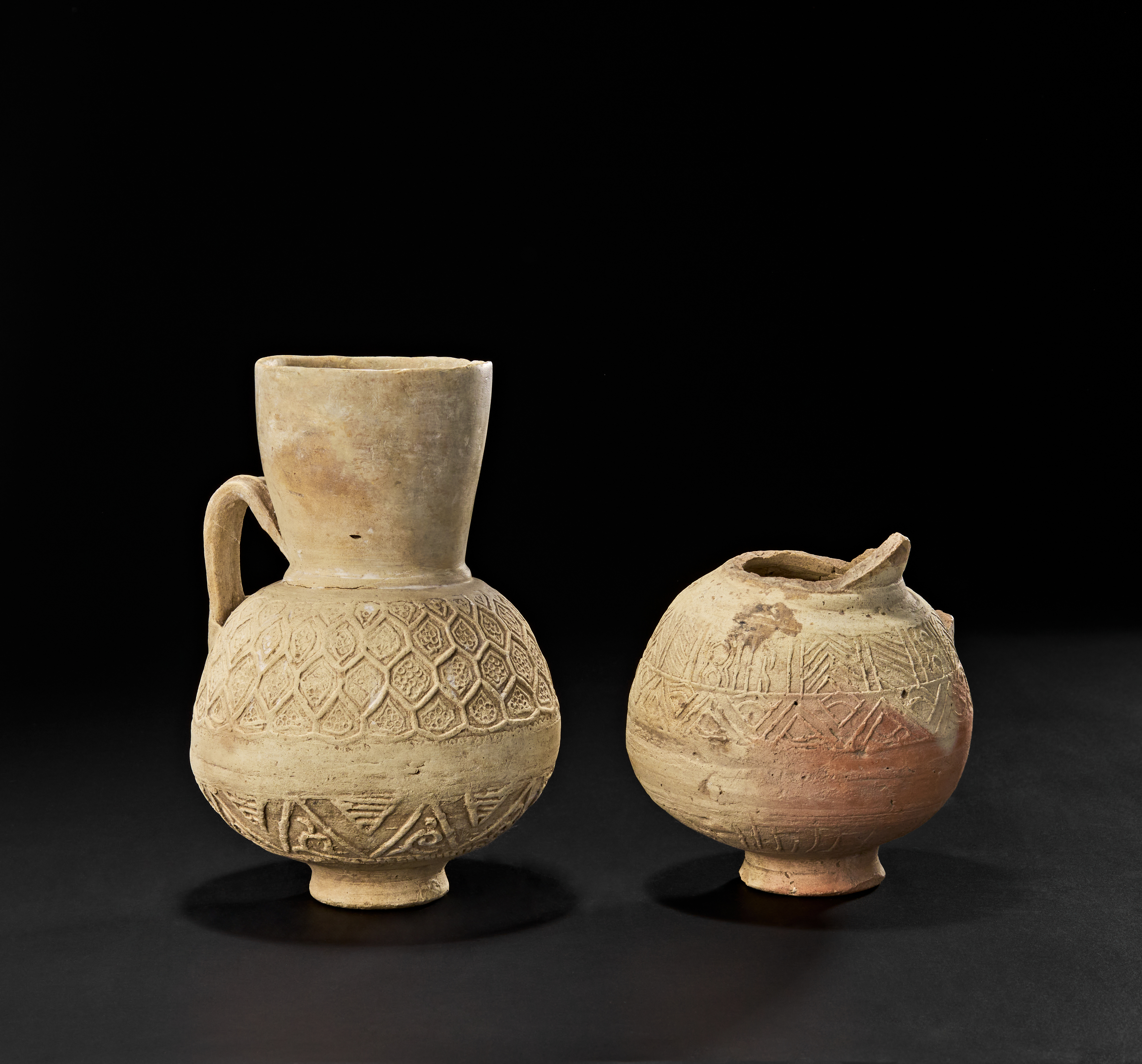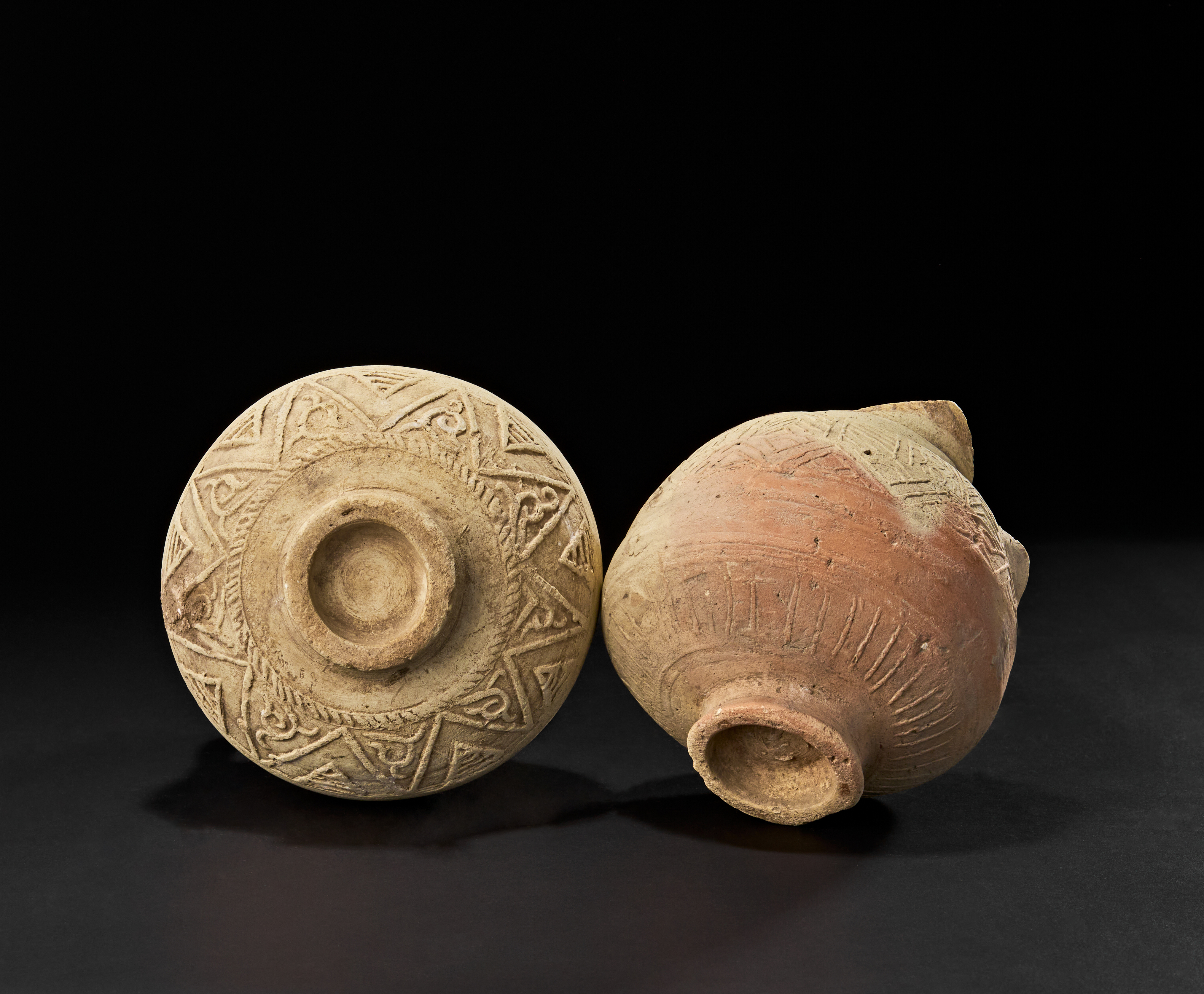 Feature finely incised geometric decoration, with one vessel notably signed.