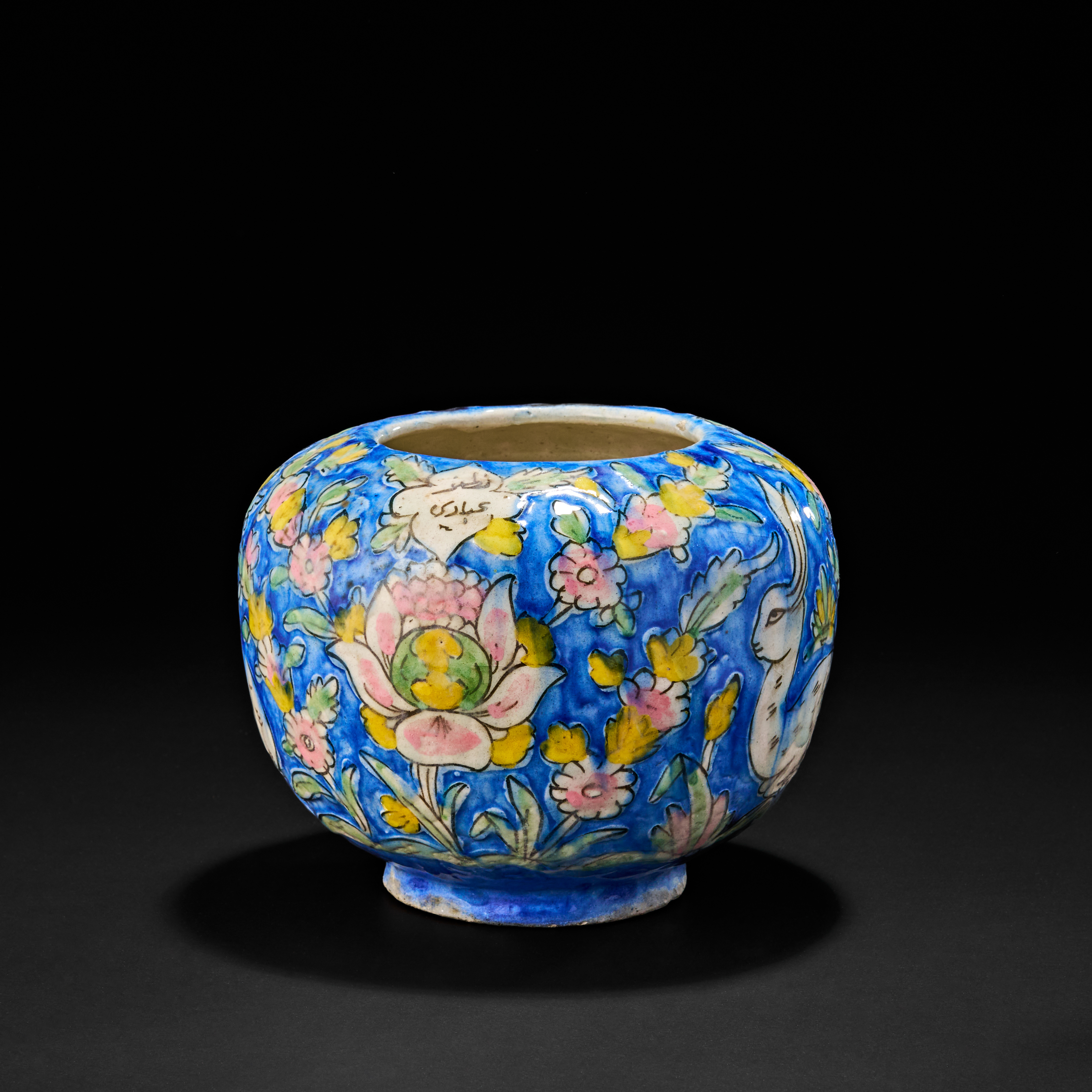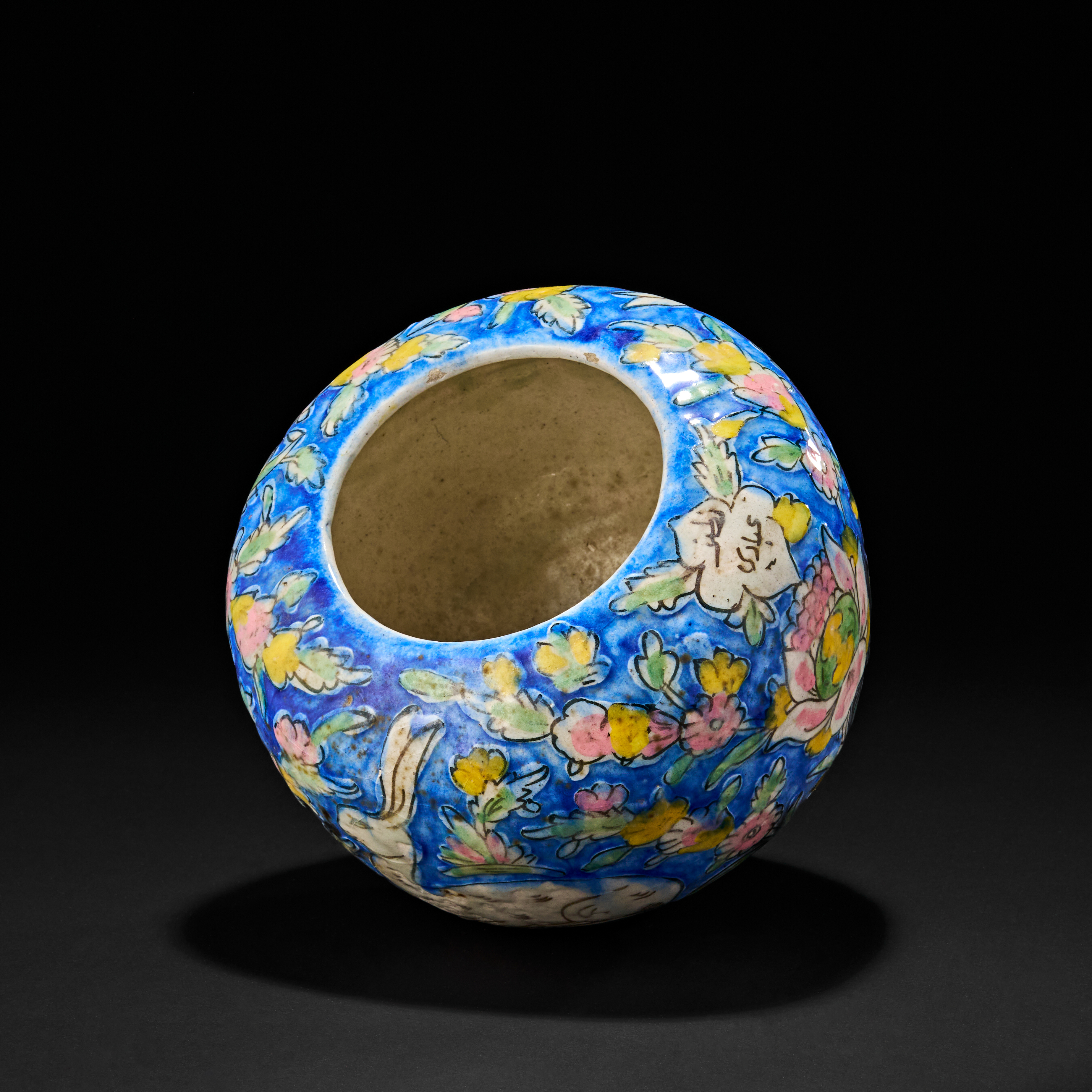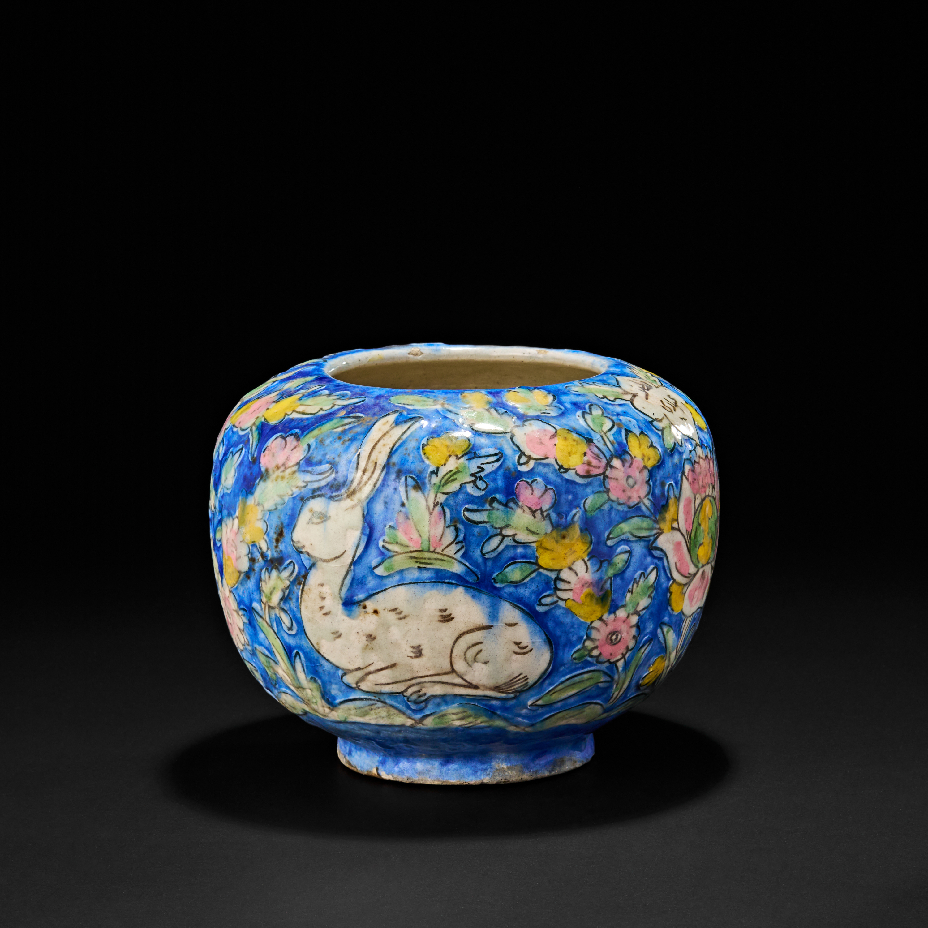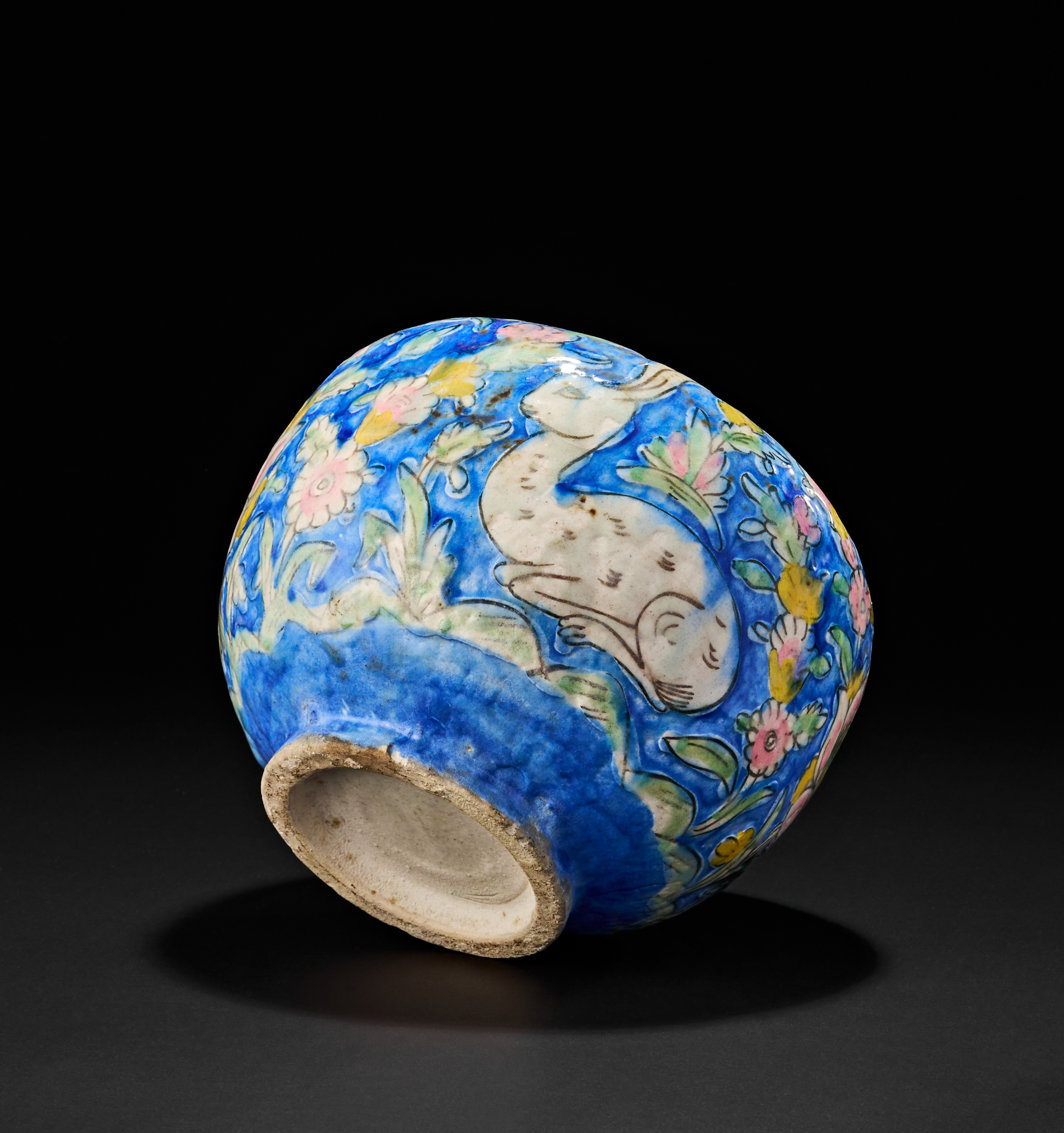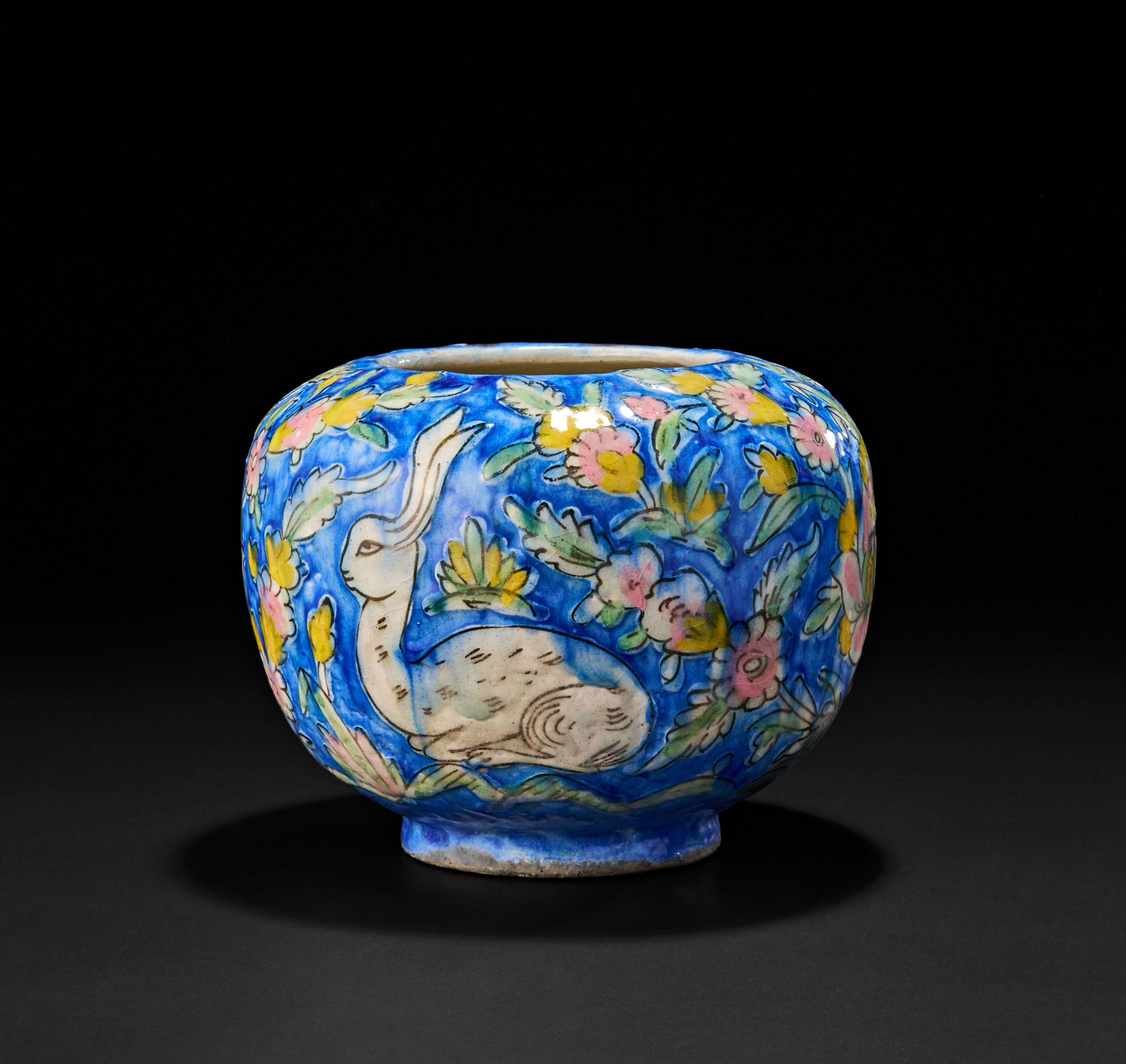 Features a vibrant cobalt blue background with painted floral motifs in soft shades of pink, yellow, and green. The focal point of the decoration is a repeating motif of elegant, white rabbits nestled among lush blooming foliage. The surface is rendered in underglaze painting and covered with a clear glaze.