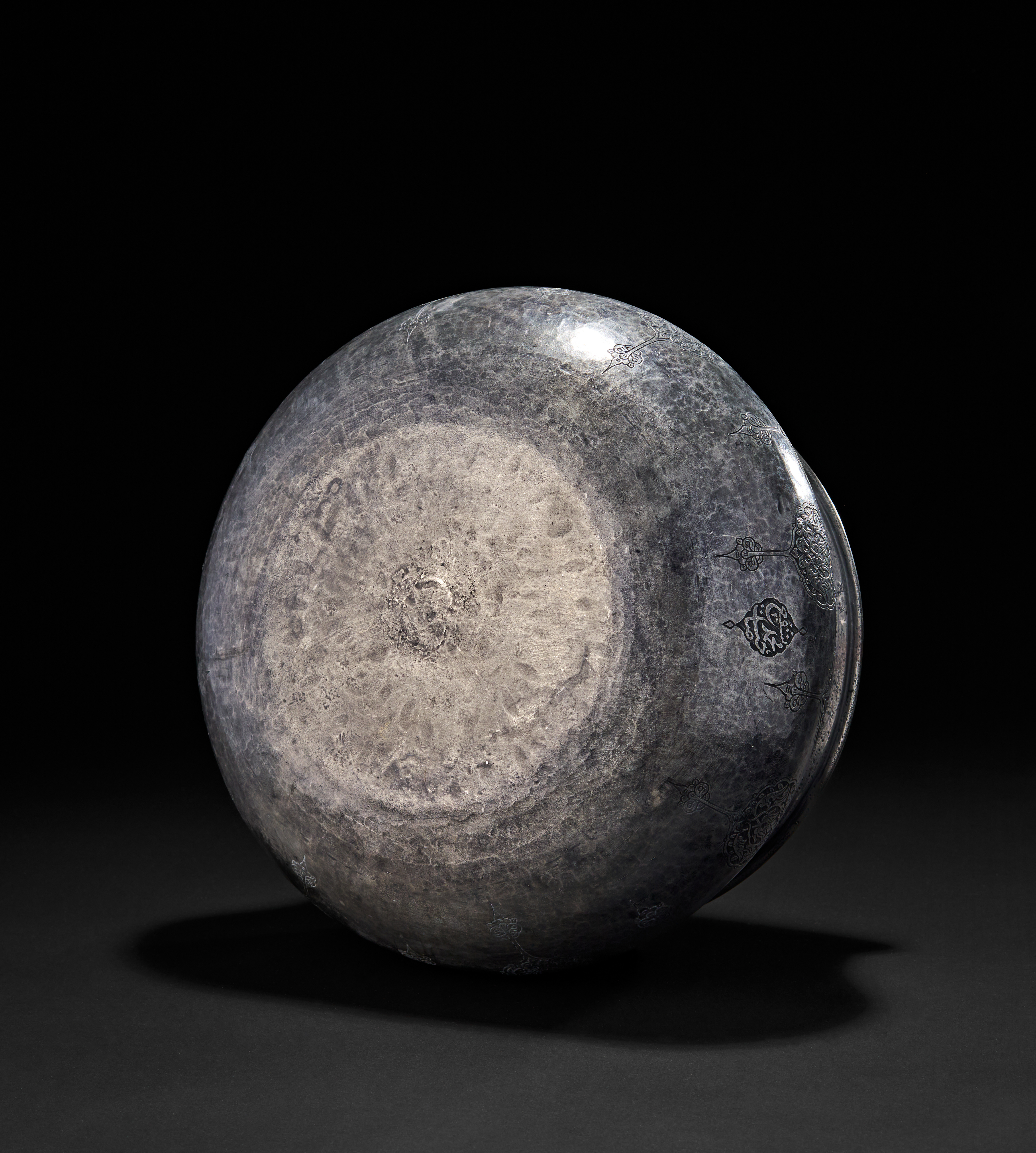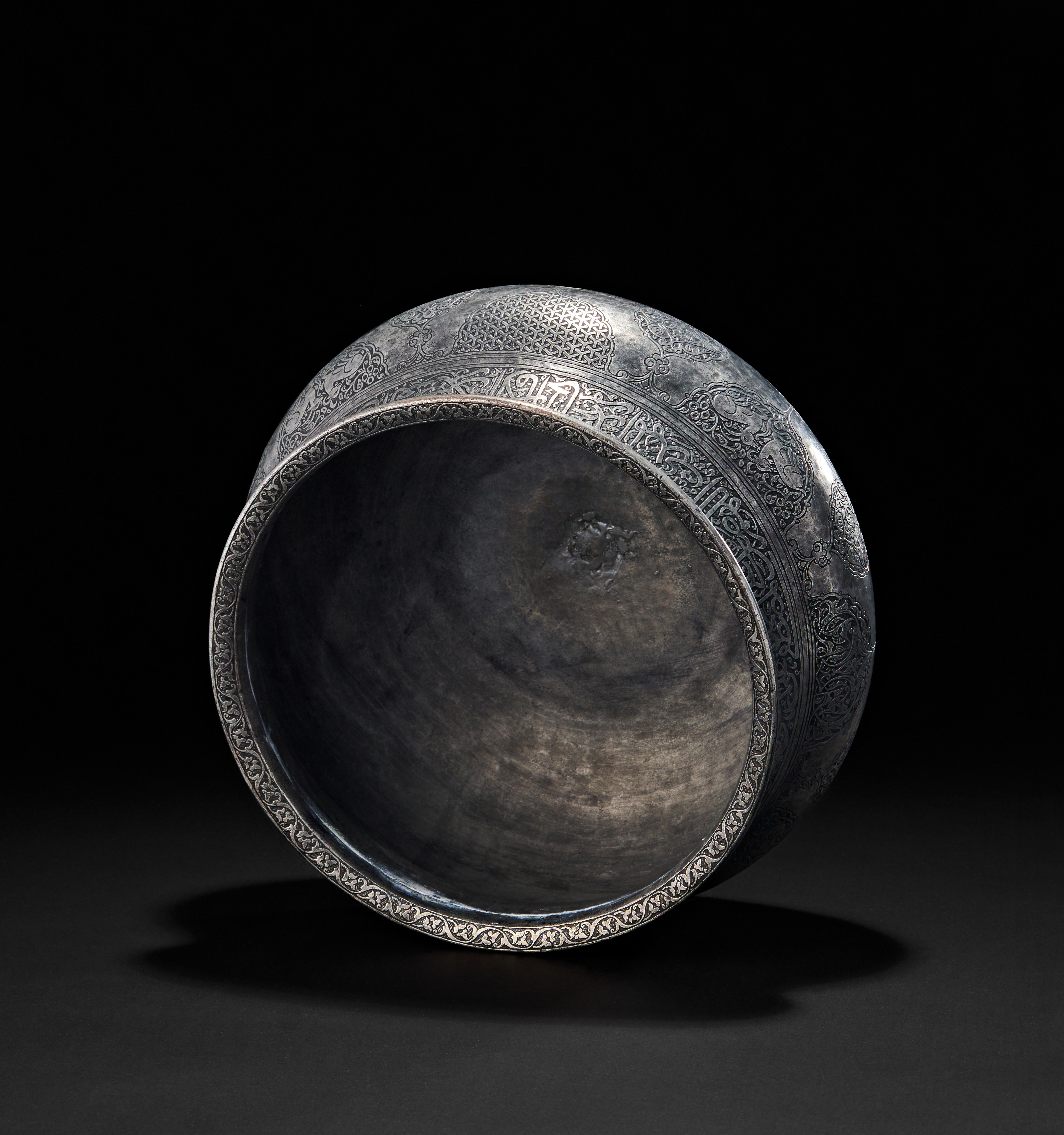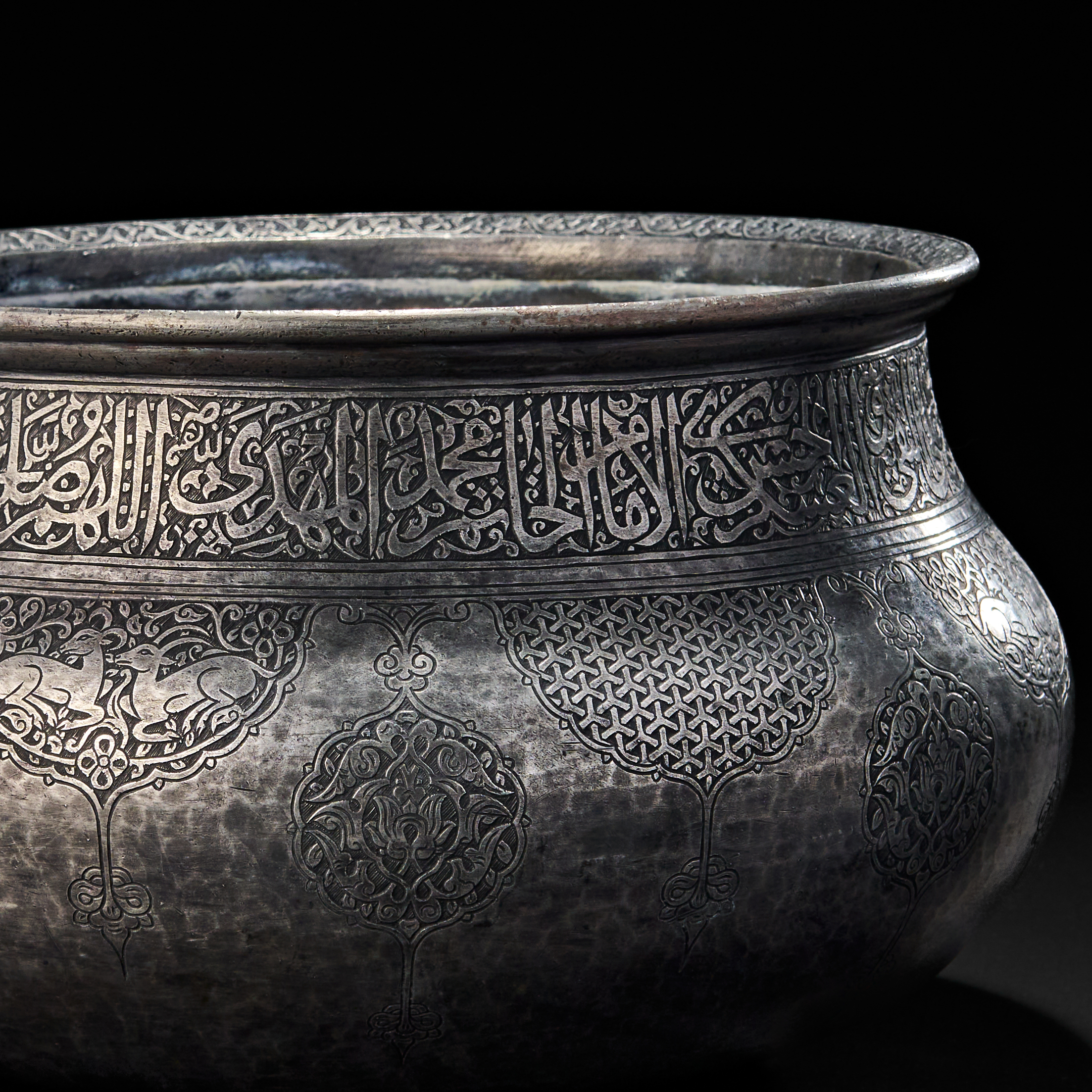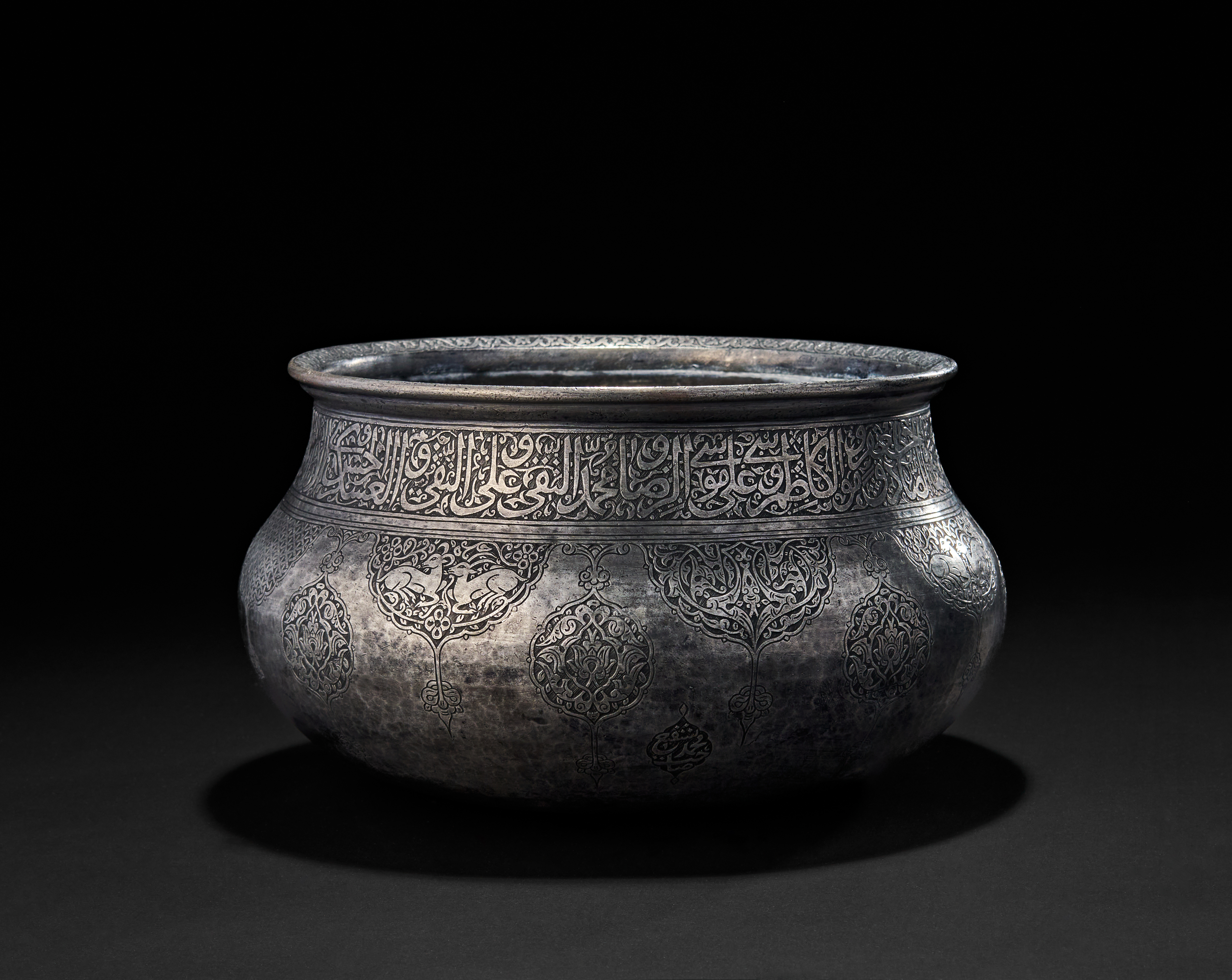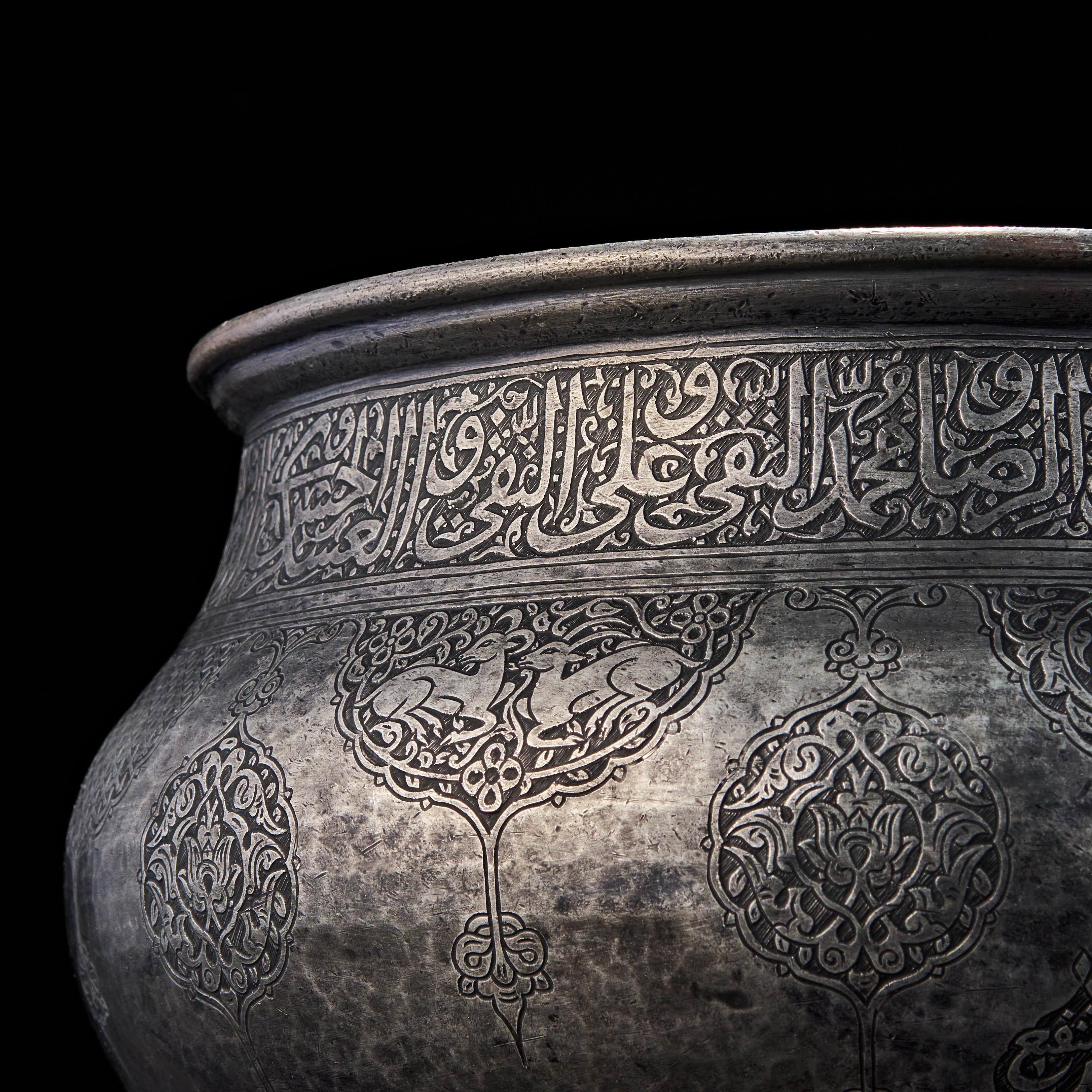 The wide-shouldered form is adorned with a frieze of elegant arabic script encircling the upper body, mostly containing blessings or Qranic verses. Below, alternating lobed medallions and palmette-style cartouches house detailed arabesques, birds, and floral motifs. A signature is prominently engraved within a teardrop-shaped reserve.