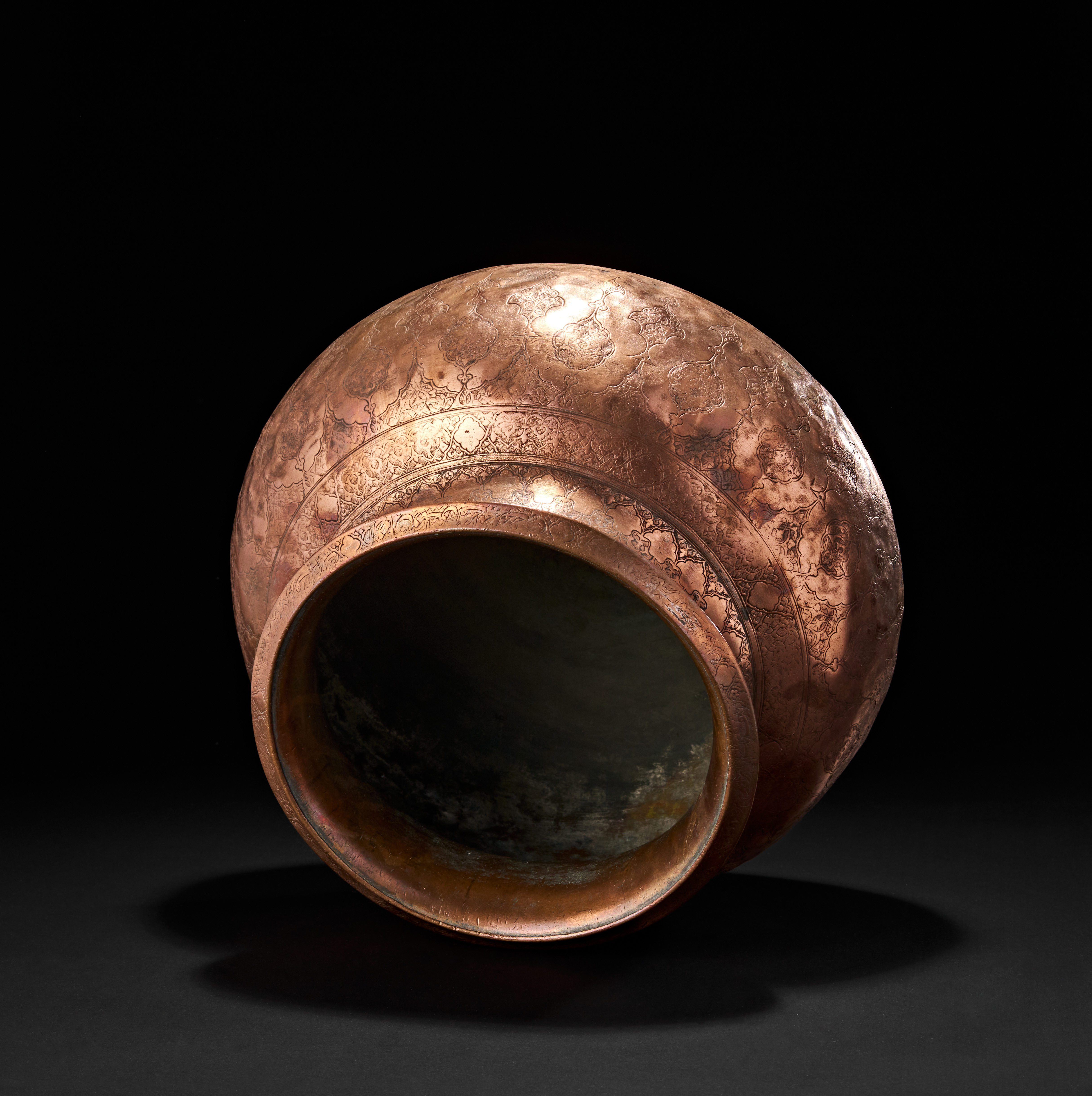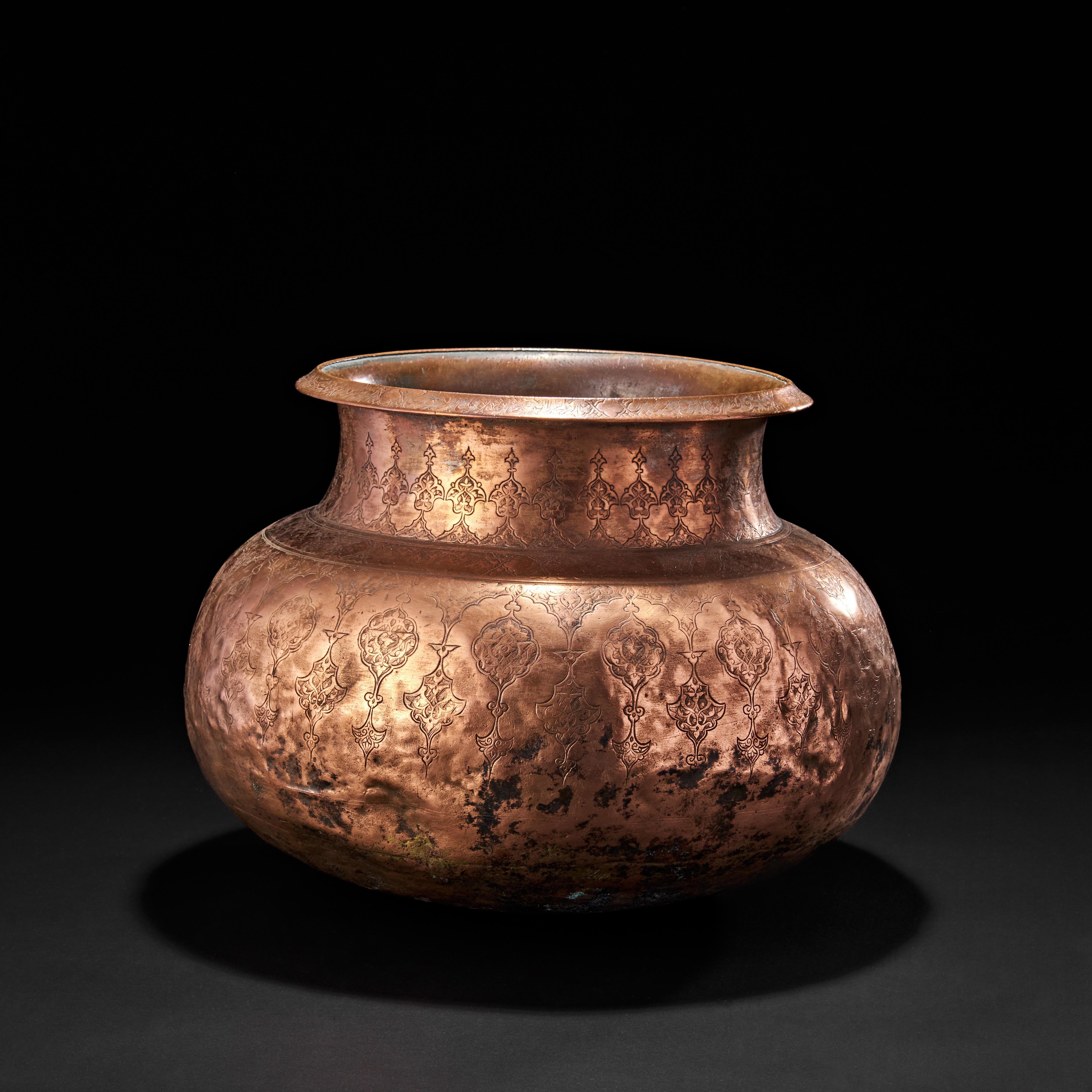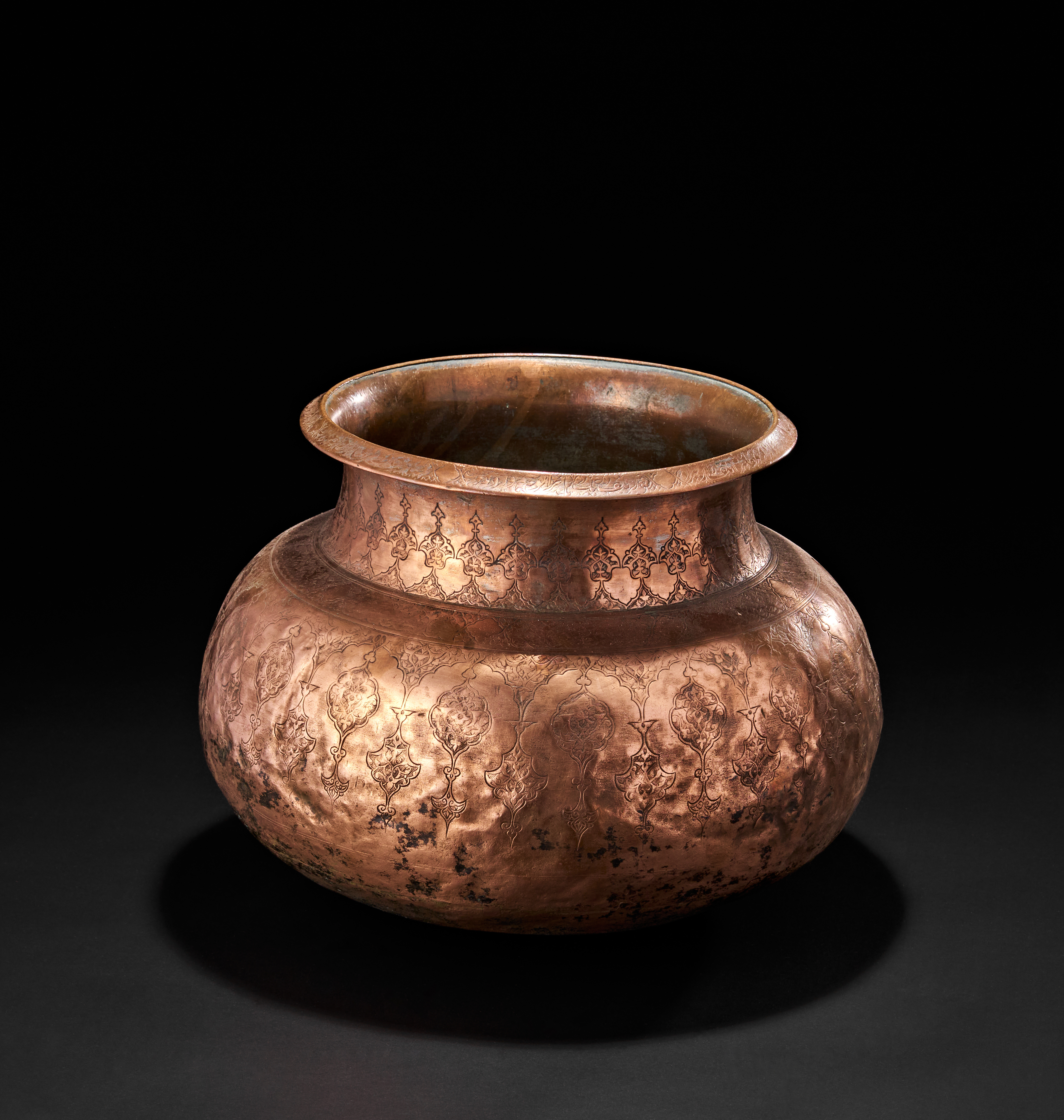 The vessel features a wide flaring rim and globular body, its surface decorated with repeating tear-shaped medallions enclosing intricate arabesque and floral motifs. The upper neck band is similarly adorned with a continuous chain of lozenge-shaped cartouches, each finely worked in shallow relief with geometric tracery.