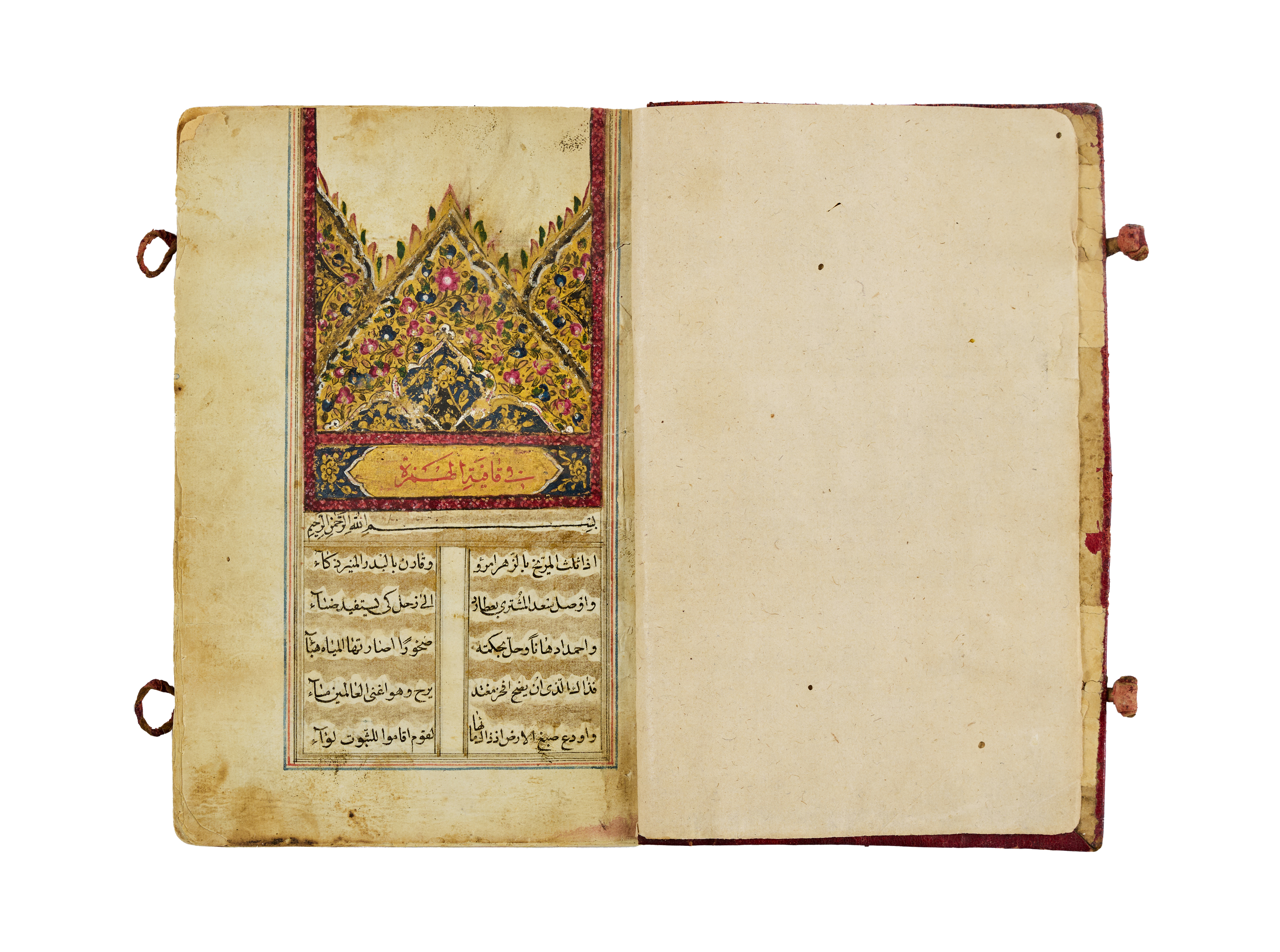 The manuscript opens with a spectacular illuminated headpiece featuring floral and geometric motifs in vibrant blue, red, green, and gold, framed by a decorated border. The poetic verses, written in a flowing naskh or nastaʿlīq script.