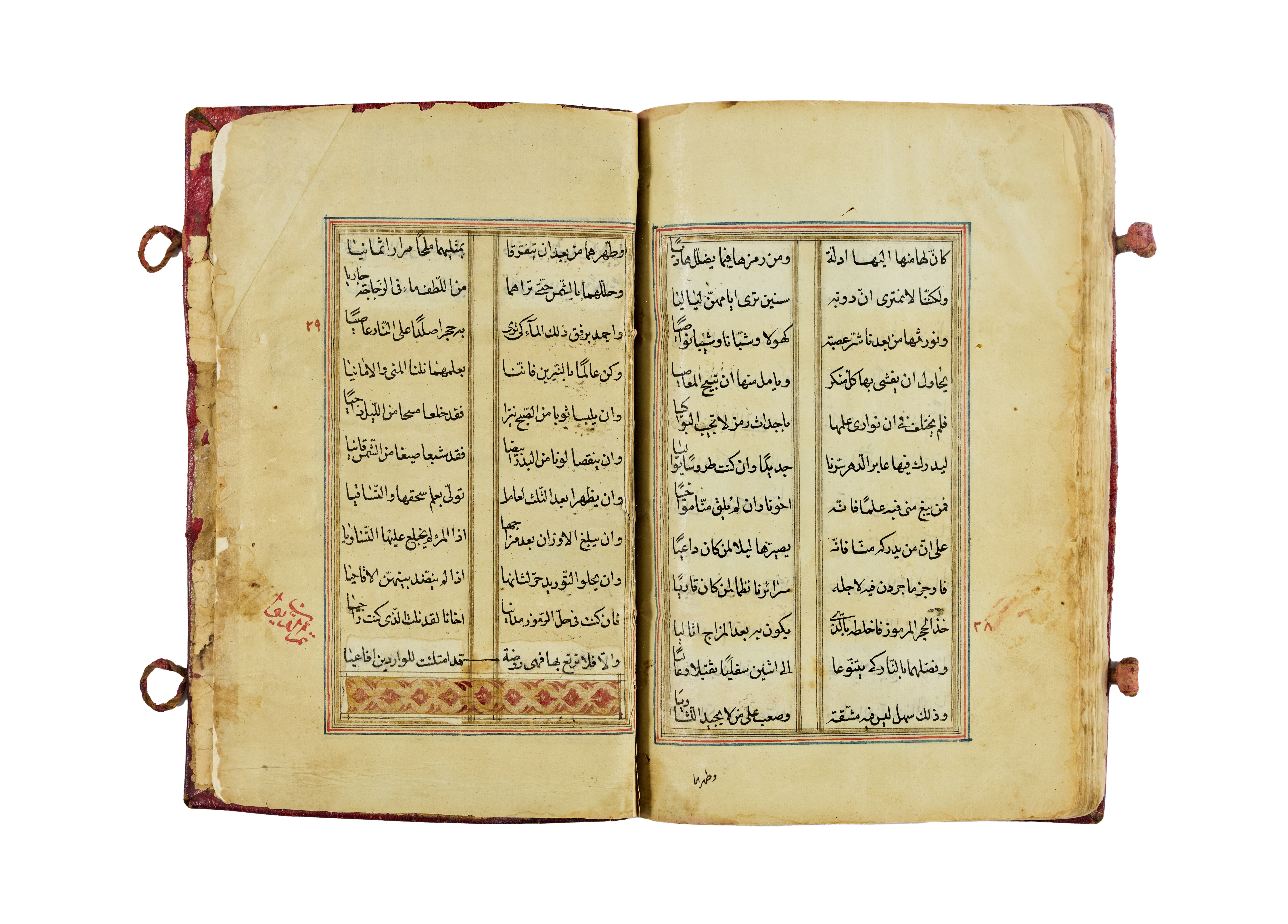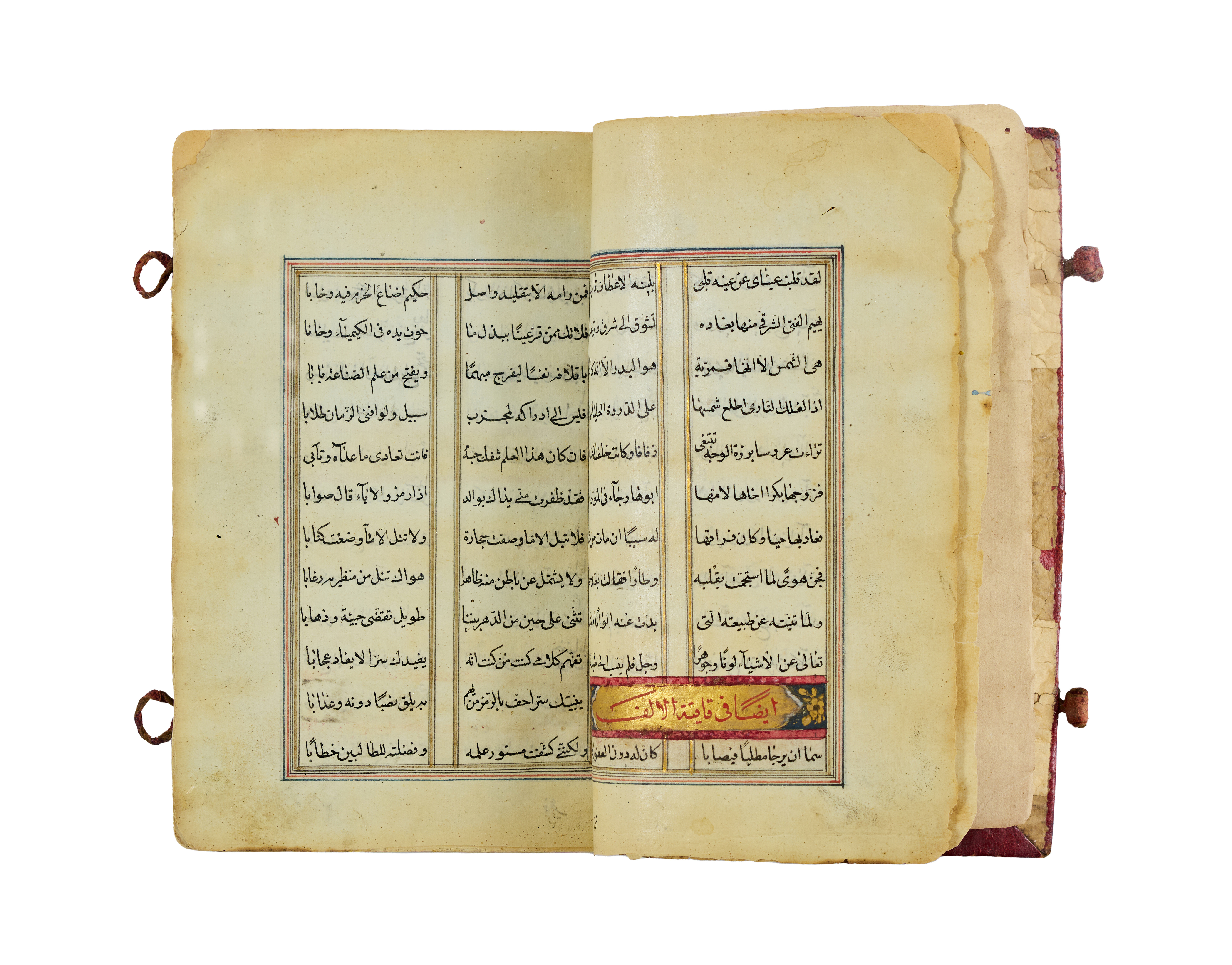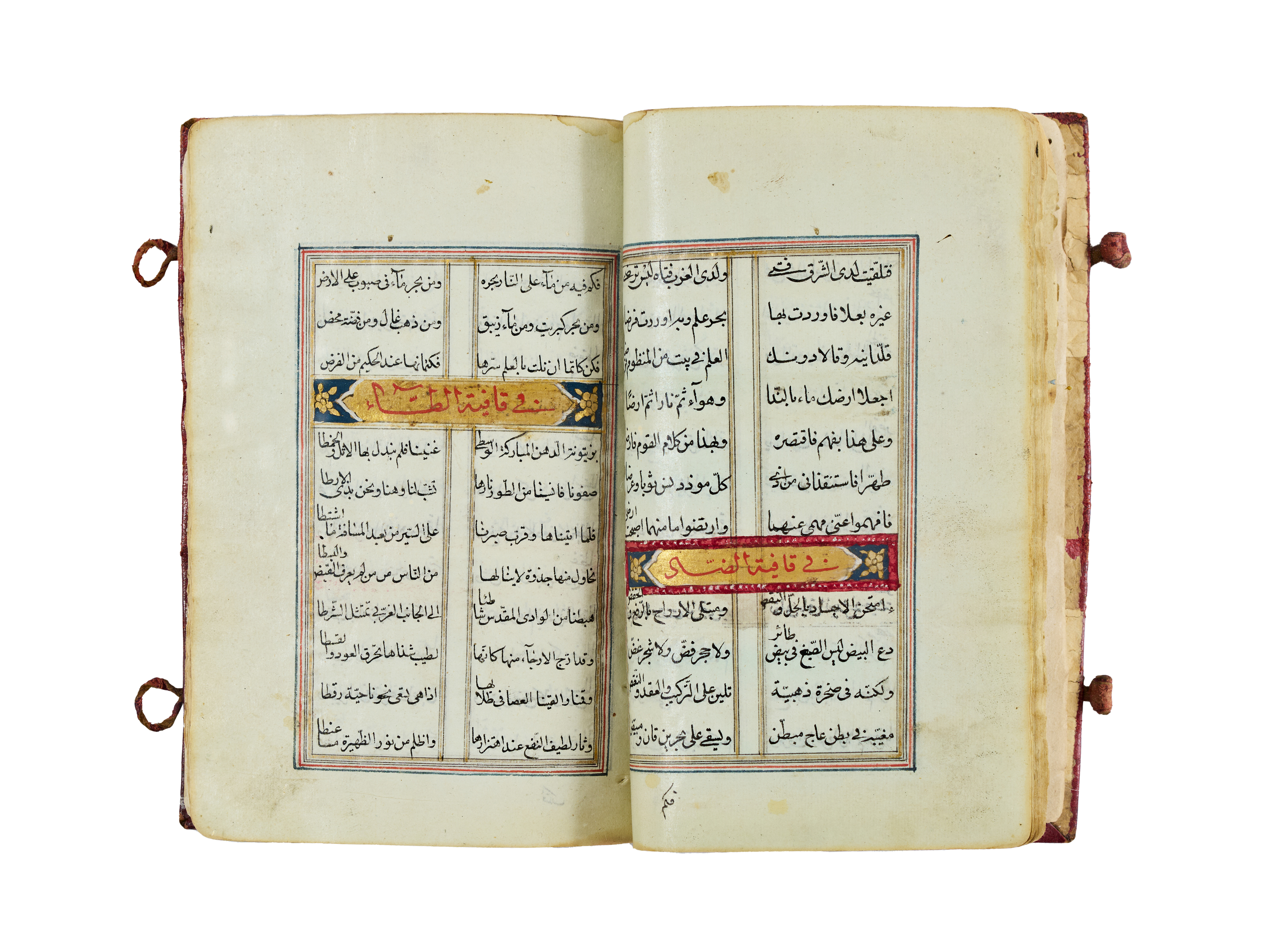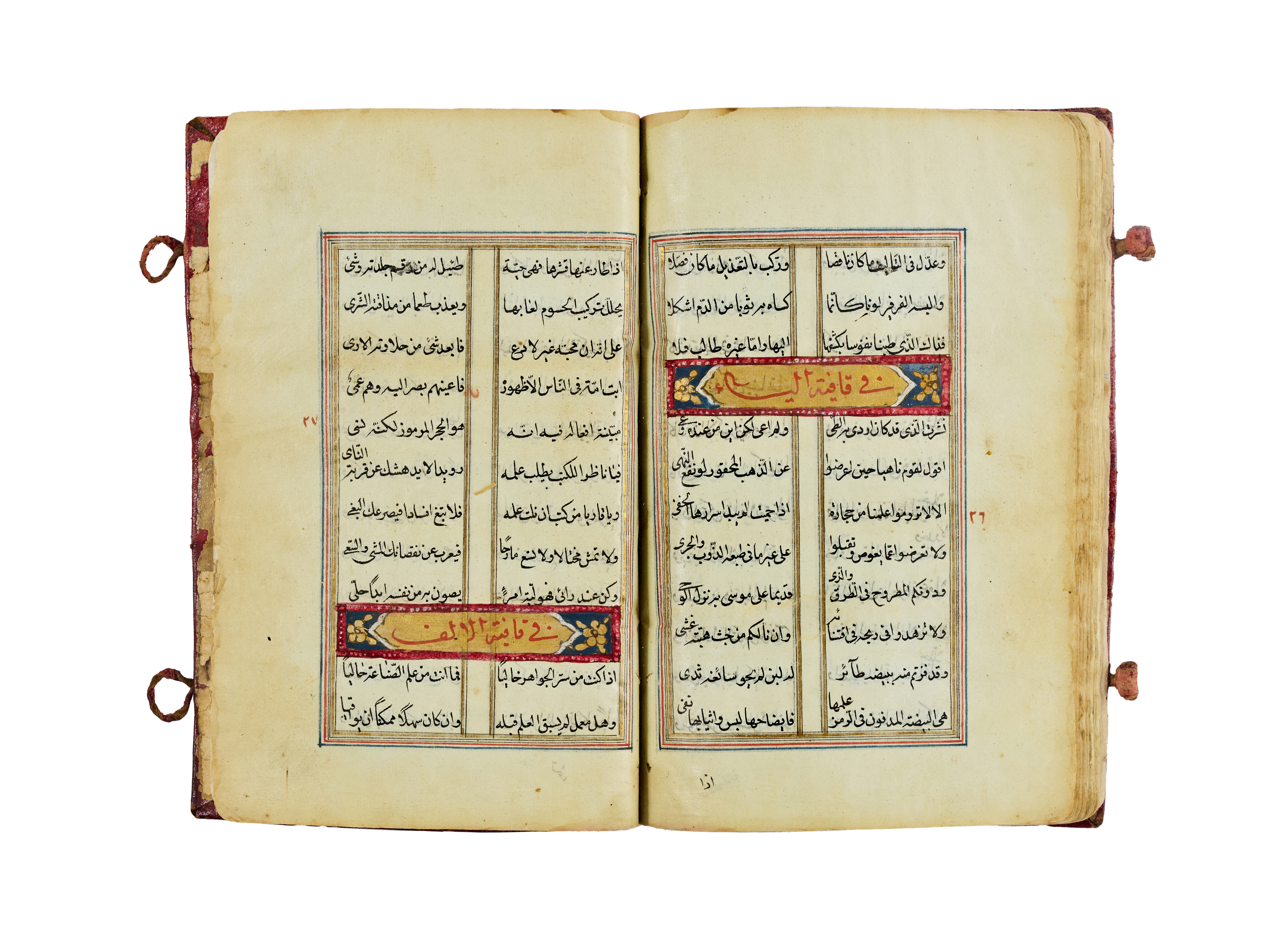 An illuminated Arabic manuscript of Ashar al-Kawakib (“Poems of the Stars”), dating to the 16th–17th century. This fine collection of Arabic poetry is presented in two-column format, elegantly penned in black ink with rubrication in red, and highlighted with gold and polychrome ornamentation.