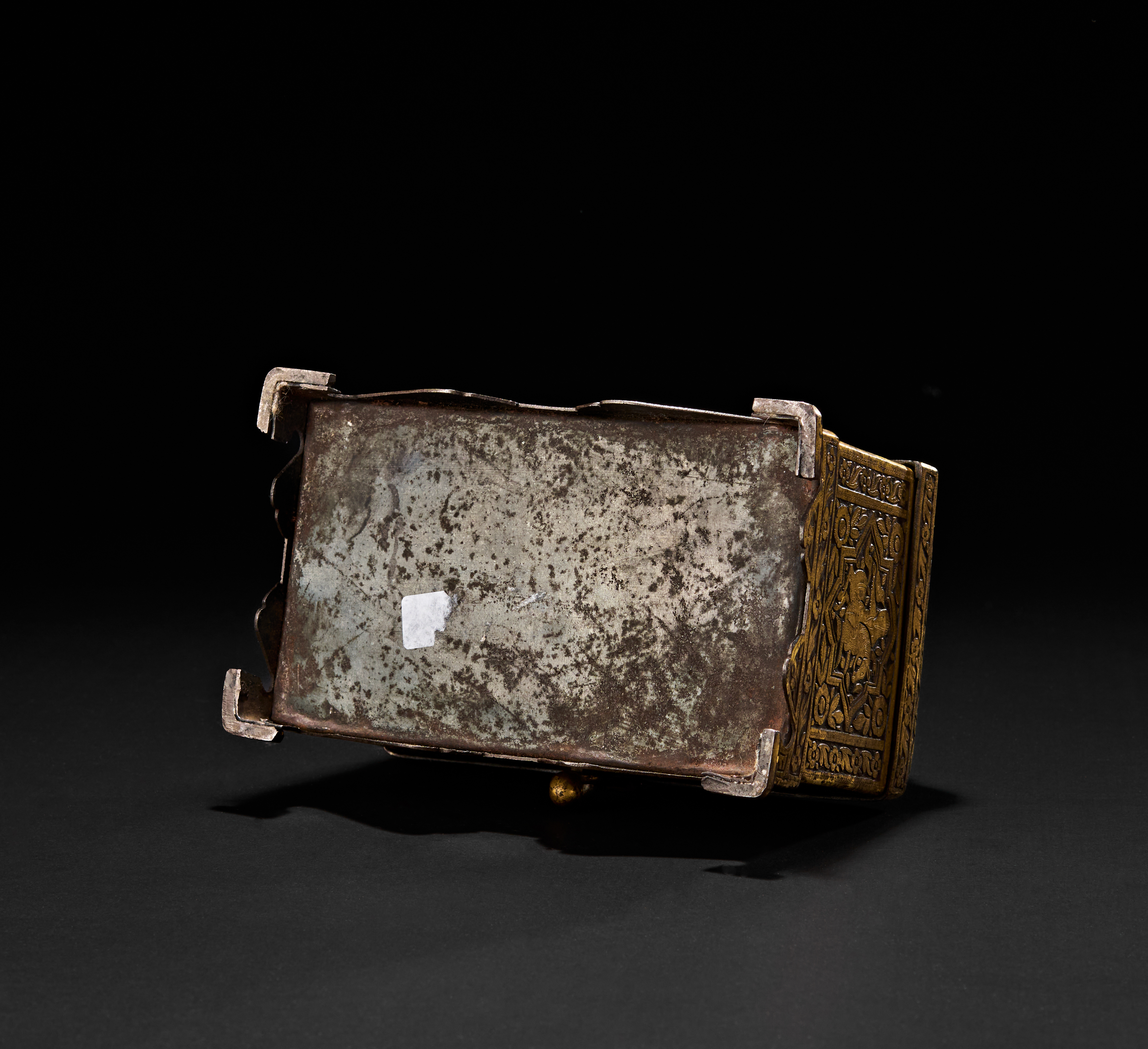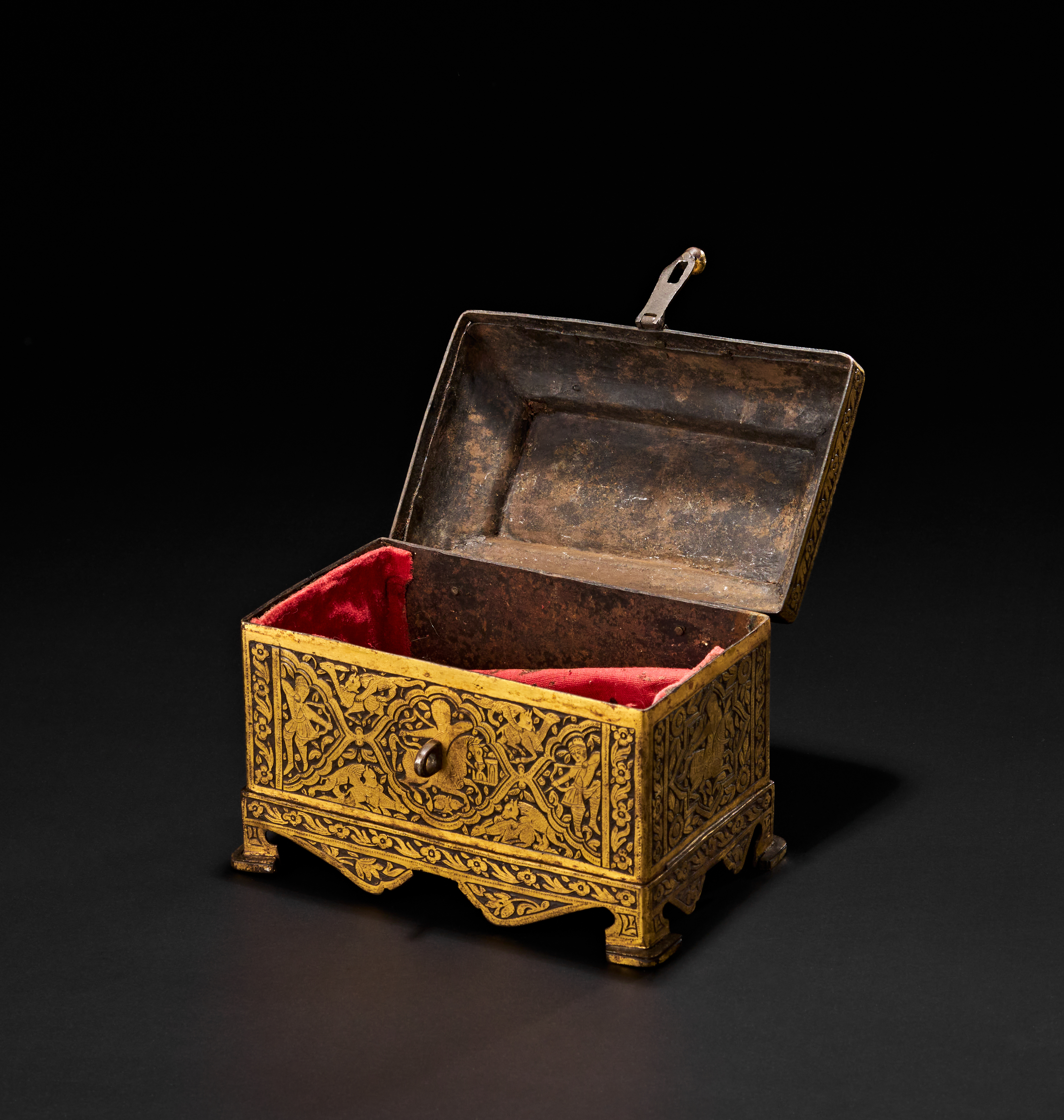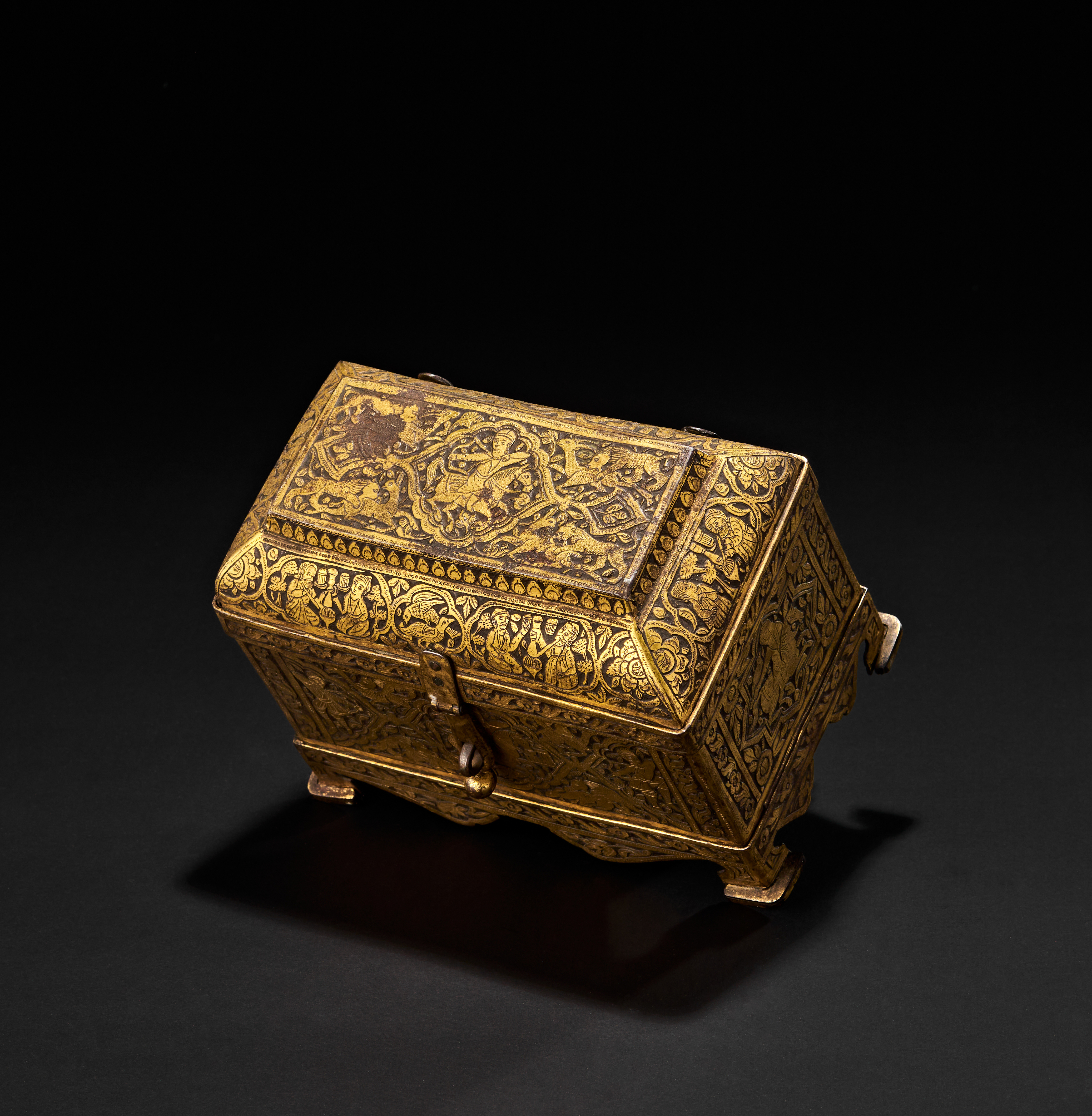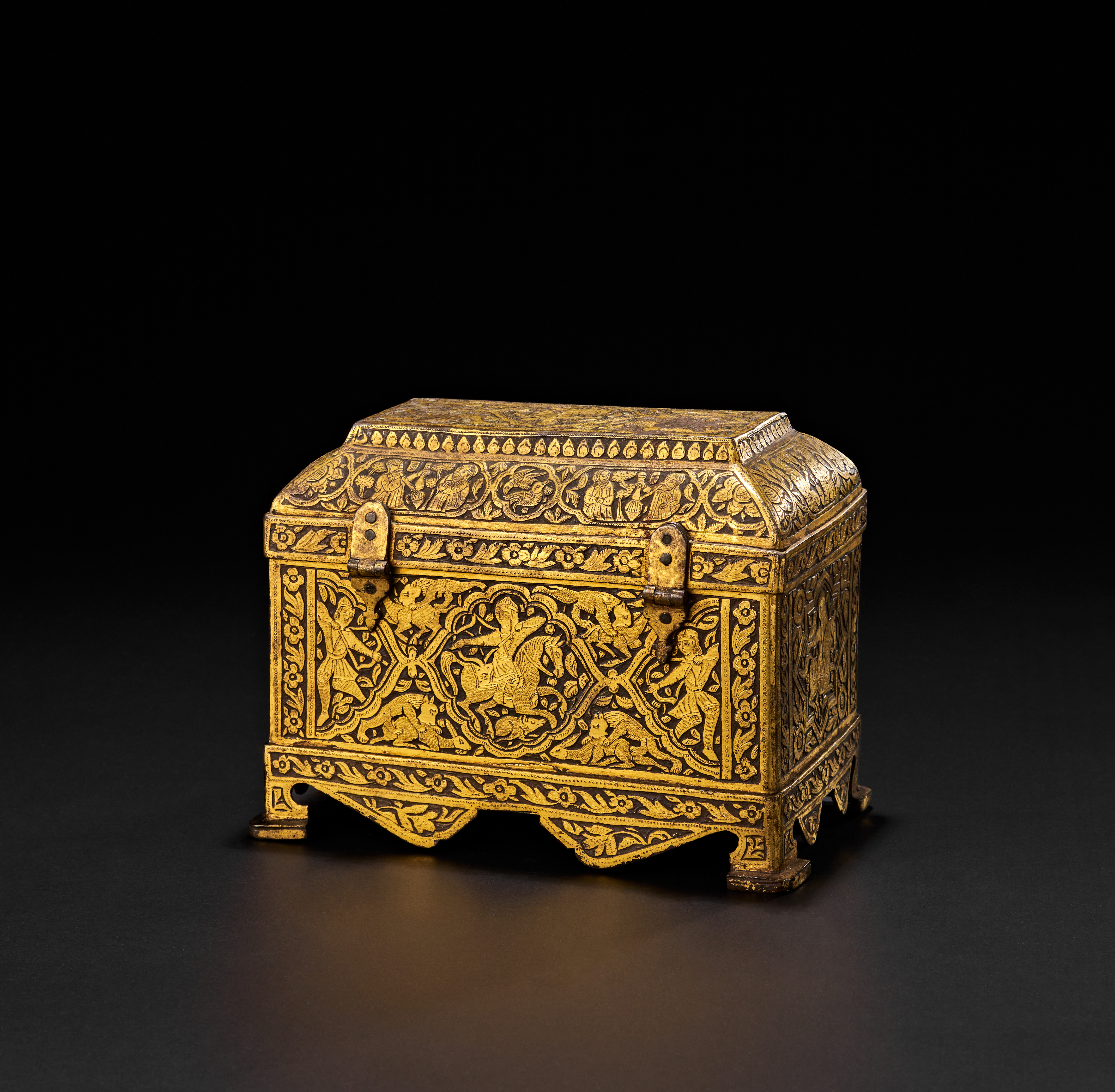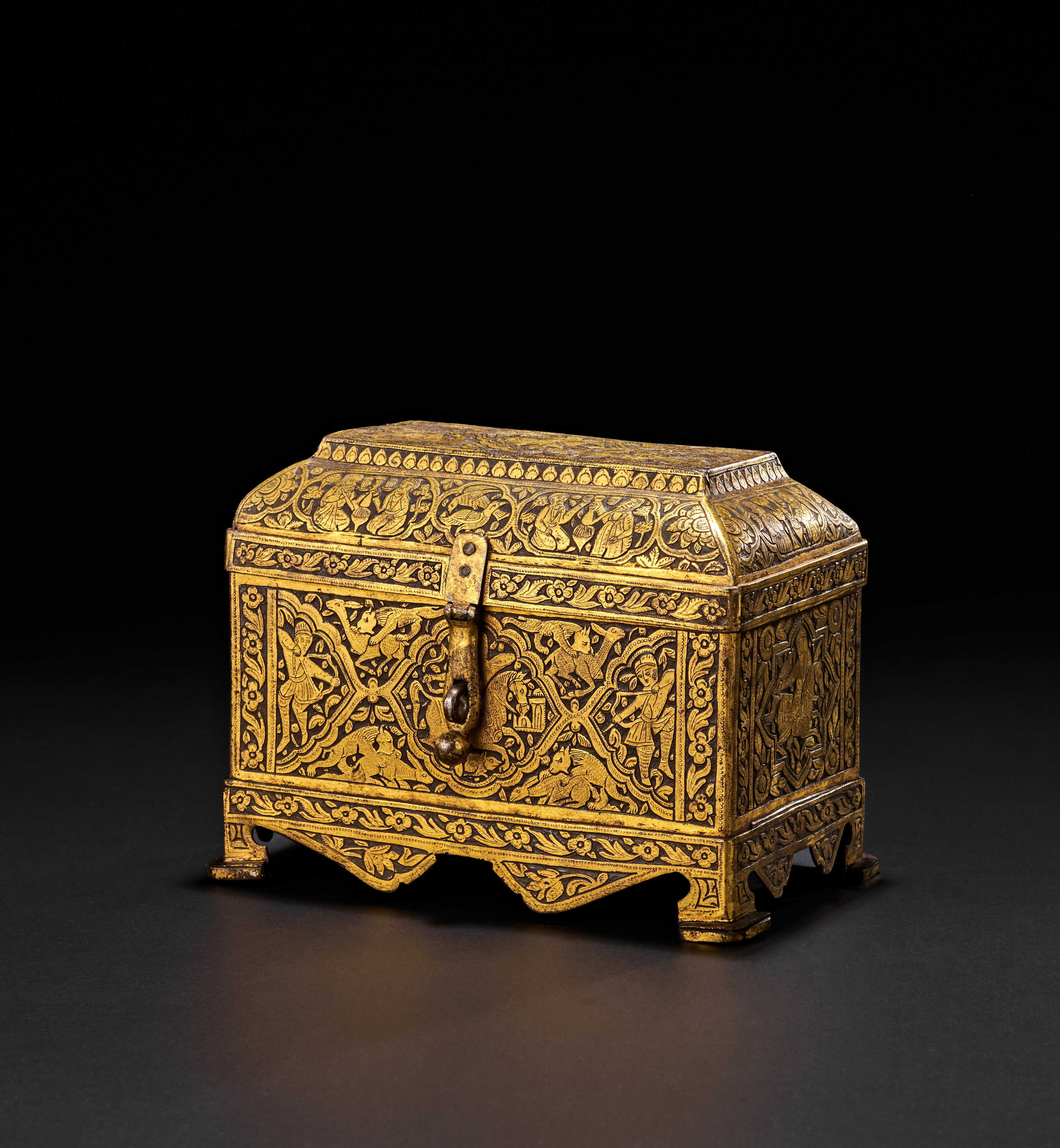 Decorated with intricate overlaid gold designs featuring human figures, animals, and floral motifs, with domed lid and flaring footed base.