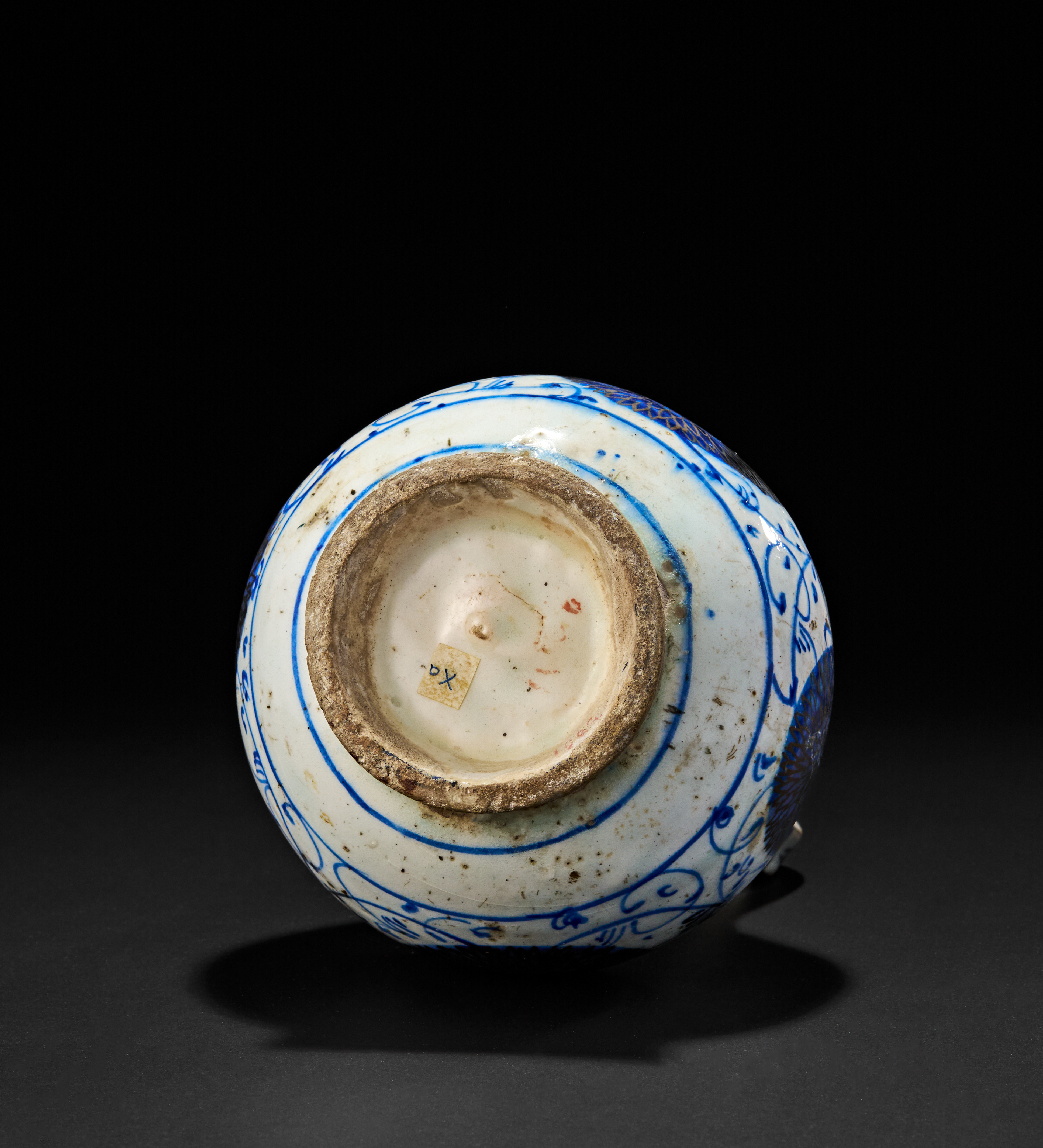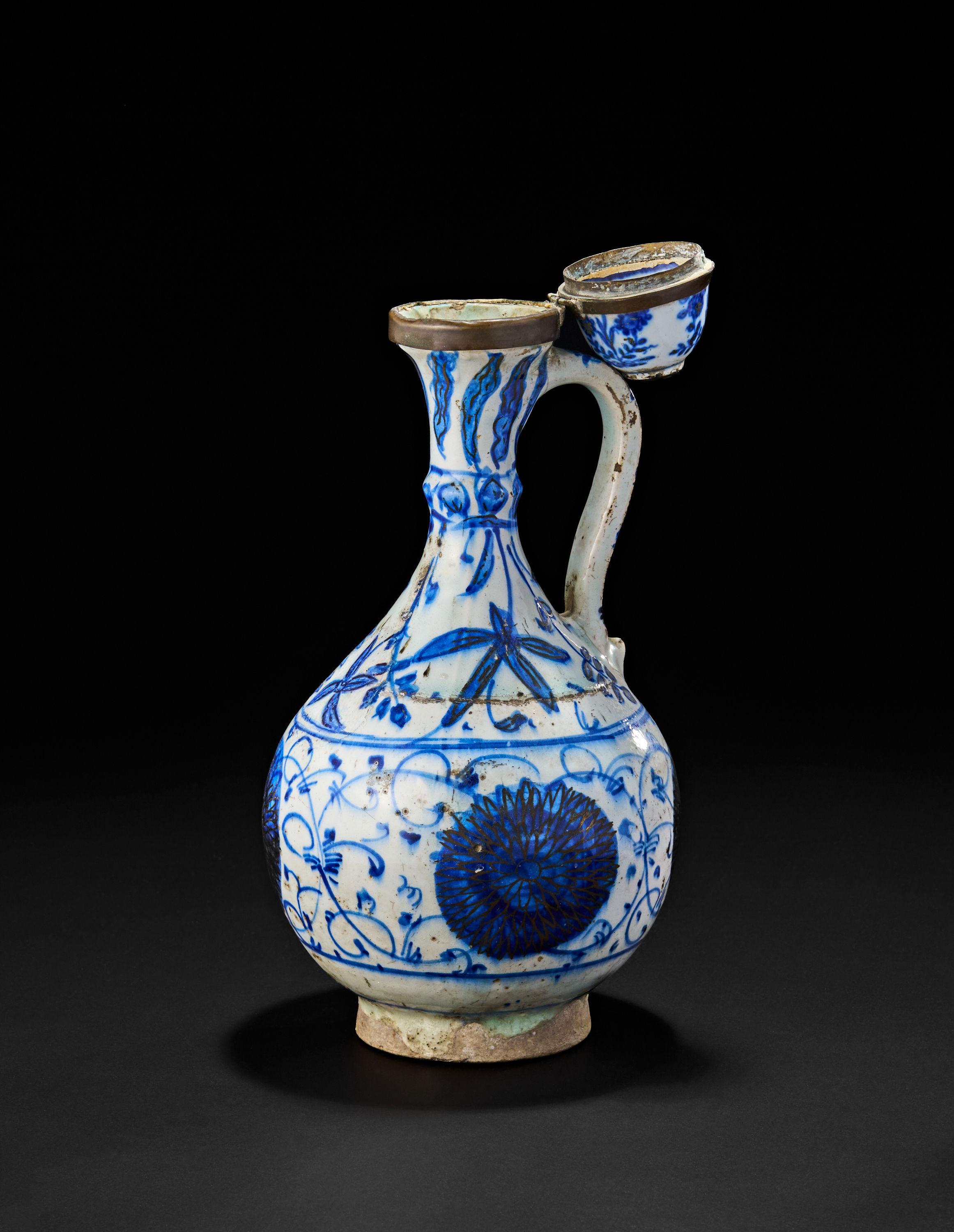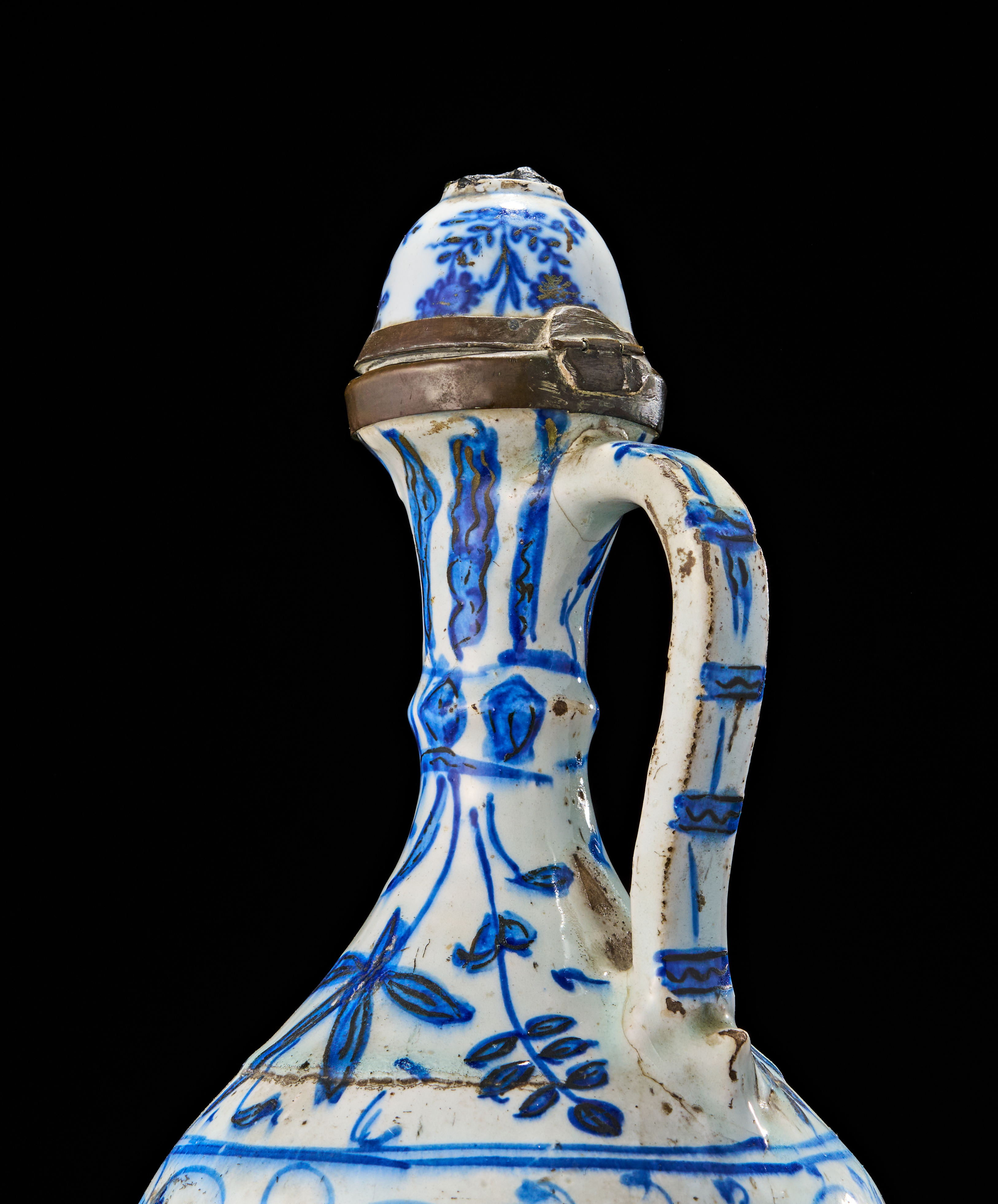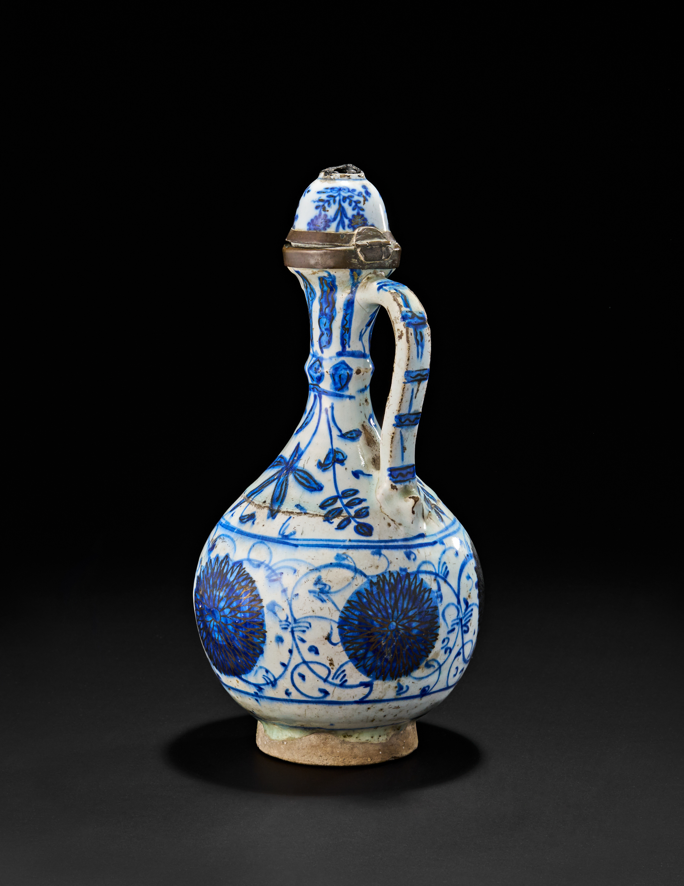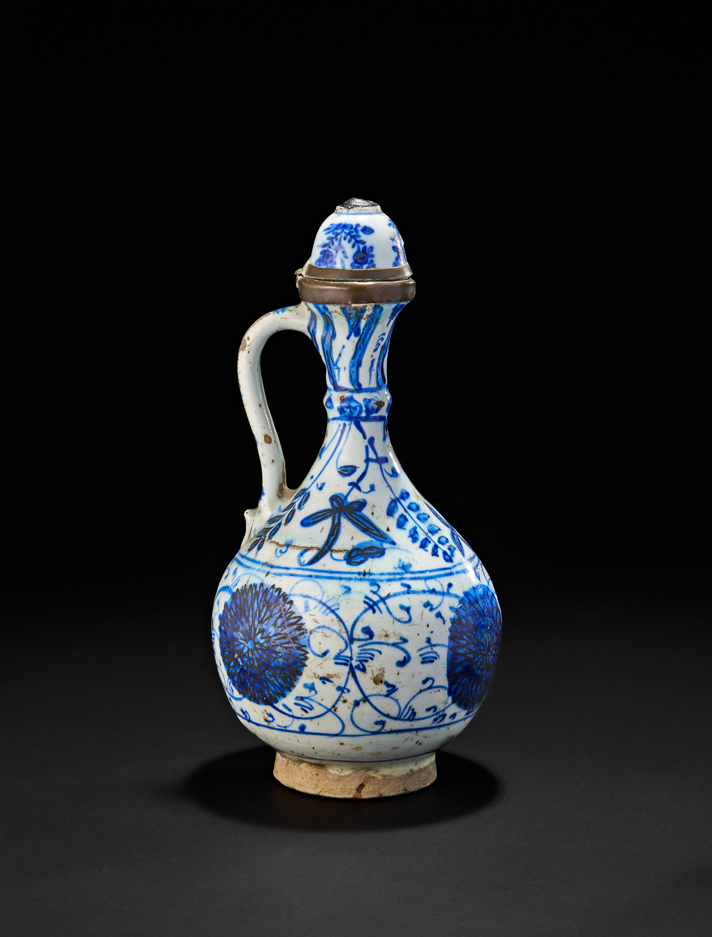 The elegant bulbous body is adorned with large chrysanthemum-like flowers, scrolling vines, and delicate leaves, while the slender neck is decorated with vertical leafy patterns, with a later-added domed Chinese porcelain lid, likely from the Qing dynasty, secured by a metal mount.