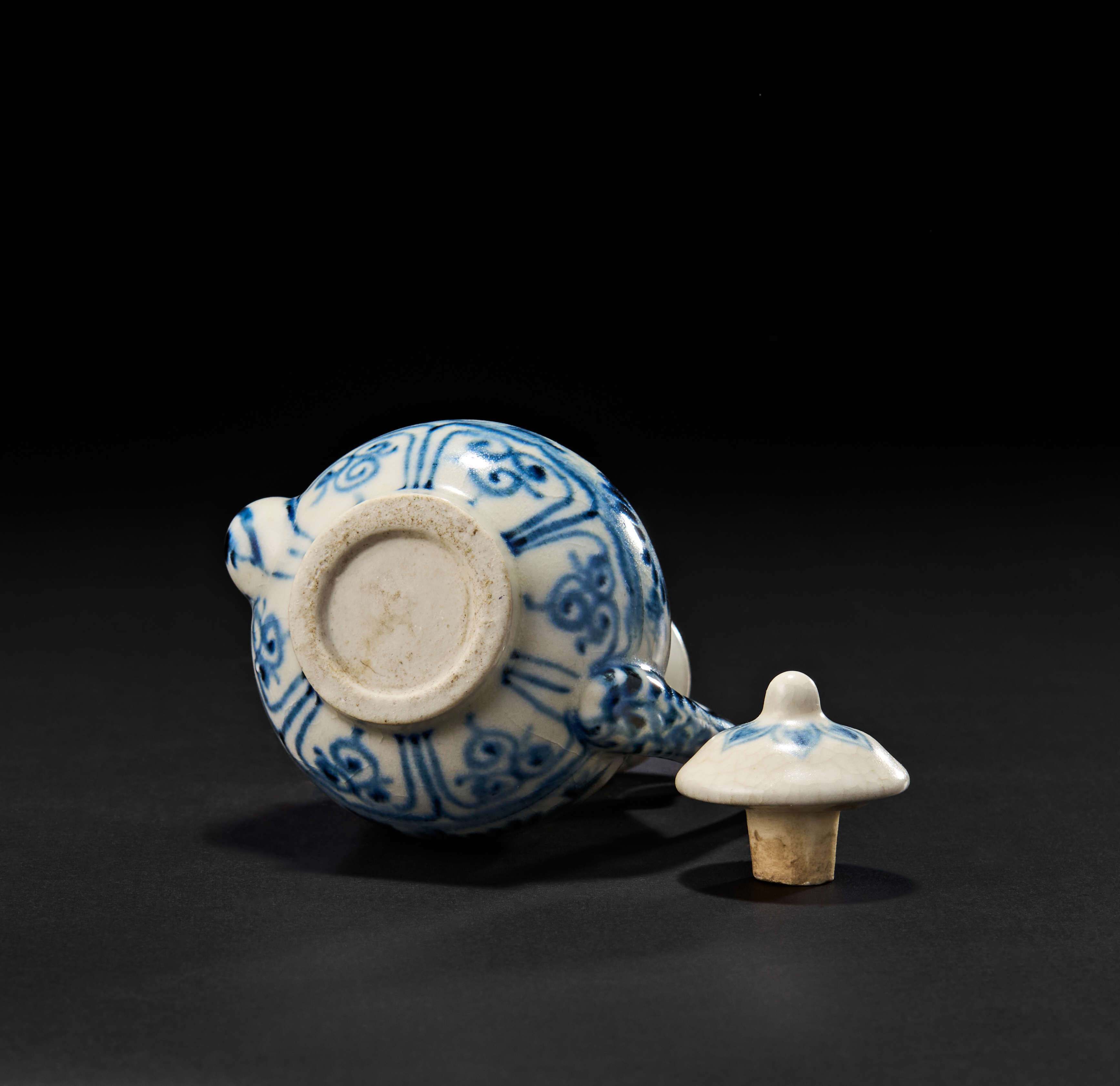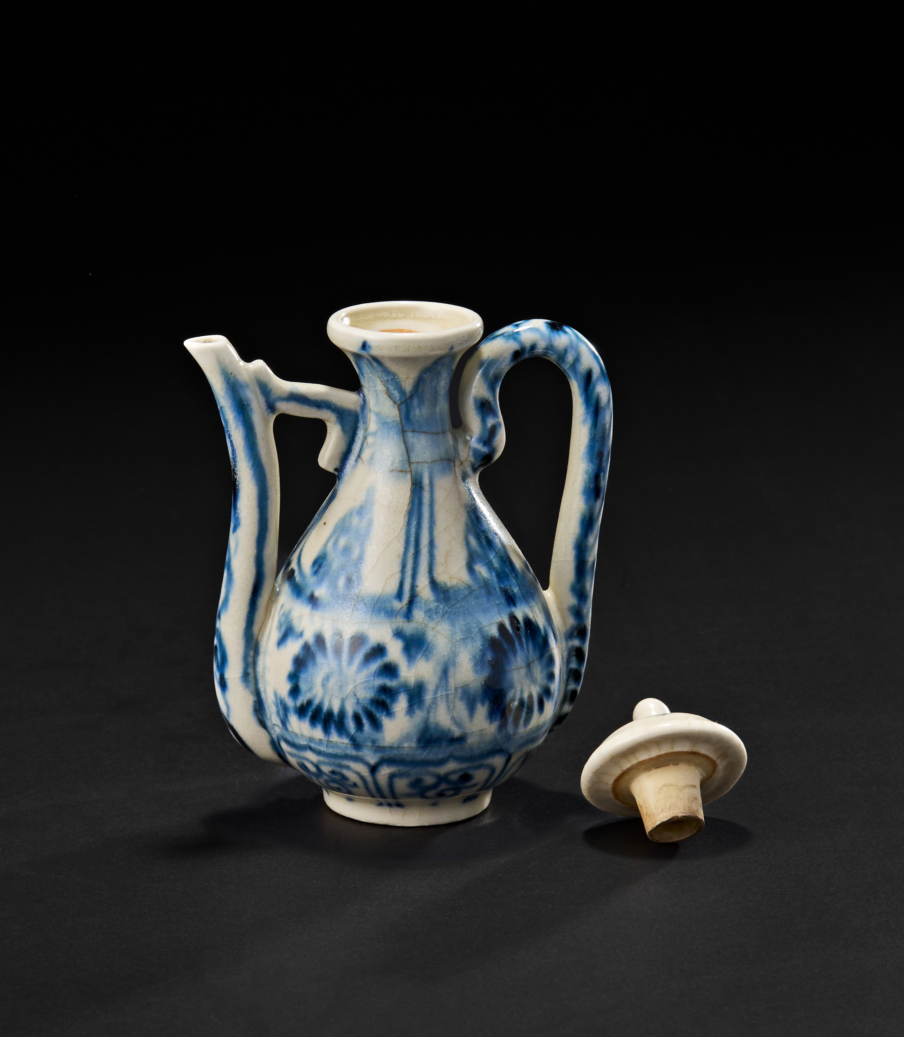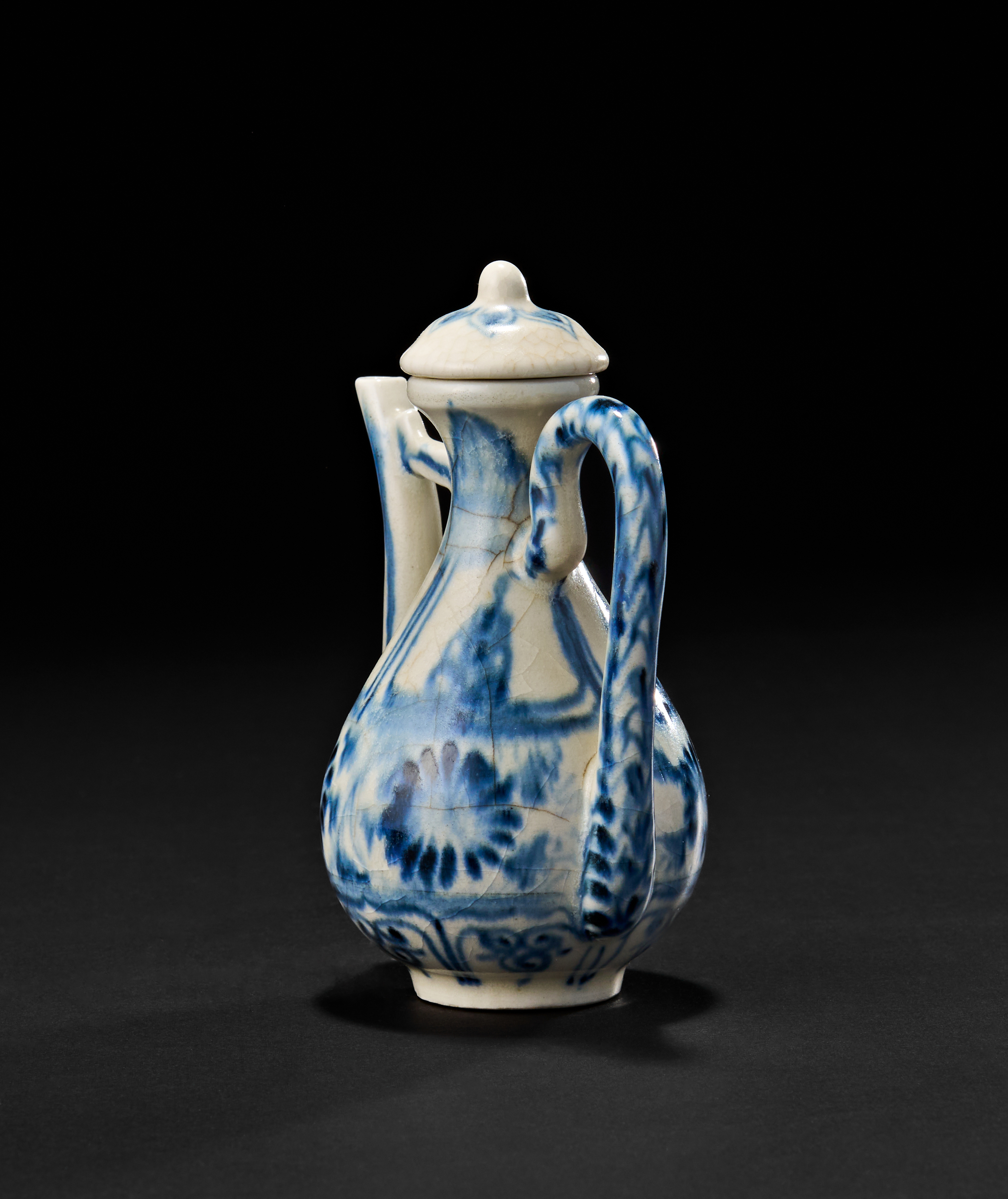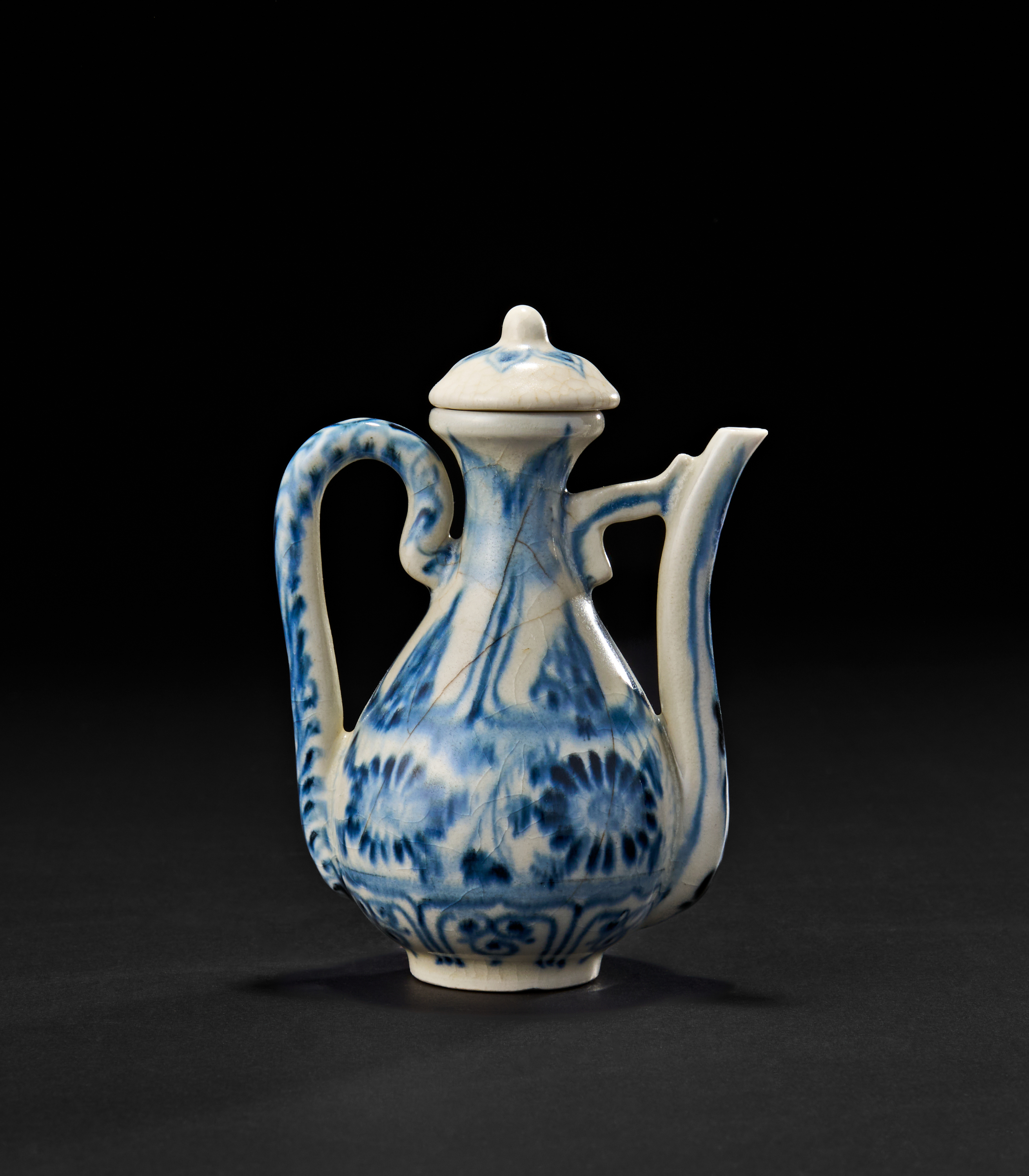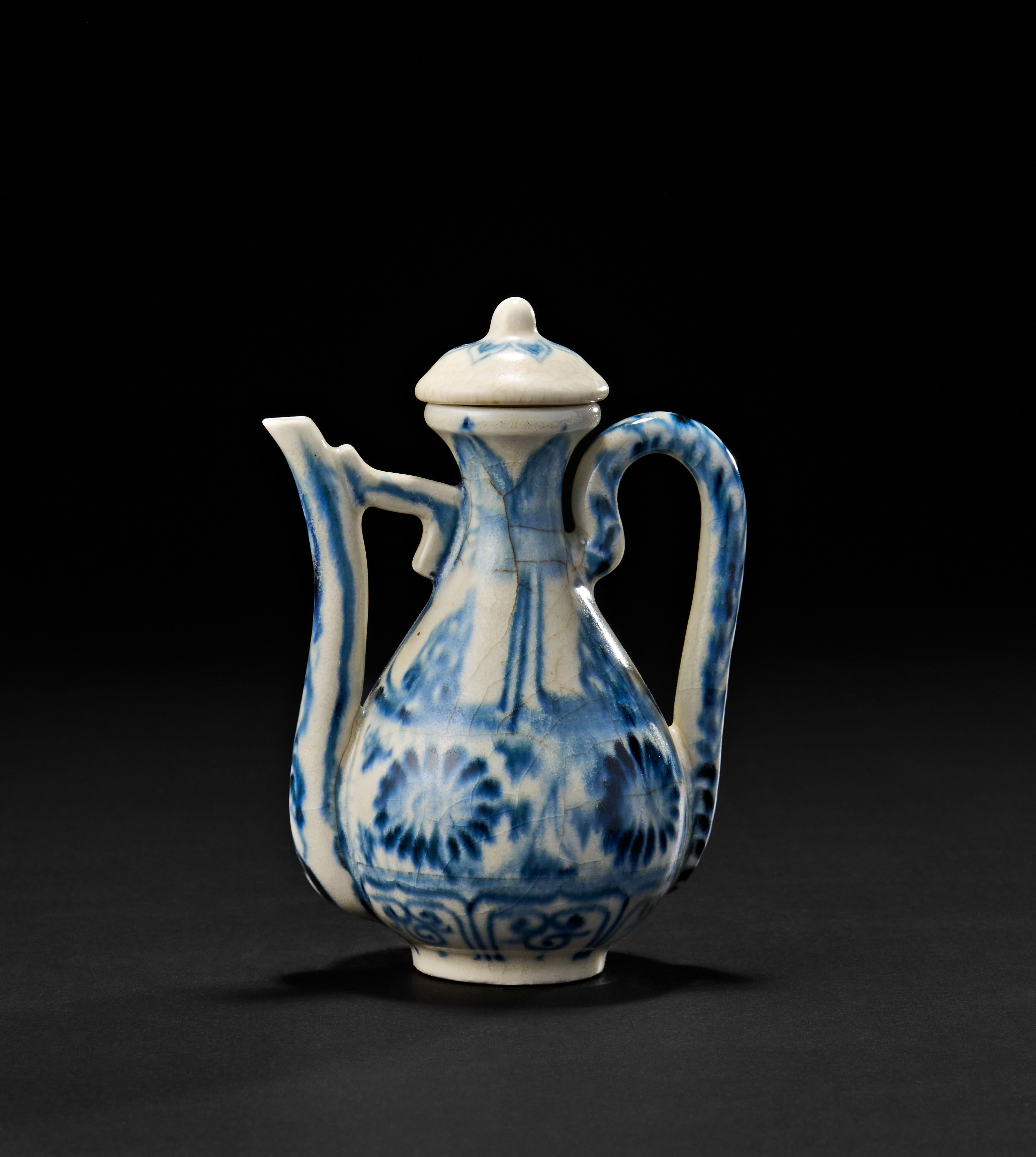 Featuring a bulbous body with a slender neck and a delicately curved handle, the vessel is topped with a domed lid and cork stopper. The ewer is richly decorated in underglaze cobalt blue with floral rosettes and vertical panels. The spout is angled, while the foot is neatly finished with an unglazed base ring.