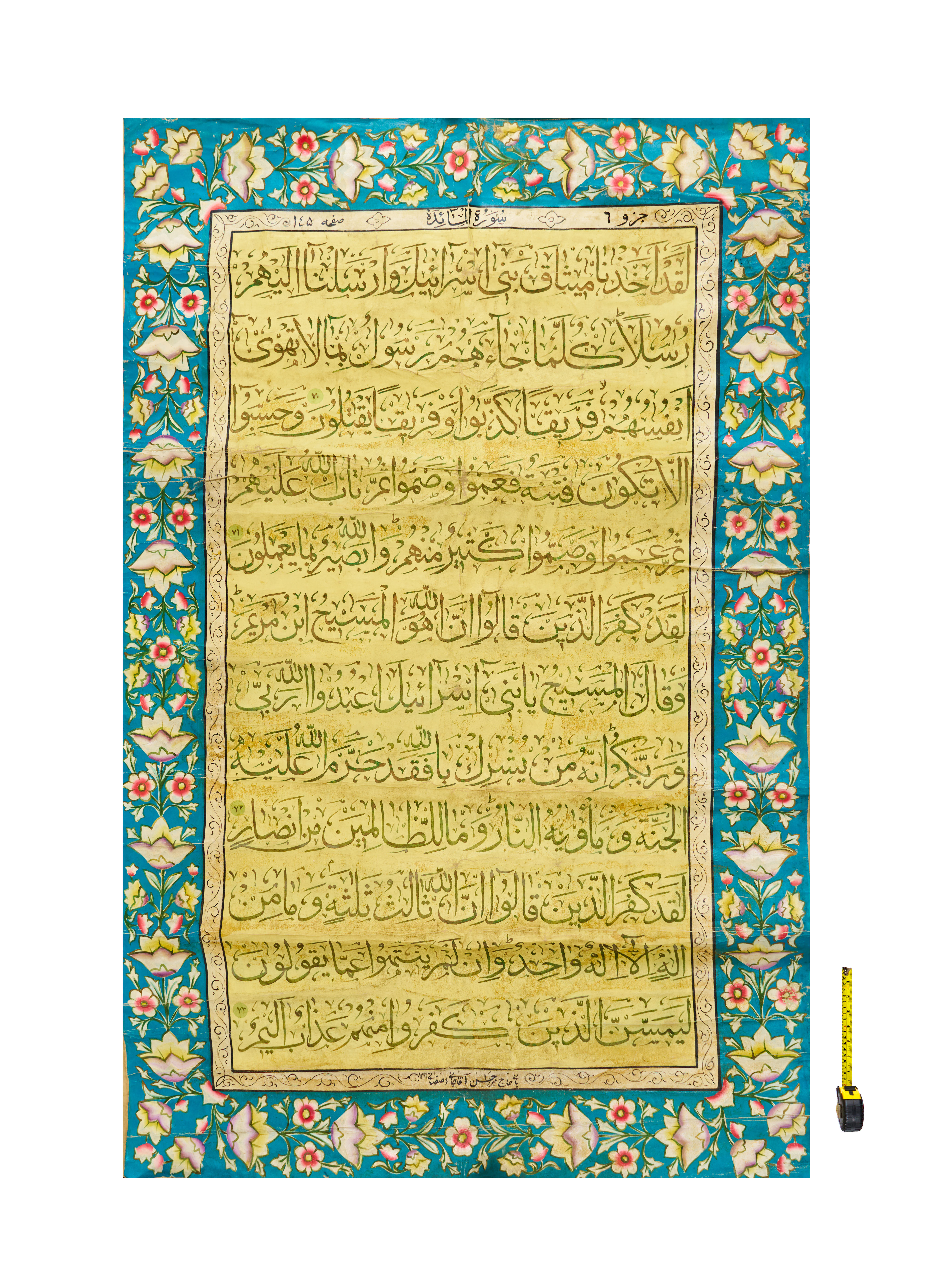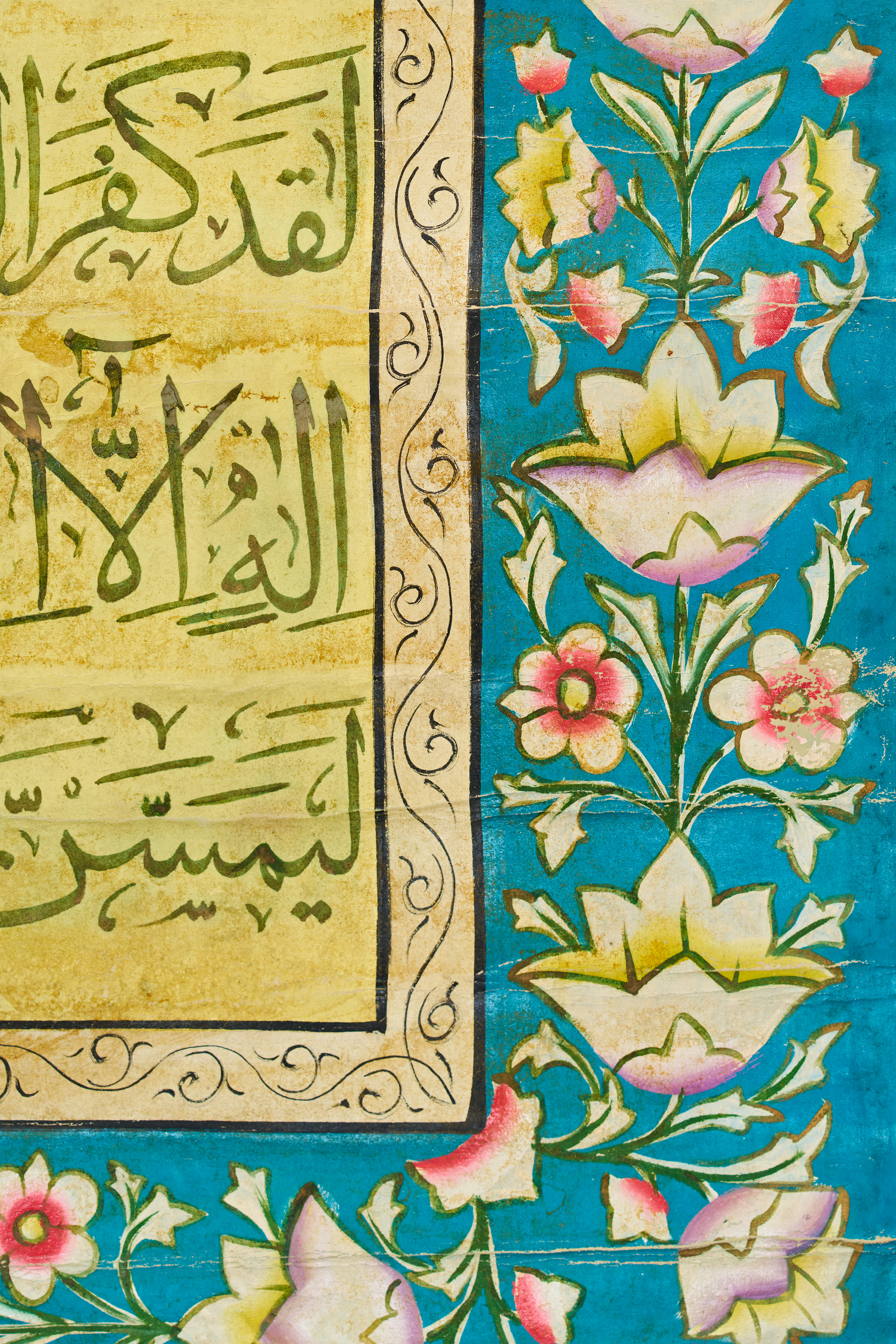 Richly illuminated with floral borders and bold script, commissioned by Haj Hassan Agha Khan.
