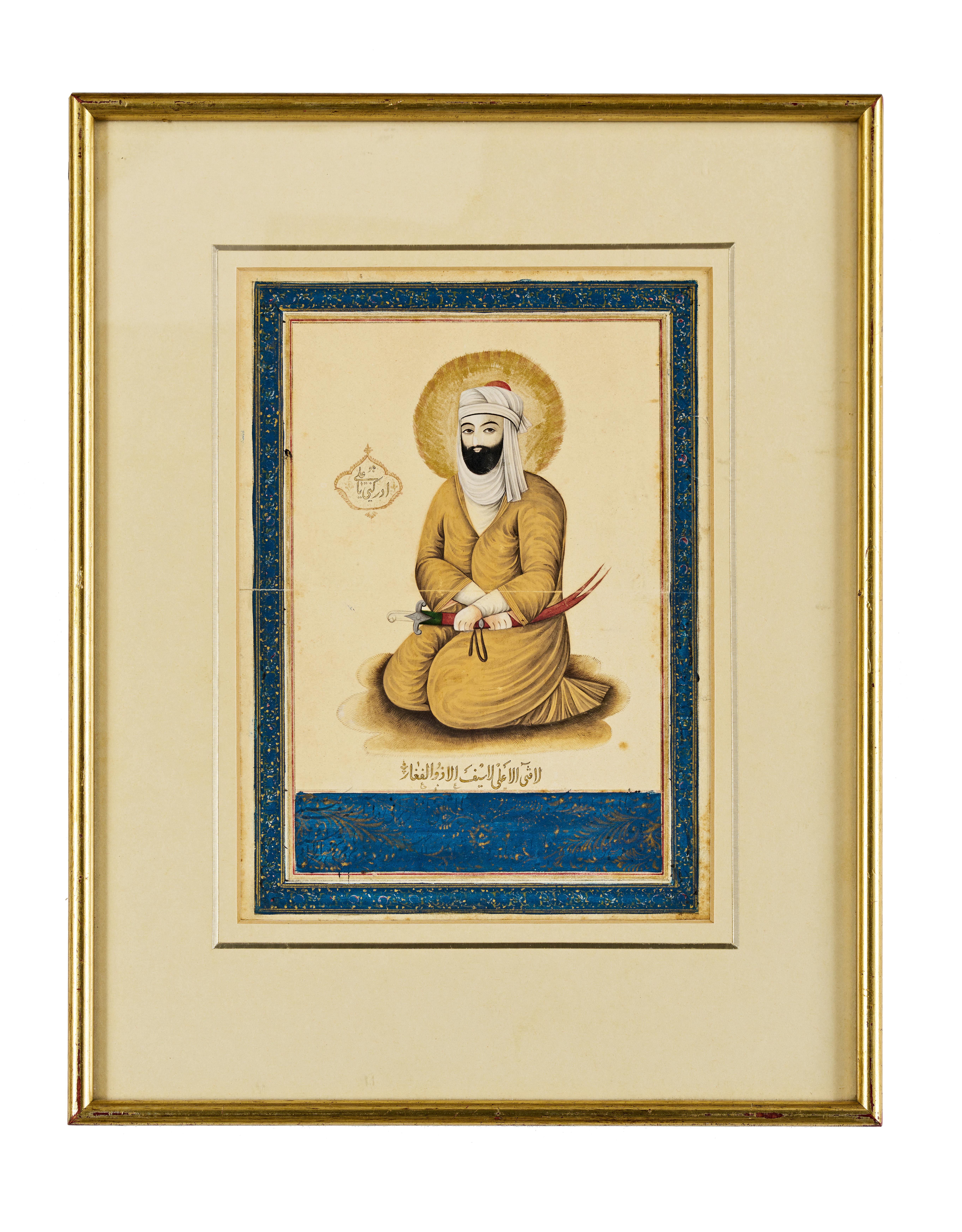 Rendered in gouache and gold, depicting the figure seated with halo and sword, set within a rich blue and gold illuminated border.