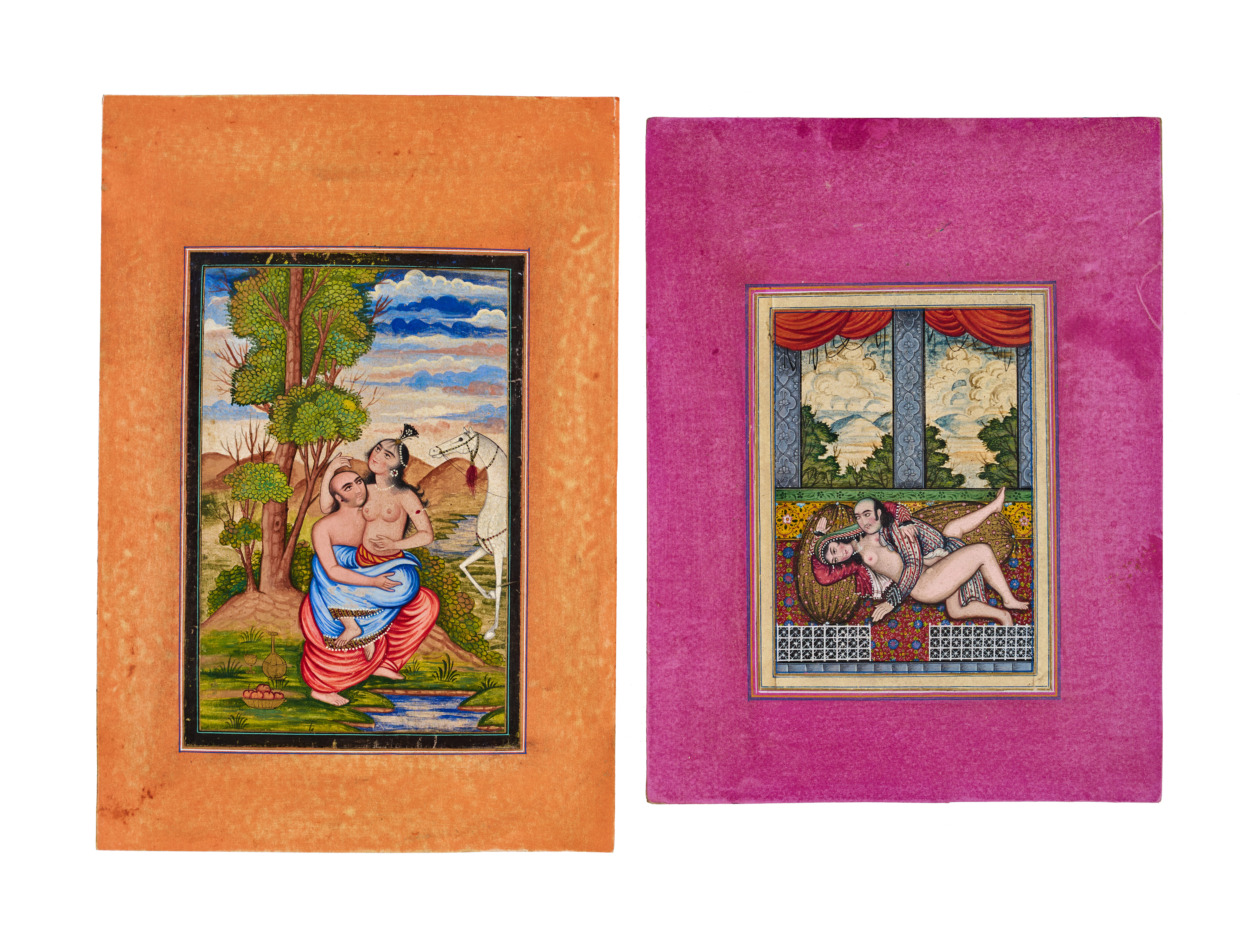 A detailed scenes of romantic intimacy set in lush outdoor and opulent interior settings, painted in rich gouache on card with vibrant borders.