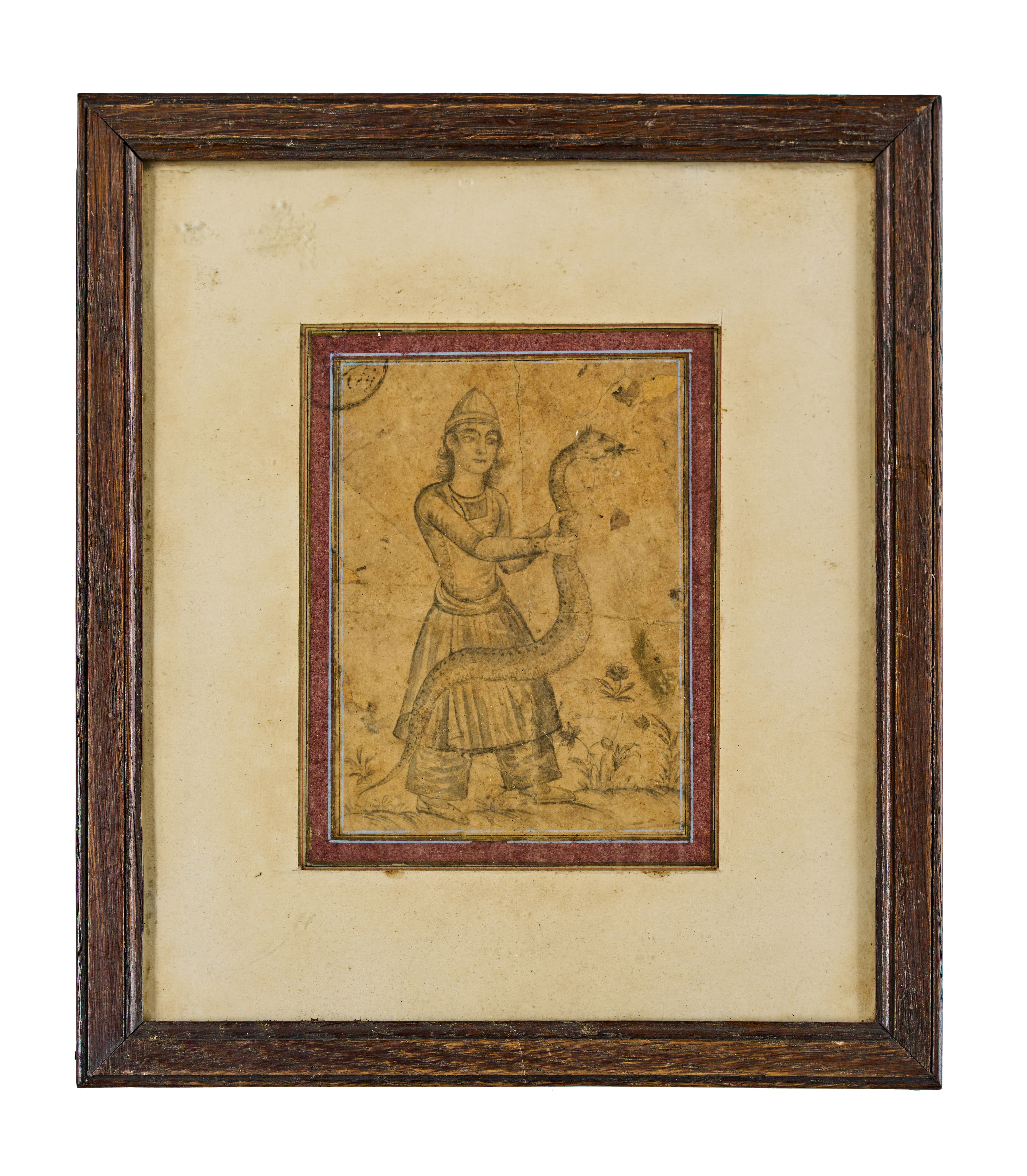 Depicting a figure in traditional attire holding a dragon or serpent, framed with a delicate floral ground.