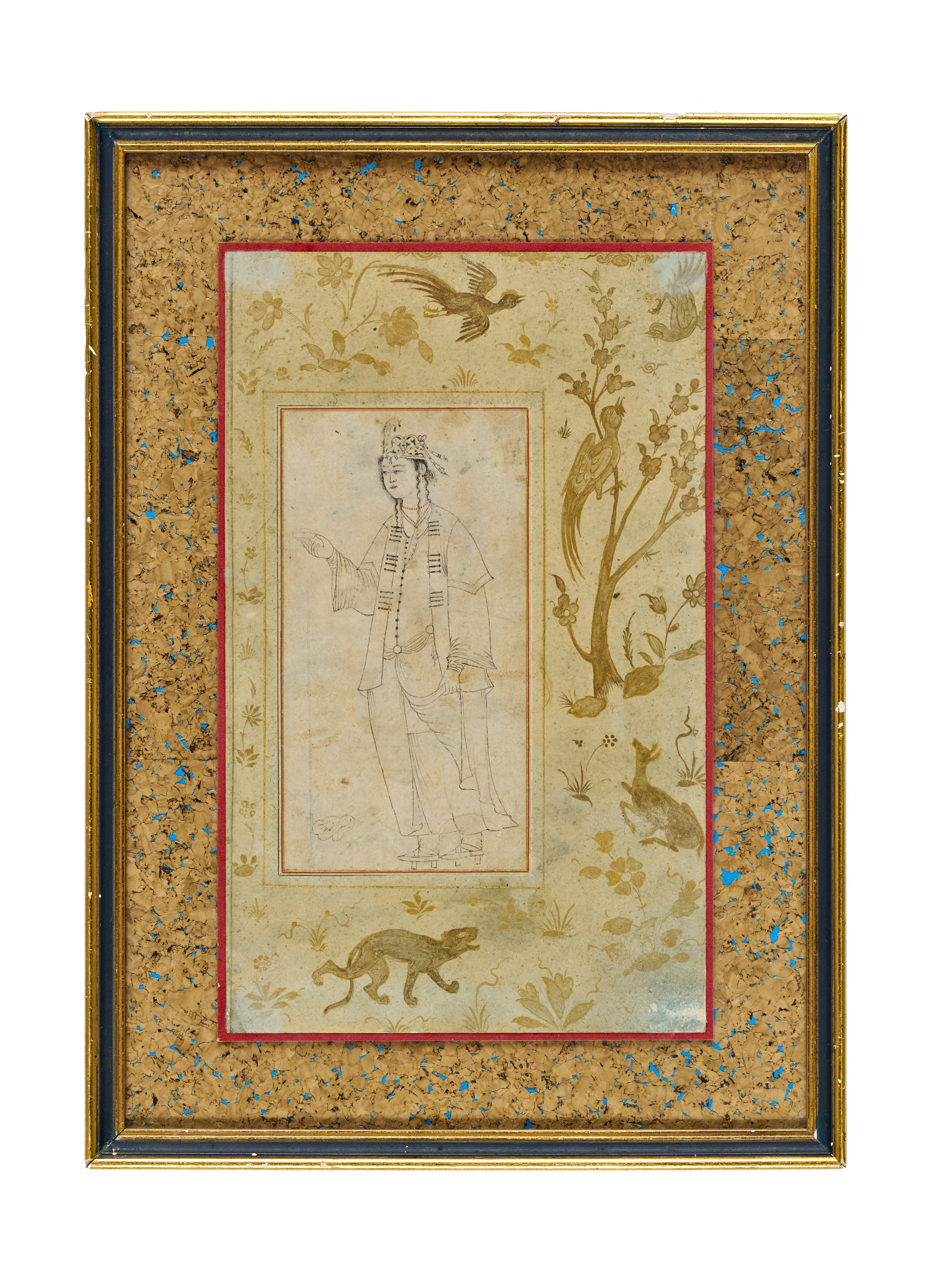 Surrounded by a richly illuminated border featuring gilded birds, animals, and floral motifs on a speckled background.