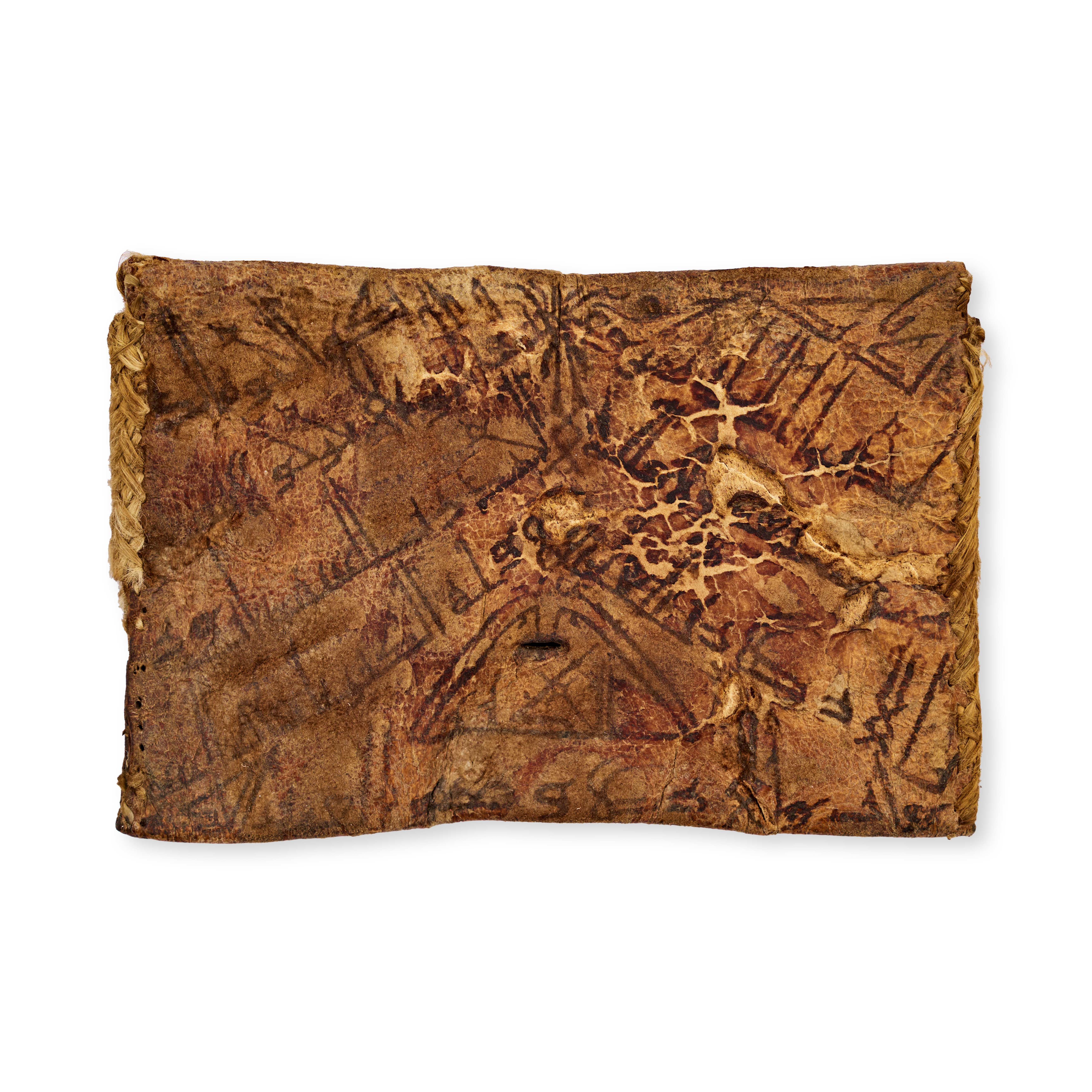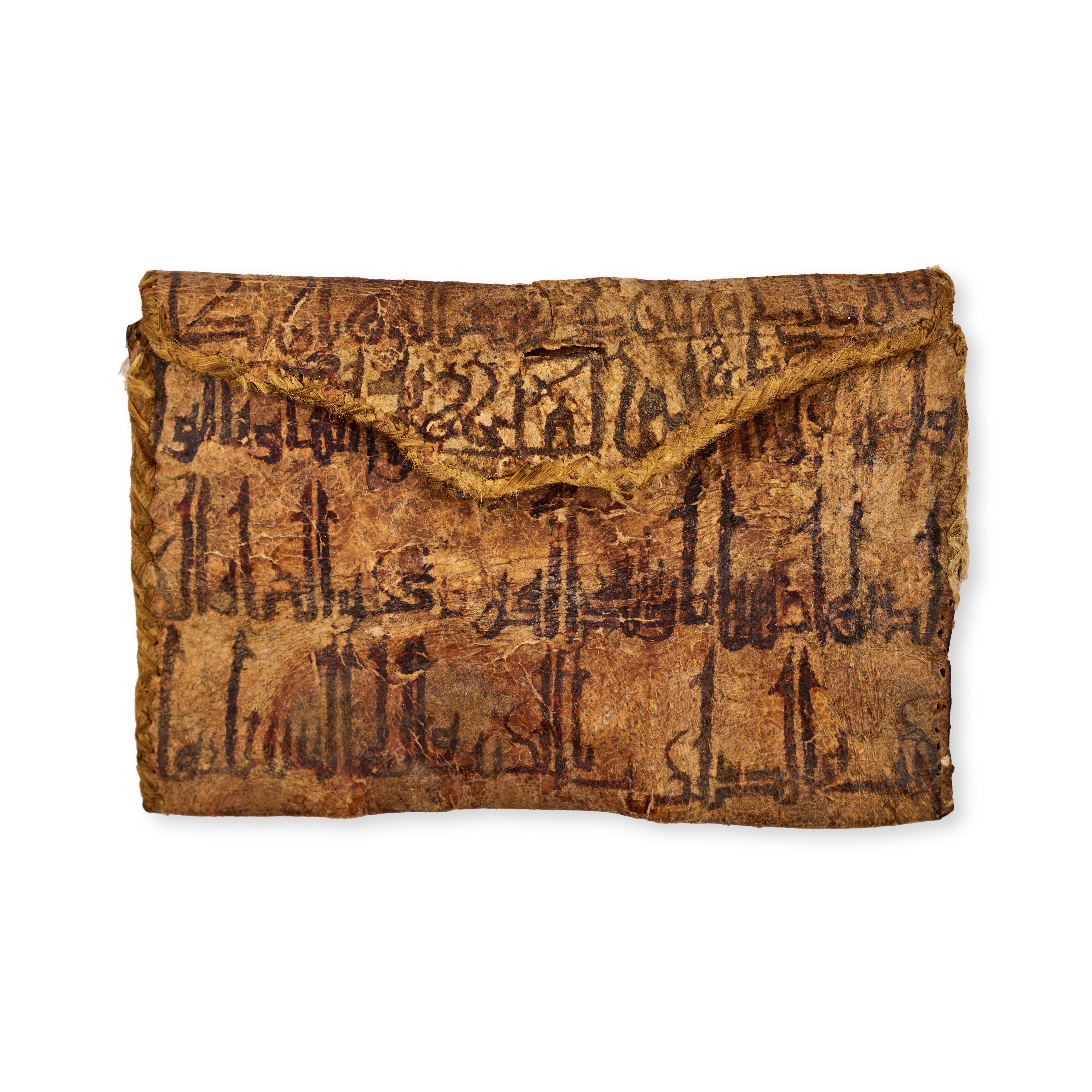 Composed of early inscribed parchment fragments later sewn into a protective talismanic pouch, bearing faded yet powerful scriptural invocations.