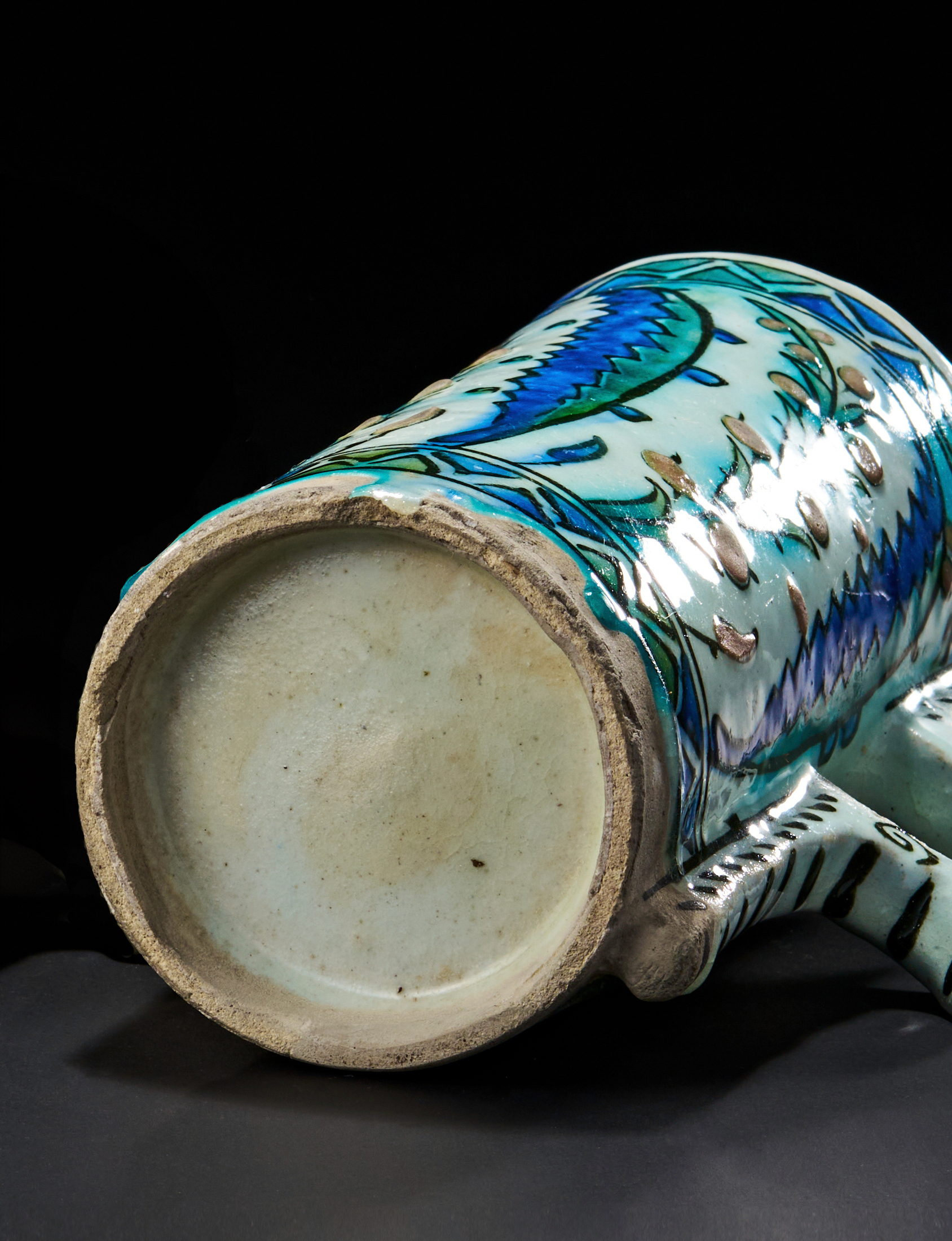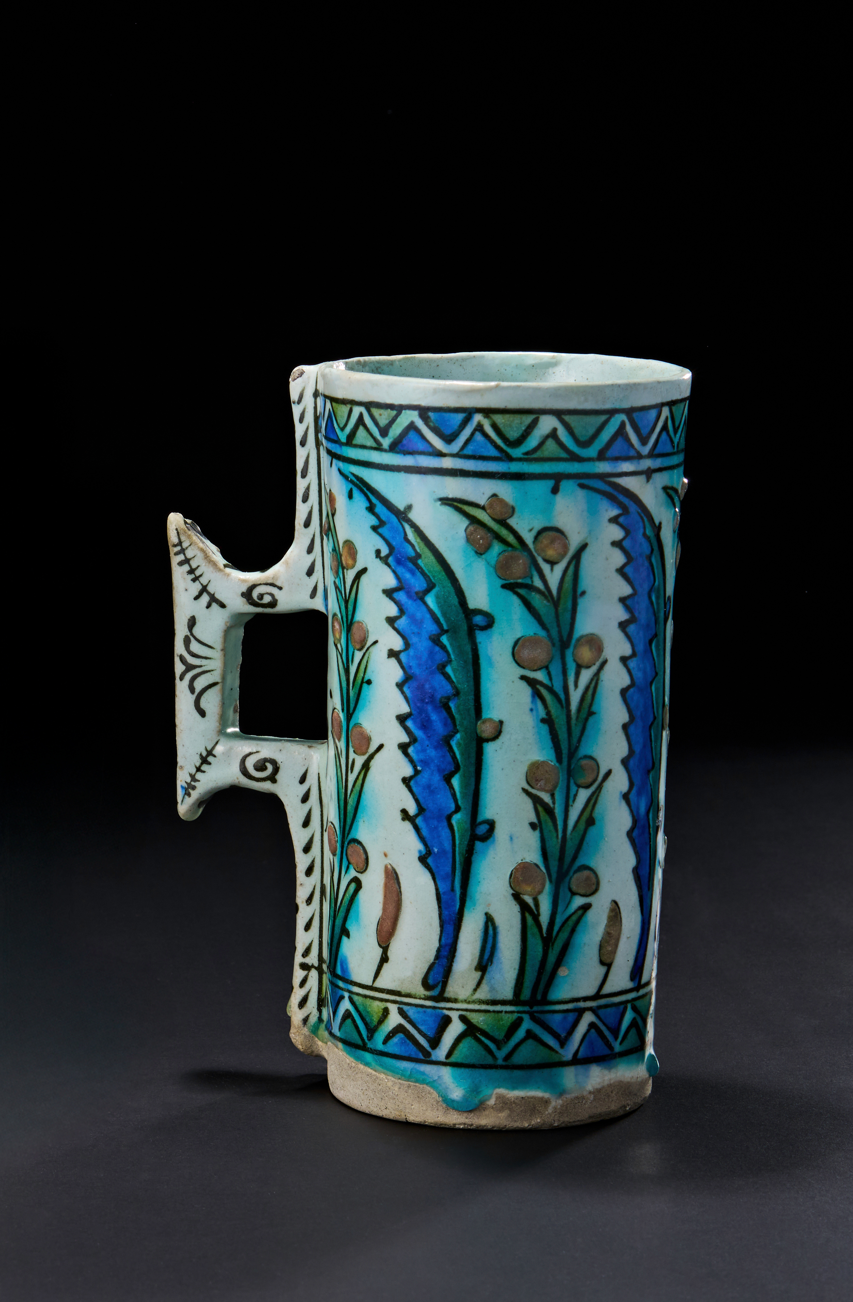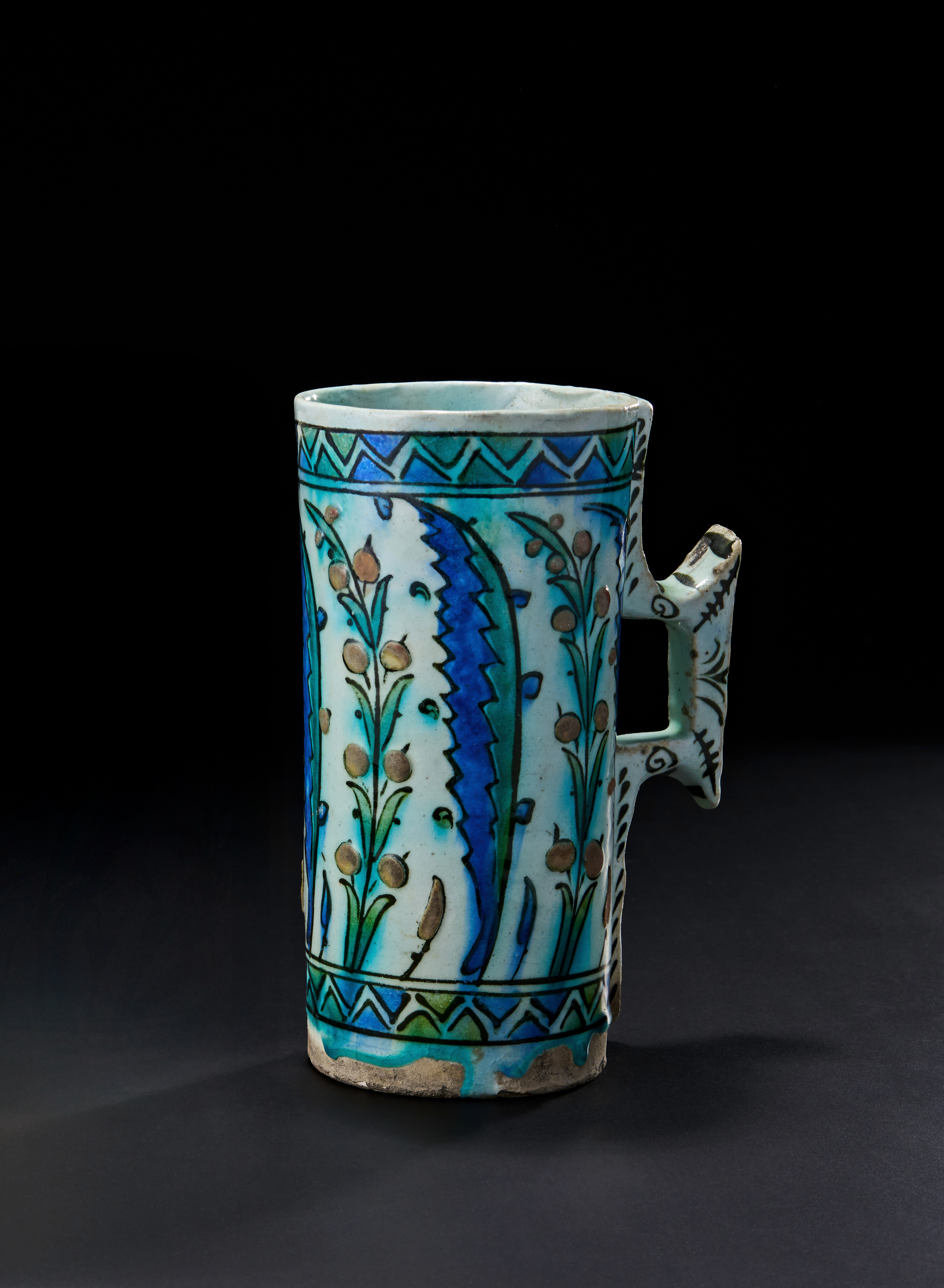 Of a cylindrical body with a bold, angular handle and decorated in turquoise, cobalt blue, green, and black under a clear glaze. The surface displays floral and saz leaf motifs framed by geometric bands, all set against a white ground. The tankard rests on an unglazed foot ring, with the base revealing the creamy ceramic body beneath the glaze.