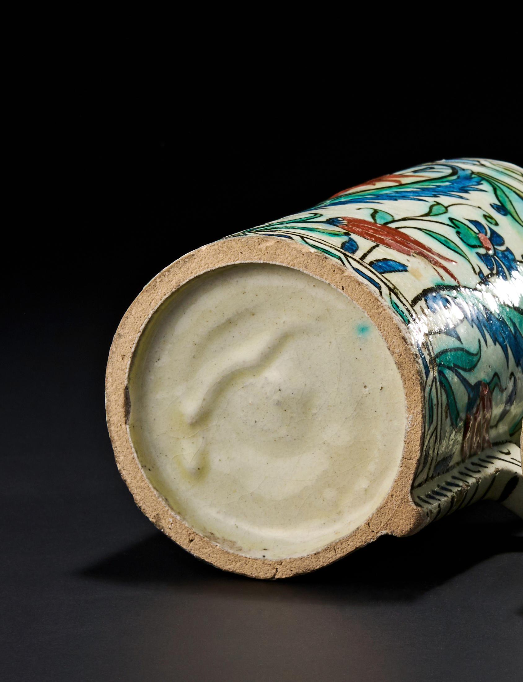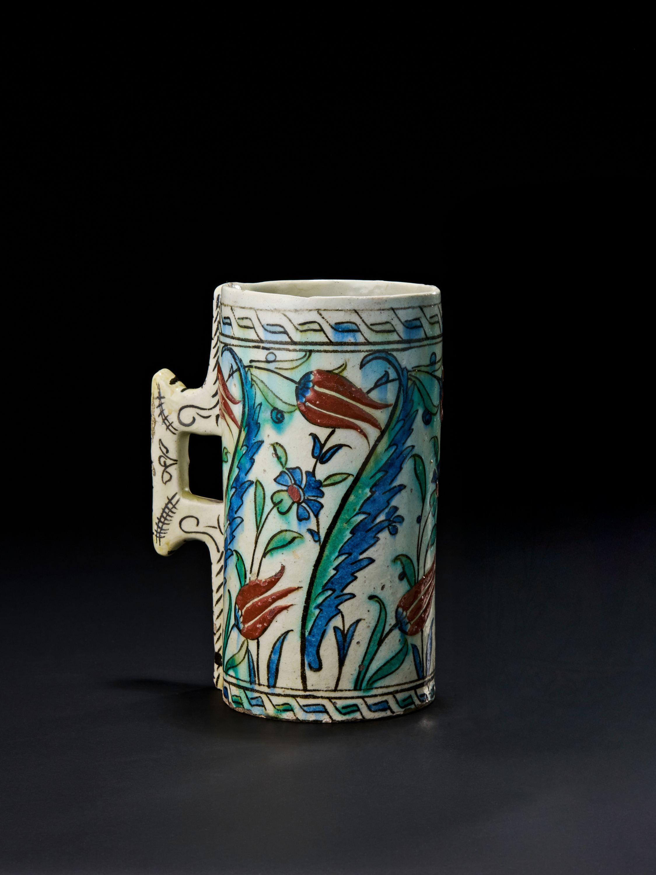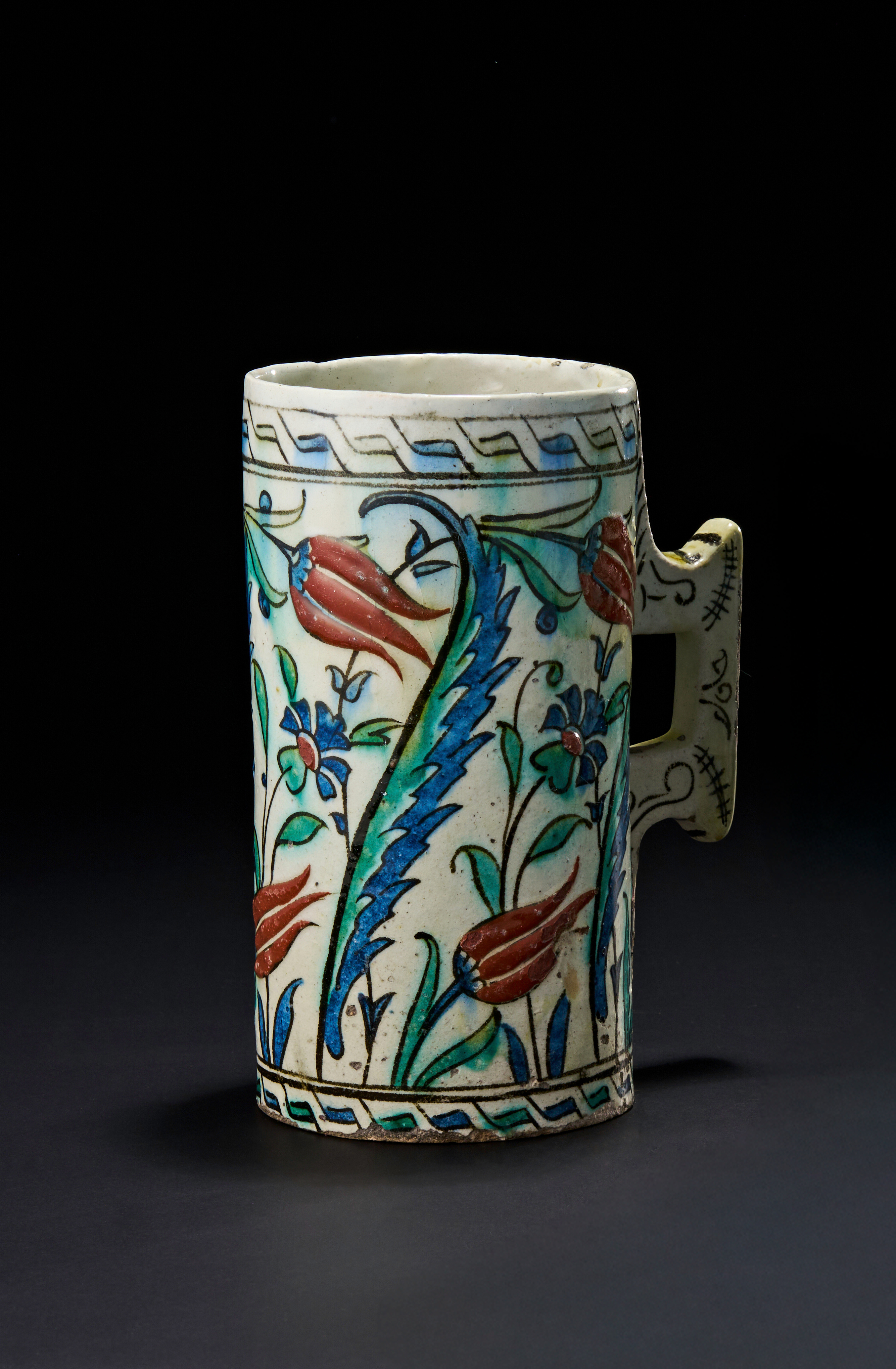Of a cylindrical form with a pronounced angular handle, decorated in a vibrant palette of cobalt blue, green, turquoise, and bole red under a clear glaze. The surface features classic Ottoman floral motifs including saz leaves, tulips, and rosettes, framed by geometric borders. The base reveals unglazed foot and creamy ceramic body.