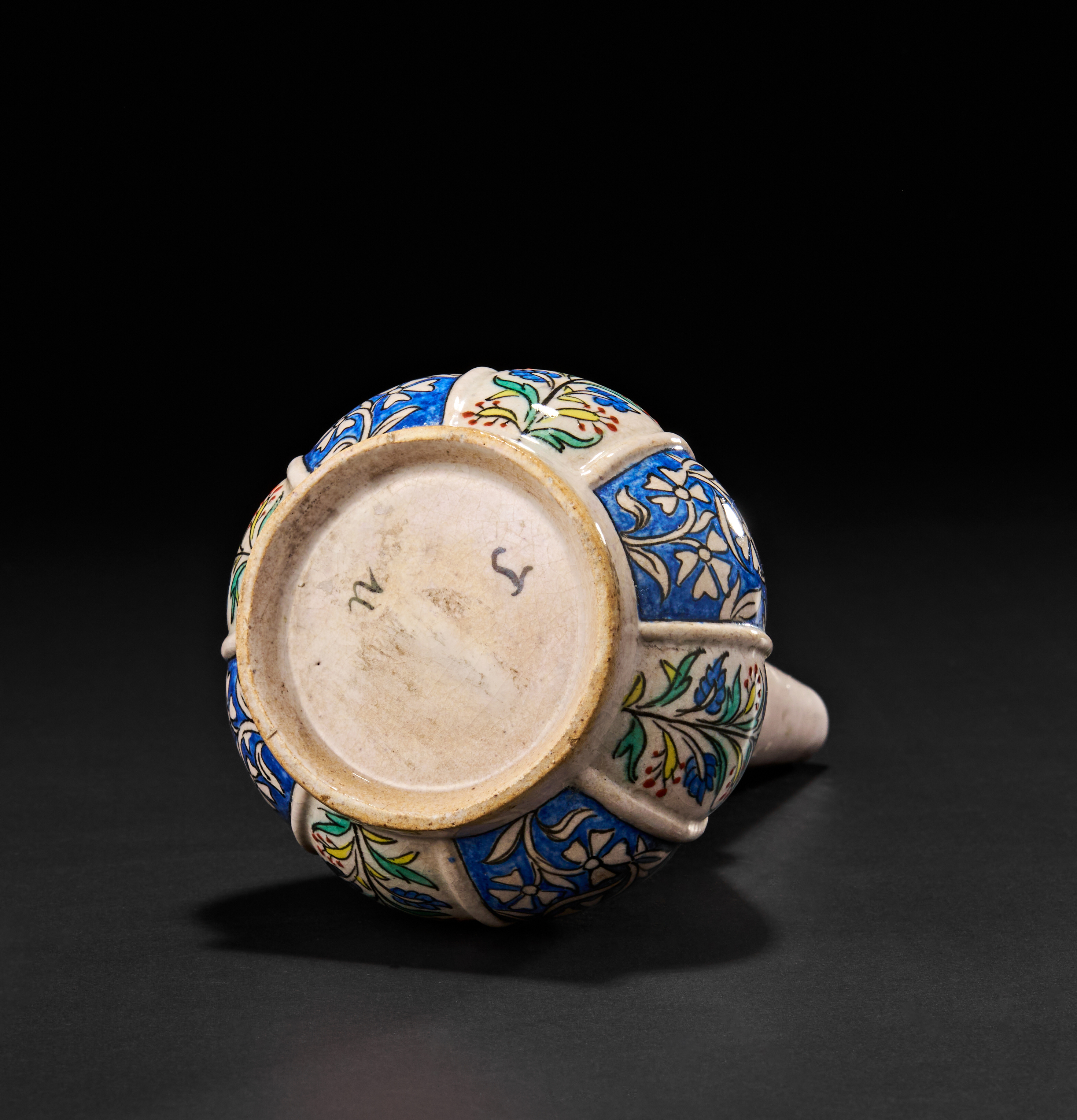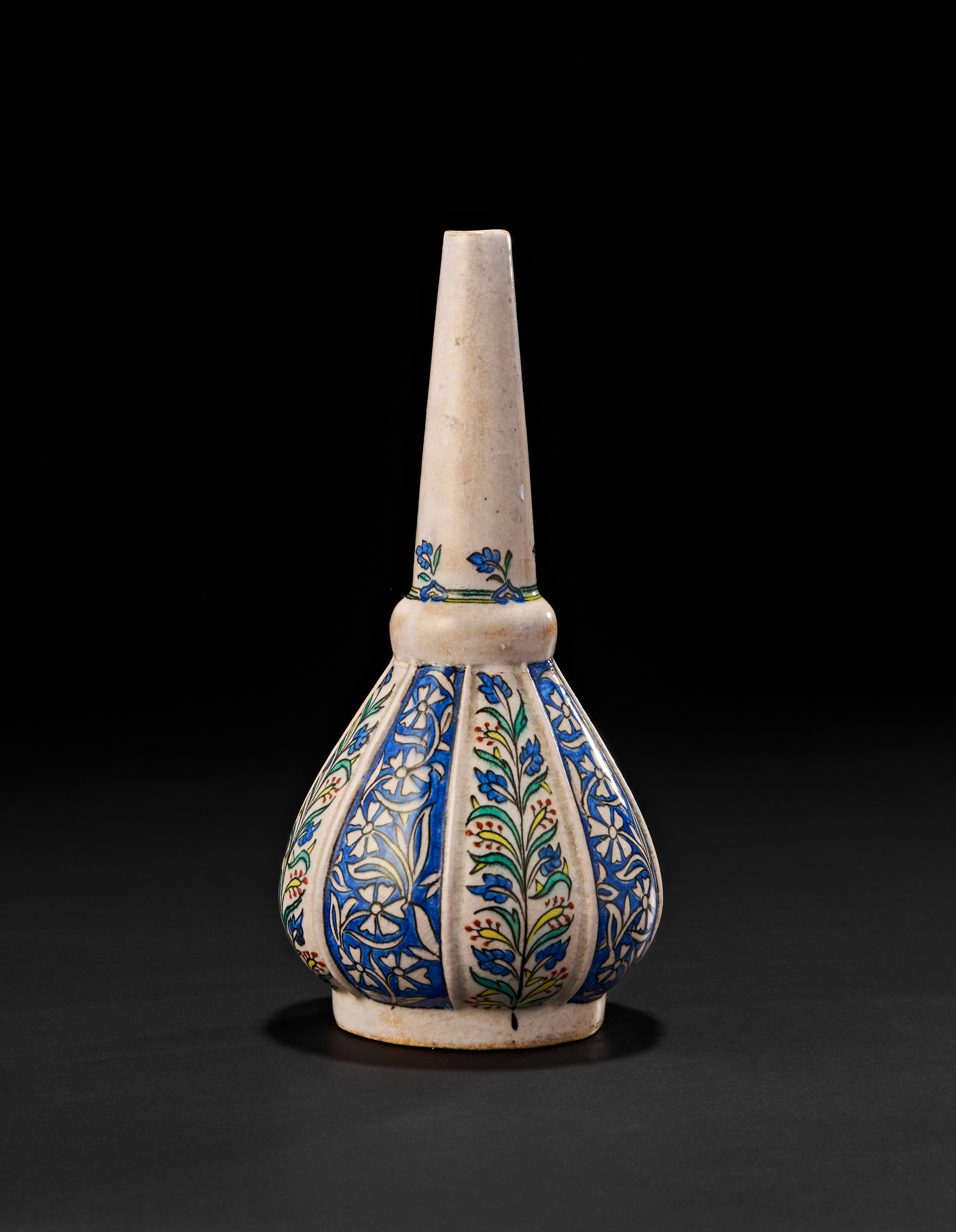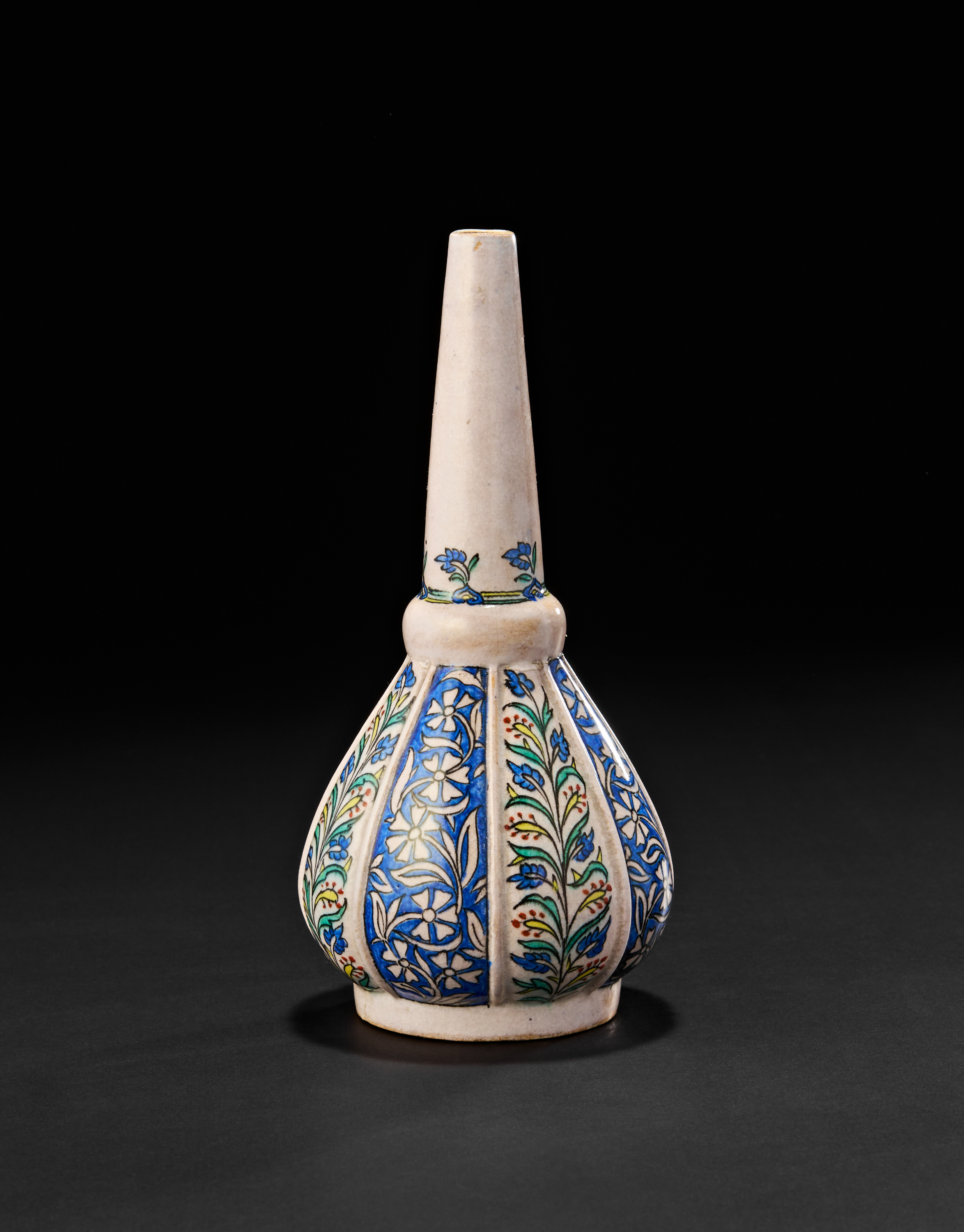 The bottle features a long, narrow neck and a bulbous base, decorated with alternating vertical floral panels in vibrant cobalt blue, green, and red over a white ground. The floral motifs are distinctly Ottoman in inspiration, and the overall form is reminiscent of traditional Turkish rosewater sprinklers used in ceremonial or perfuming contexts.