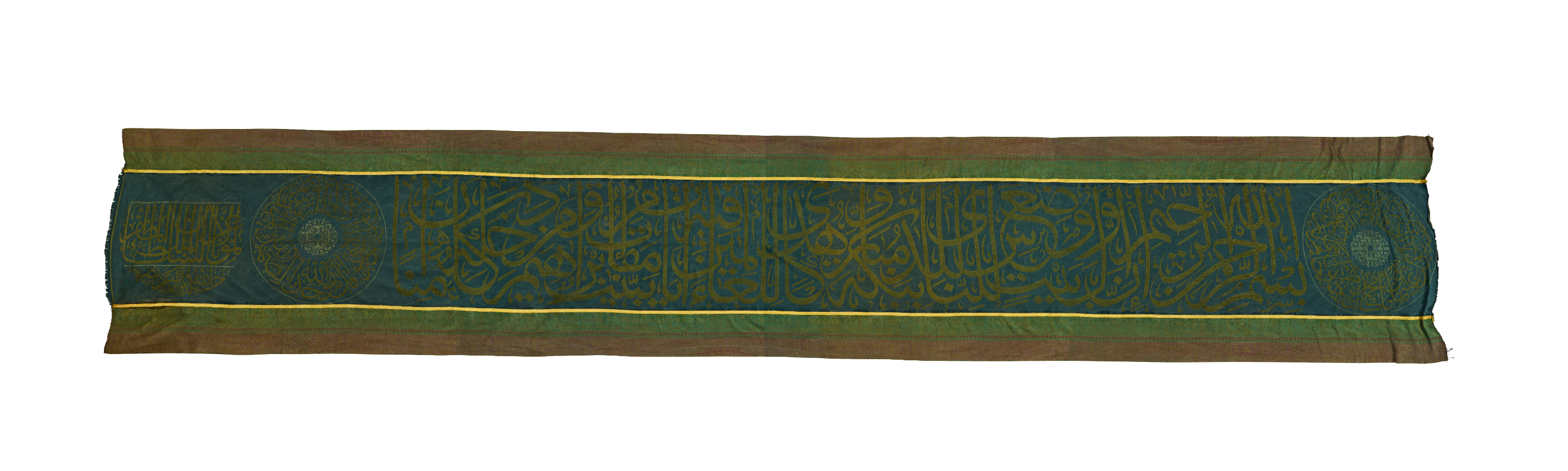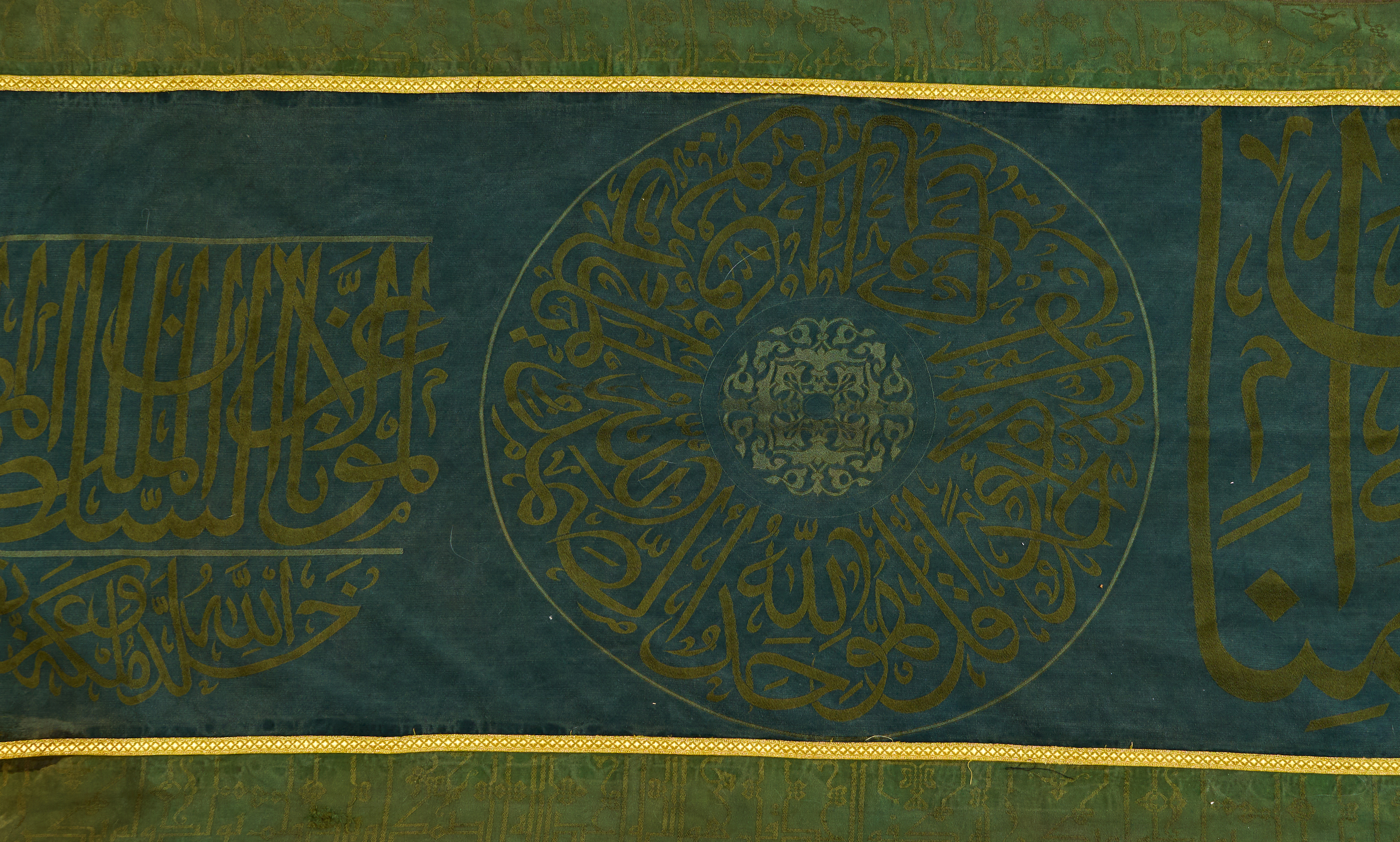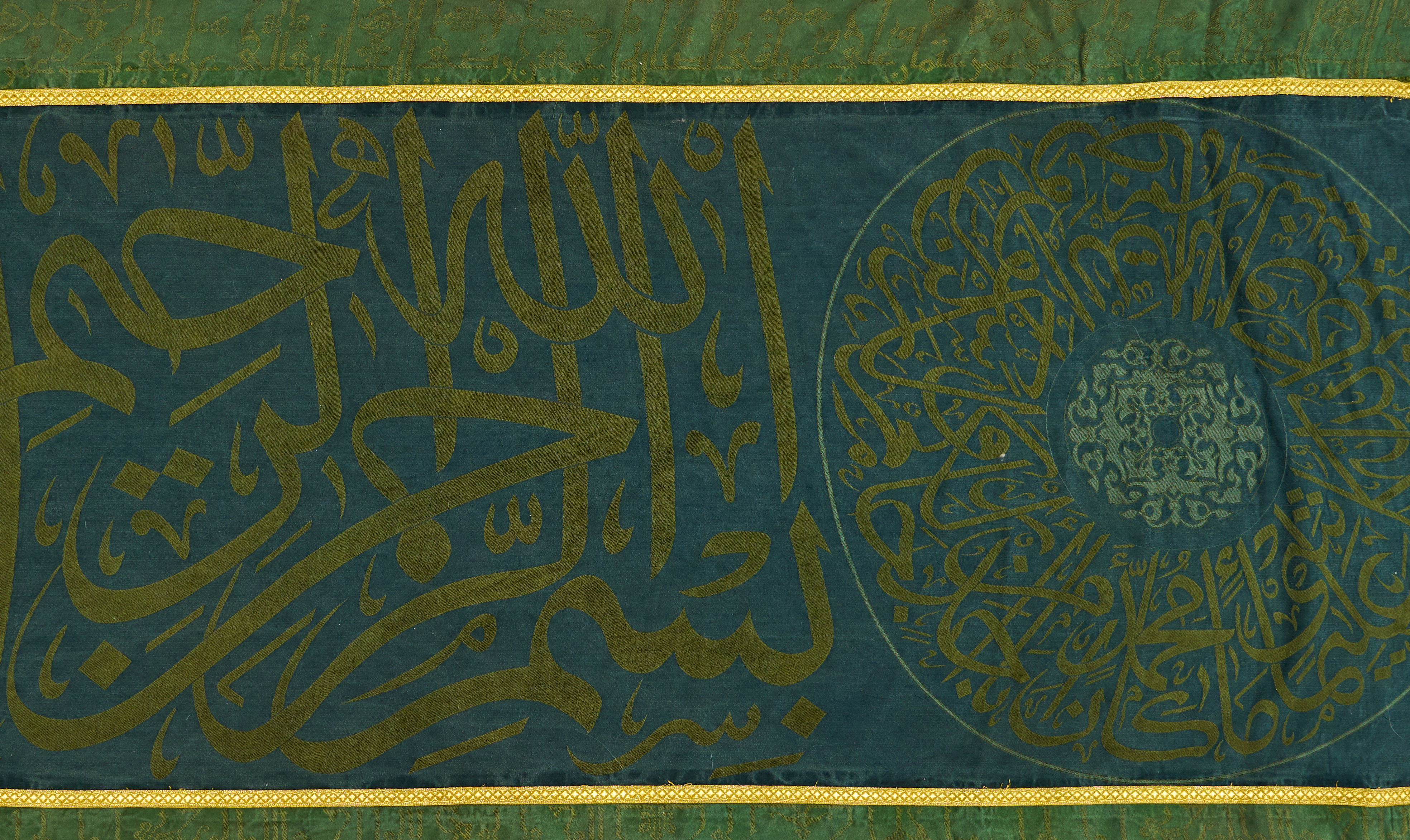 The Hizam, or belt, is an inscribed band that traditionally encircles the upper part of the Kaaba. Rectangular in form, it is woven from green silk and embroidered with Qur’anic inscriptions in gilt thread, the surface organised into alternating cartouches and medallions of various shapes and sizes.