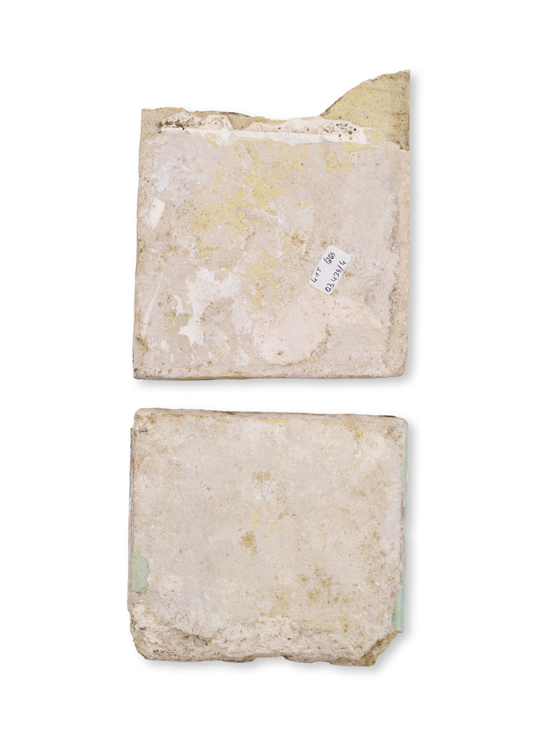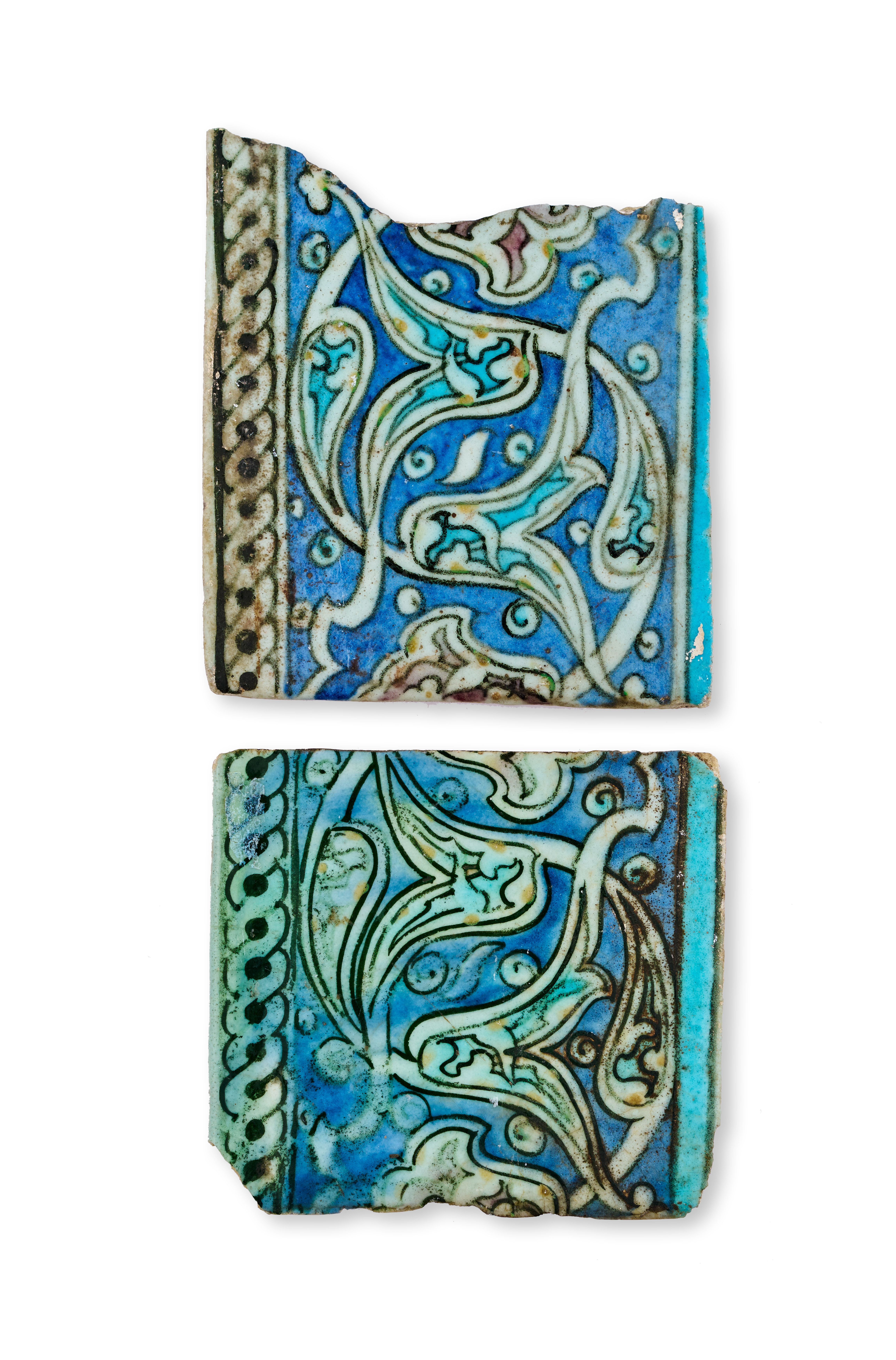 Each tile is finely decorated in underglaze cobalt blue, turquoise, black, and sage green with elegant arabesque and floral scroll motifs, framed by a border pattern.