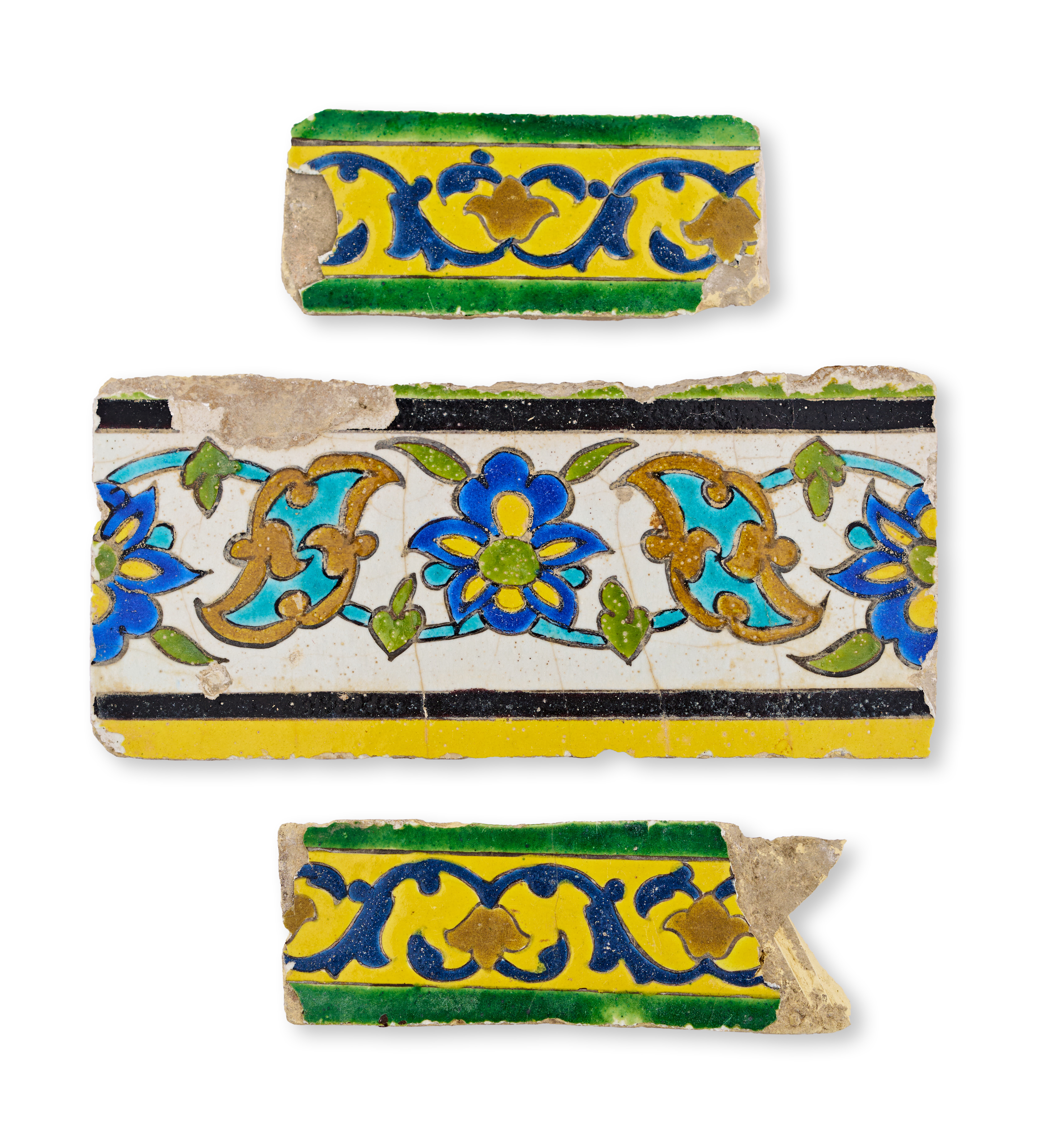 Each tile features floral and arabesque motifs in vibrant shades of turquoise, cobalt, yellow, green, and black, set against a white ground. The central tile shows a floral scroll flanked by saz leaf designs, while the smaller fragments display alternating arabesques and blossoms.